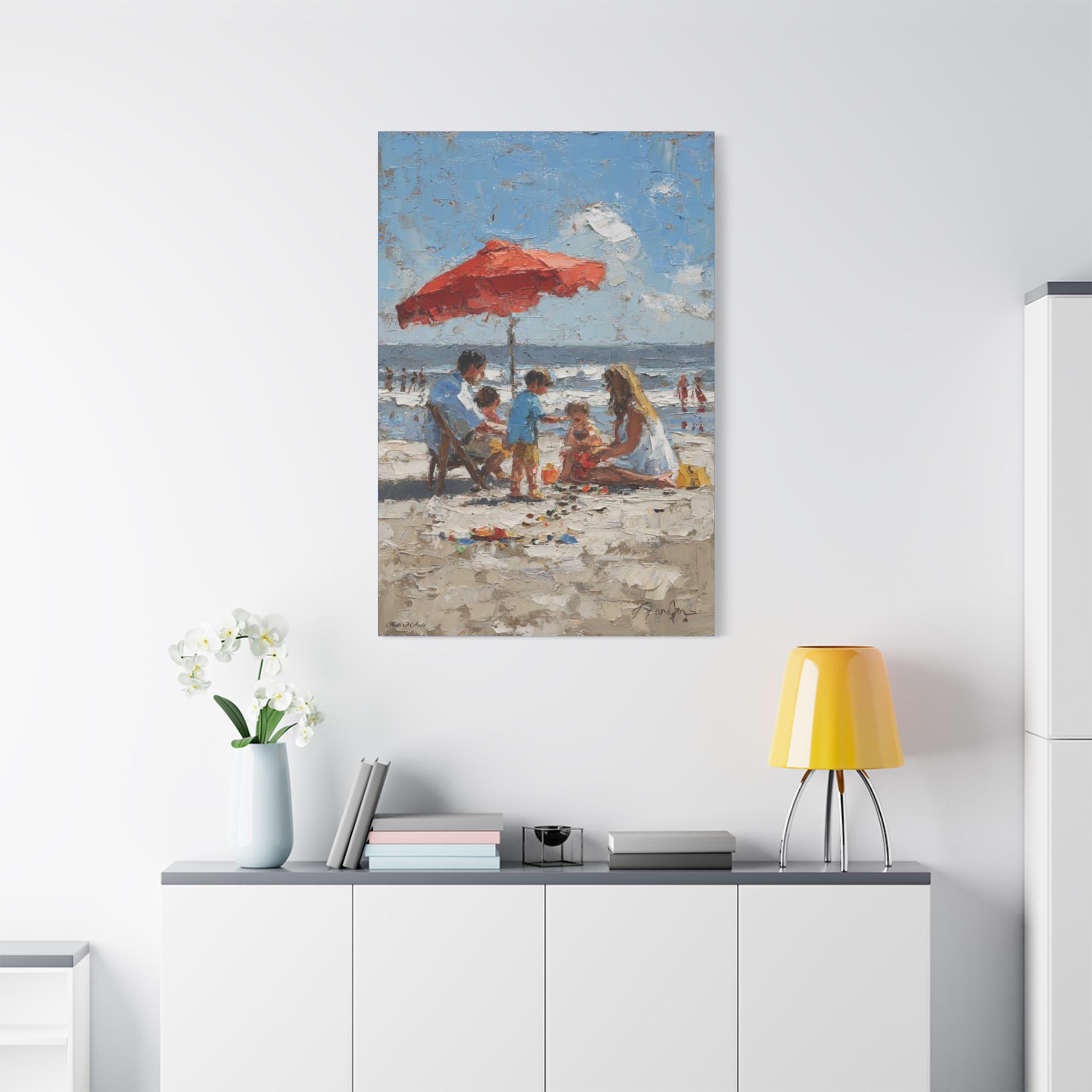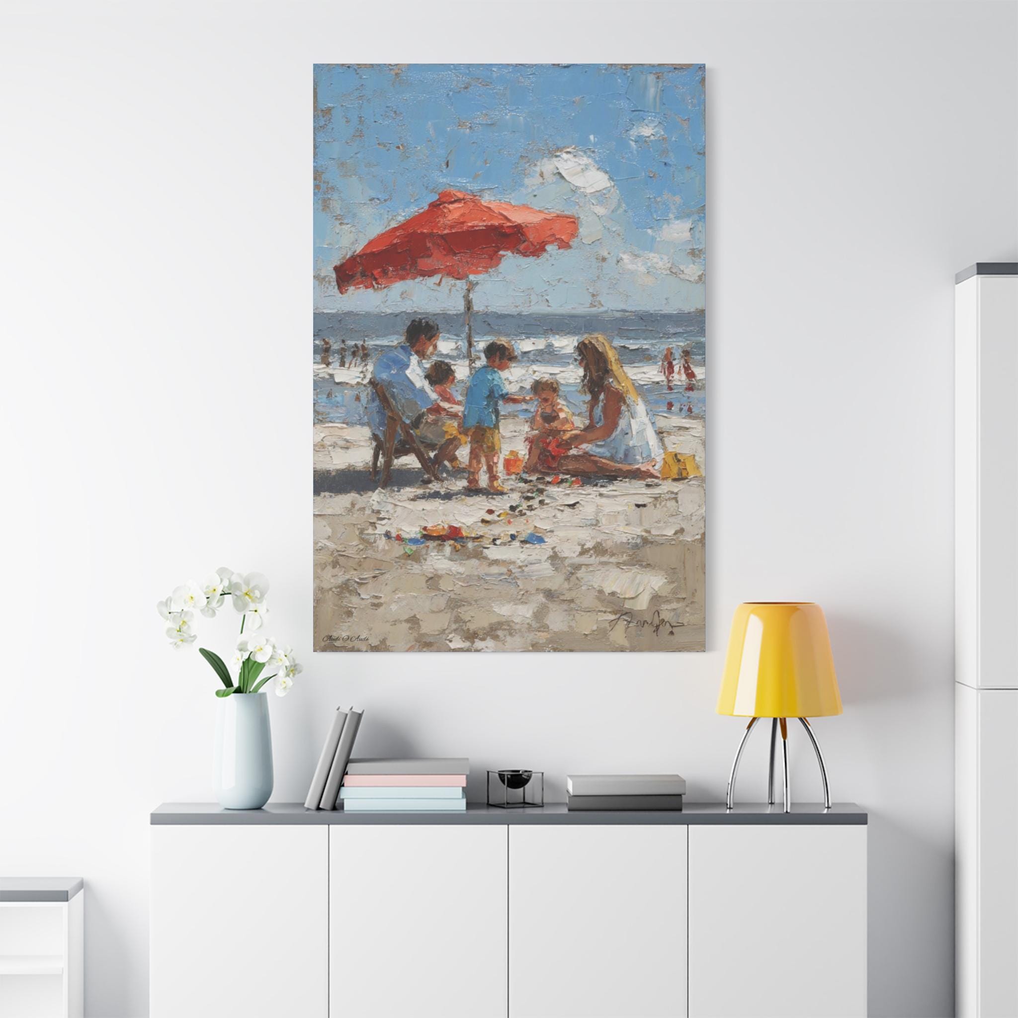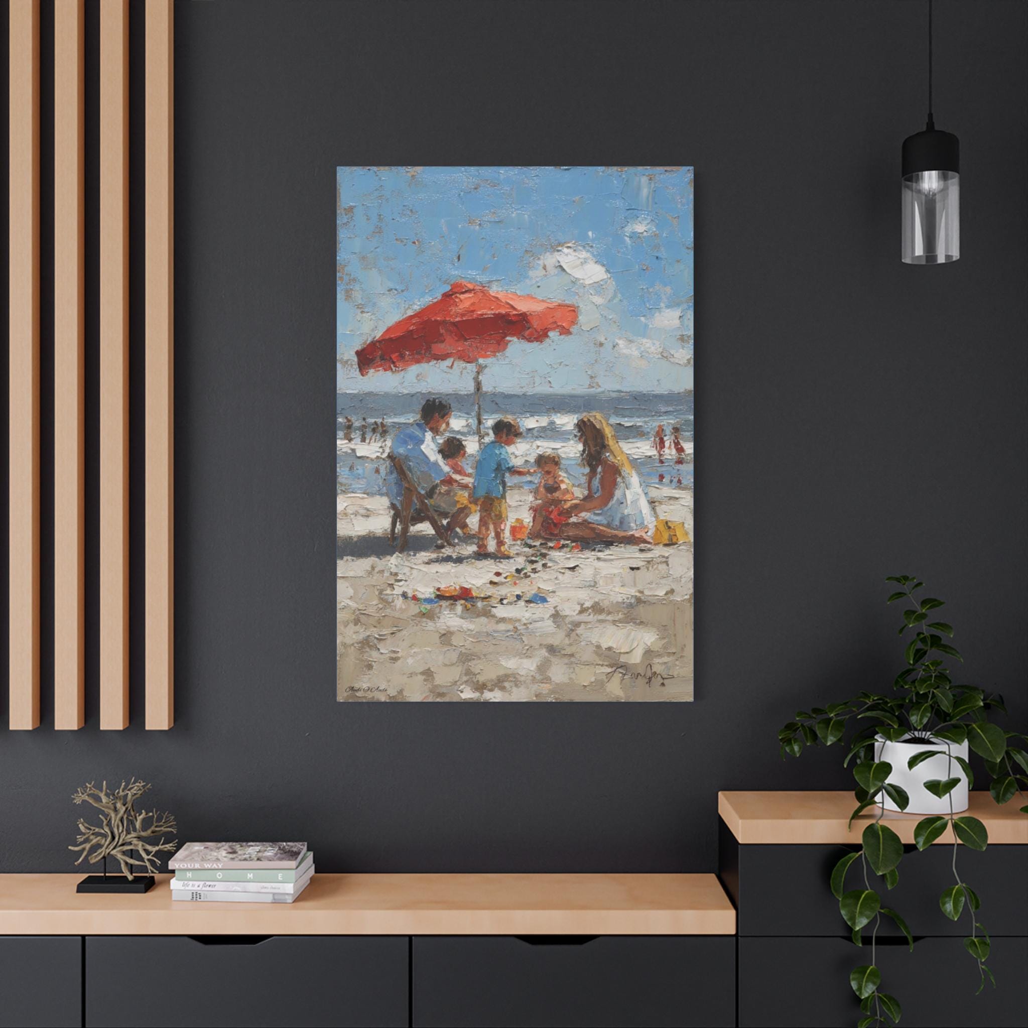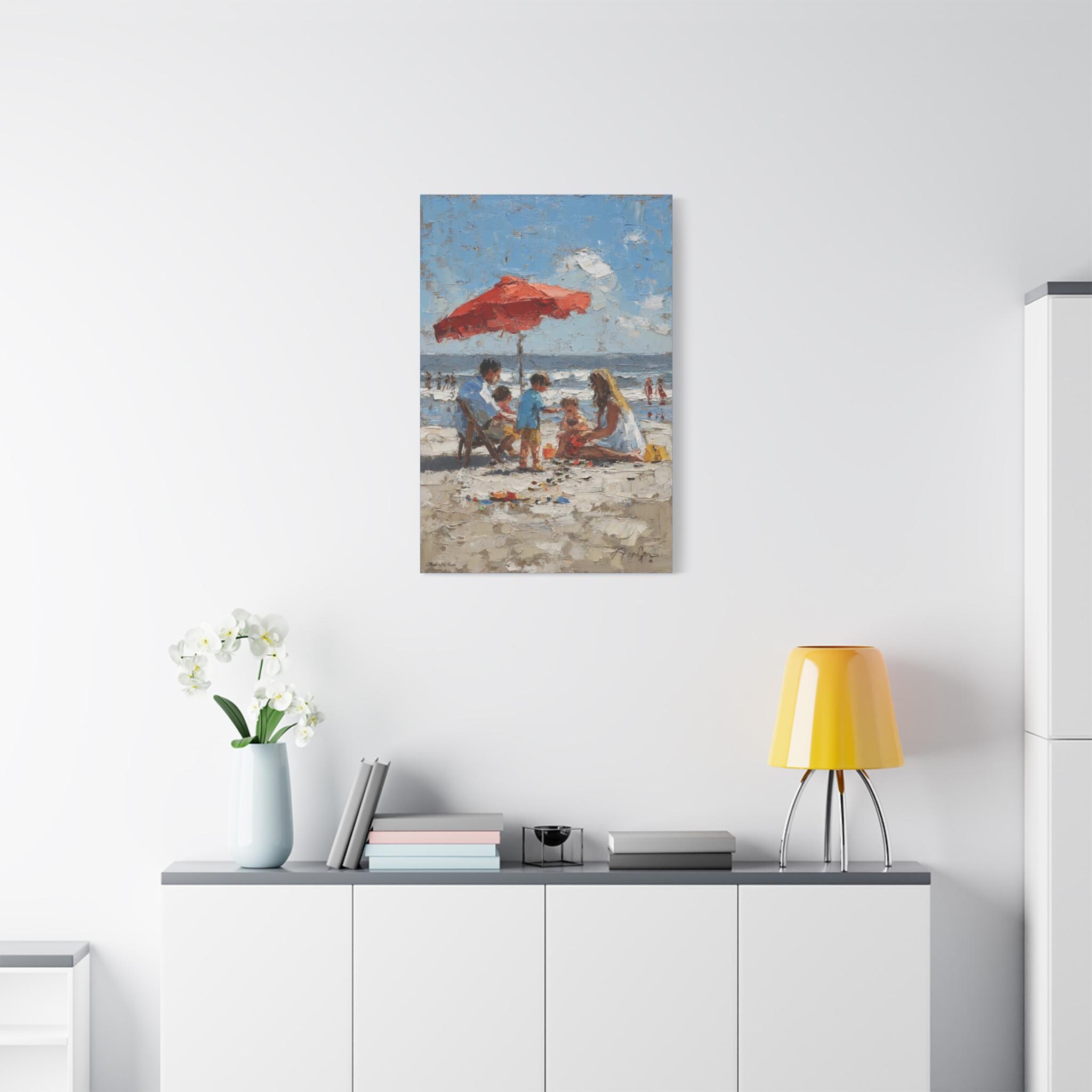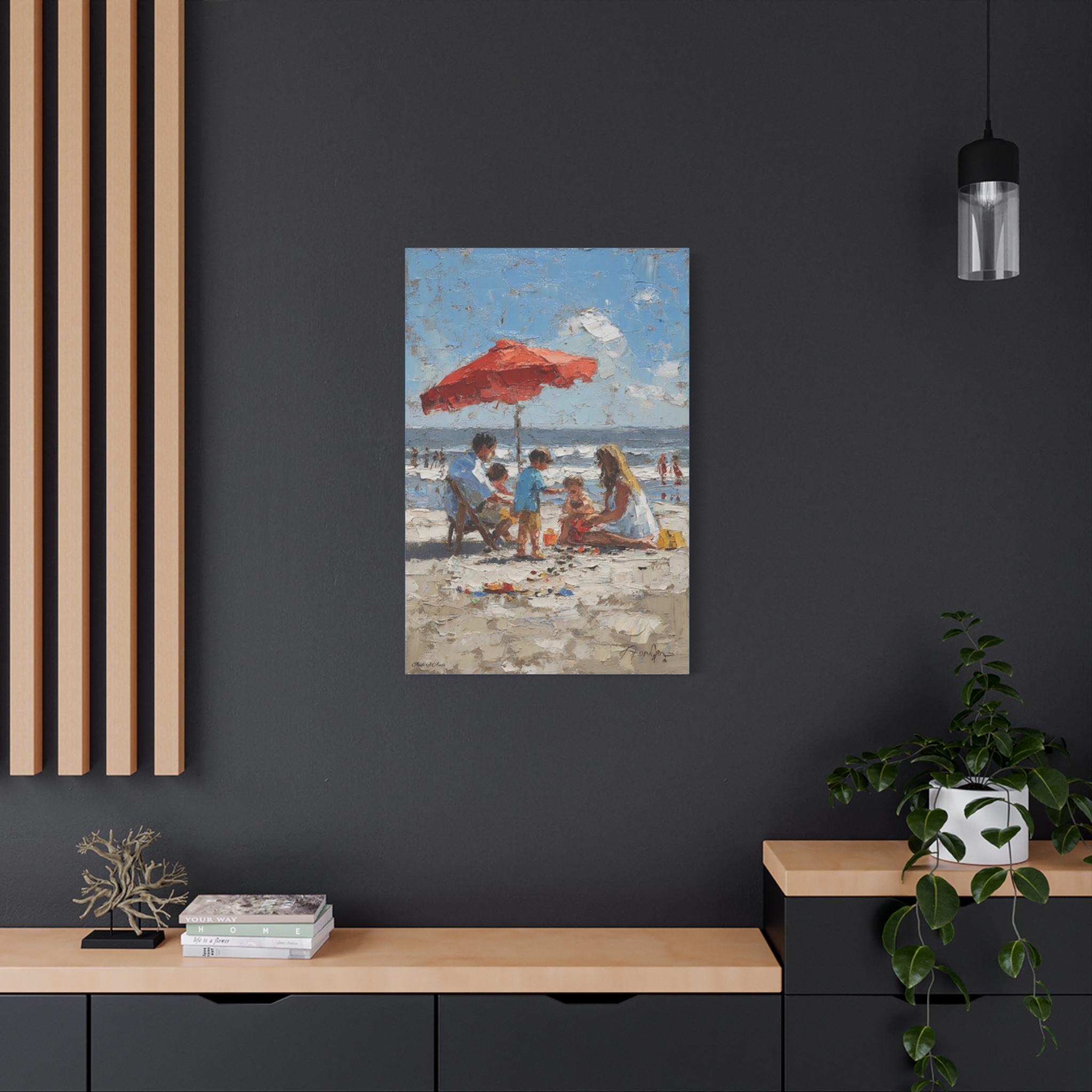 Red Umbrella Family Beach Canvas Art Print, Seaside Coastal Decor