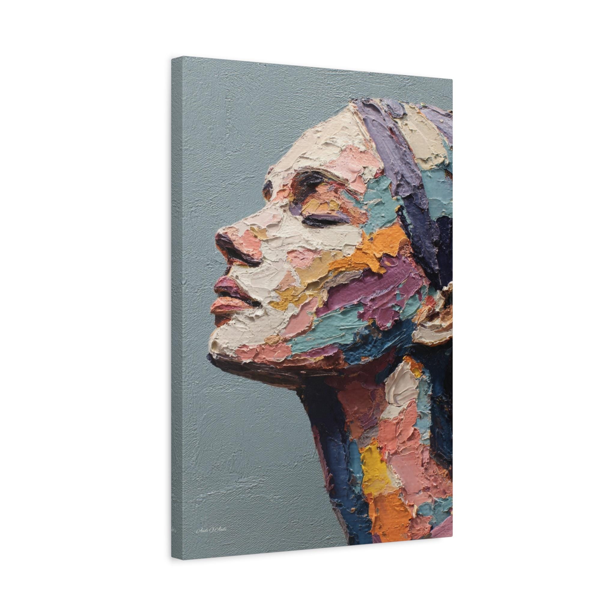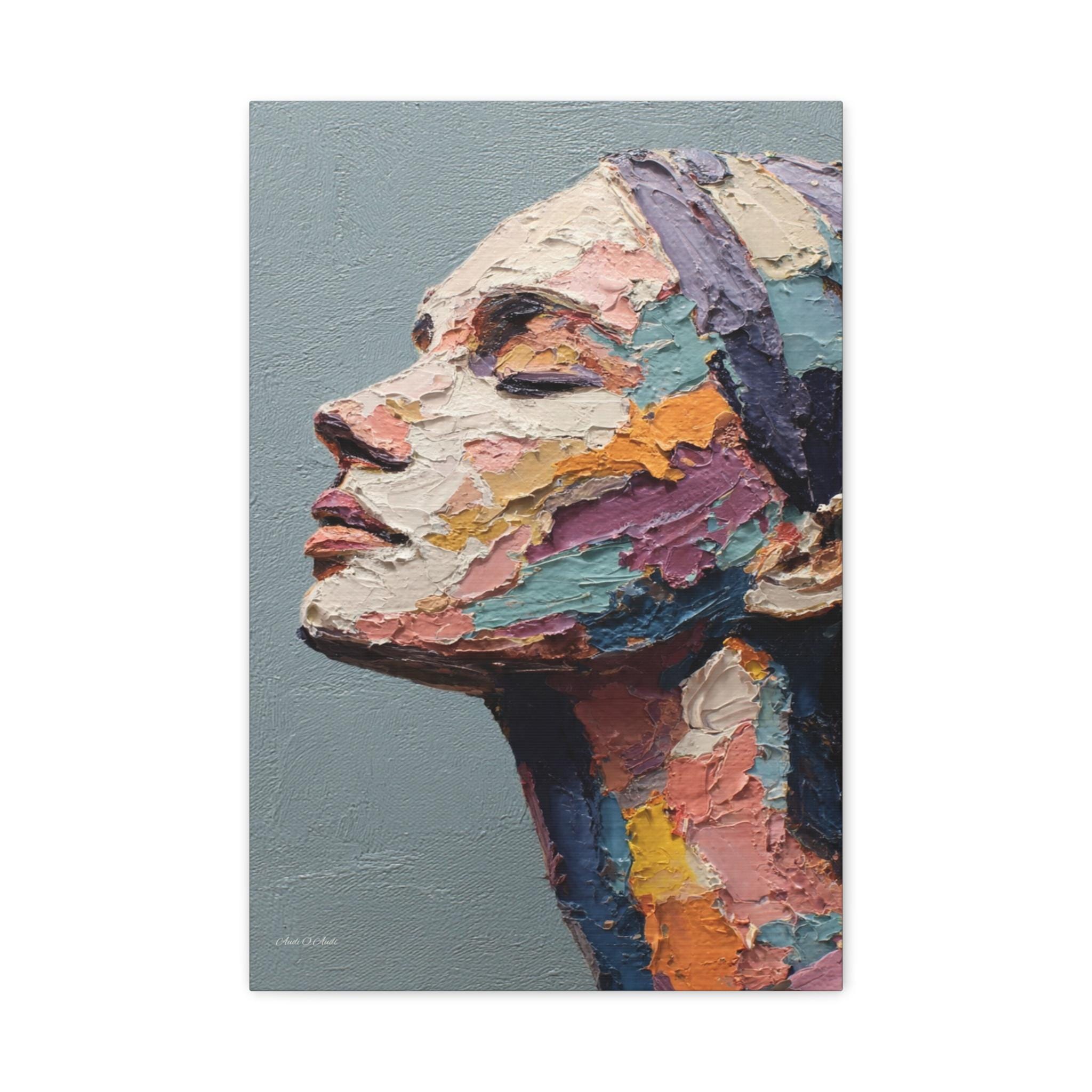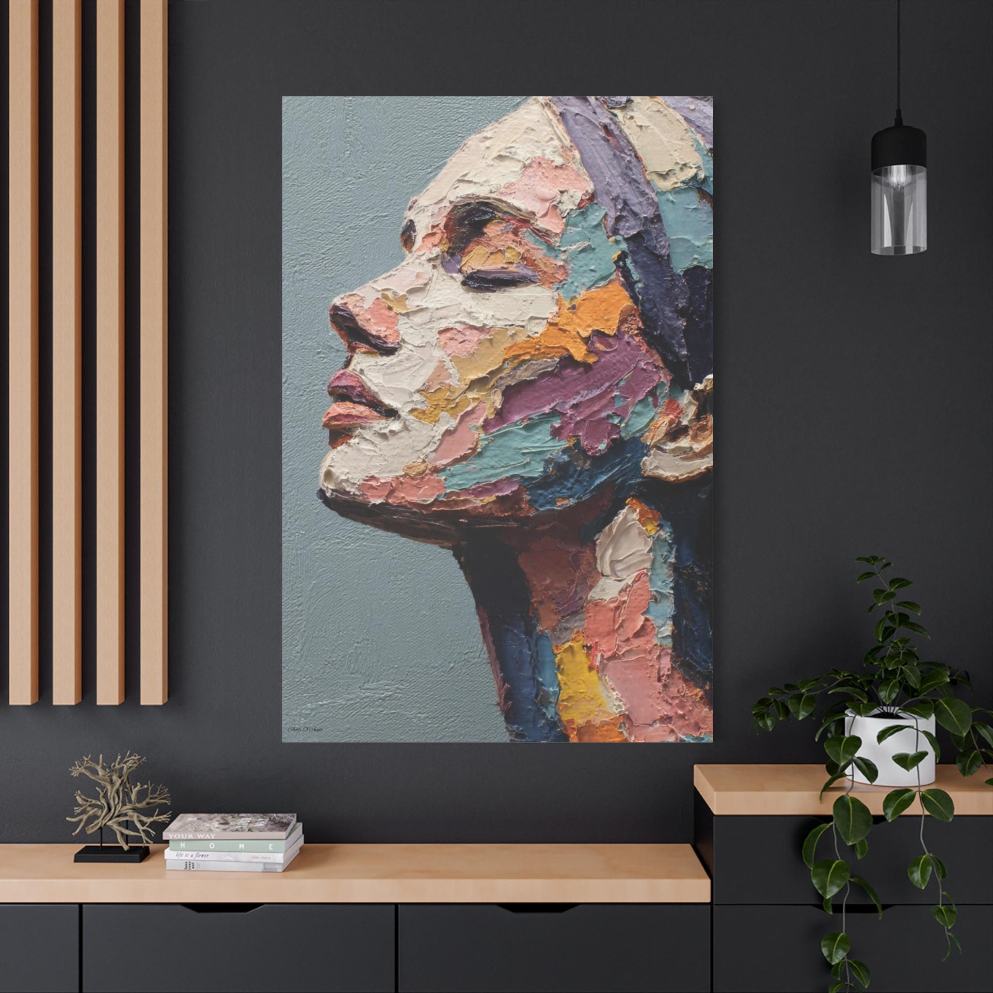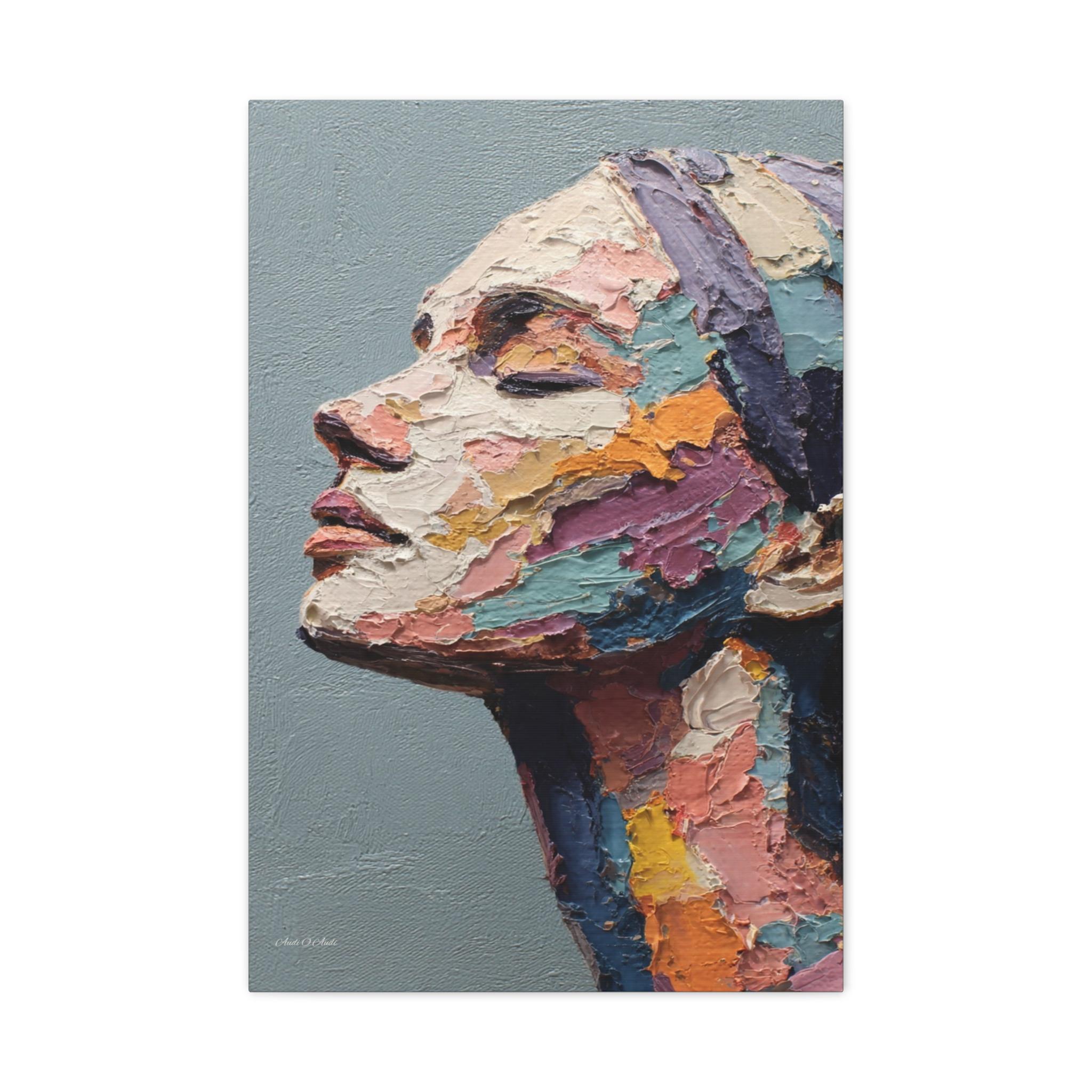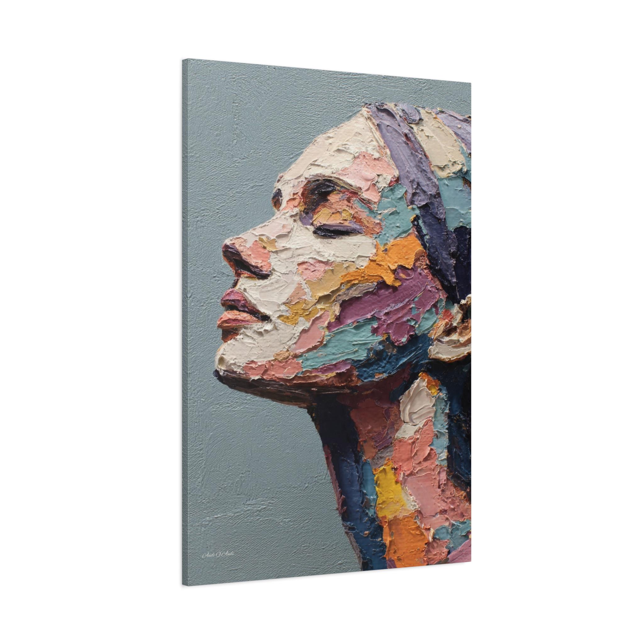 "Fragmented Contemplation" is an extraordinary figurative portrait designed to emulate an original oil painting executed with extreme heavy impasto. The artwork presents a female face in profile, her eyes gently closed in a moment of introspection or repose.