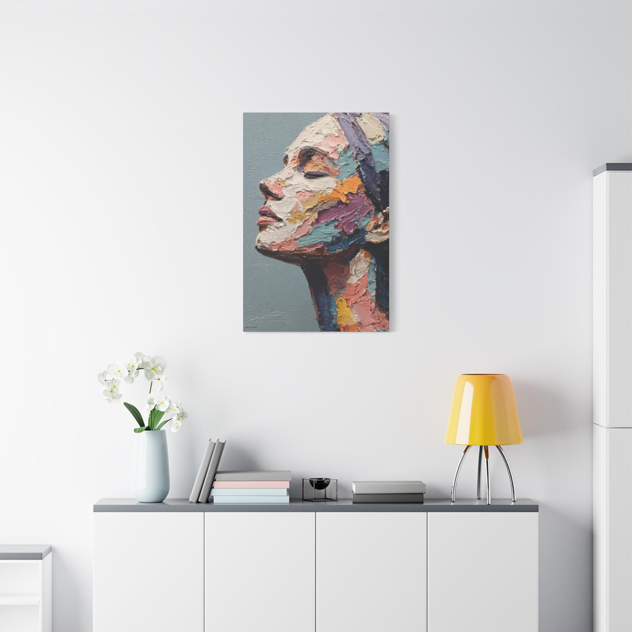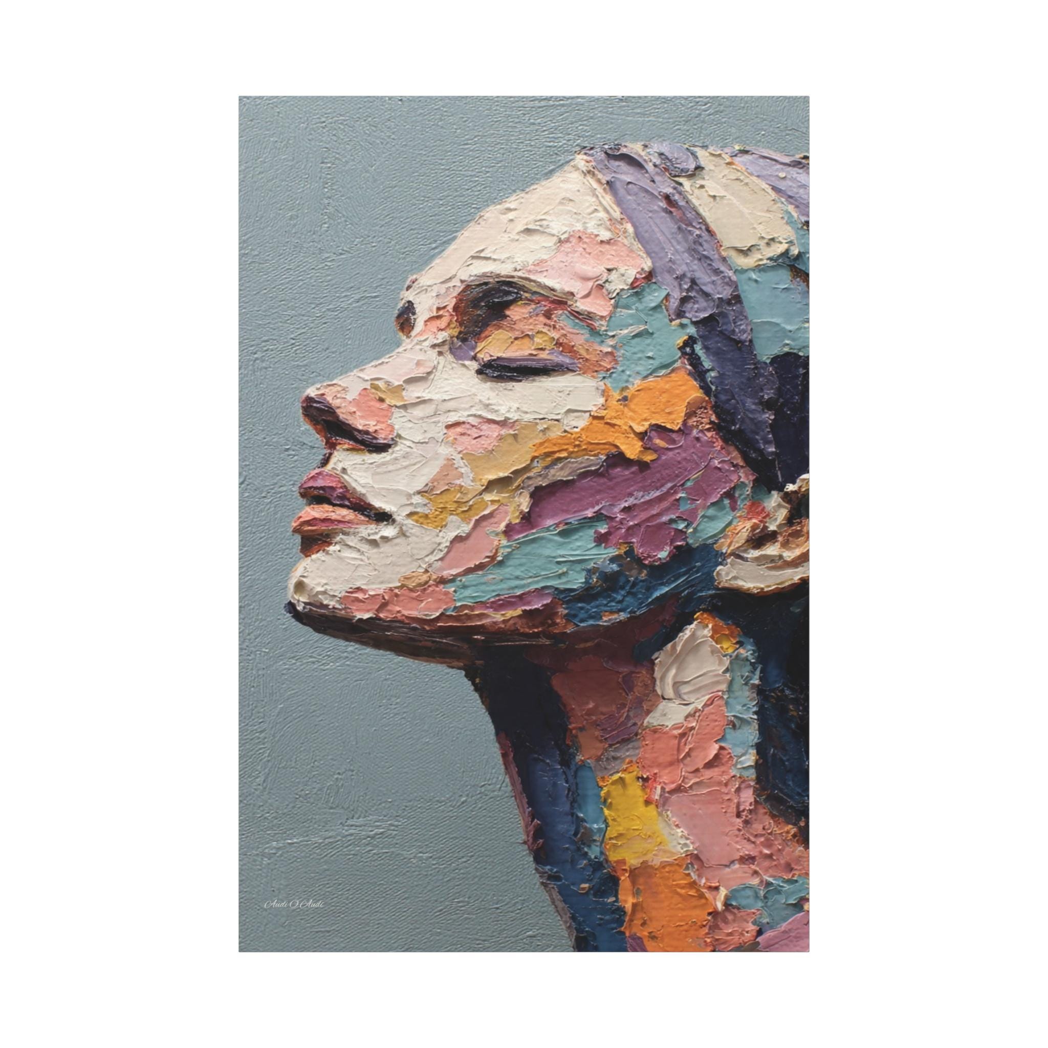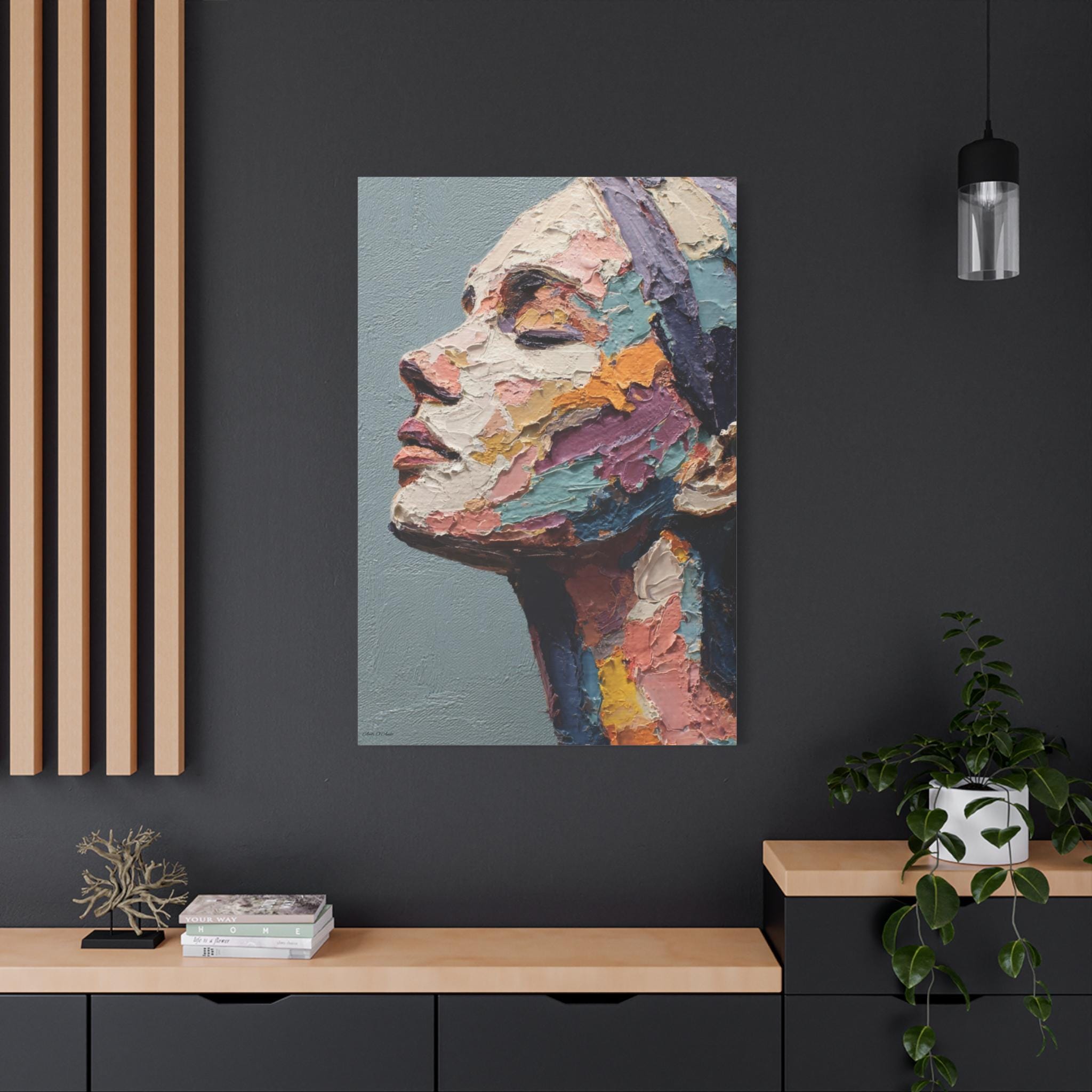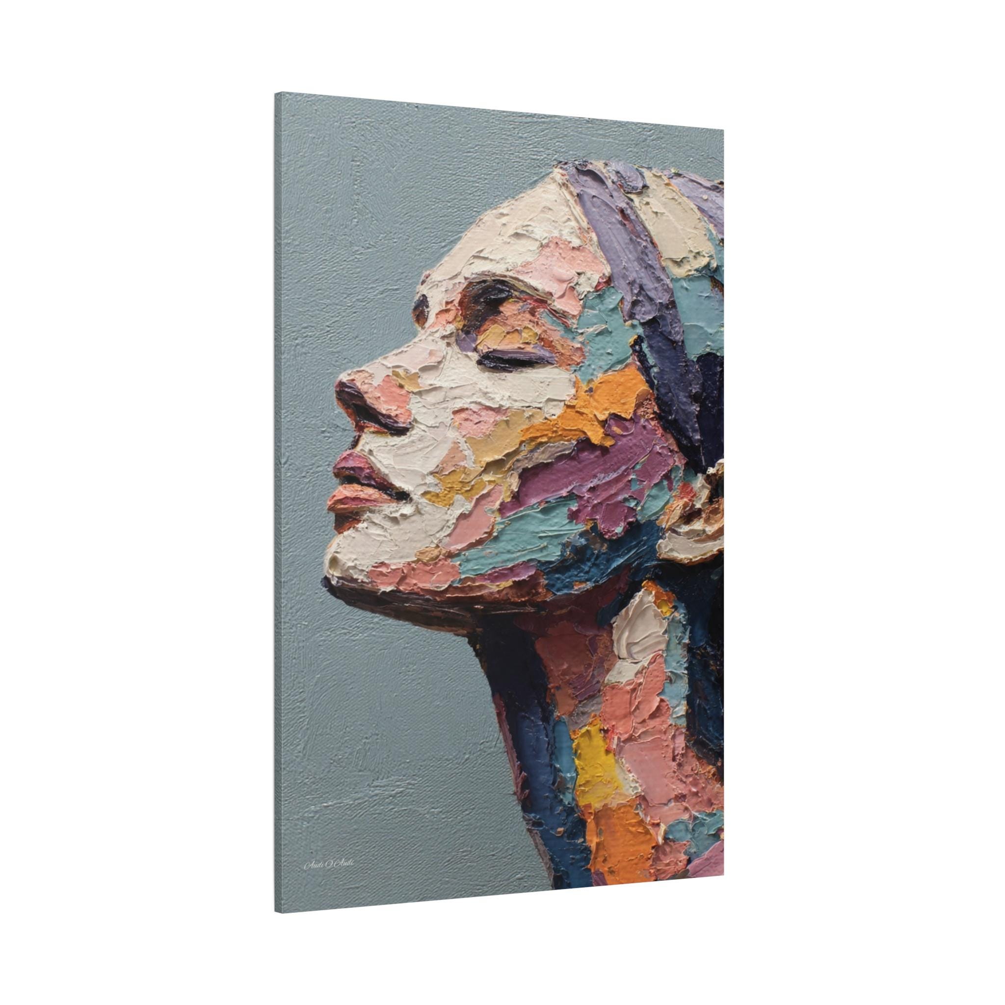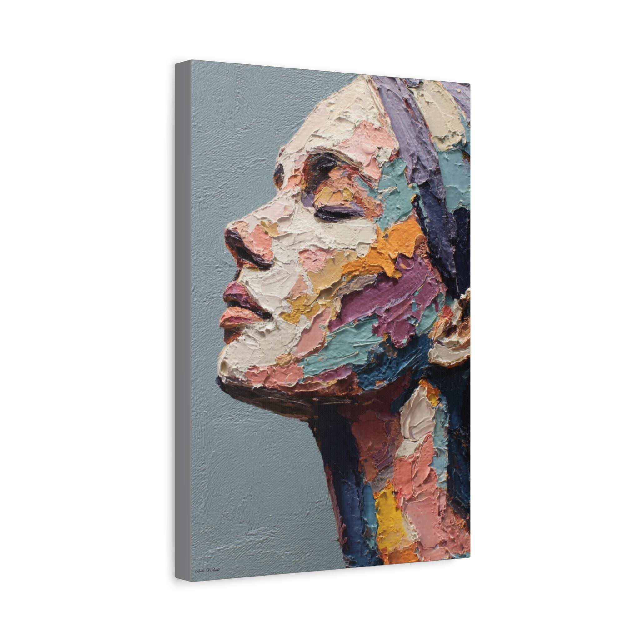 "Fragmented Contemplation" is an extraordinary figurative portrait designed to emulate an original oil painting executed with extreme heavy impasto. The artwork presents a female face in profile, her eyes gently closed in a moment of introspection or repose.