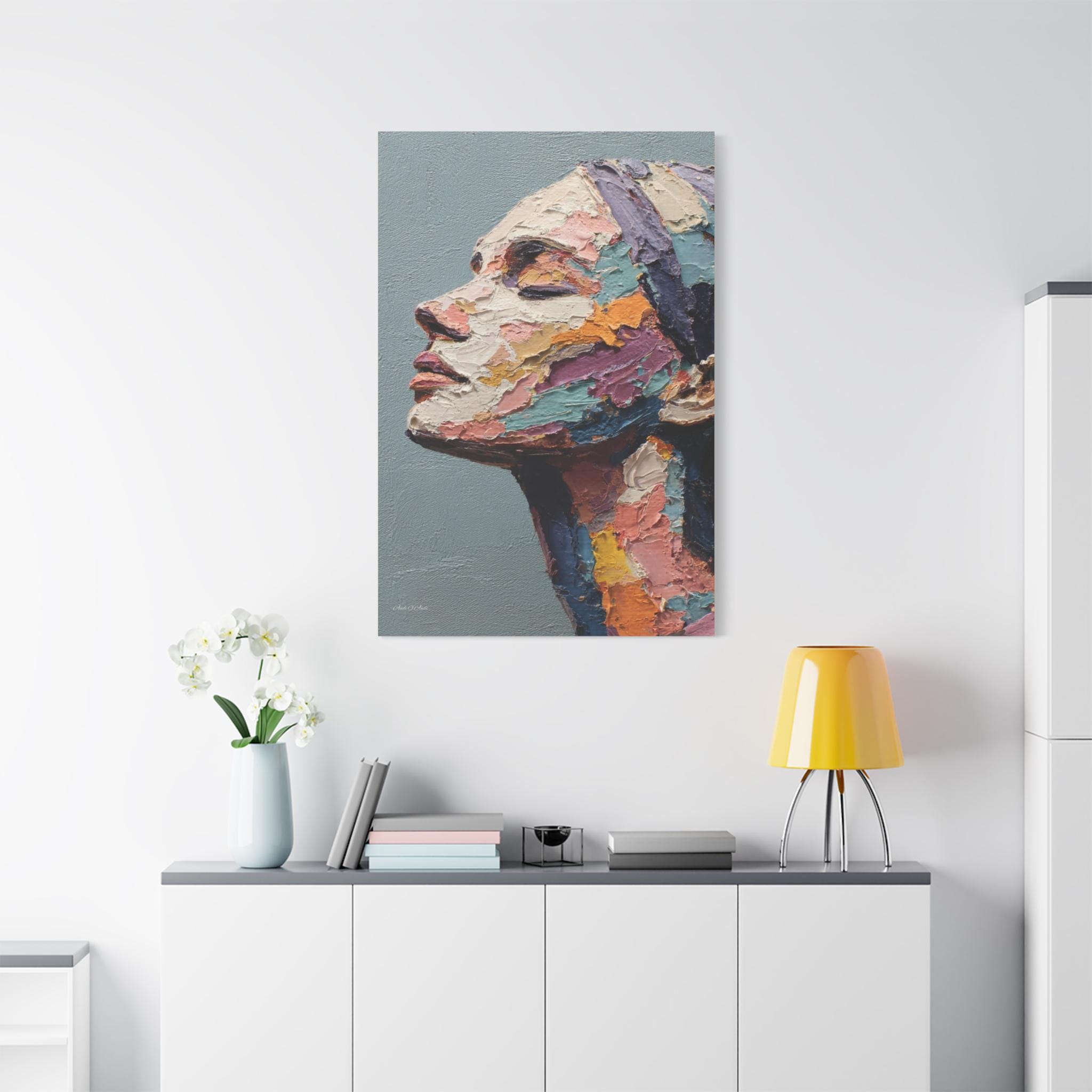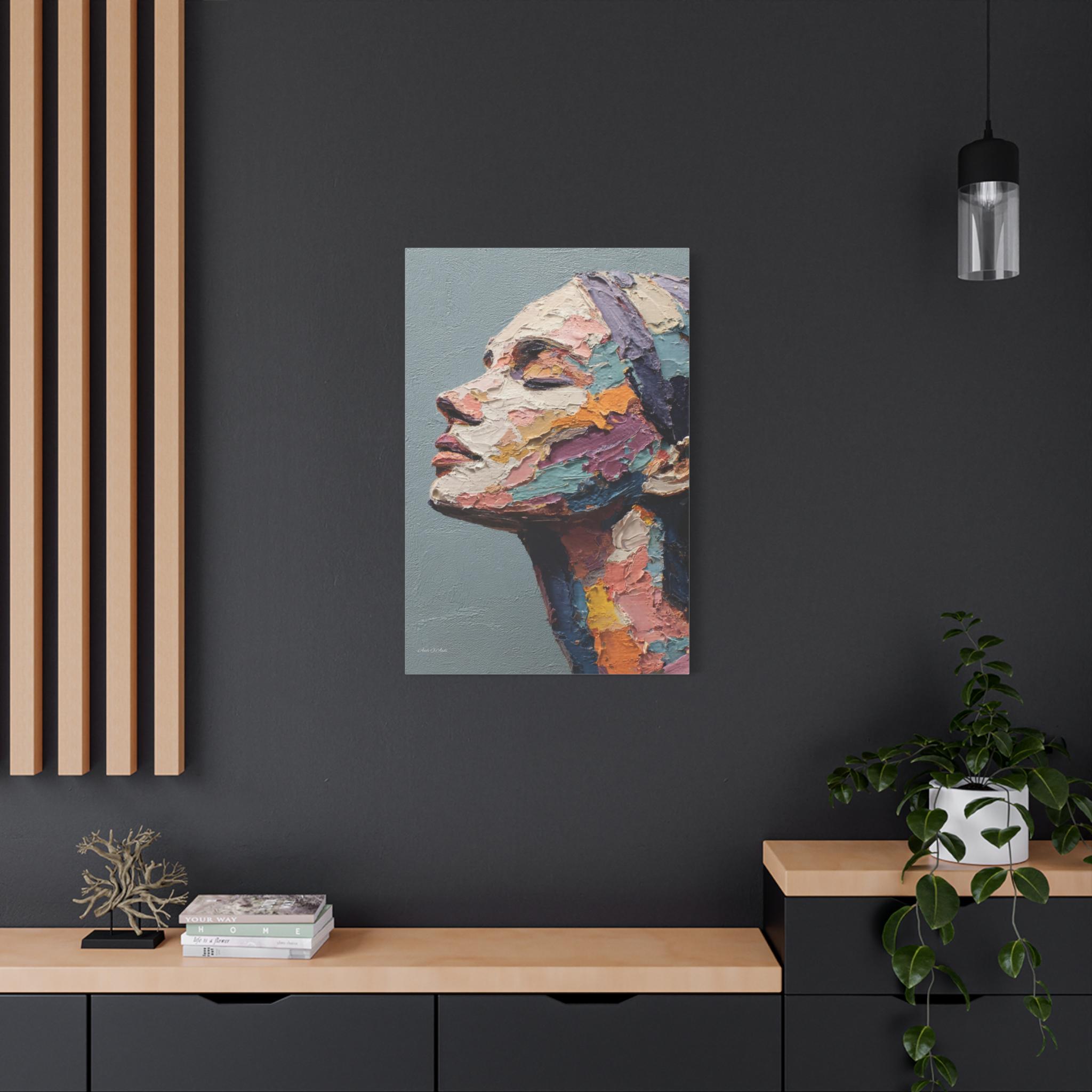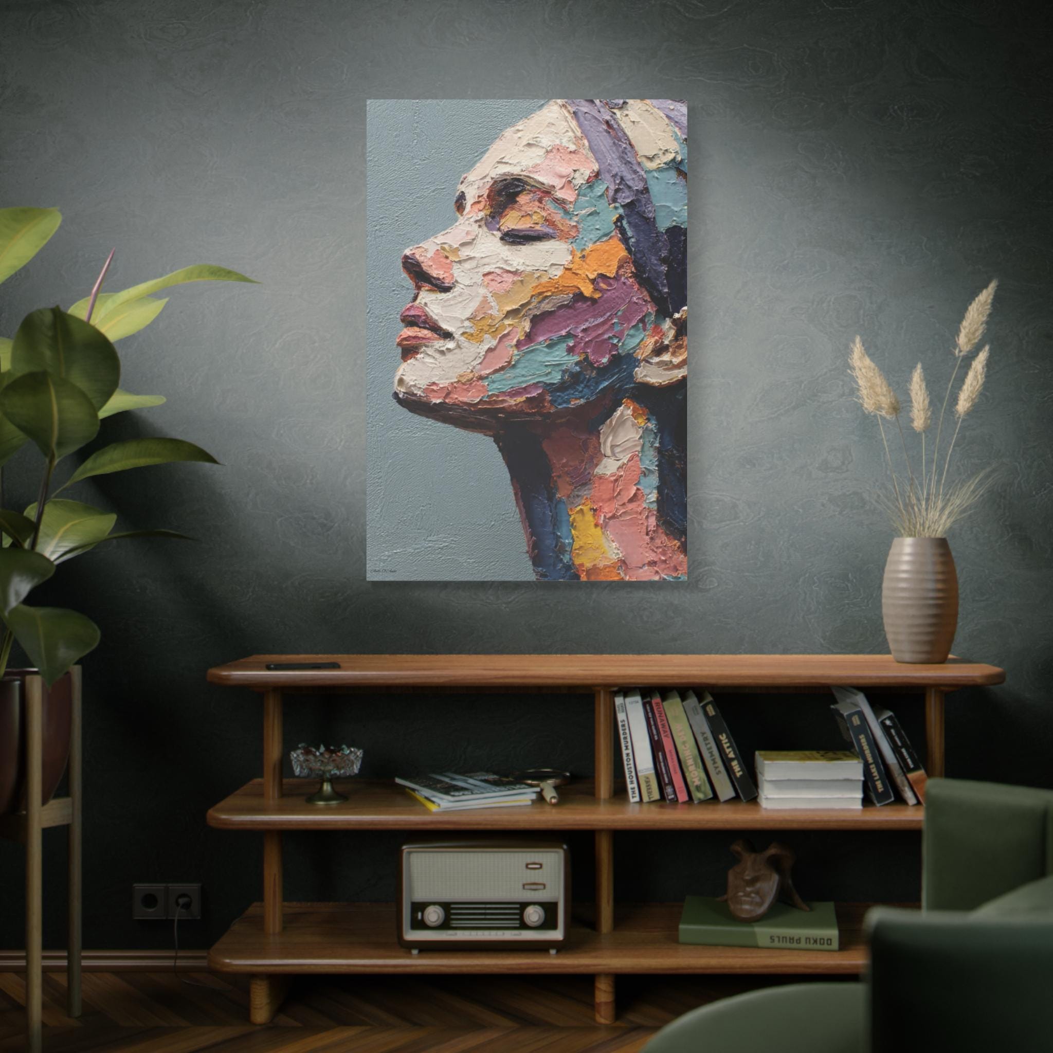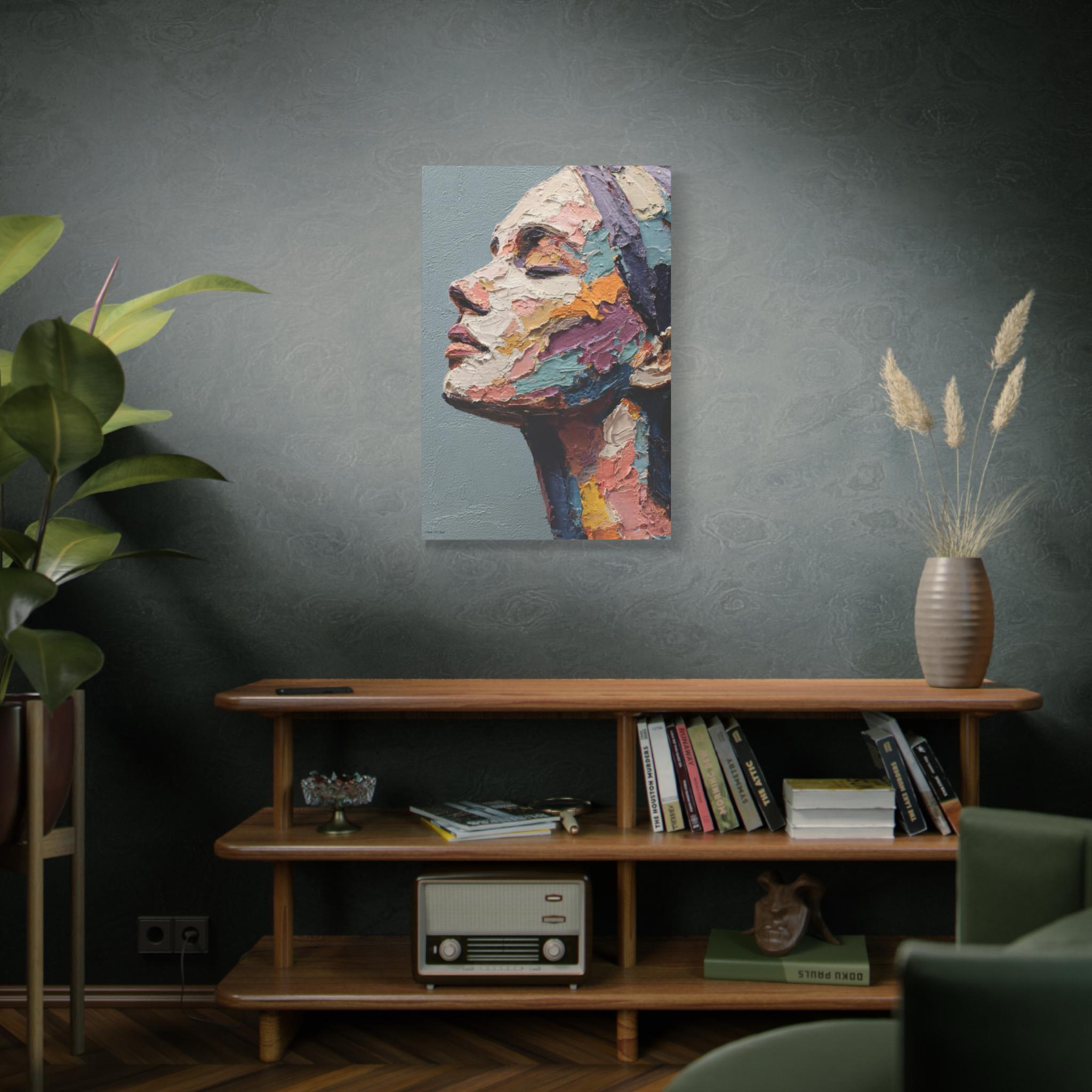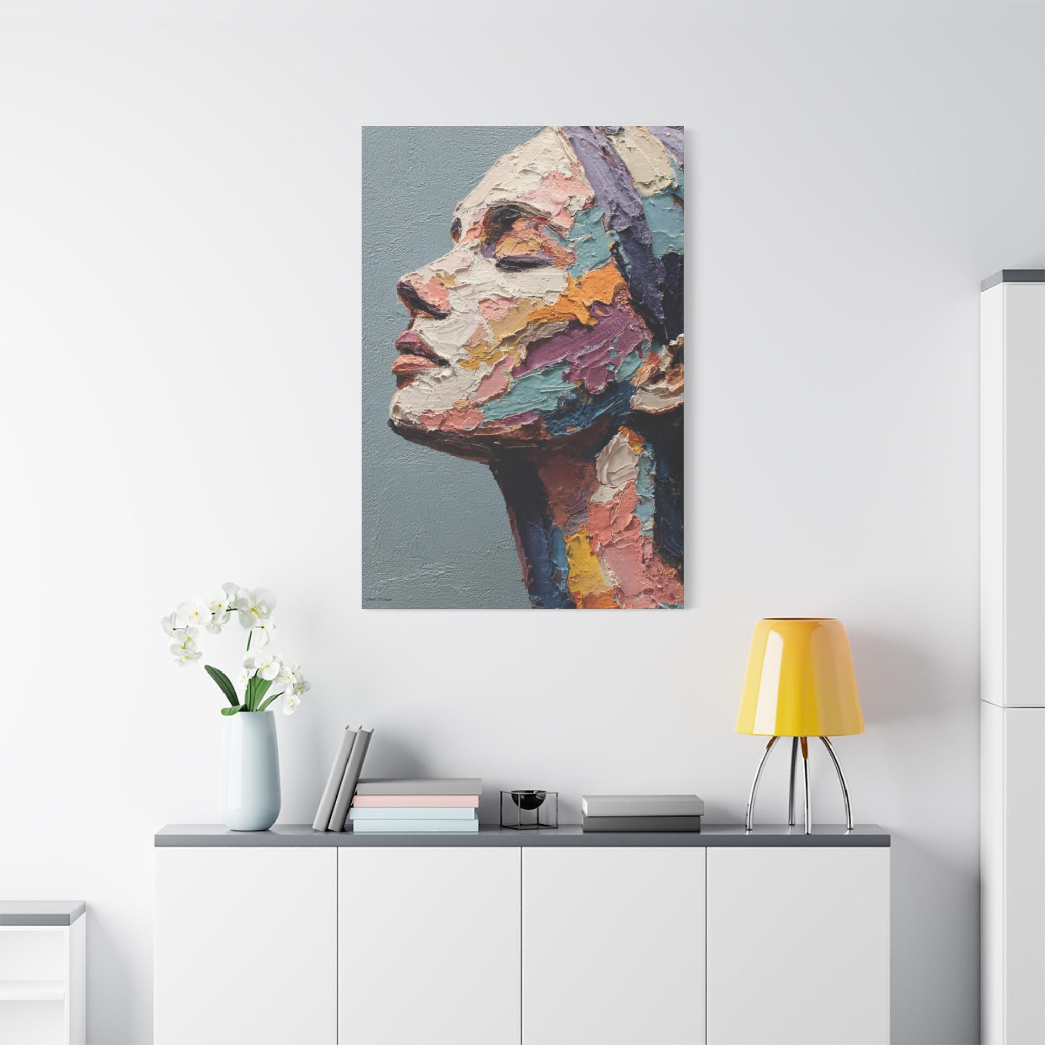"Fragmented Contemplation" is an extraordinary figurative portrait designed to emulate an original oil painting executed with extreme heavy impasto. The artwork presents a female face in profile, her eyes gently closed in a moment of introspection or repose.