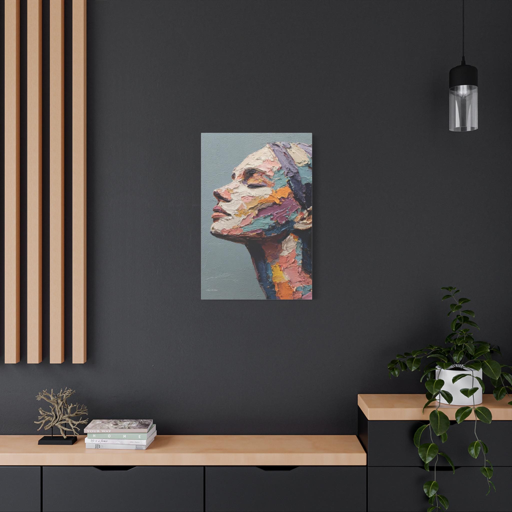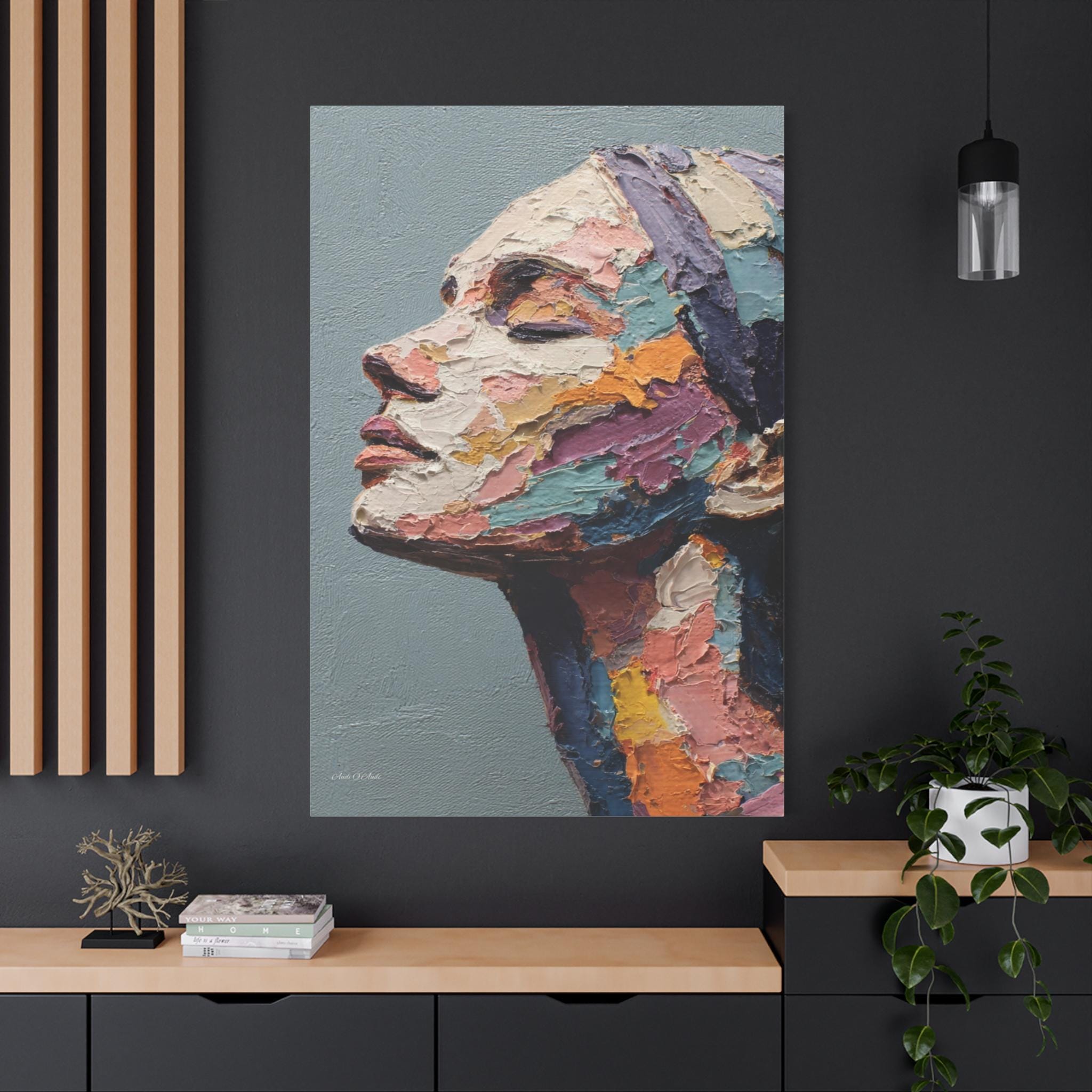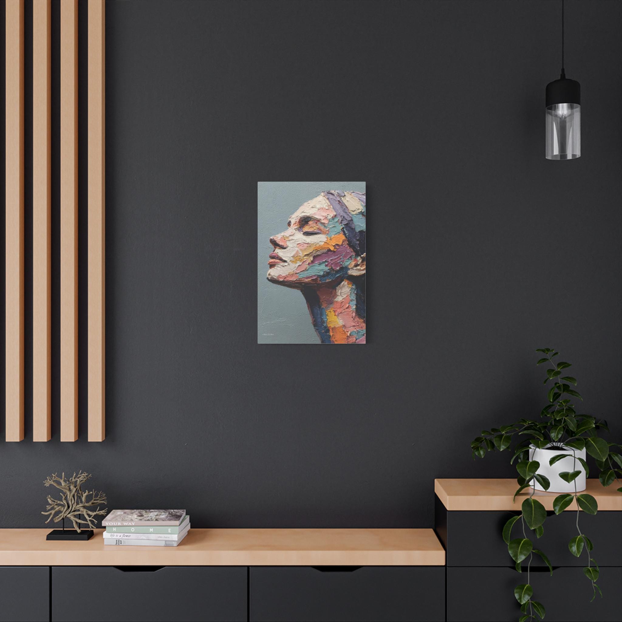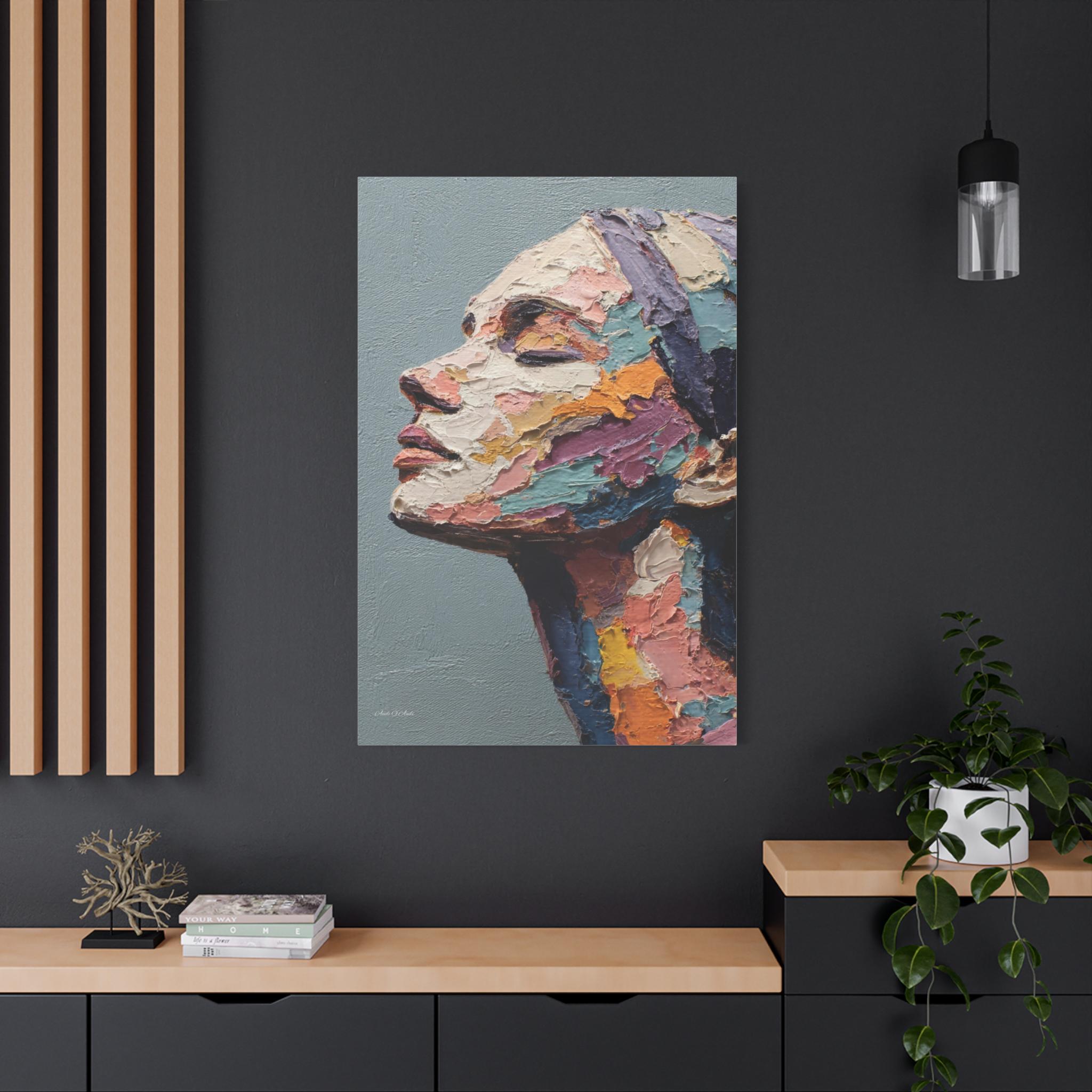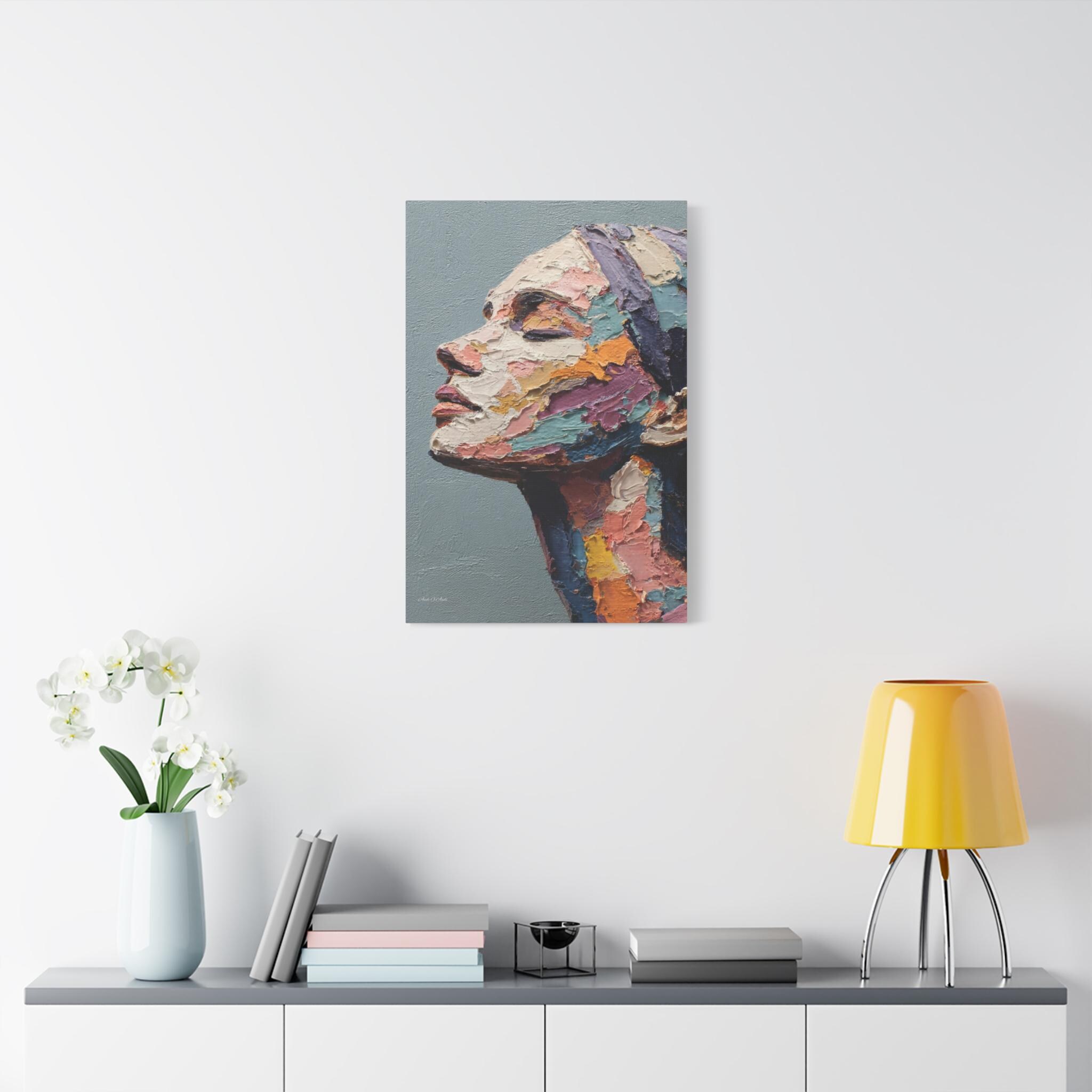 "Fragmented Contemplation" is an extraordinary figurative portrait designed to emulate an original oil painting executed with extreme heavy impasto. The artwork presents a female face in profile, her eyes gently closed in a moment of introspection or repose.