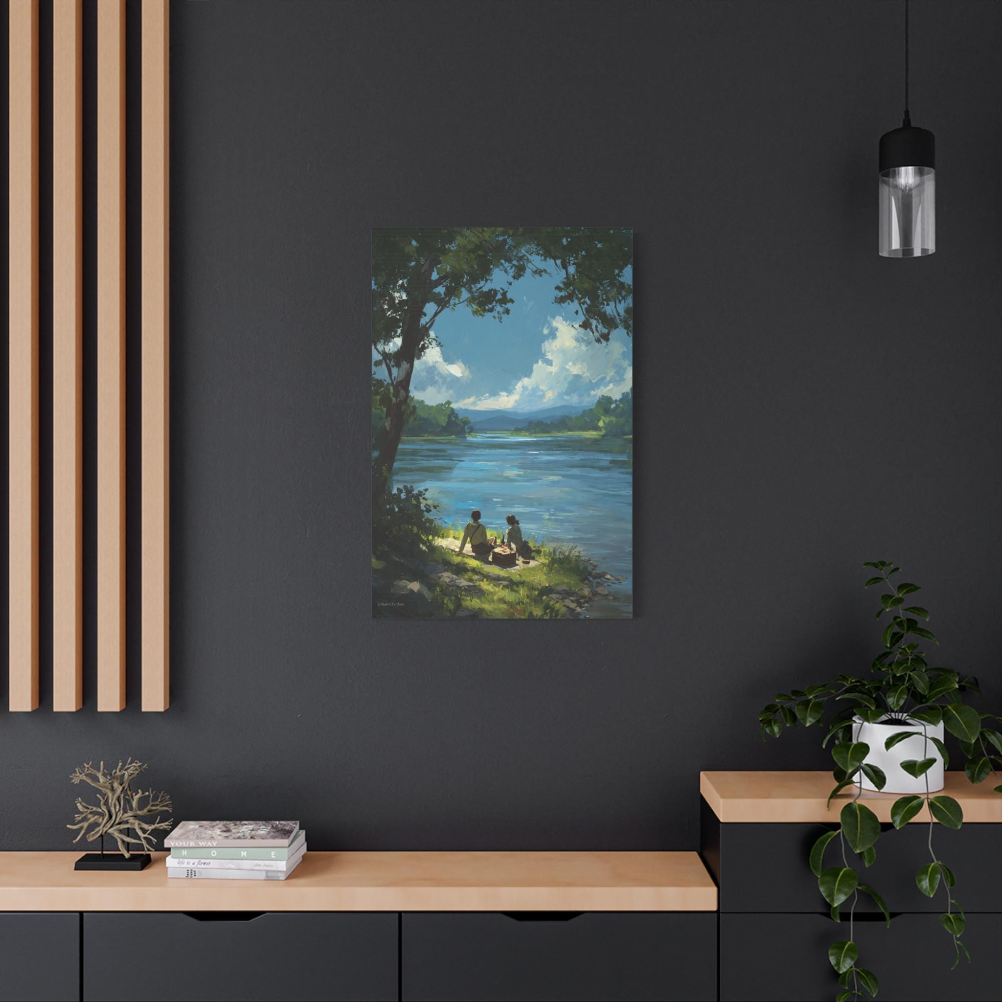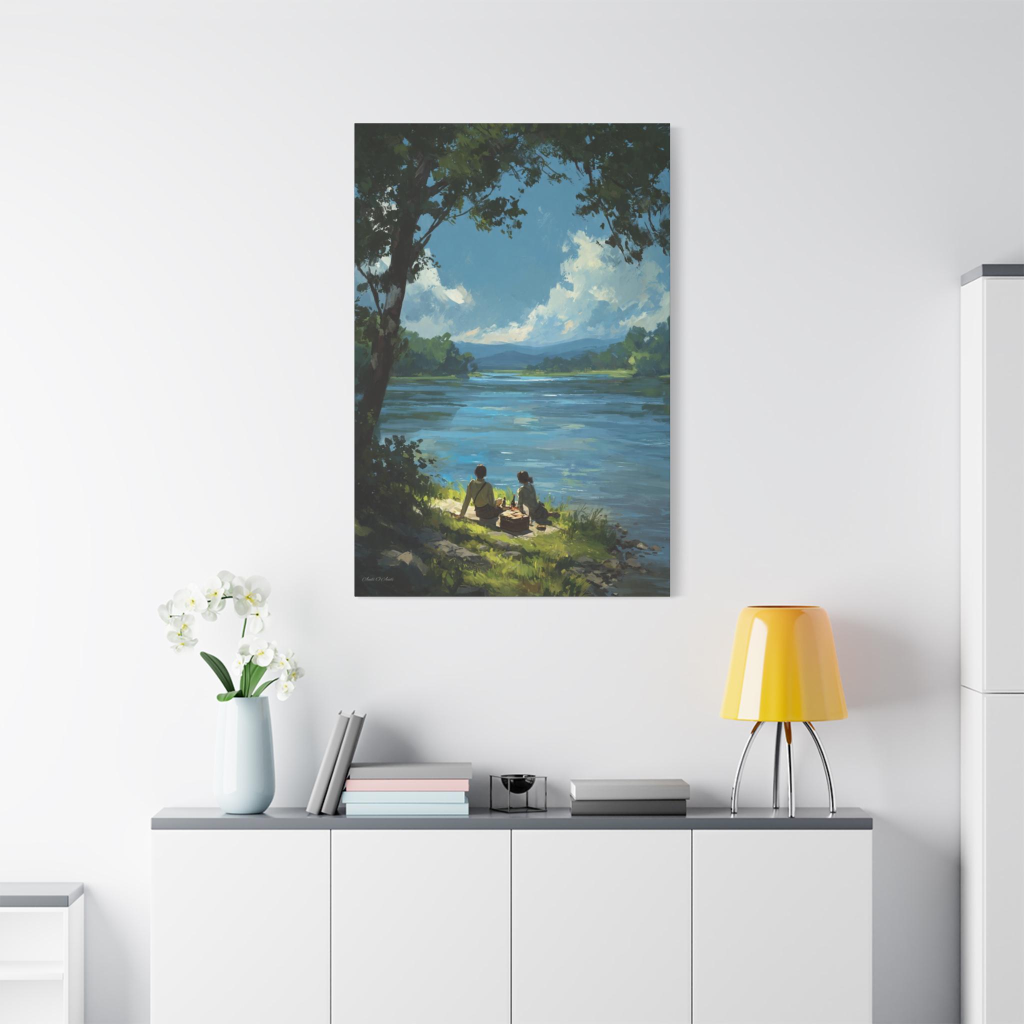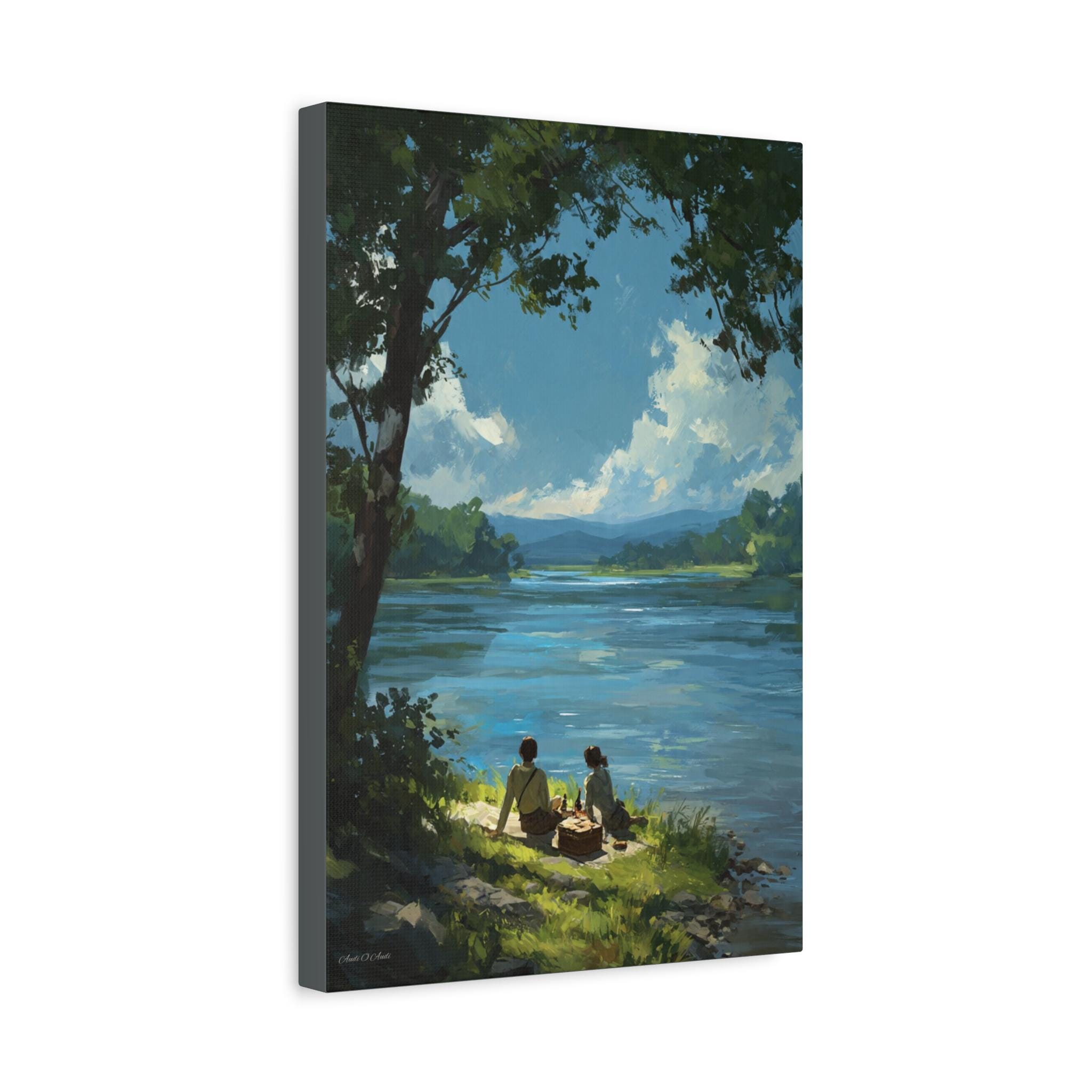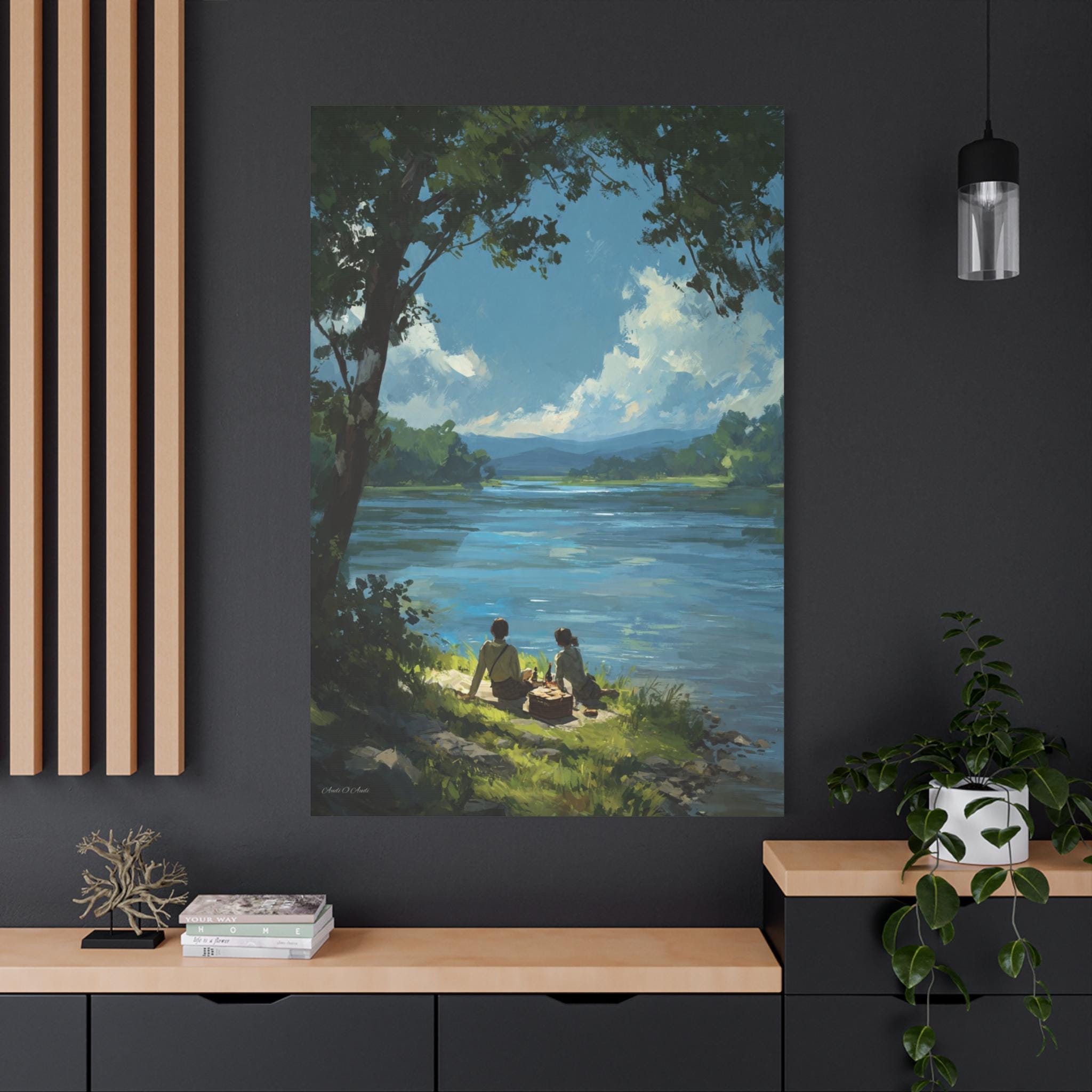"Waterside Serenity" is an expertly composed vertical landscape Canvas print that utilizes a strong, natural vignette to focus the viewer's eye. Executed in a style that blends Impressionism with contemporary realism, the piece captures a moment of tranquil leisure by the water.