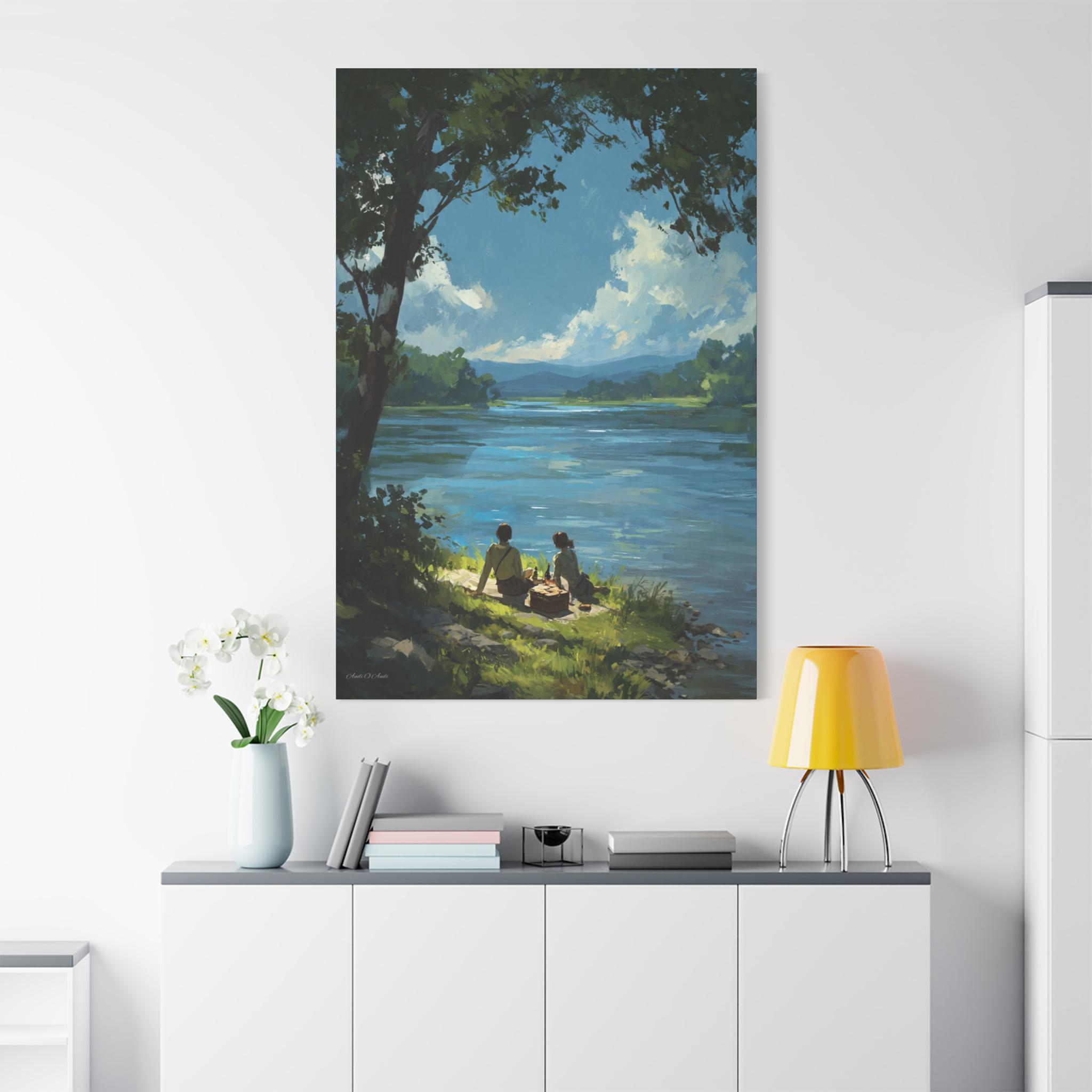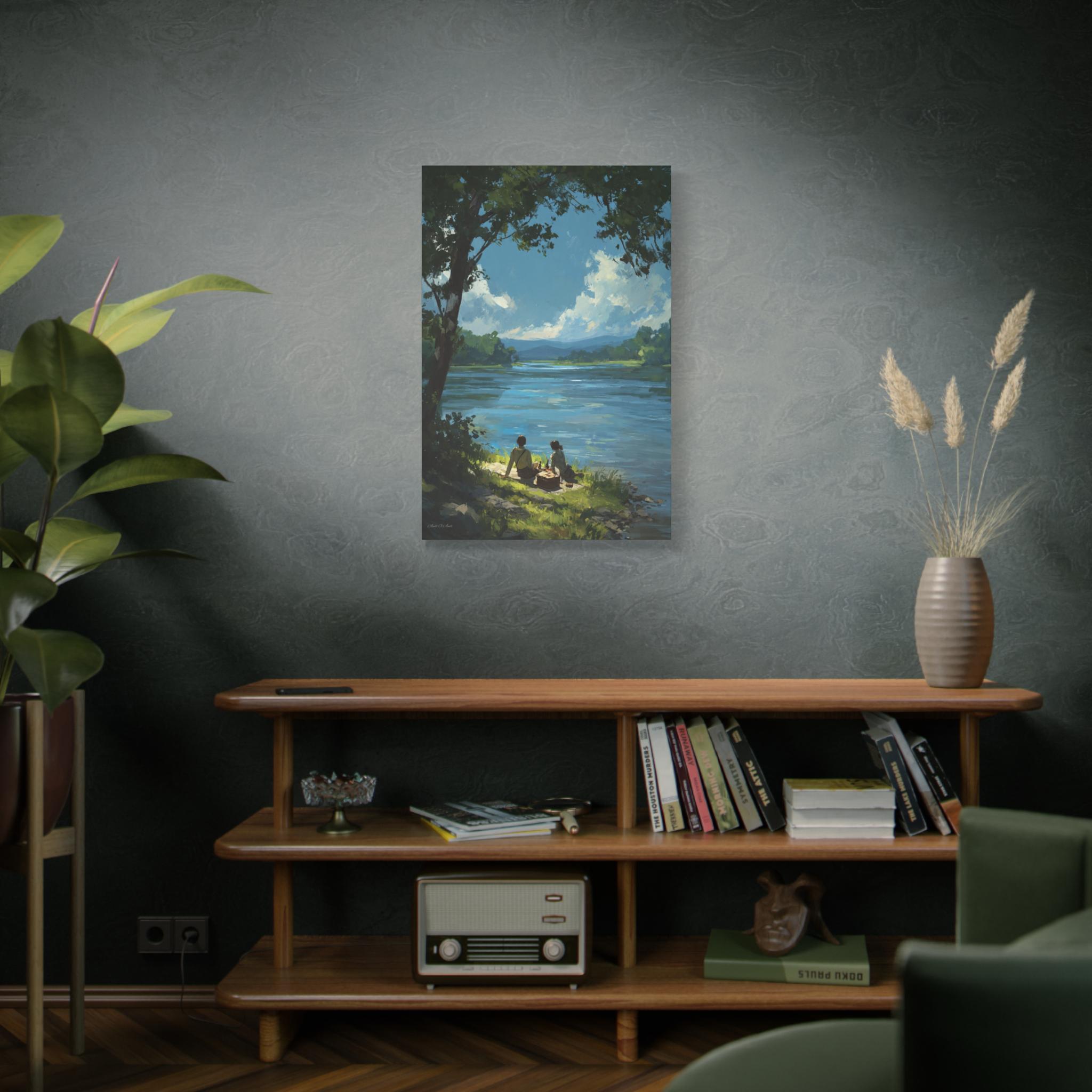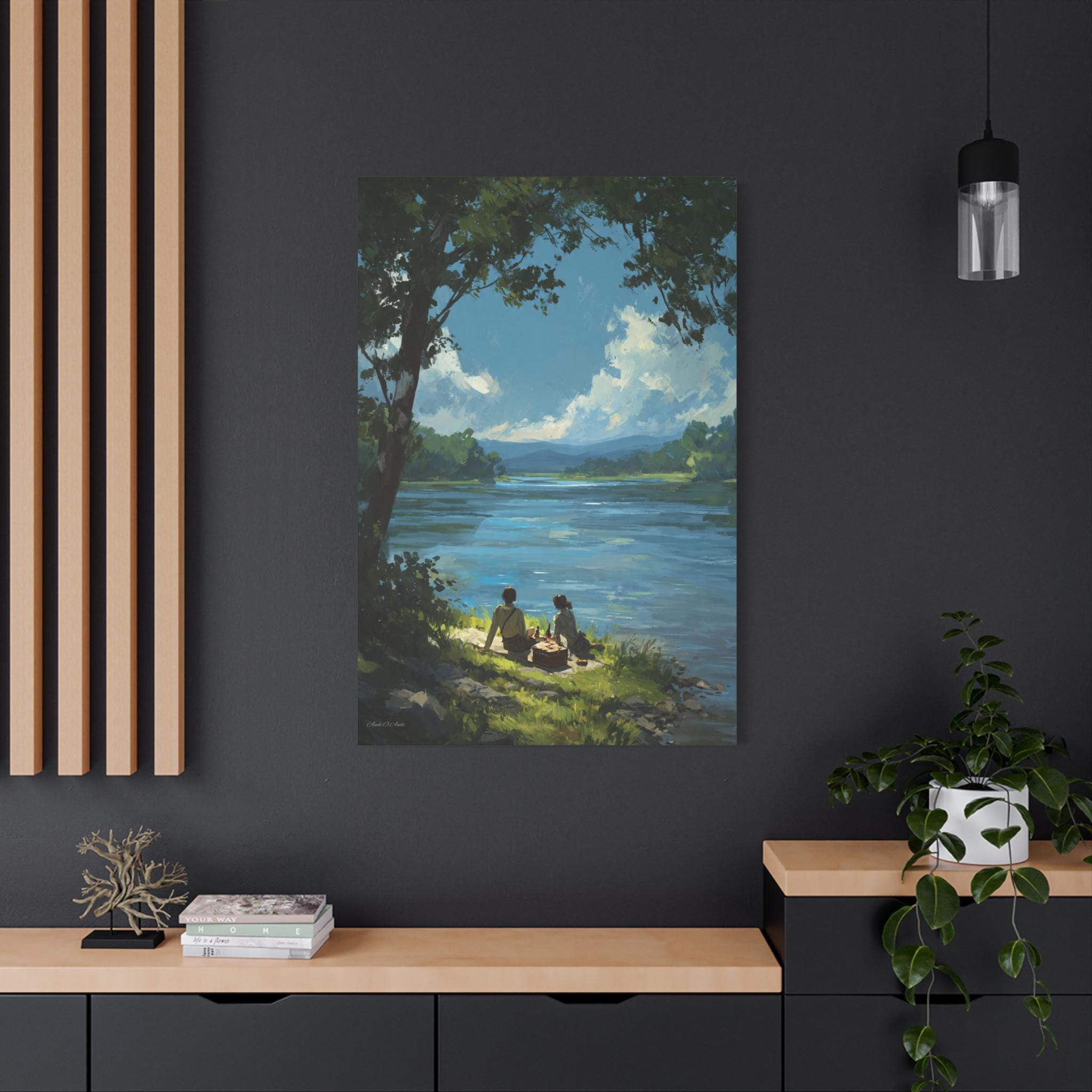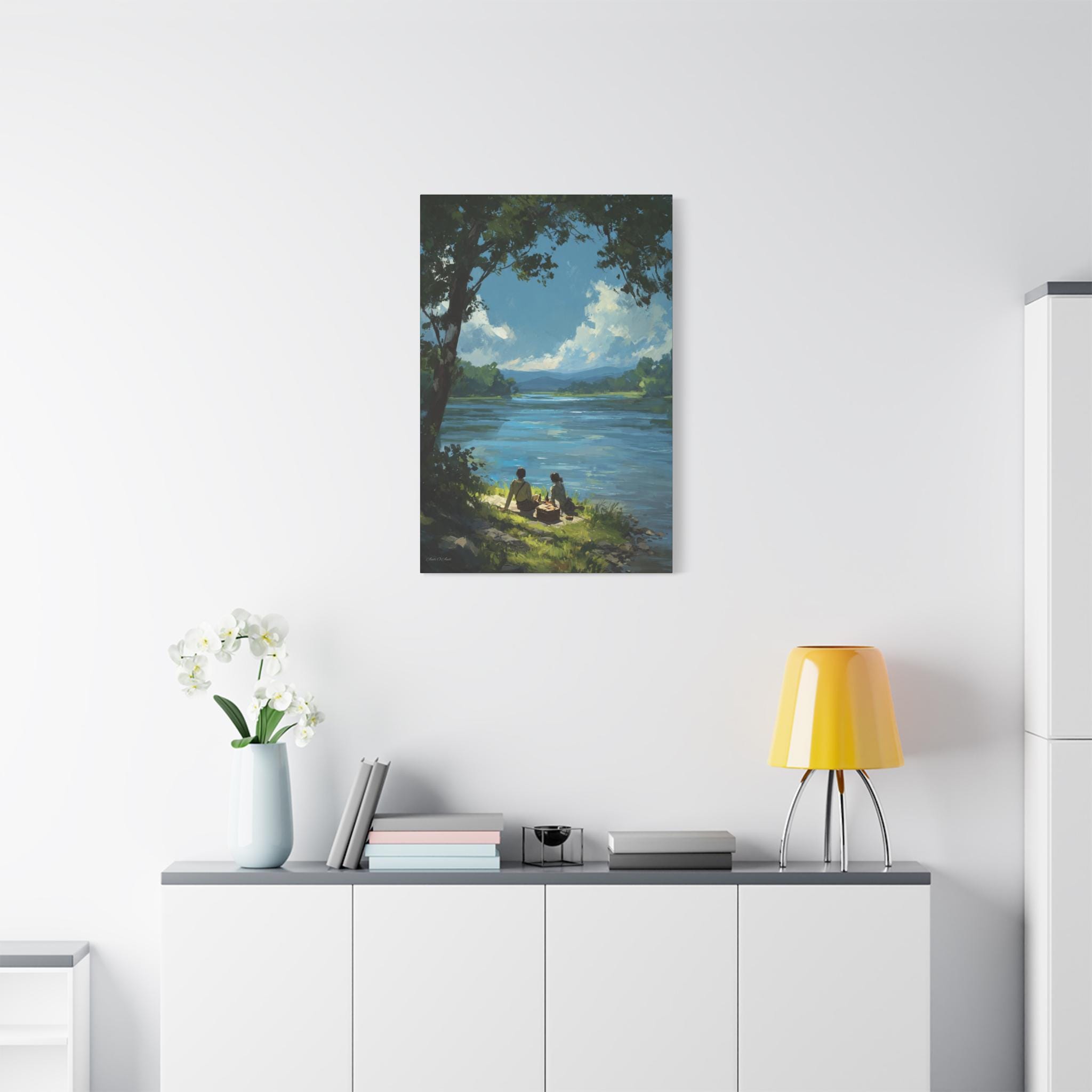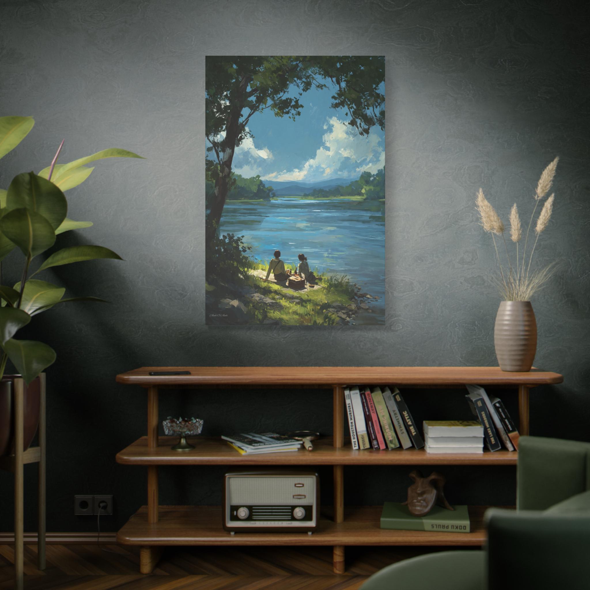 "Waterside Serenity" is an expertly composed vertical landscape Canvas print that utilizes a strong, natural vignette to focus the viewer's eye. Executed in a style that blends Impressionism with contemporary realism, the piece captures a moment of tranquil leisure by the water.