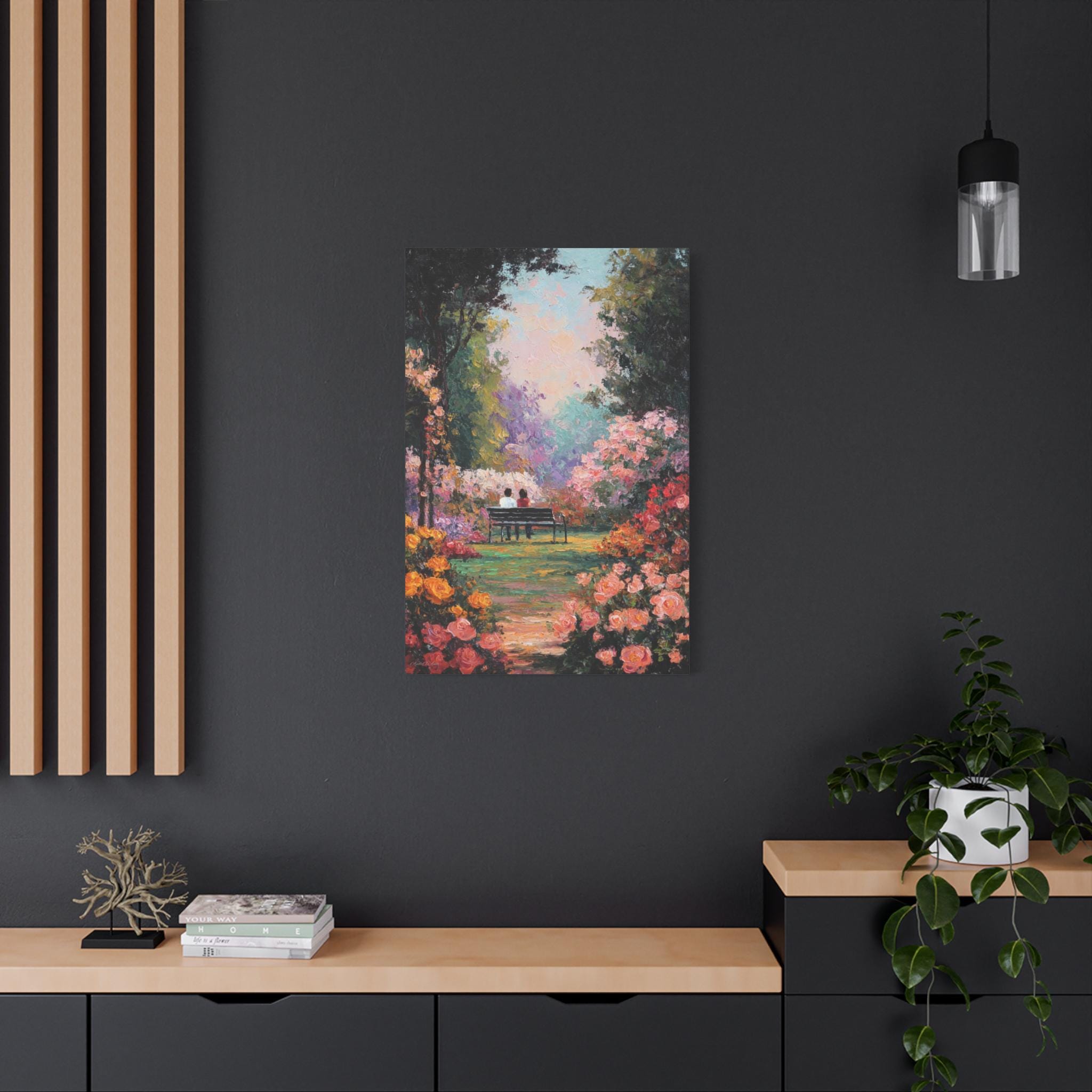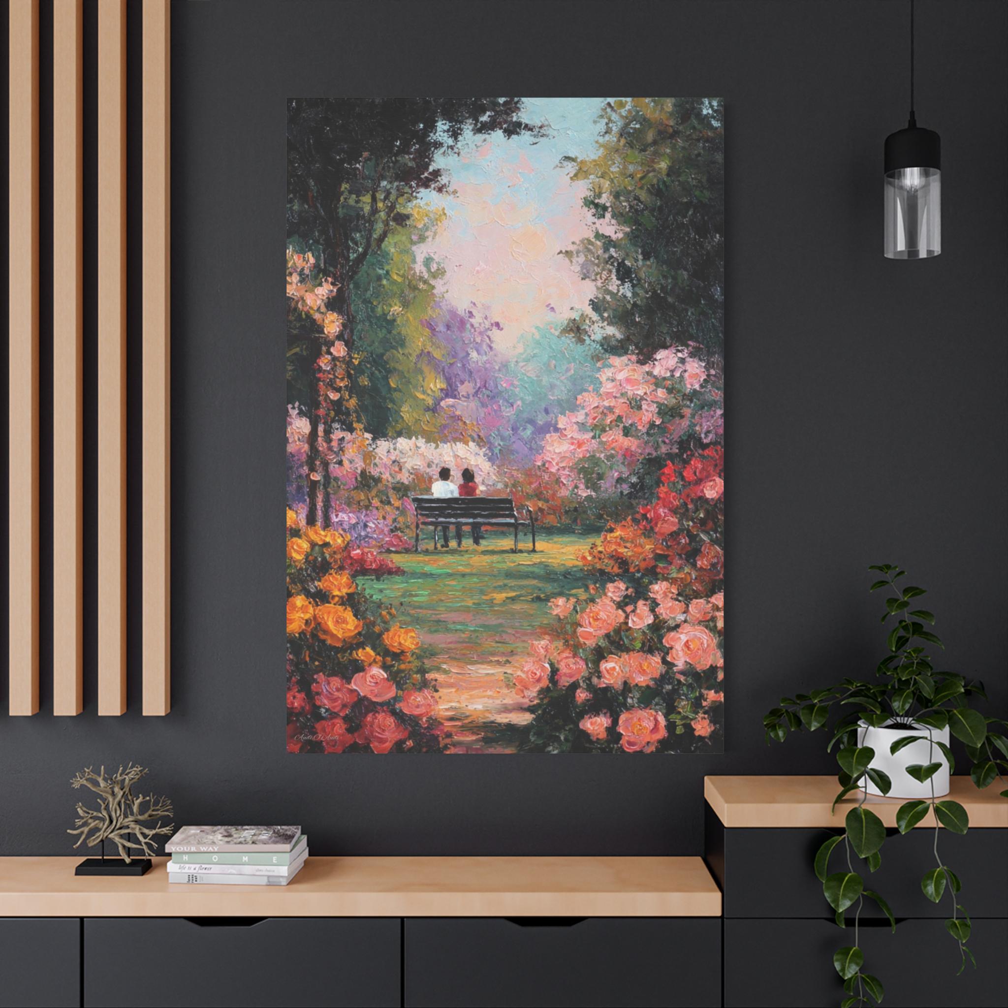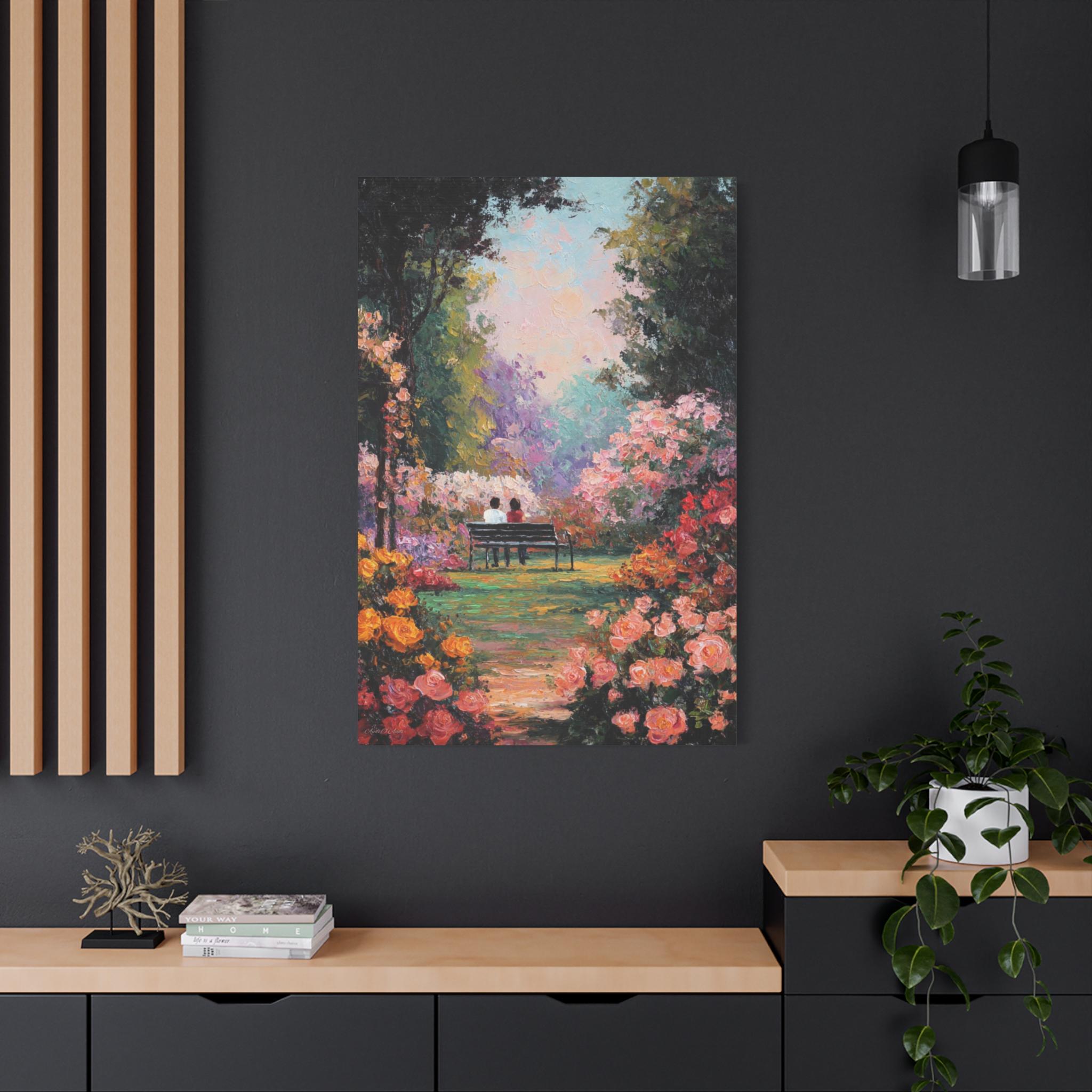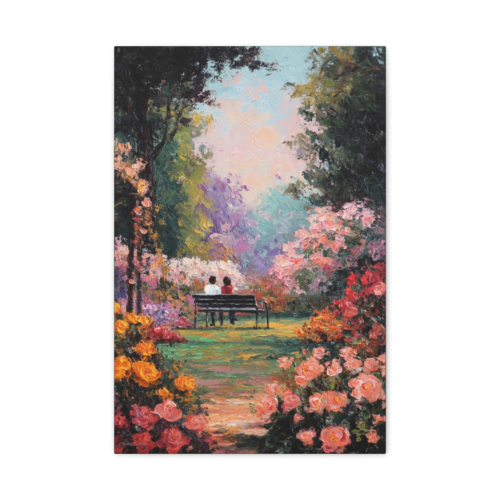 Subject: The focal point is a pair of figures seated side-by-side on a simple park bench, viewed from the rear. Their casual presence is dwarfed and softened by the surrounding garden, underscoring a theme of intimate connection and natural sanctuary.