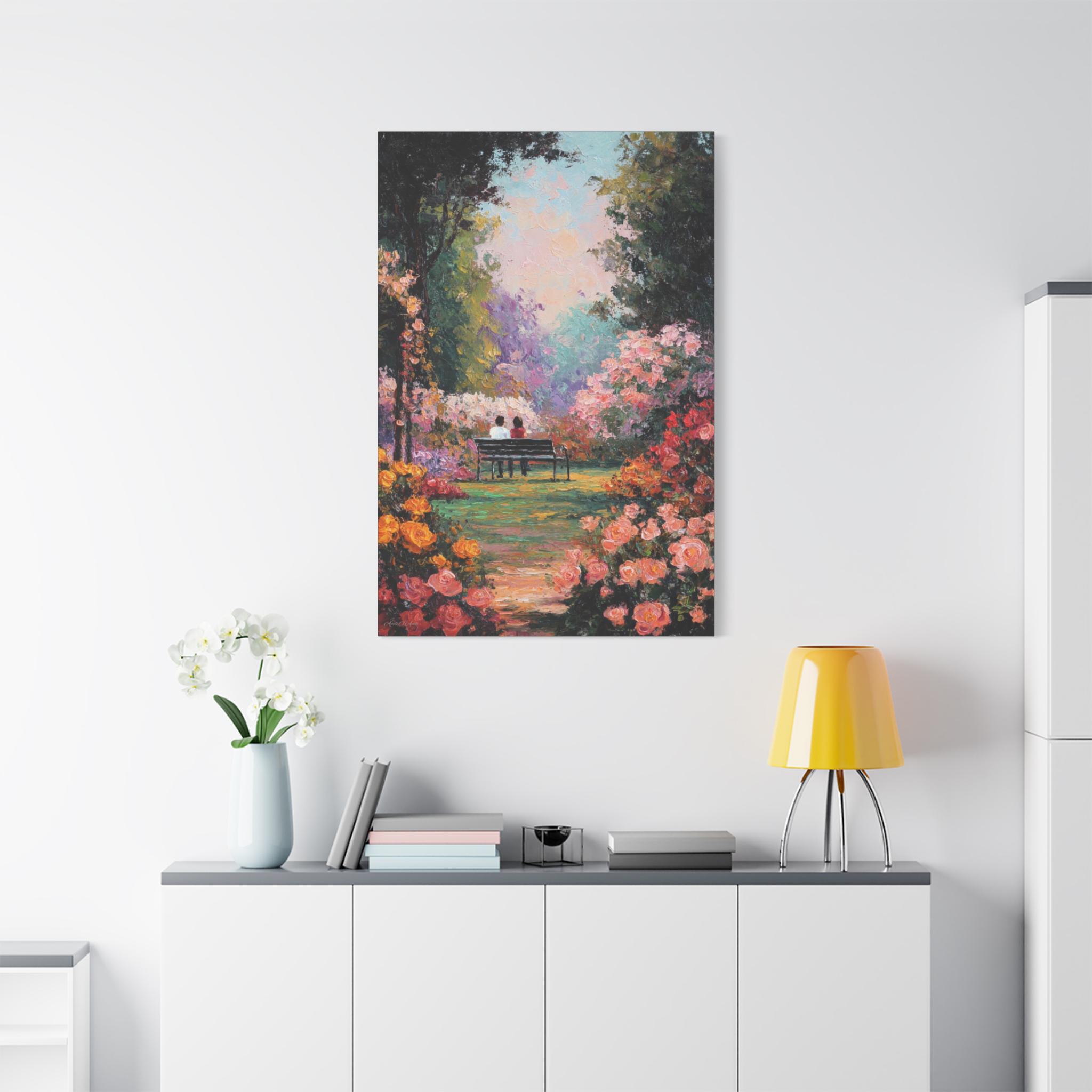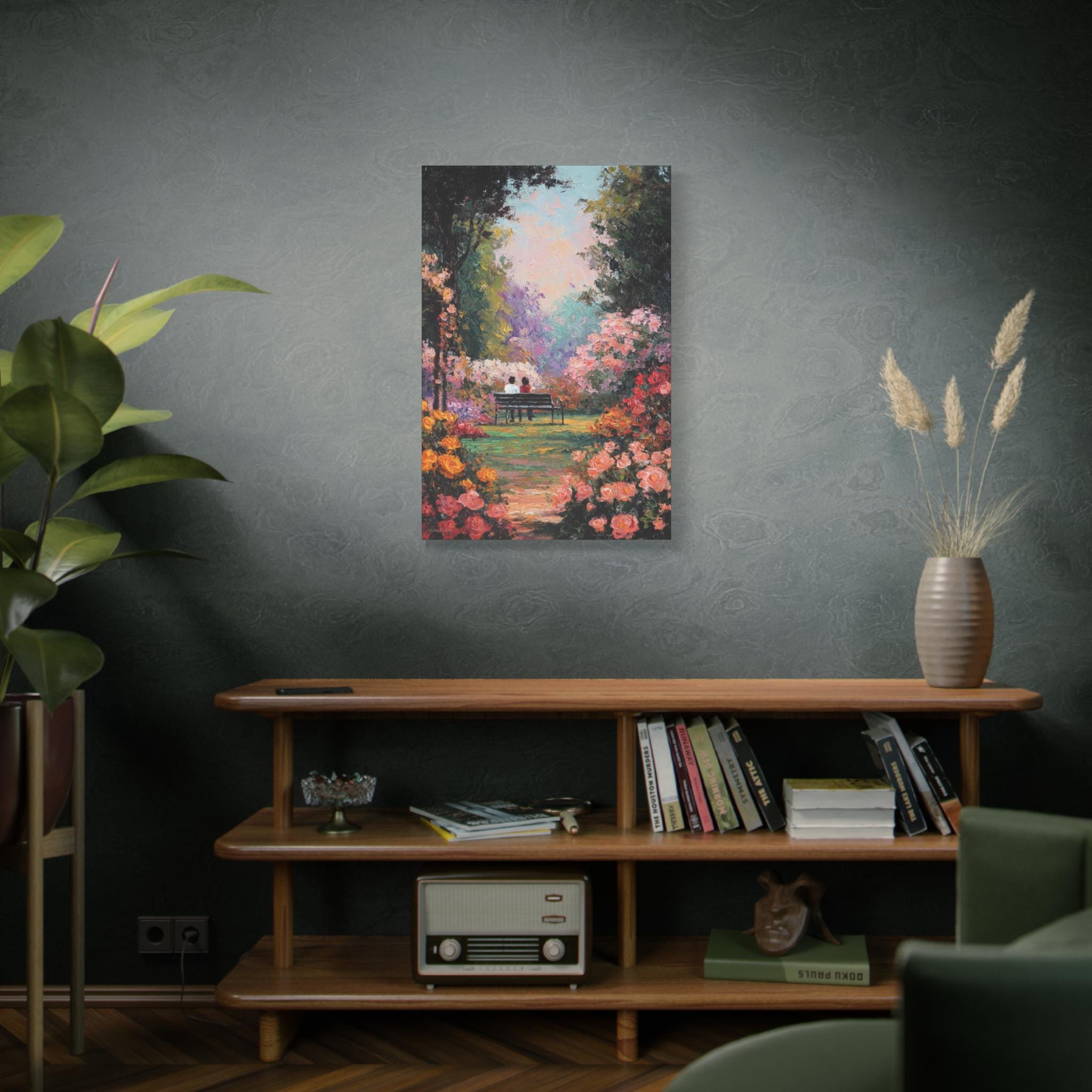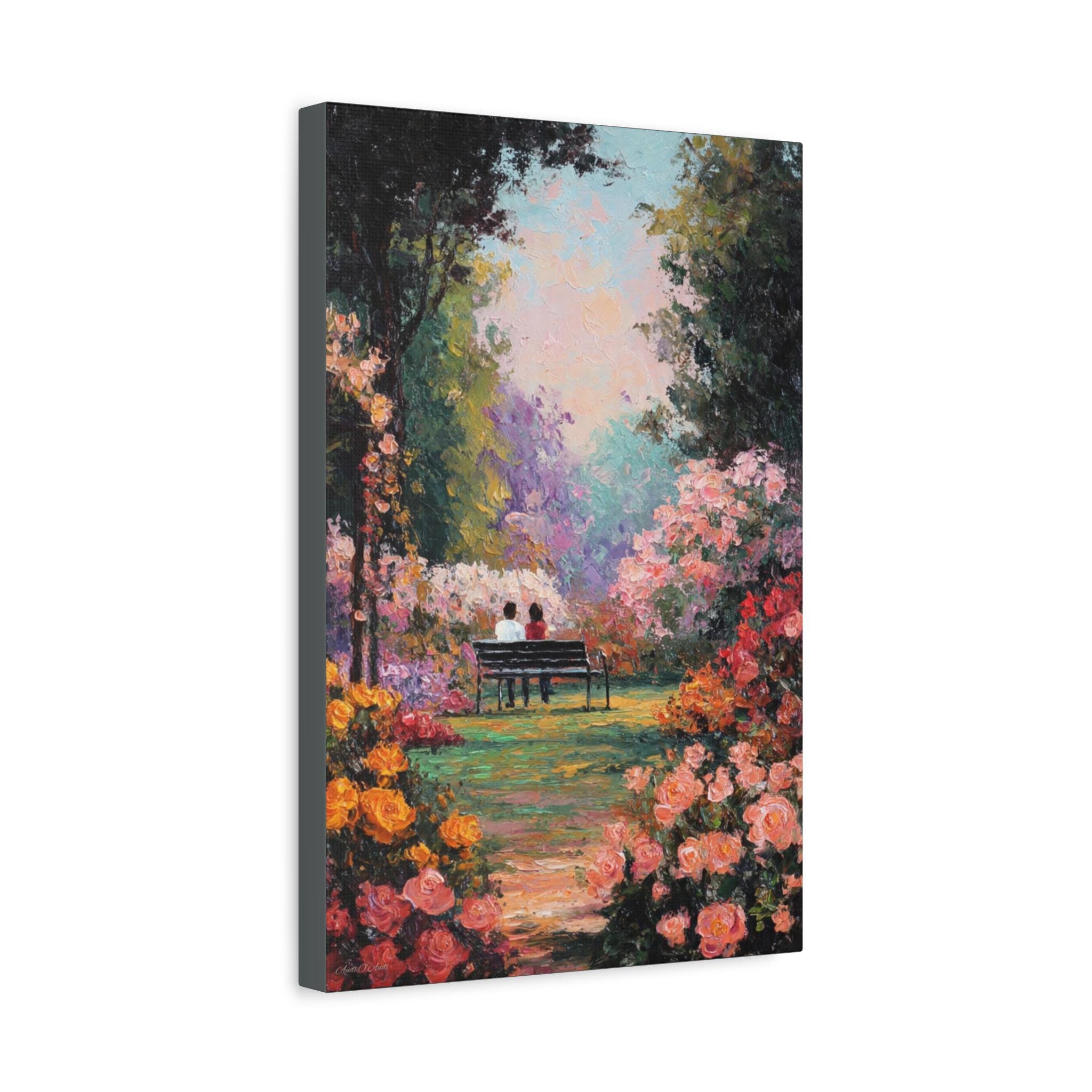 Subject: The focal point is a pair of figures seated side-by-side on a simple park bench, viewed from the rear. Their casual presence is dwarfed and softened by the surrounding garden, underscoring a theme of intimate connection and natural sanctuary.