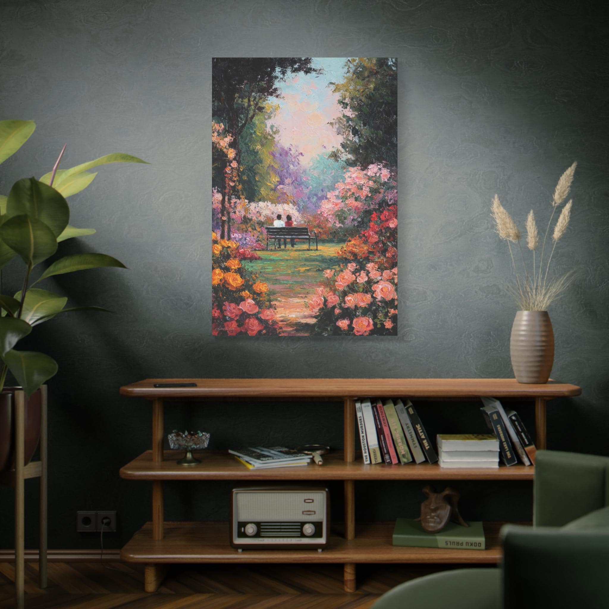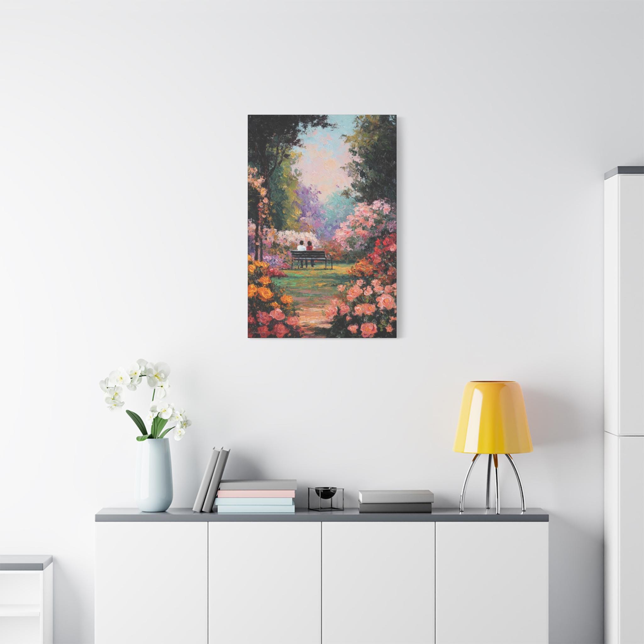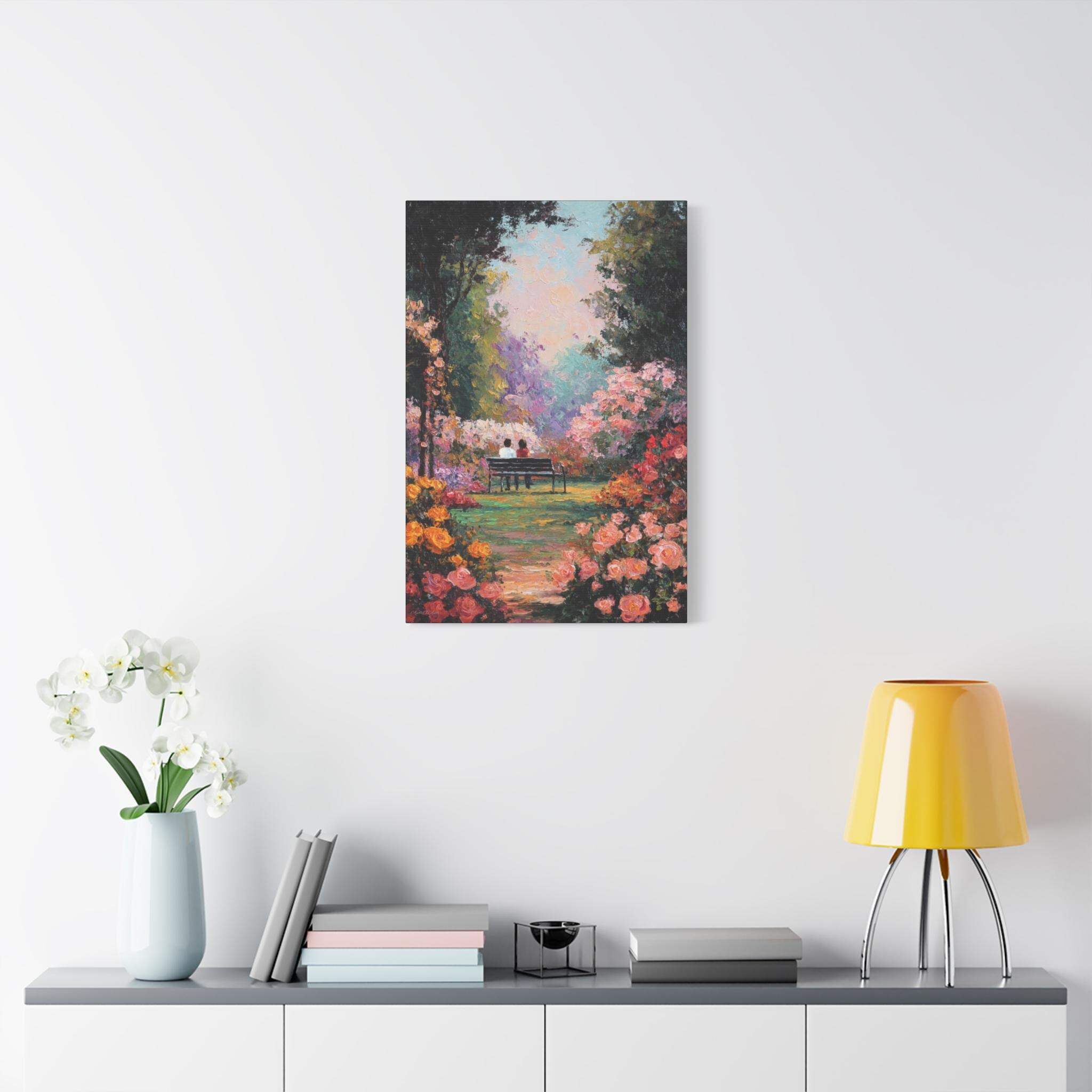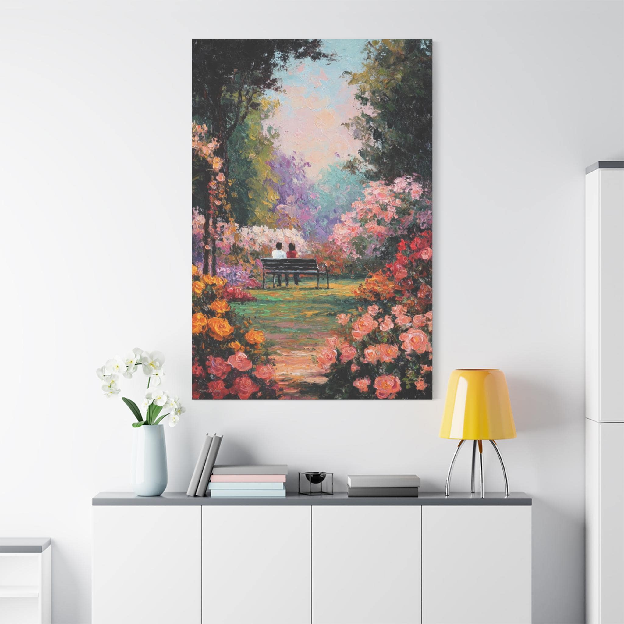 Subject: The focal point is a pair of figures seated side-by-side on a simple park bench, viewed from the rear. Their casual presence is dwarfed and softened by the surrounding garden, underscoring a theme of intimate connection and natural sanctuary.