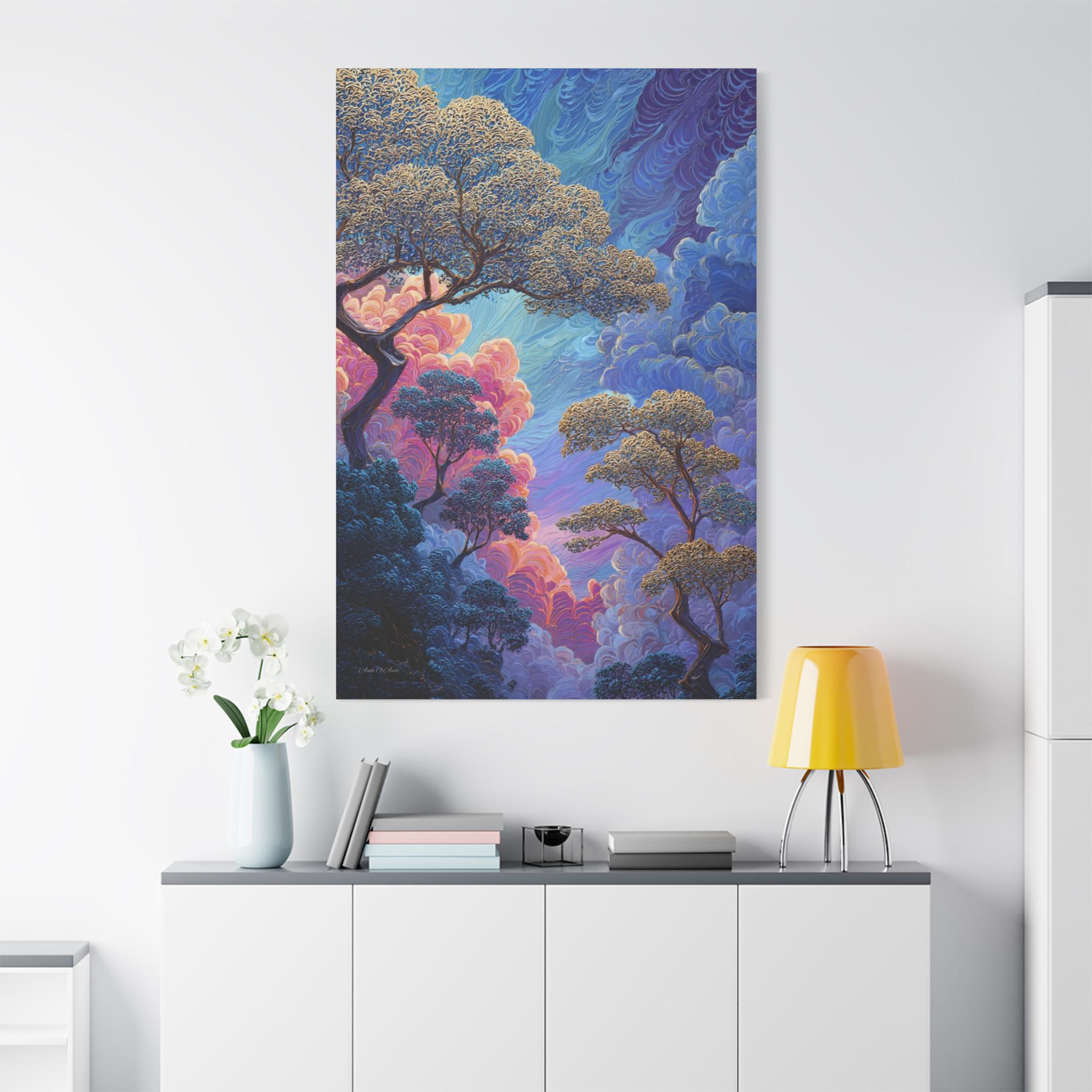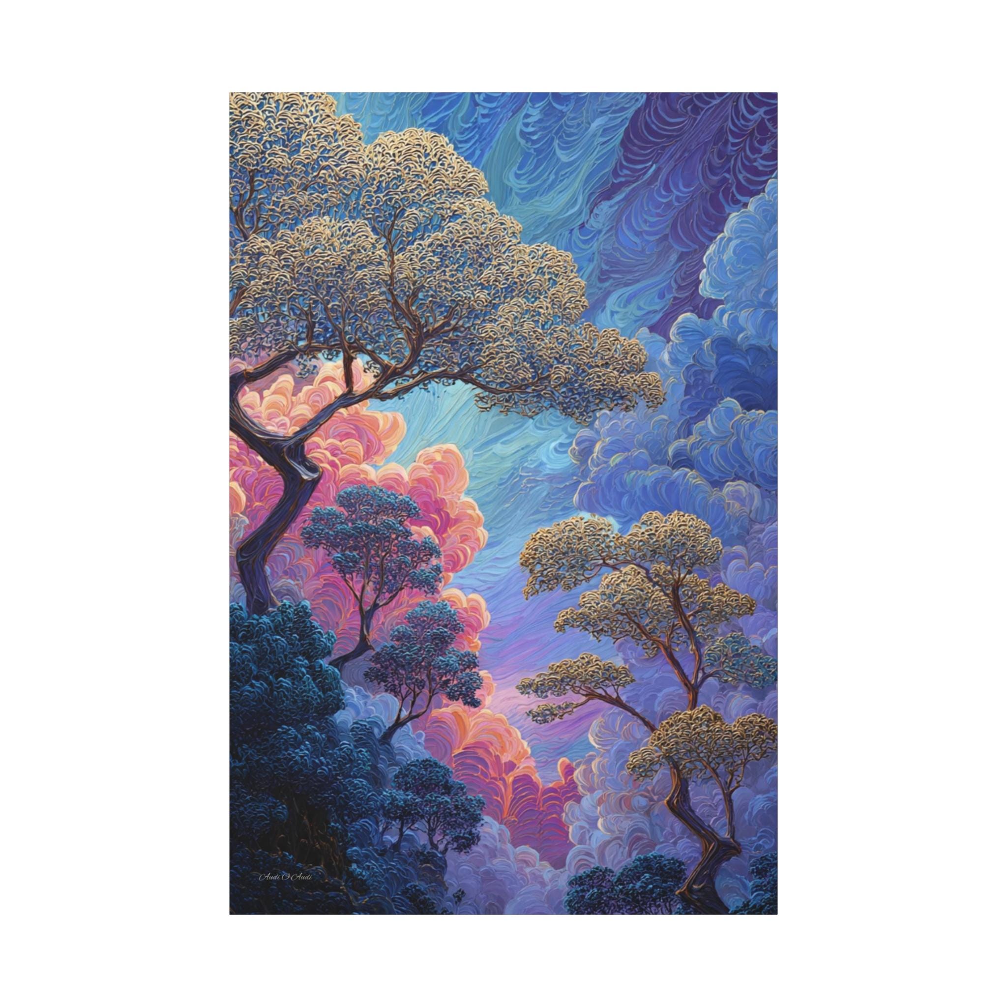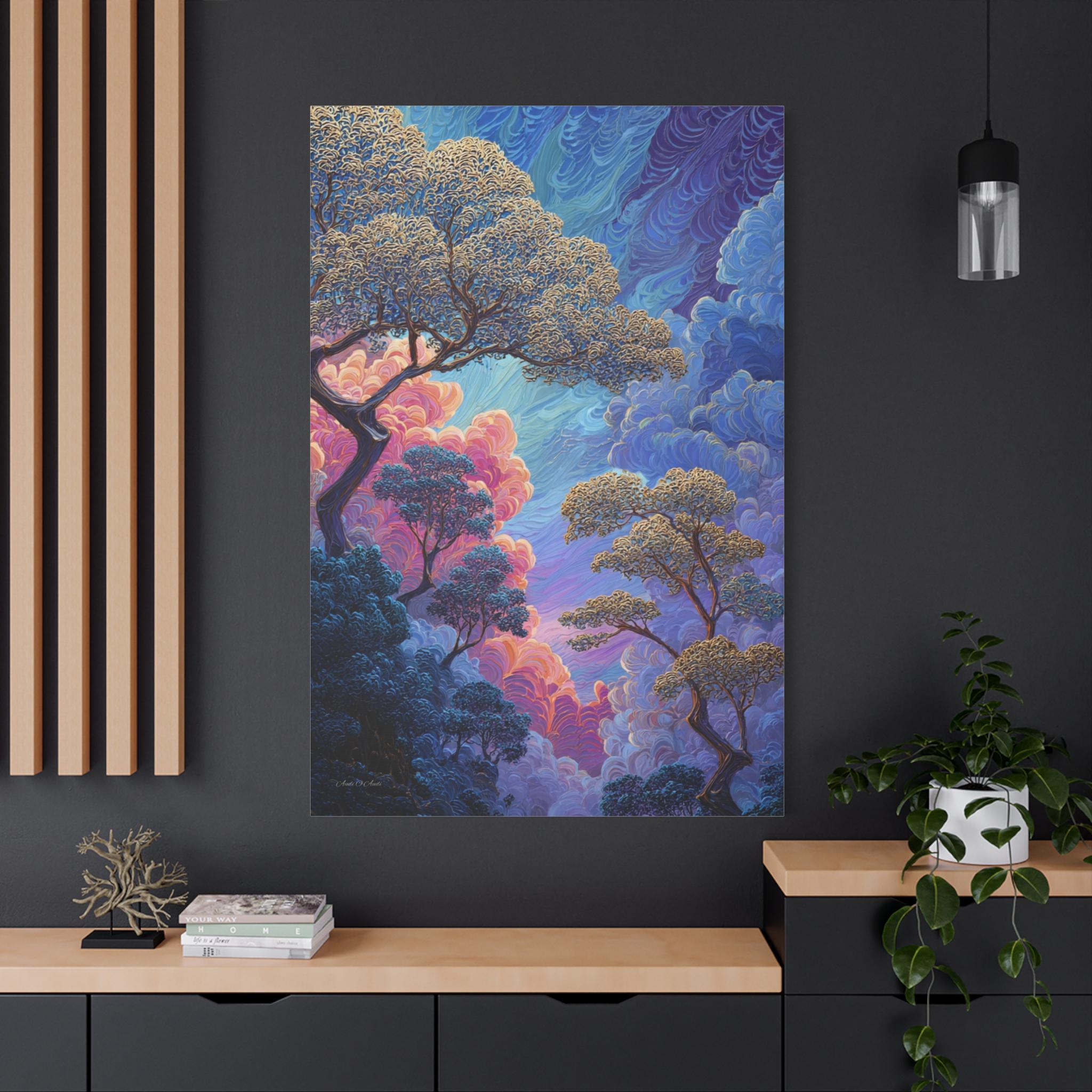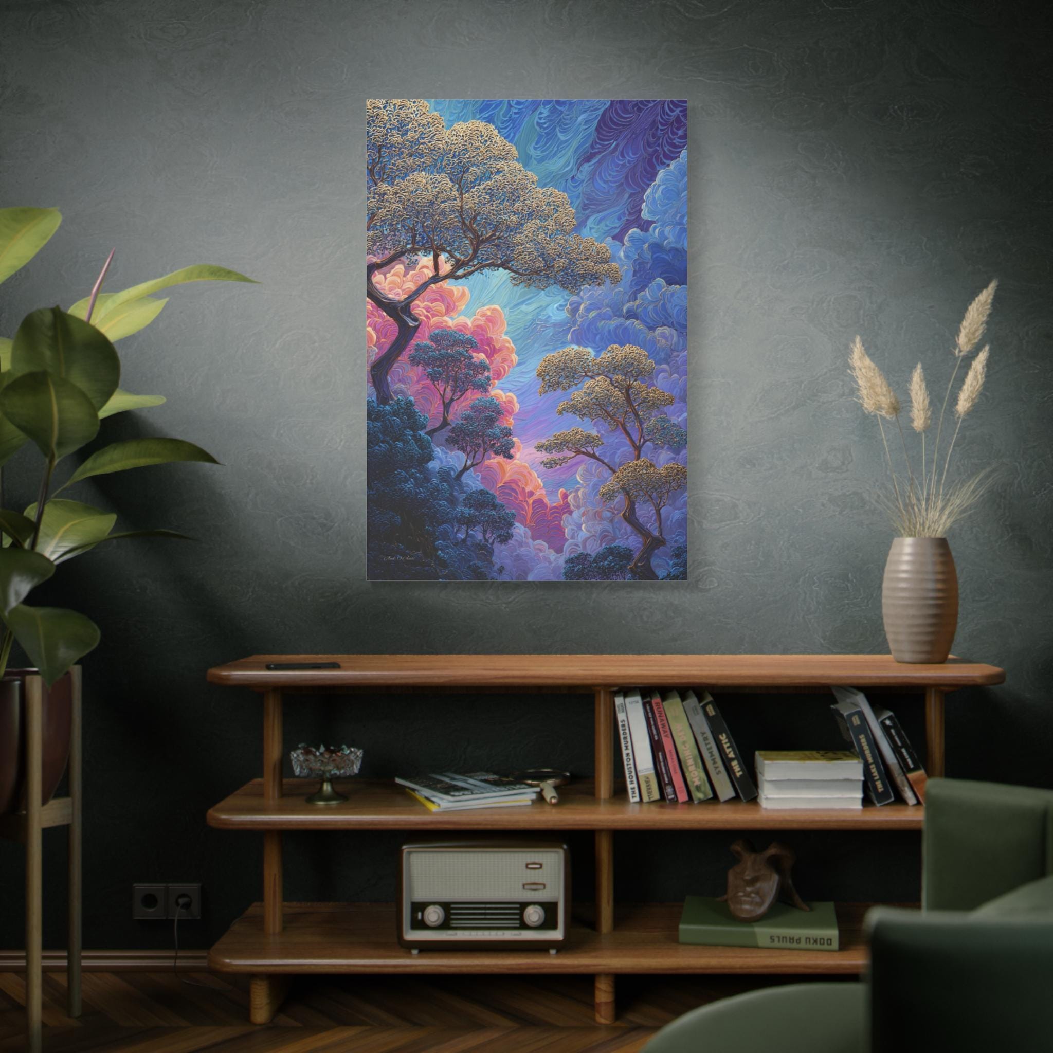 "Celestial Grove" is a mesmerizing vertical landscape that transports the viewer to an ethereal, dreamlike realm. The artwork is characterized by an explosion of color and intricate, stylized texture that gives the entire scene a fantastical, embroidered quality.