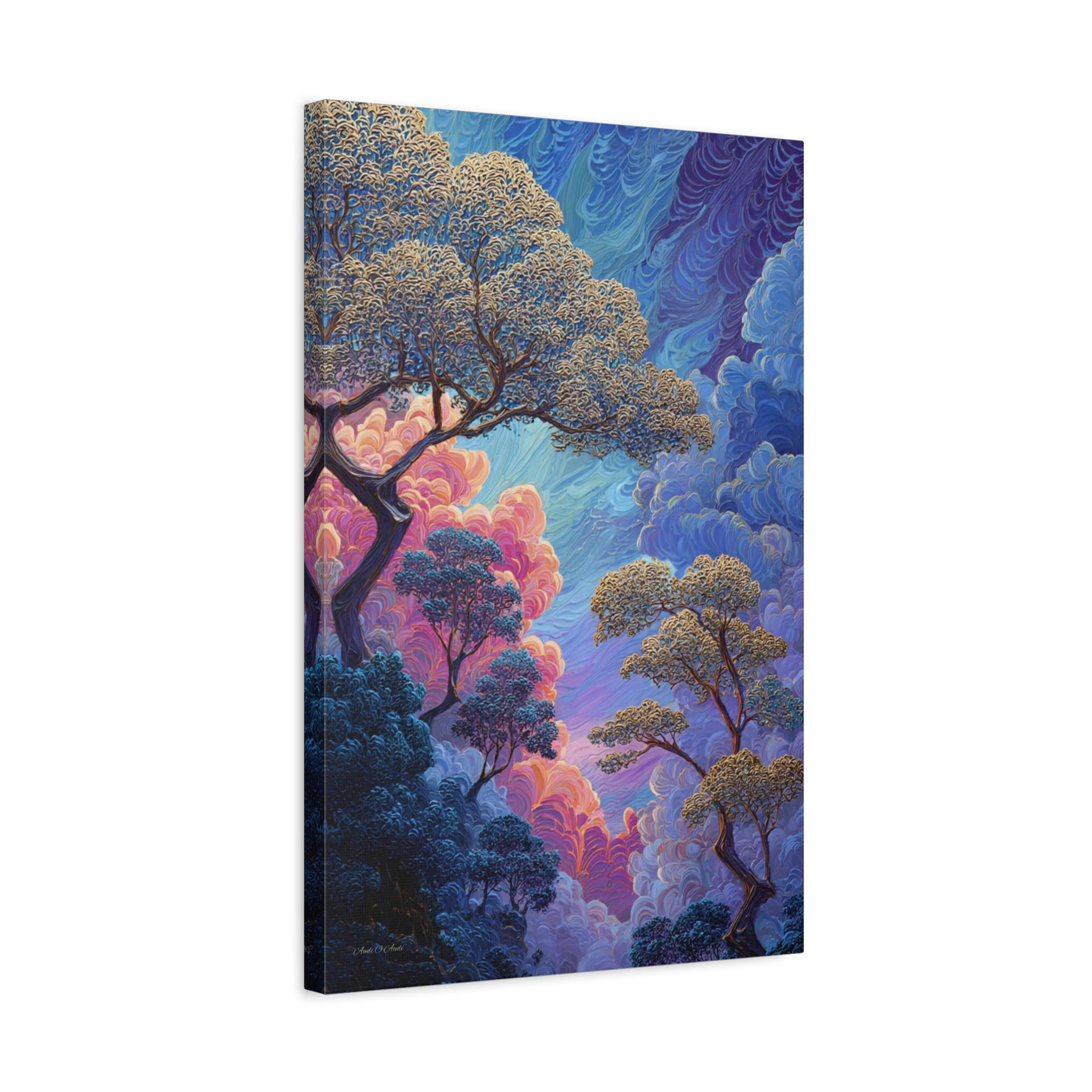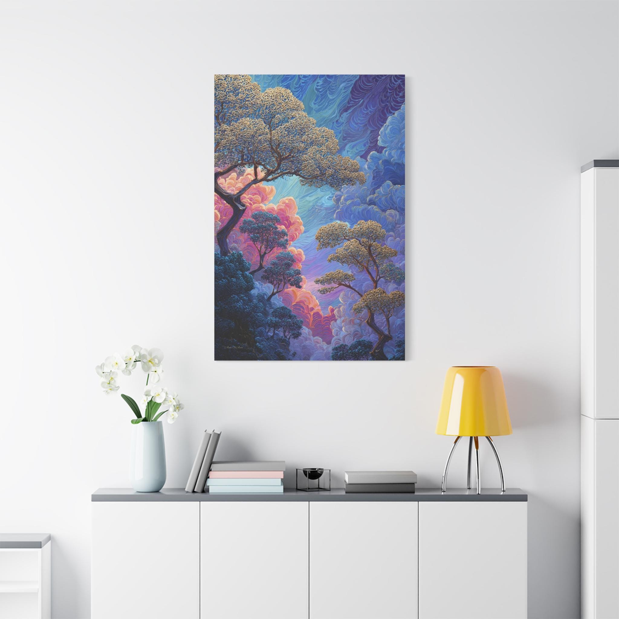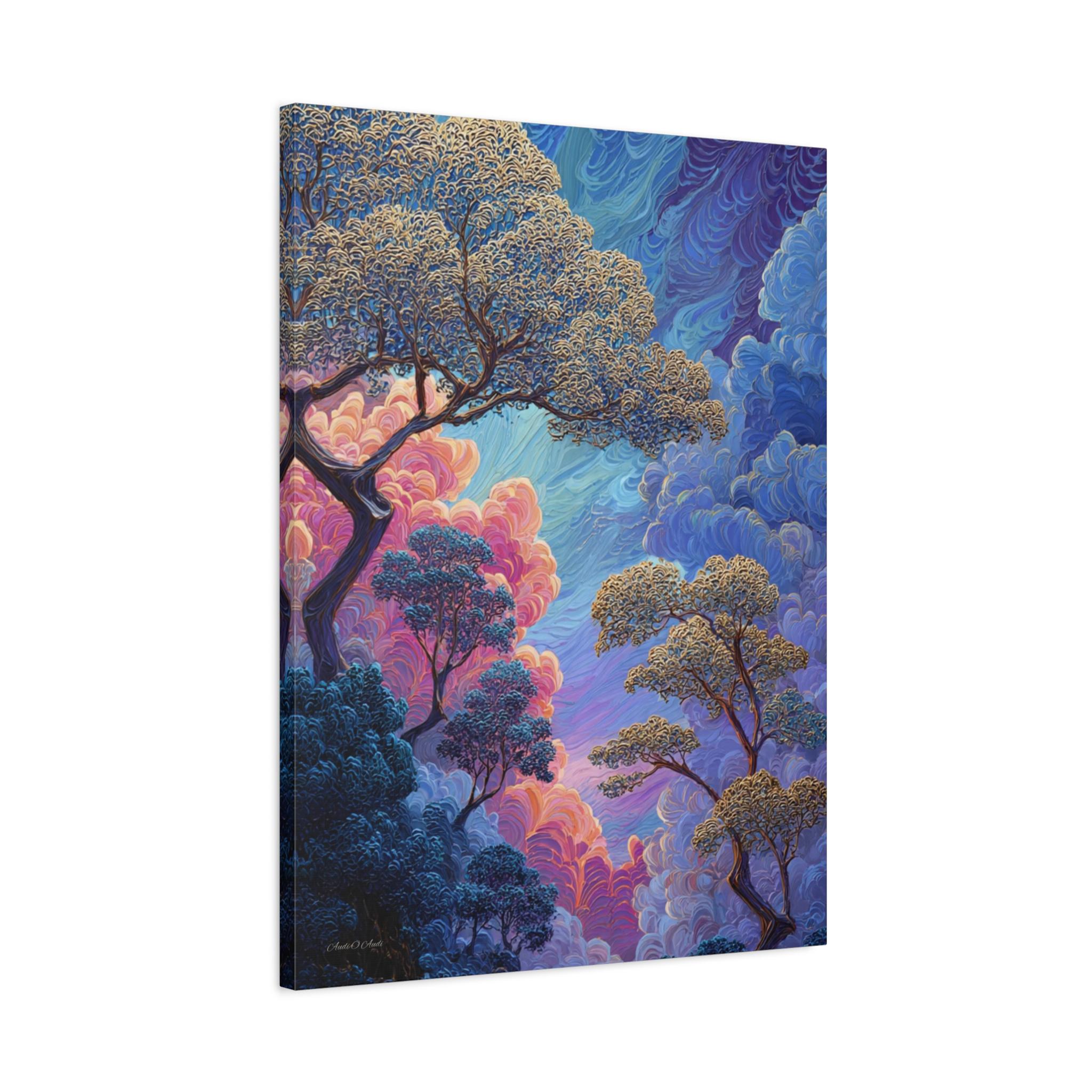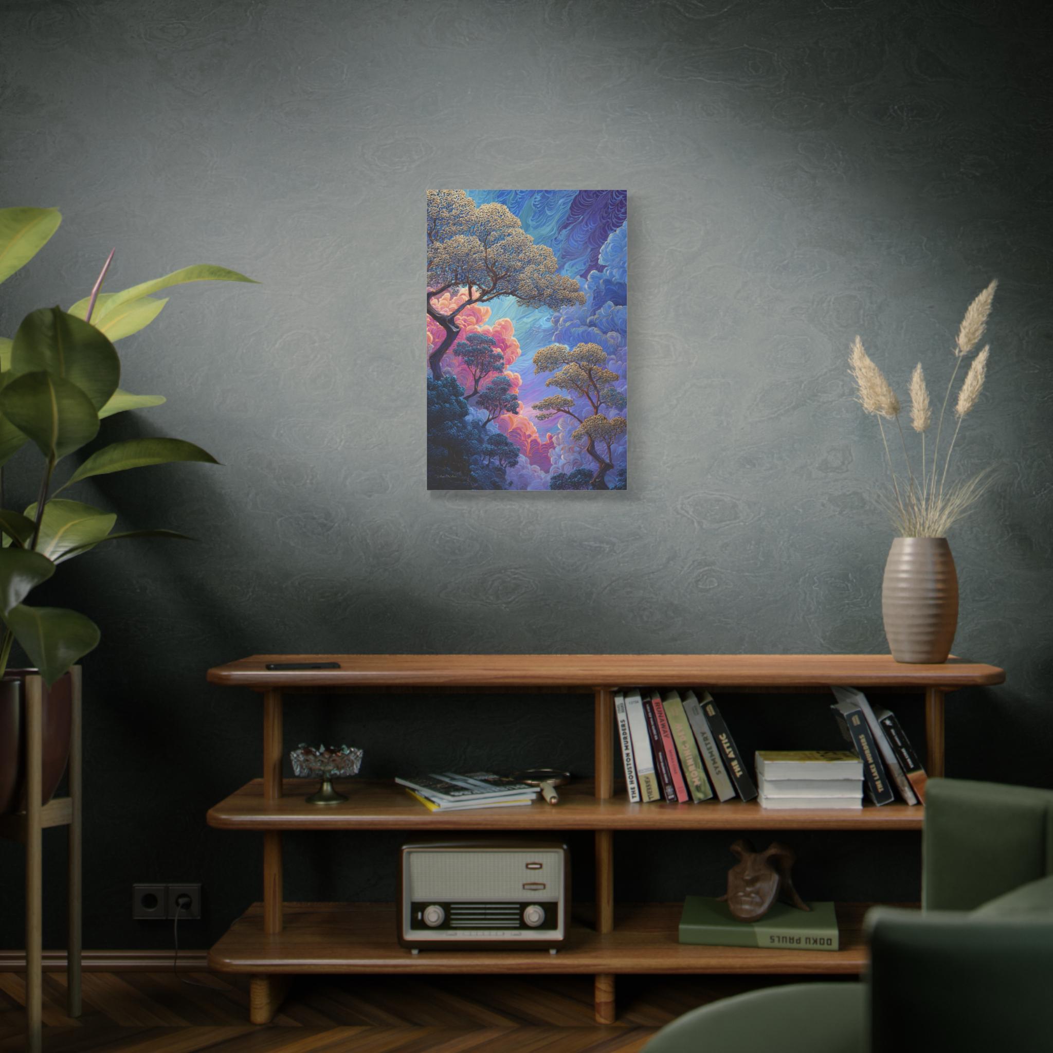"Celestial Grove" is a mesmerizing vertical landscape that transports the viewer to an ethereal, dreamlike realm. The artwork is characterized by an explosion of color and intricate, stylized texture that gives the entire scene a fantastical, embroidered quality.