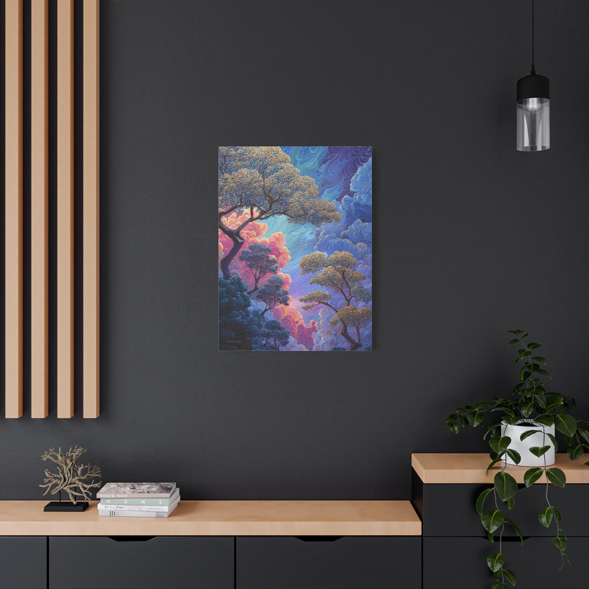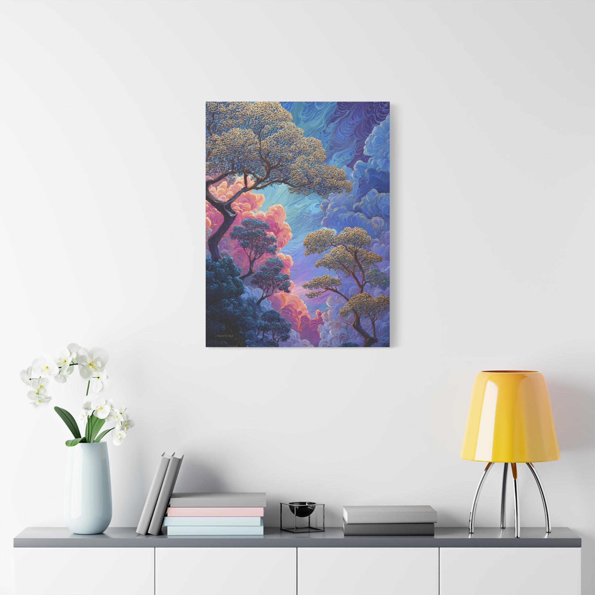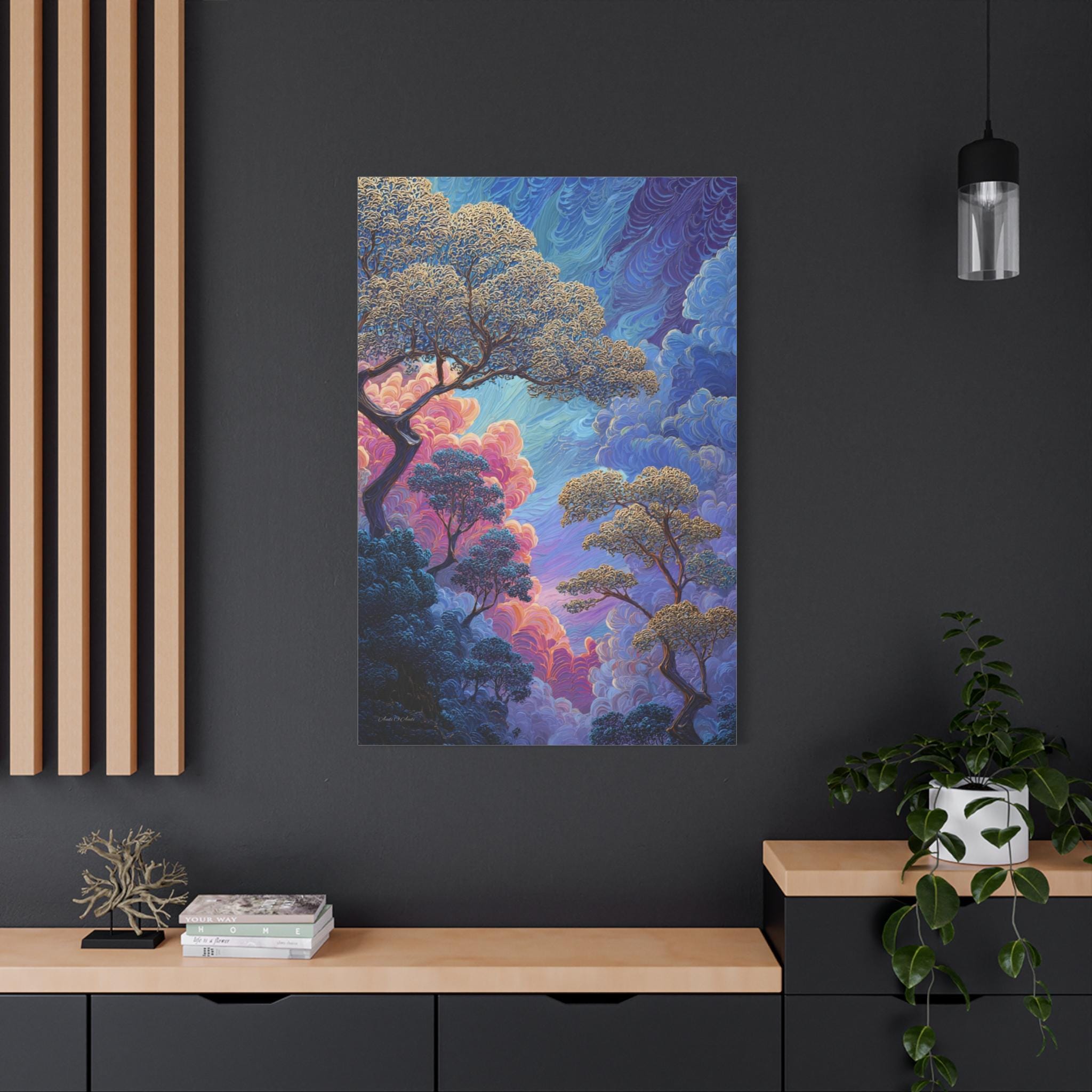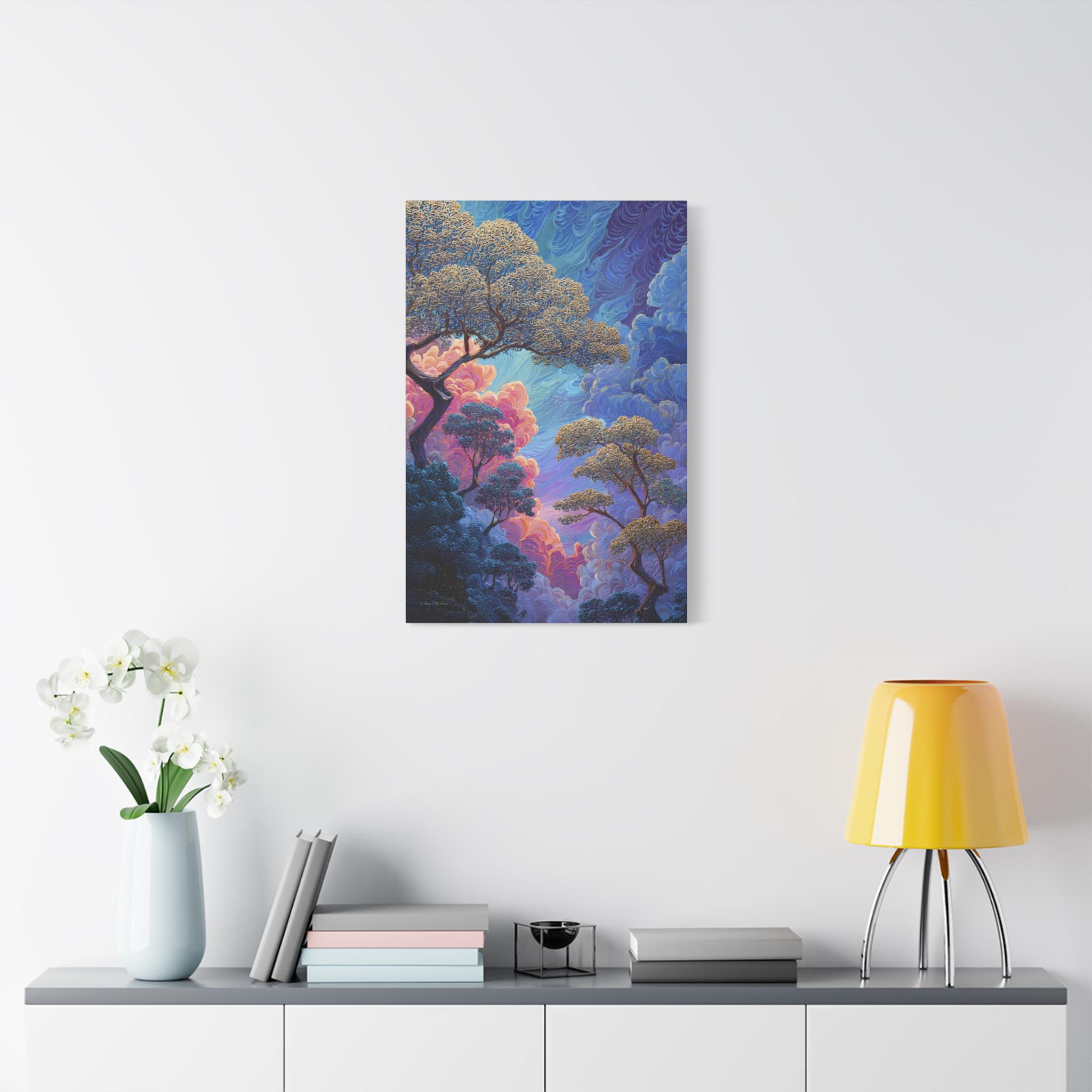 "Celestial Grove" is a mesmerizing vertical landscape that transports the viewer to an ethereal, dreamlike realm. The artwork is characterized by an explosion of color and intricate, stylized texture that gives the entire scene a fantastical, embroidered quality.