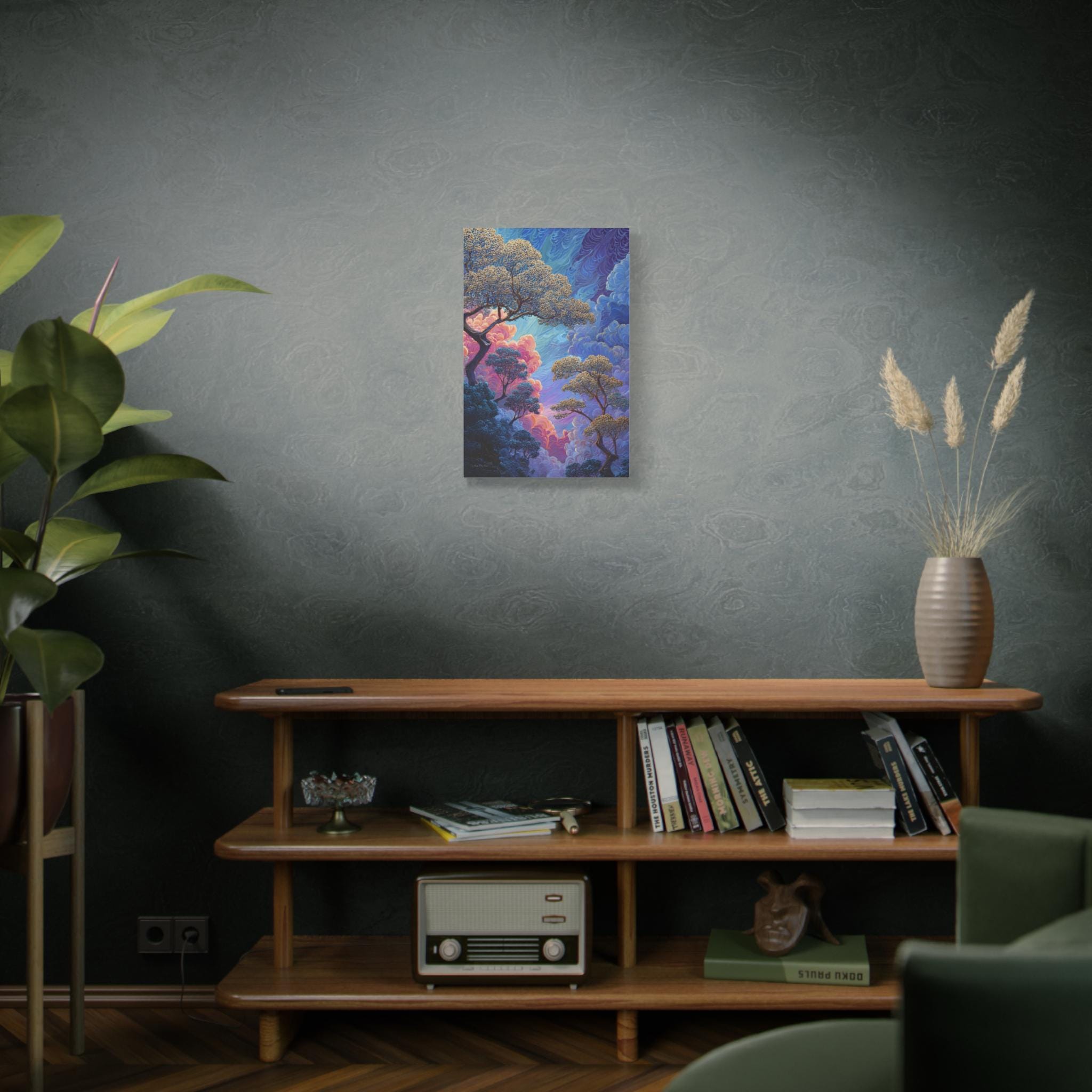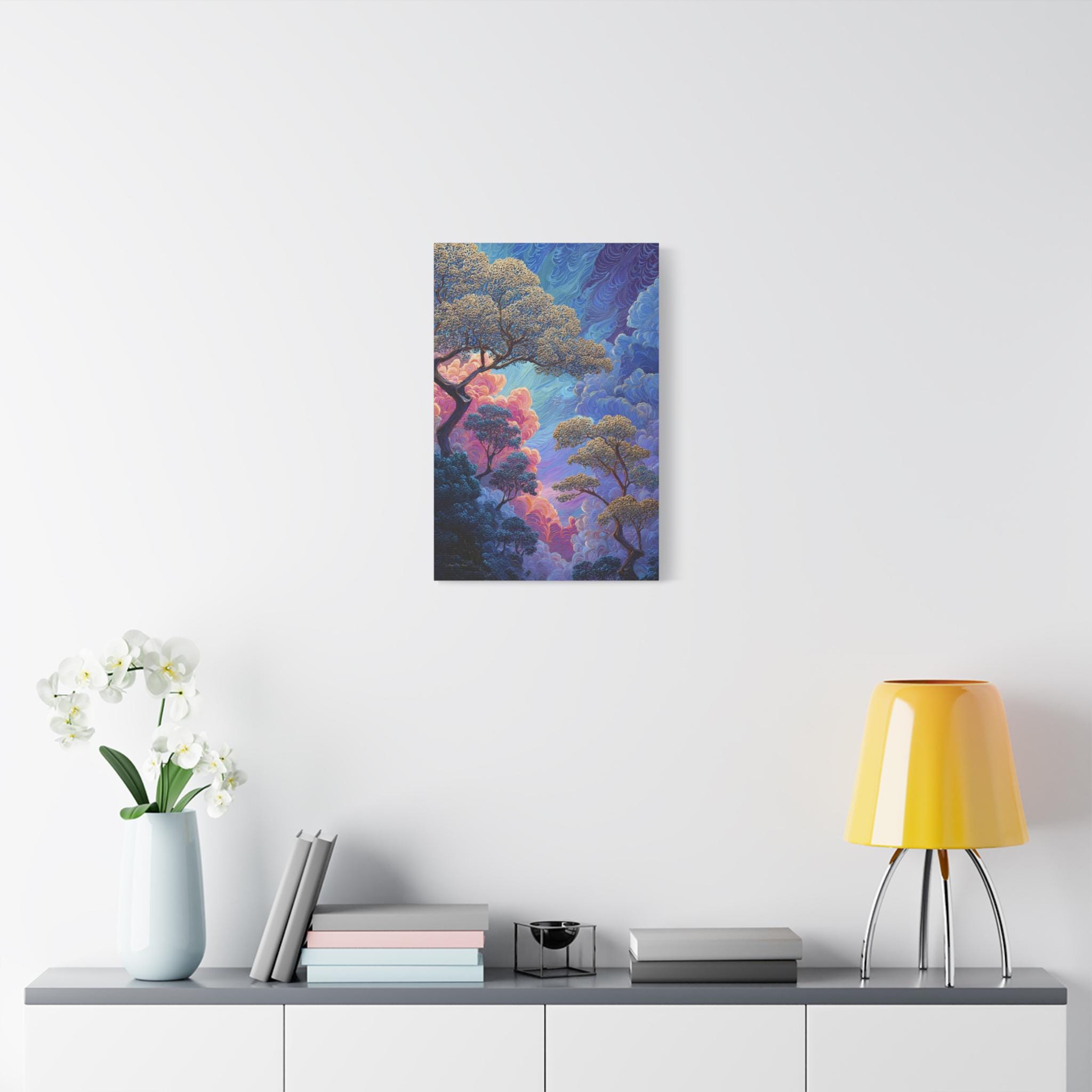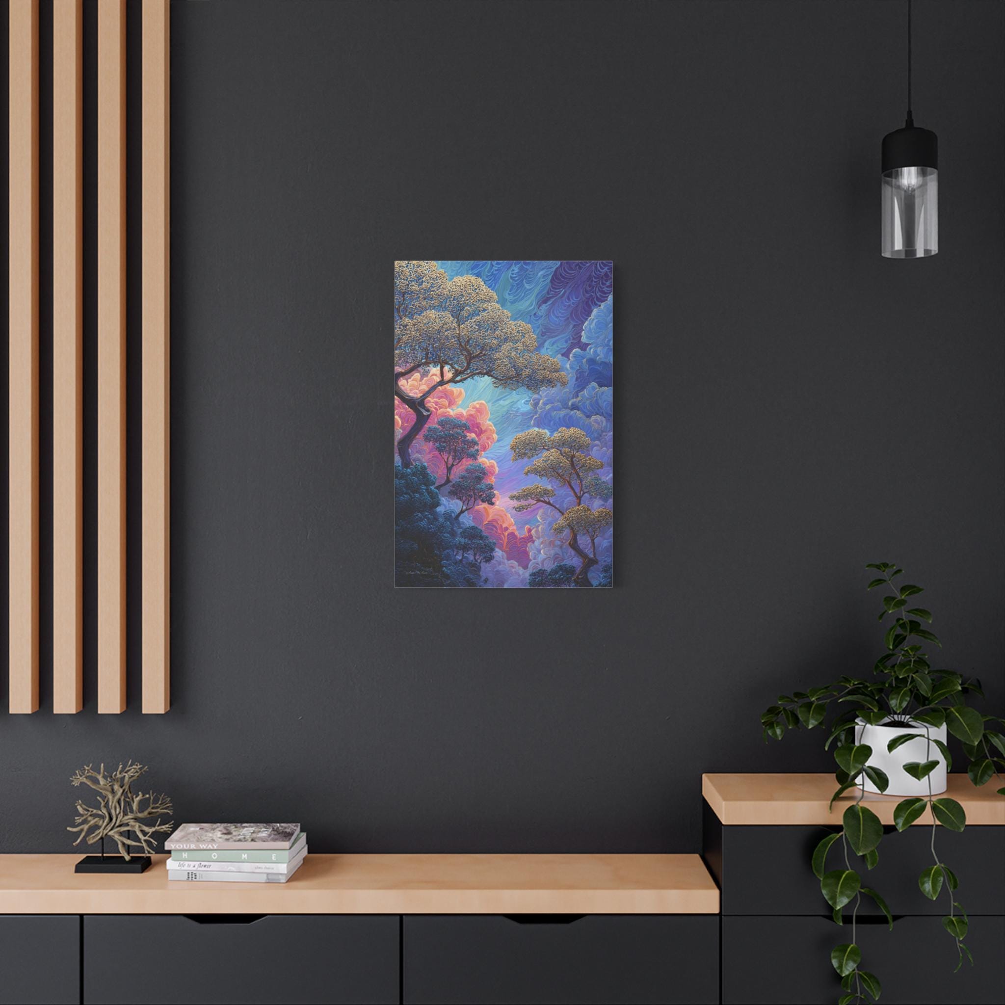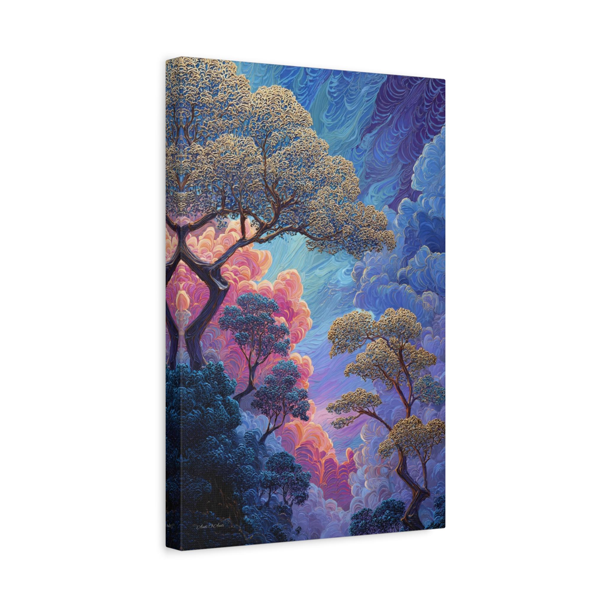 "Celestial Grove" is a mesmerizing vertical landscape that transports the viewer to an ethereal, dreamlike realm. The artwork is characterized by an explosion of color and intricate, stylized texture that gives the entire scene a fantastical, embroidered quality.