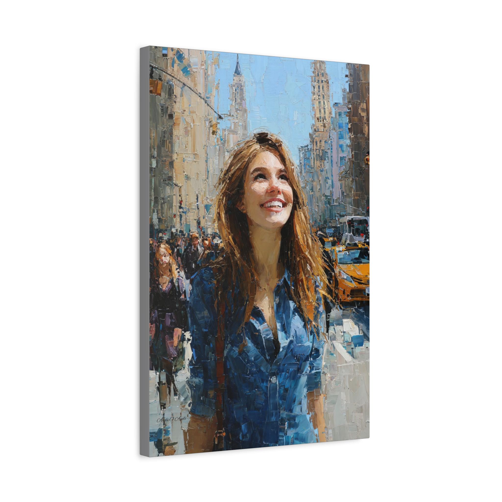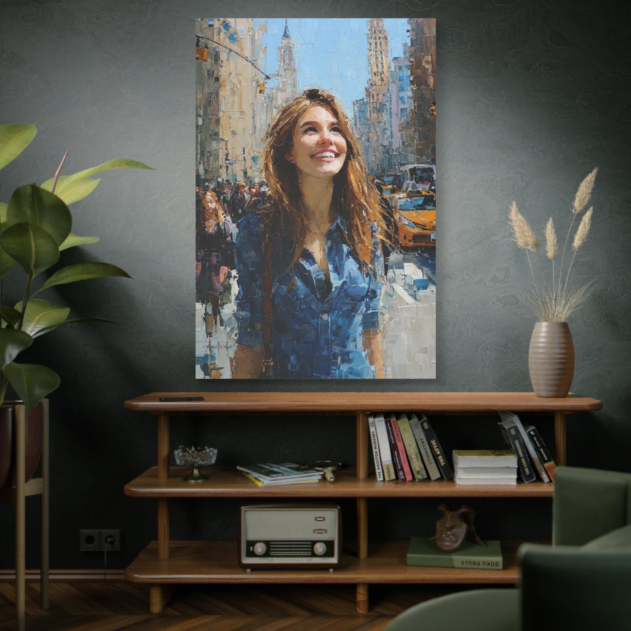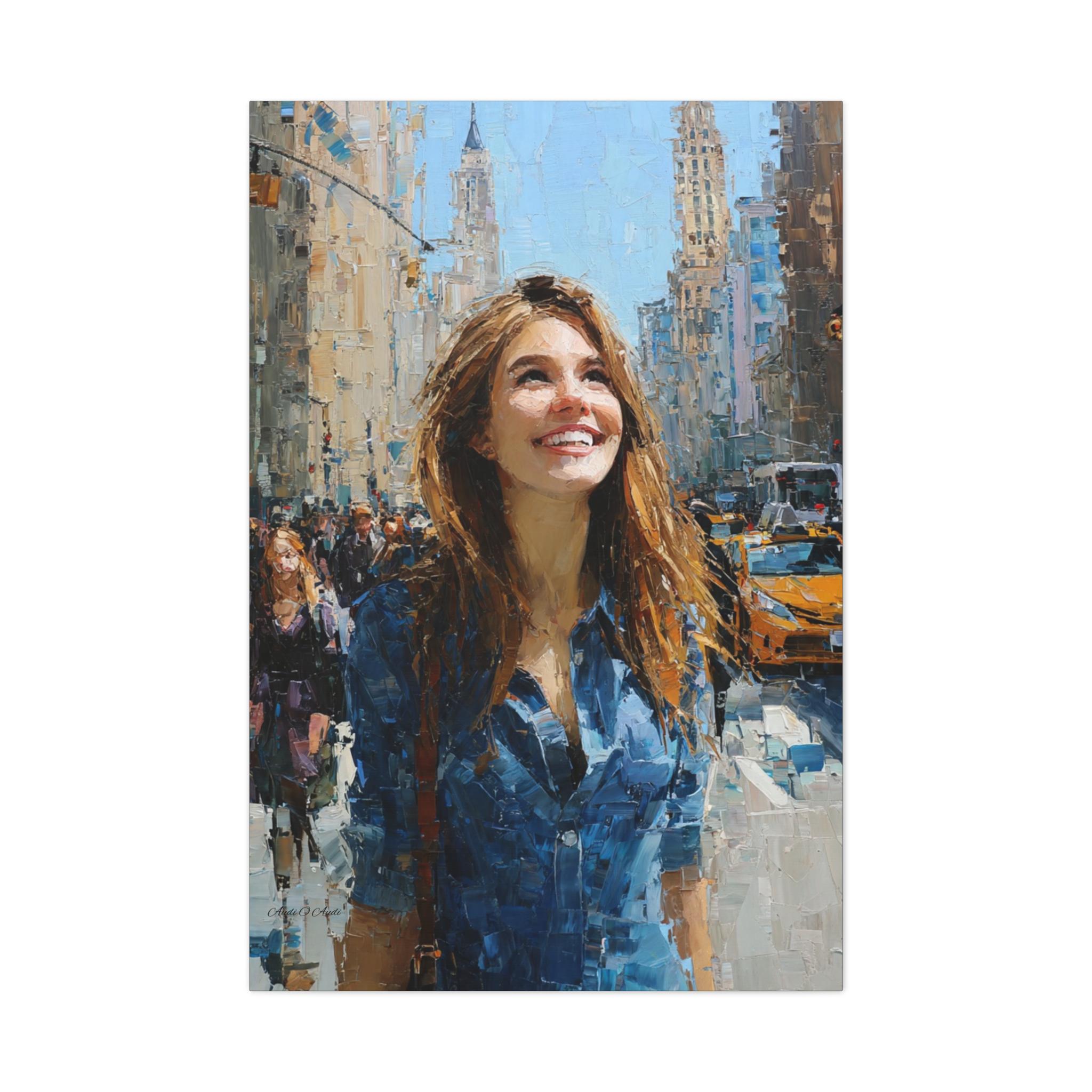 The central focus is a radiant young woman, captured looking upward with a wide, genuine smile, her expression conveying a sense of optimism and wonder. Her casual blue denim shirt is rendered with deep texture, contrasting slightly with the smoother, illuminated skin tones of her face. The towering skyscrapers—suggesting the architecture of cities like New York—recede into a bright blue sky, and the blurred energy of the background emphasizes the figure's moment of clarity and appreciation amidst the urban rush.