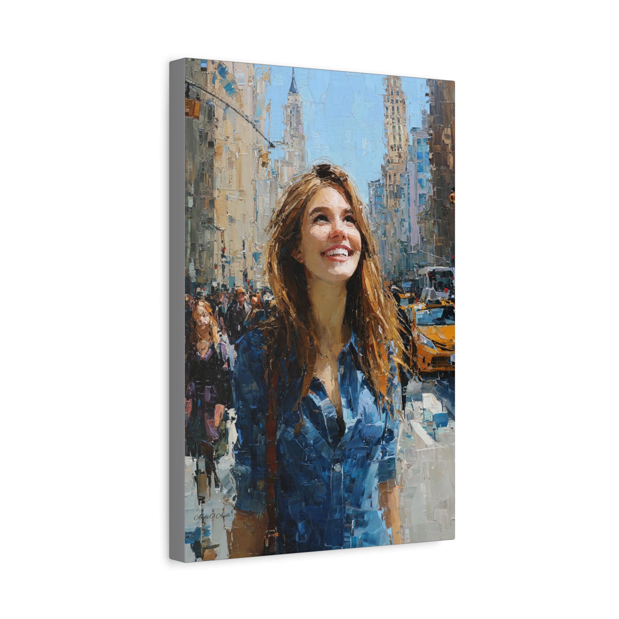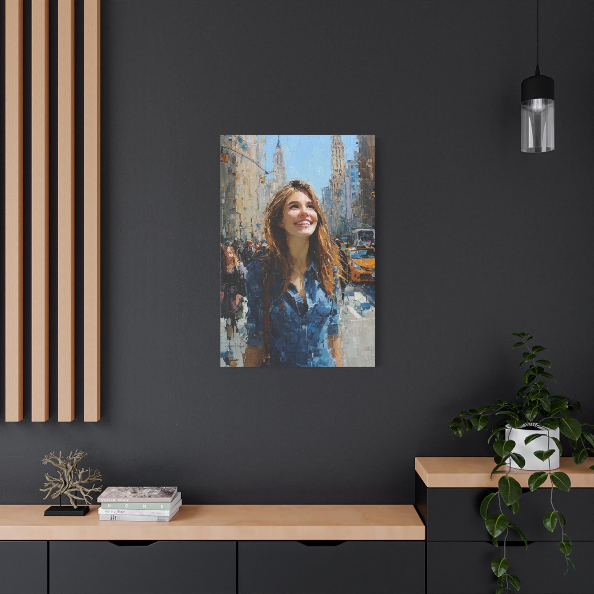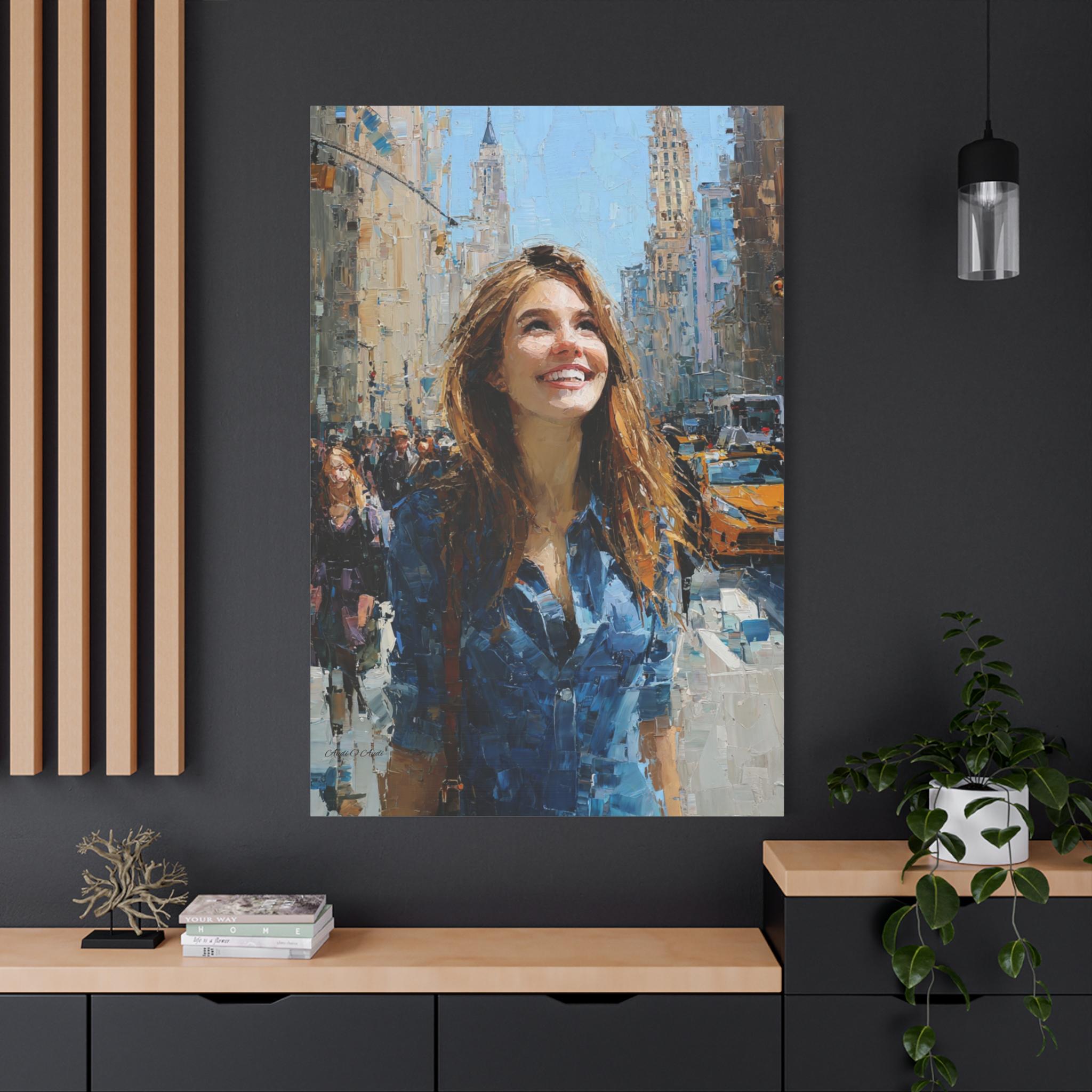 The central focus is a radiant young woman, captured looking upward with a wide, genuine smile, her expression conveying a sense of optimism and wonder. Her casual blue denim shirt is rendered with deep texture, contrasting slightly with the smoother, illuminated skin tones of her face. The towering skyscrapers—suggesting the architecture of cities like New York—recede into a bright blue sky, and the blurred energy of the background emphasizes the figure's moment of clarity and appreciation amidst the urban rush.