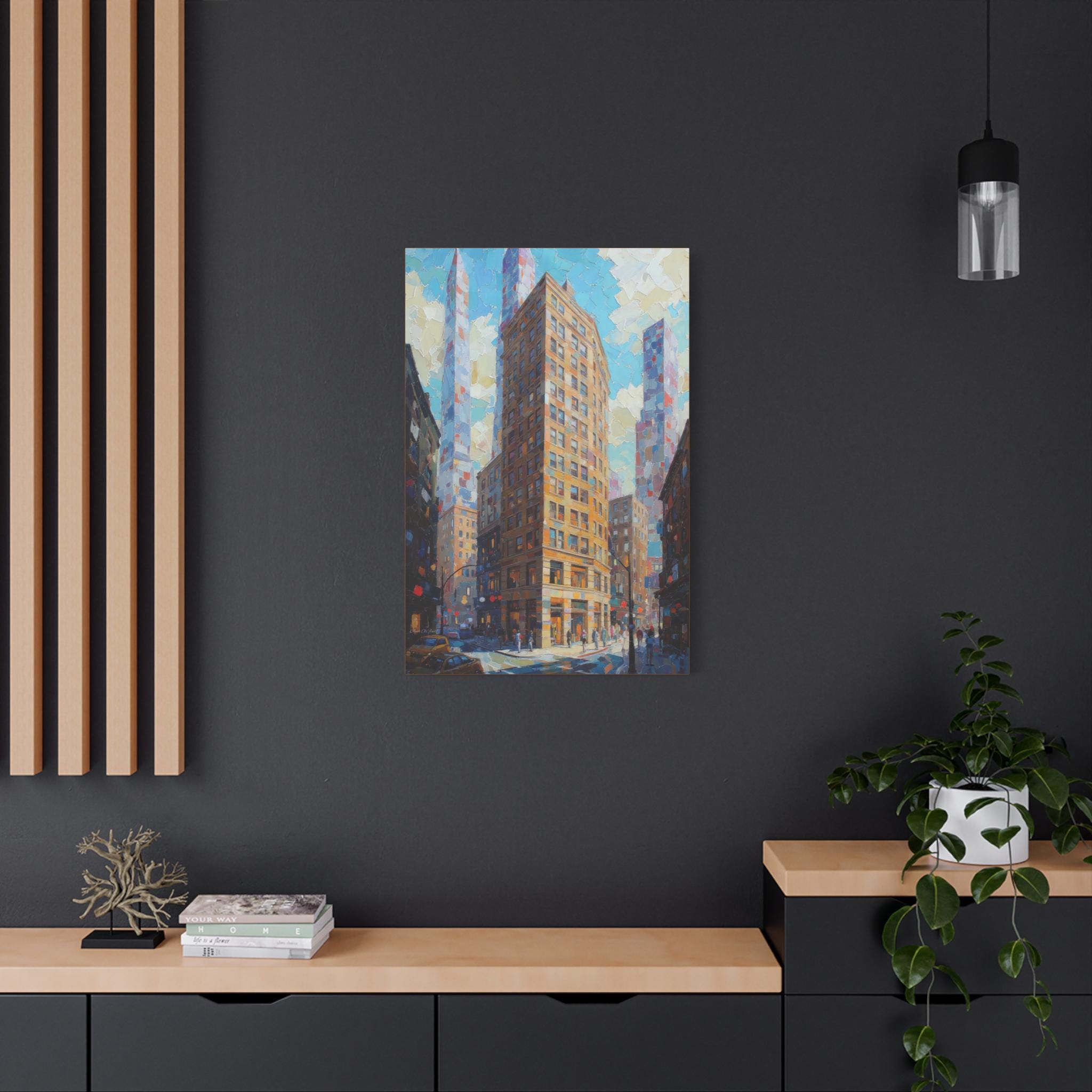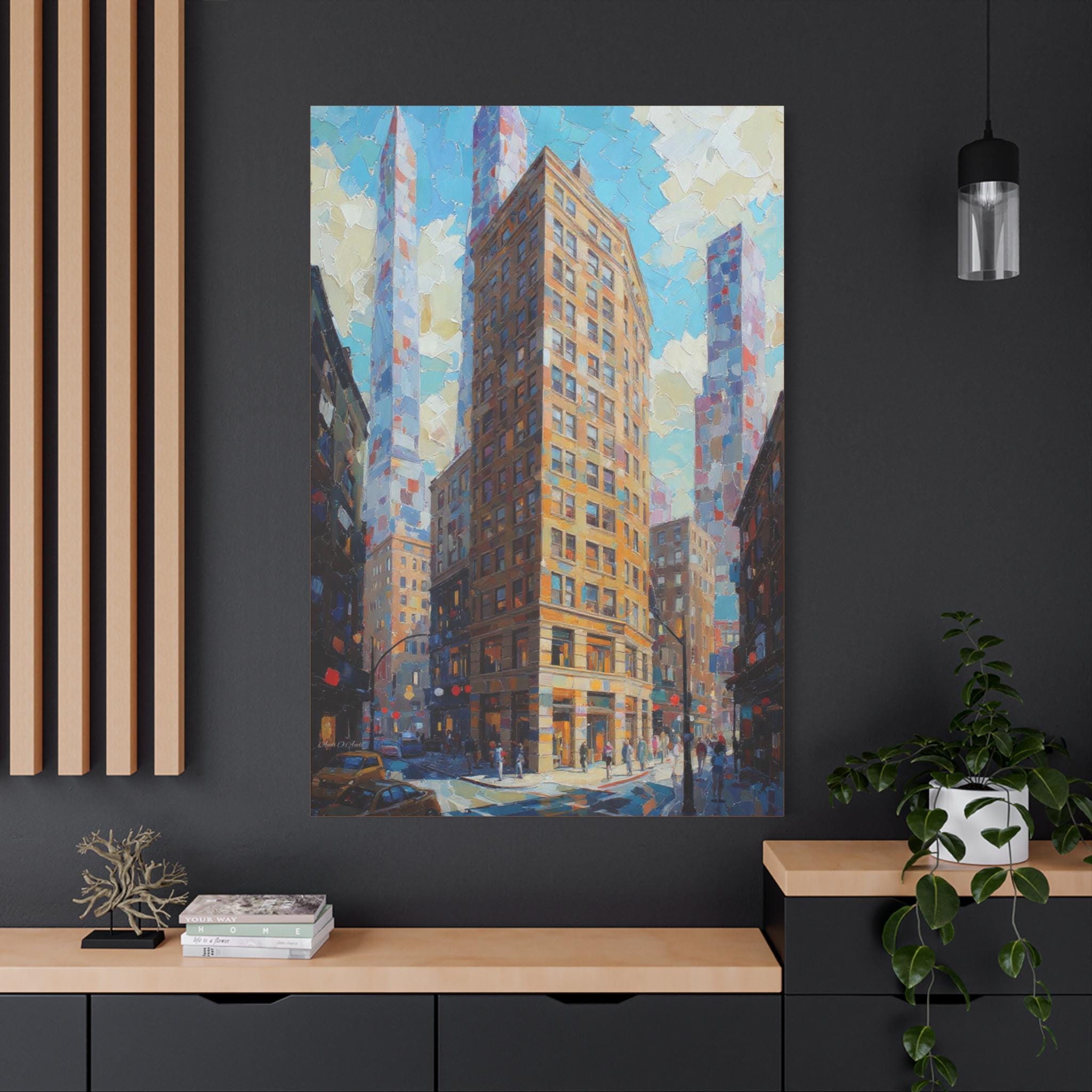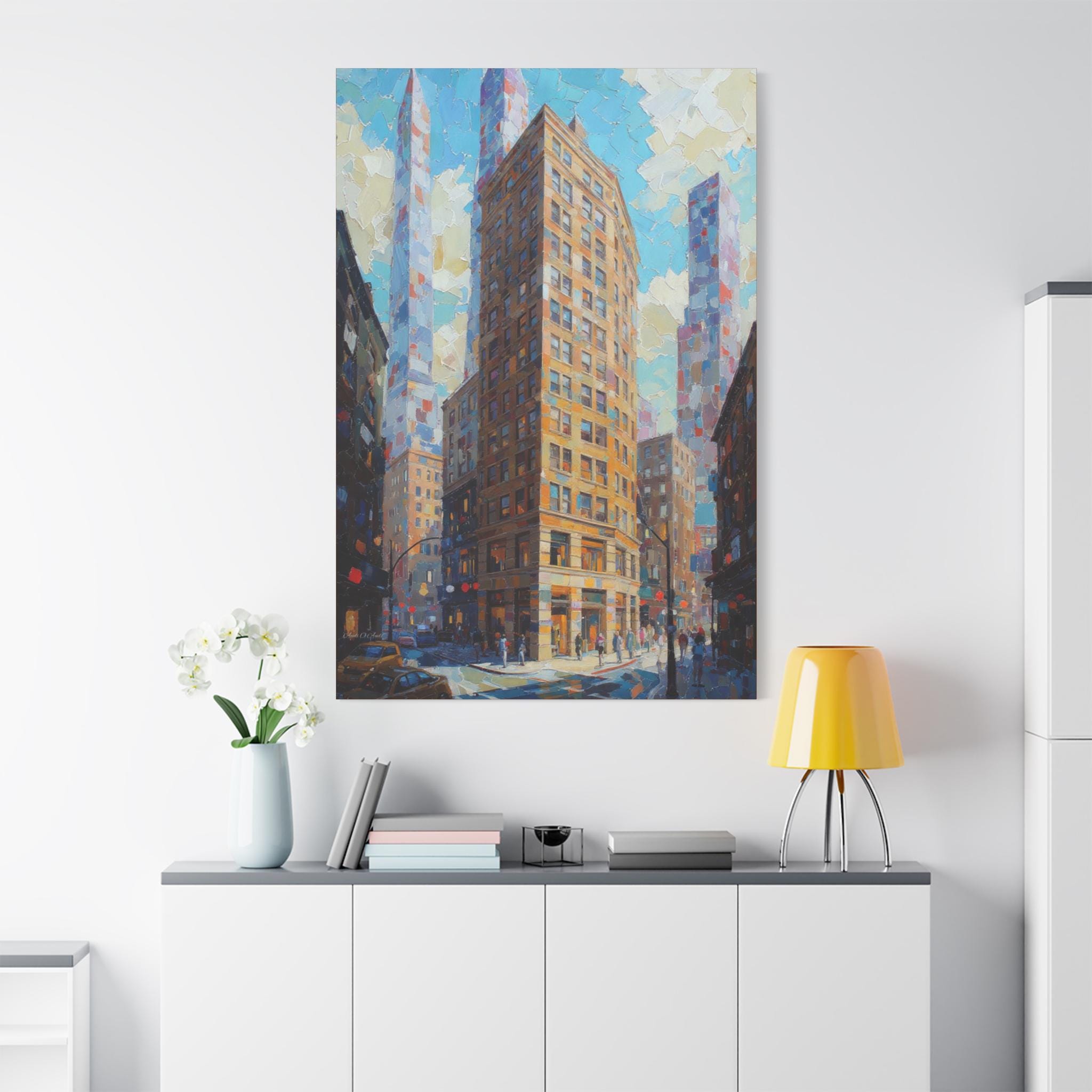 This print is an excellent choice for those who appreciate bold texture, dynamic perspective, and luminous color in urban scenes. It is a striking, energetic statement piece that celebrates the drama and light of modern city life.
