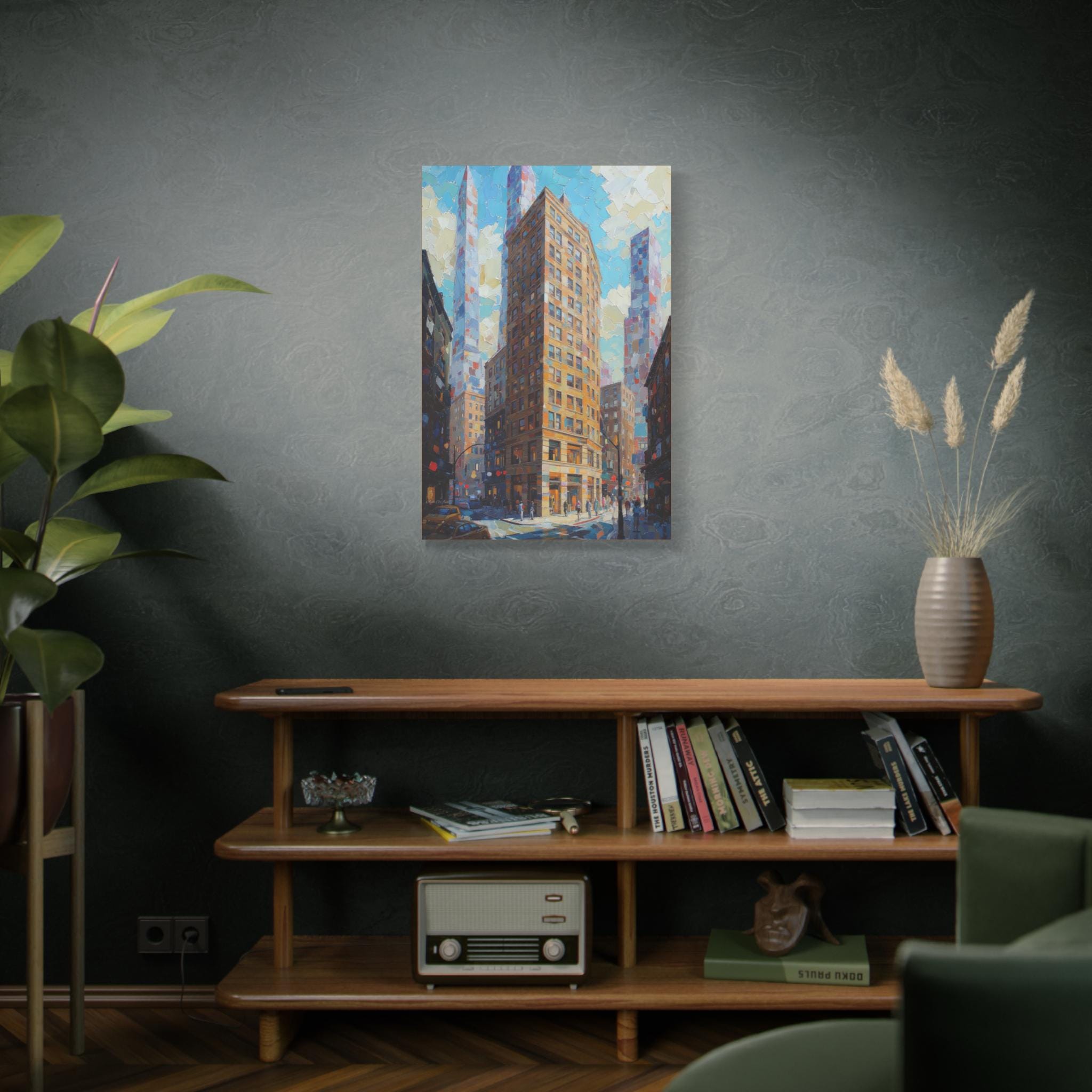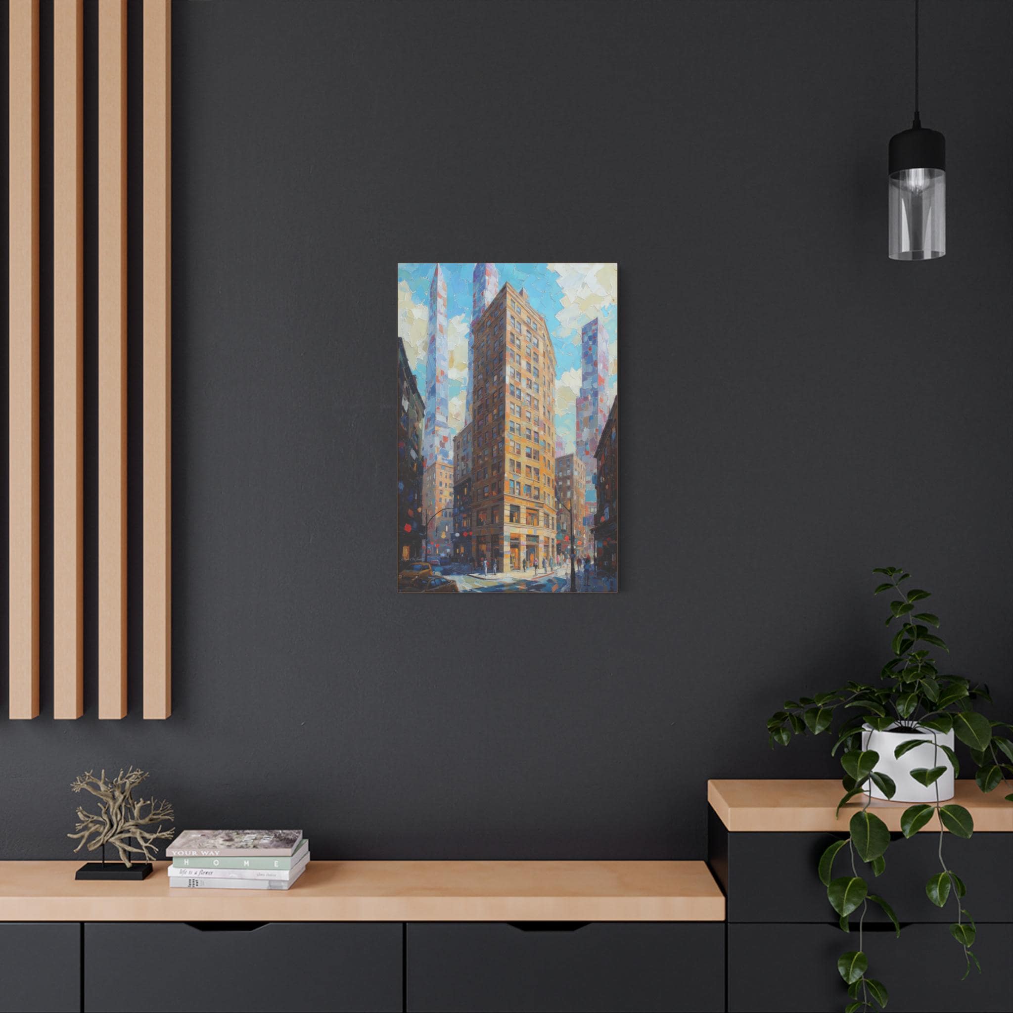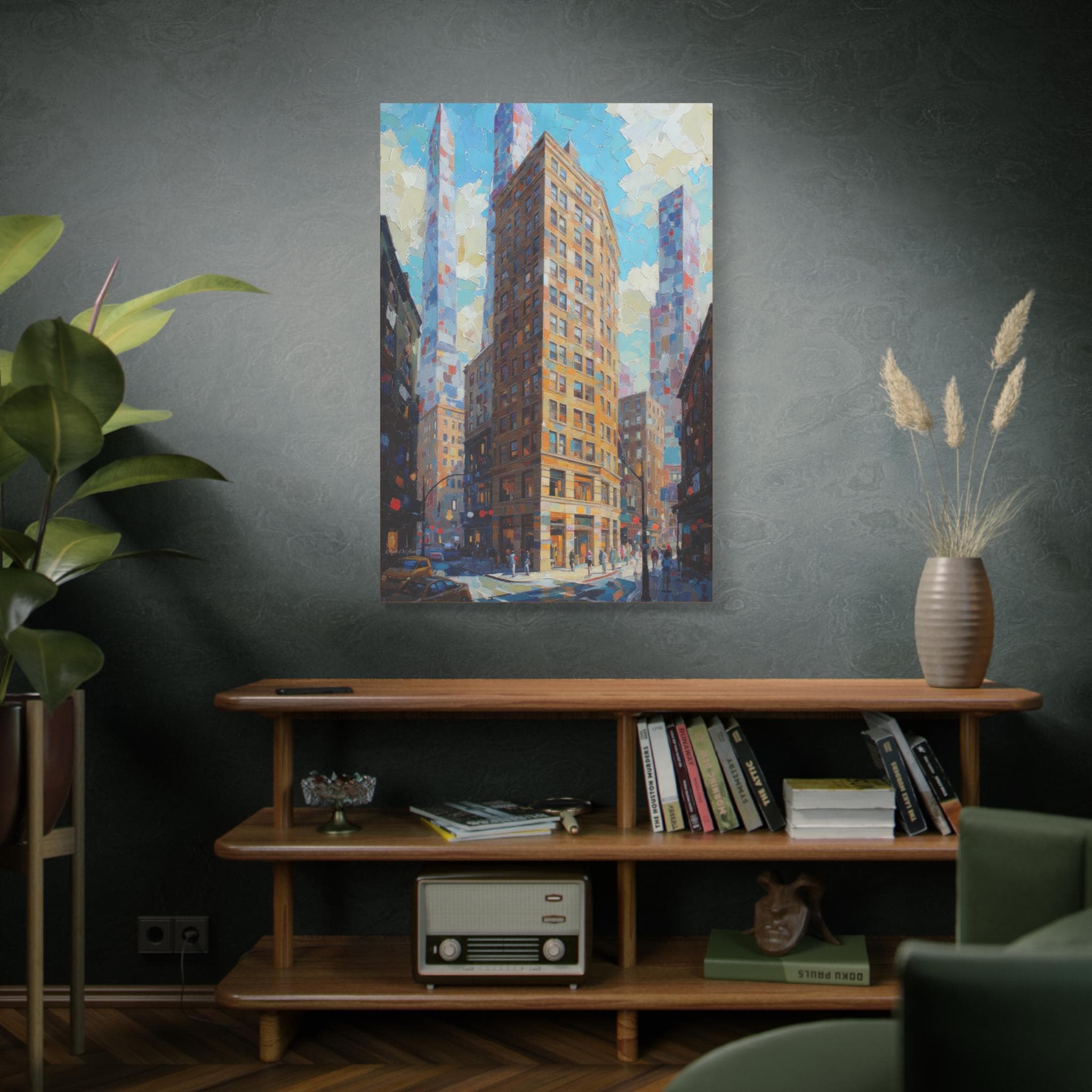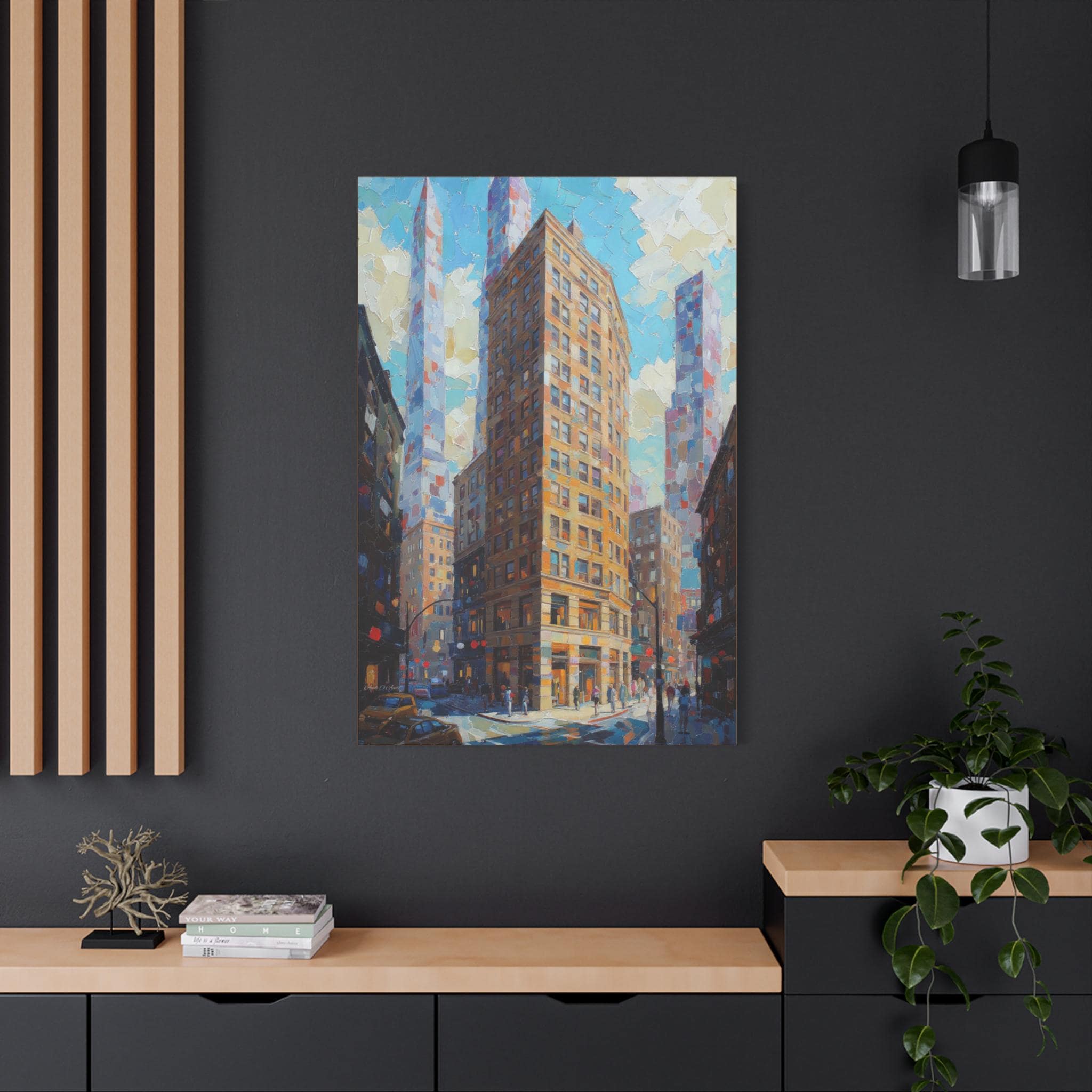 This print is an excellent choice for those who appreciate bold texture, dynamic perspective, and luminous color in urban scenes. It is a striking, energetic statement piece that celebrates the drama and light of modern city life.