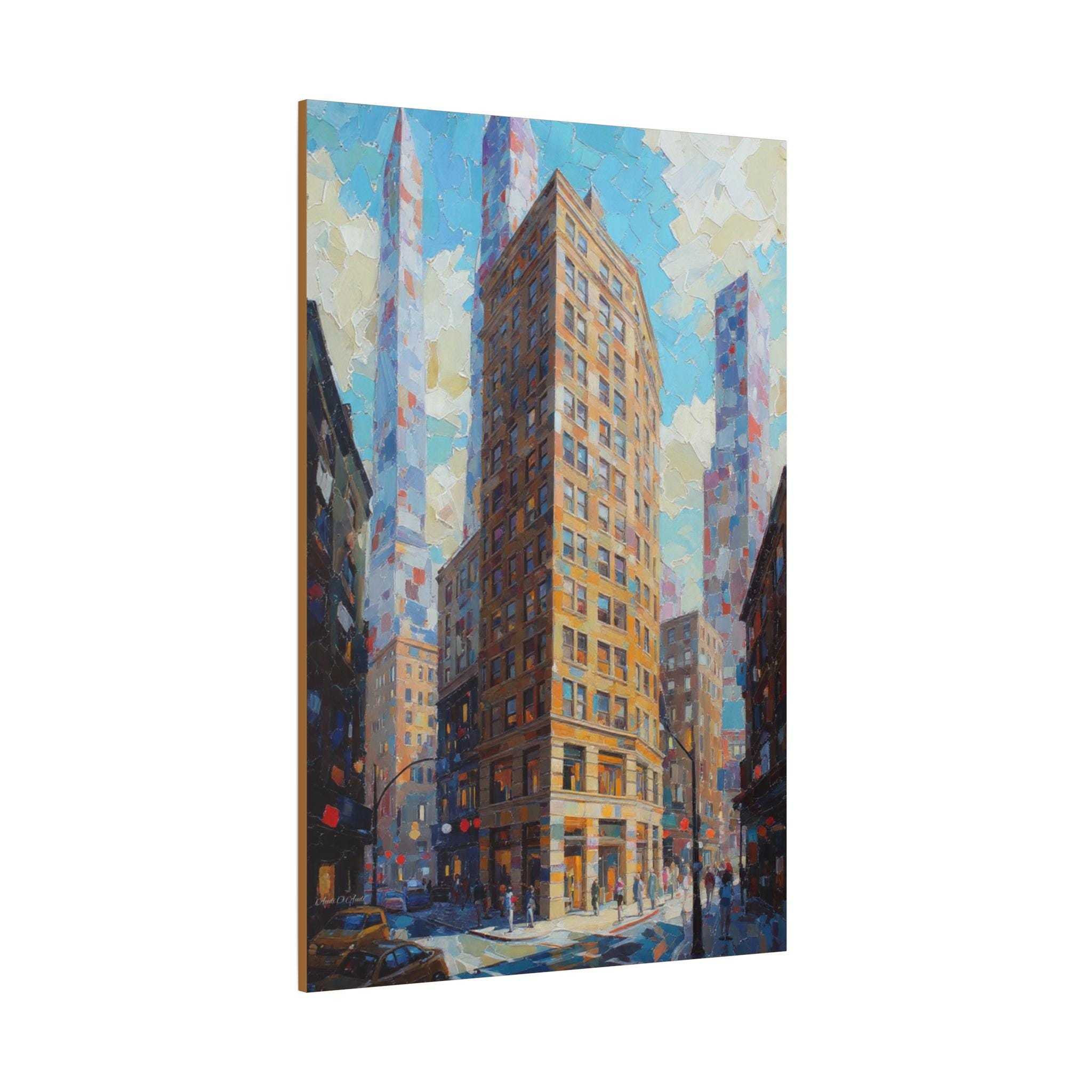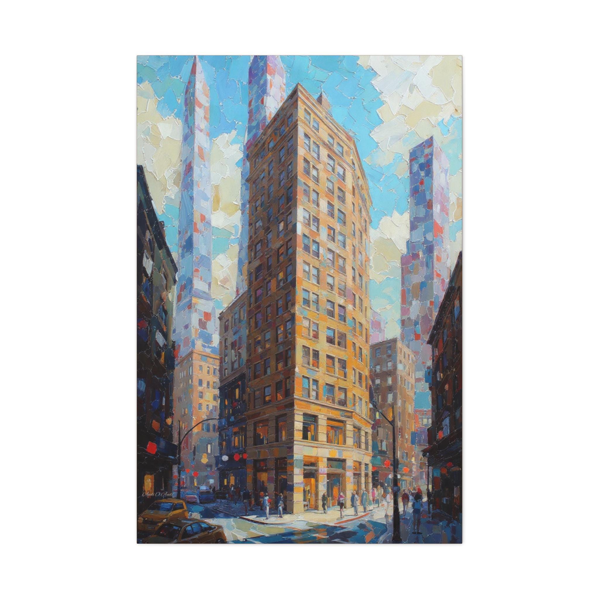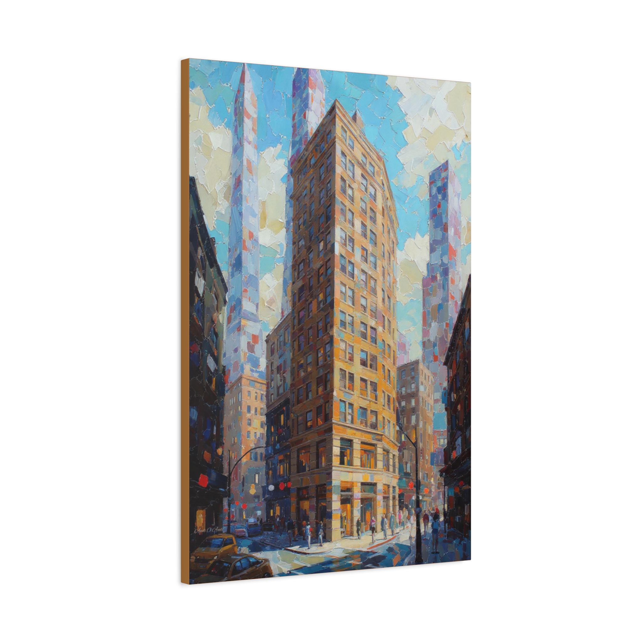 "The Golden Corner" is a powerful and architecturally focused canvas print that captures the exhilarating energy of a city downtown. The artwork is executed with a breathtaking heavy impasto technique, where thick, distinct blocks of color build up the volume and texture of the buildings, the busy street, and the patchy sky.