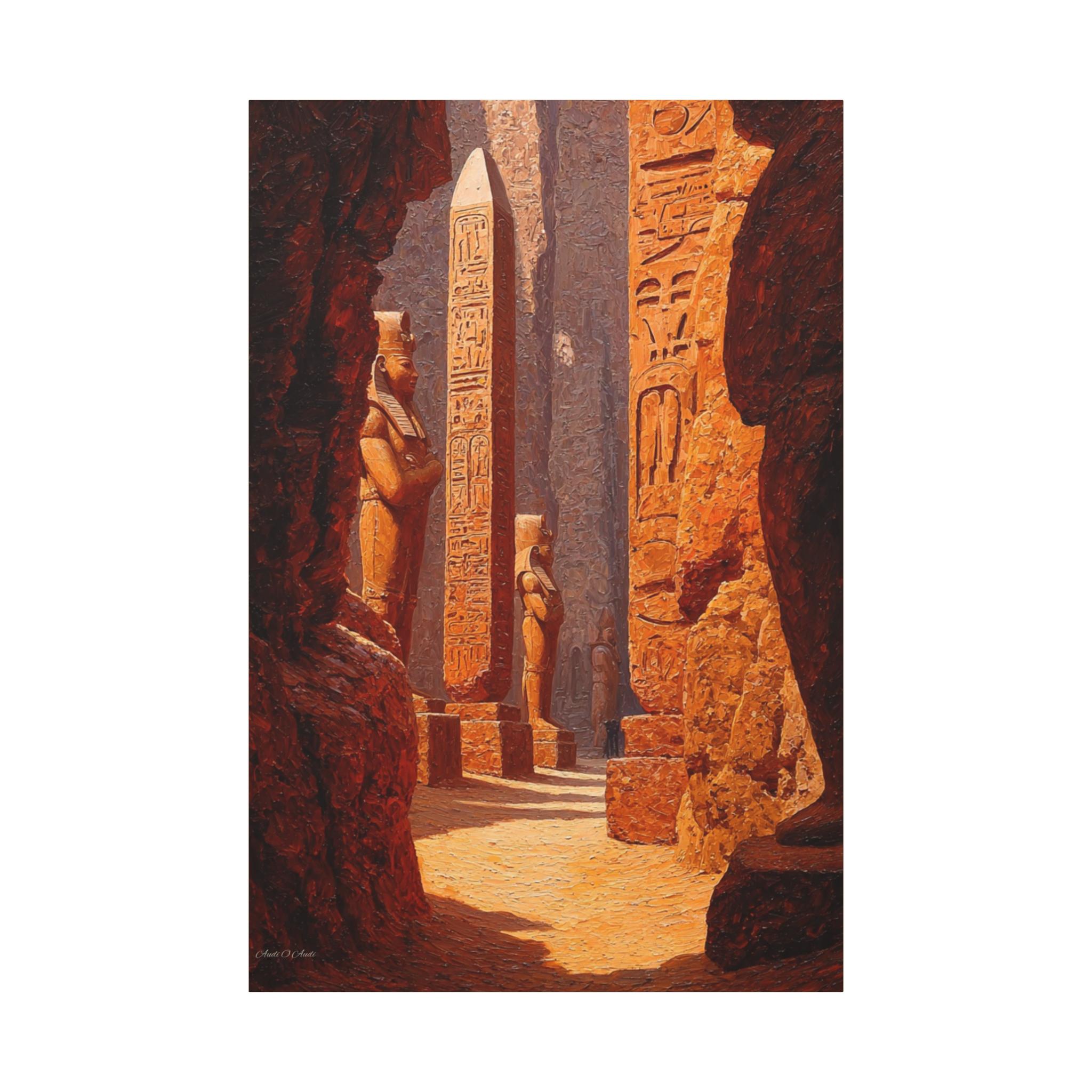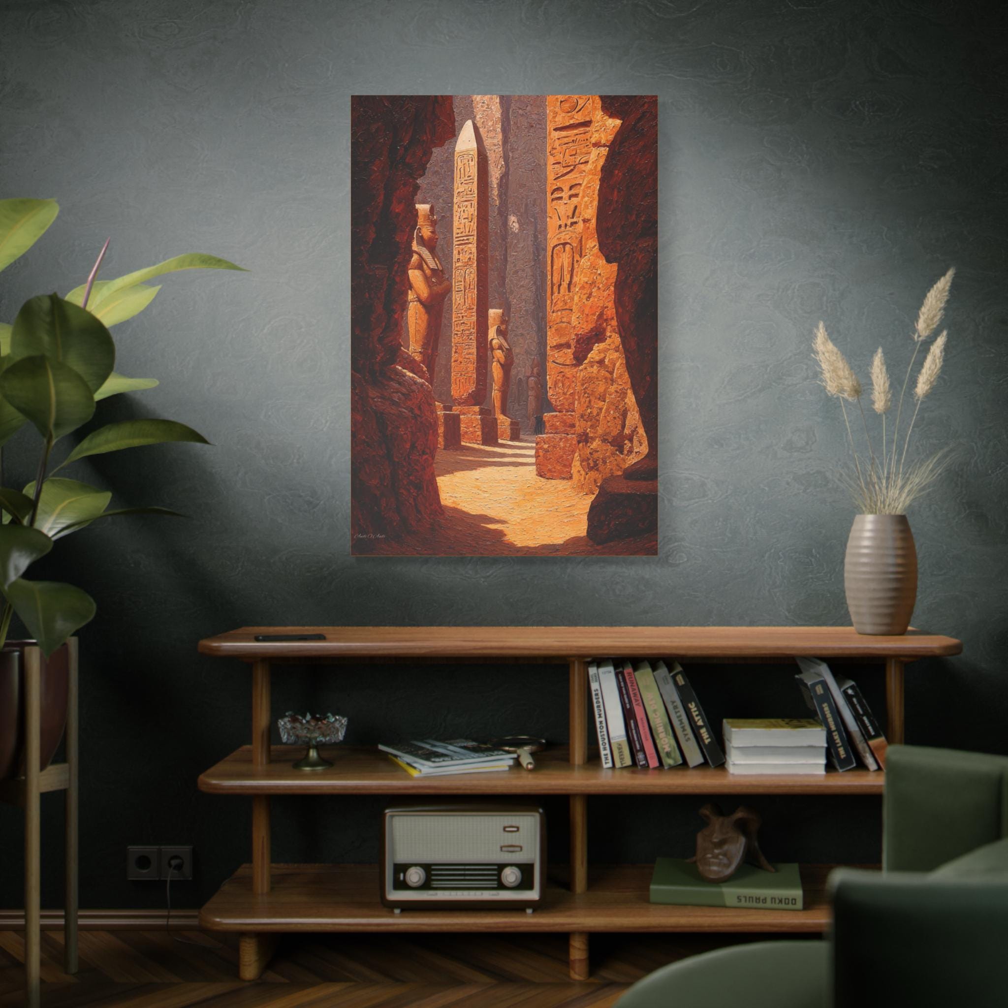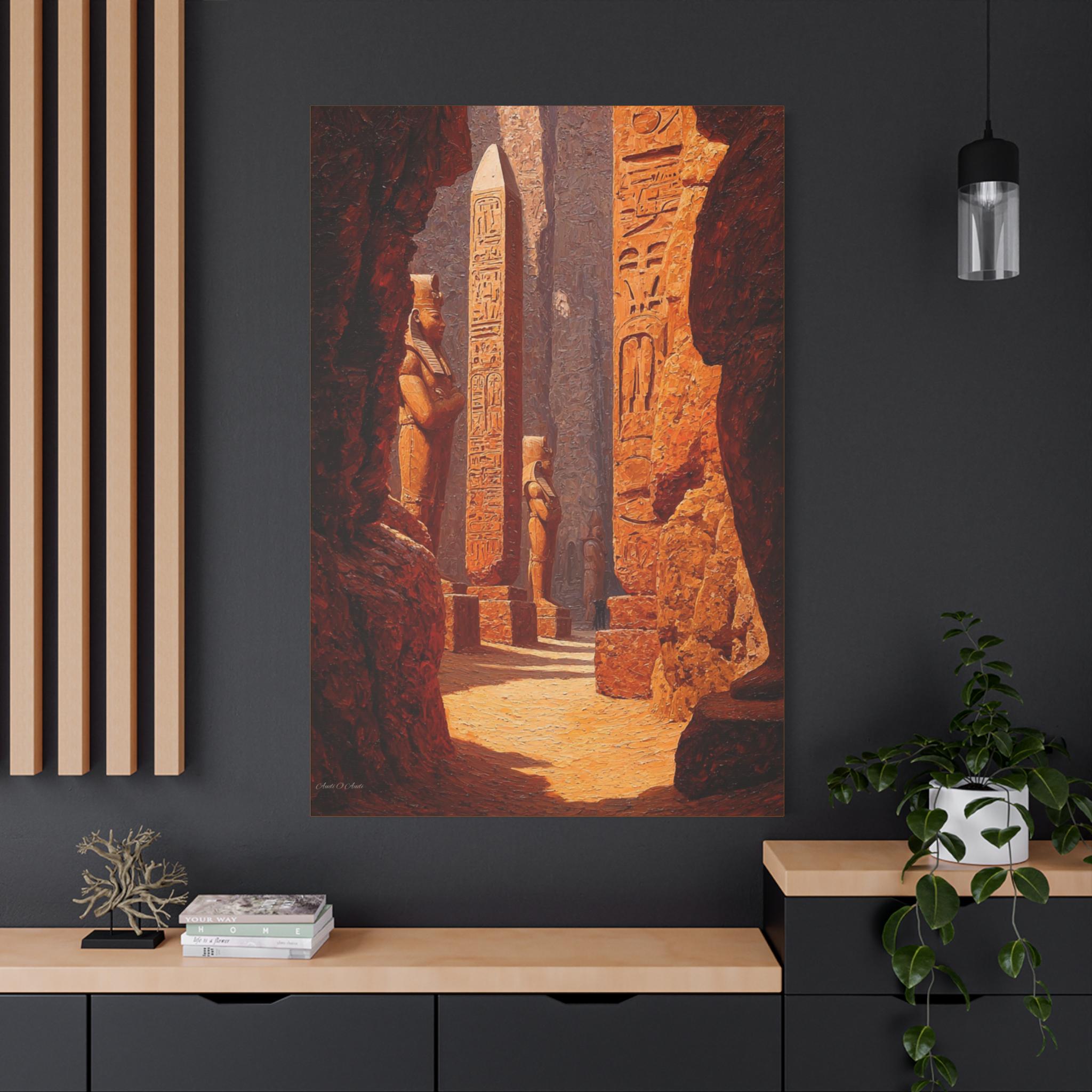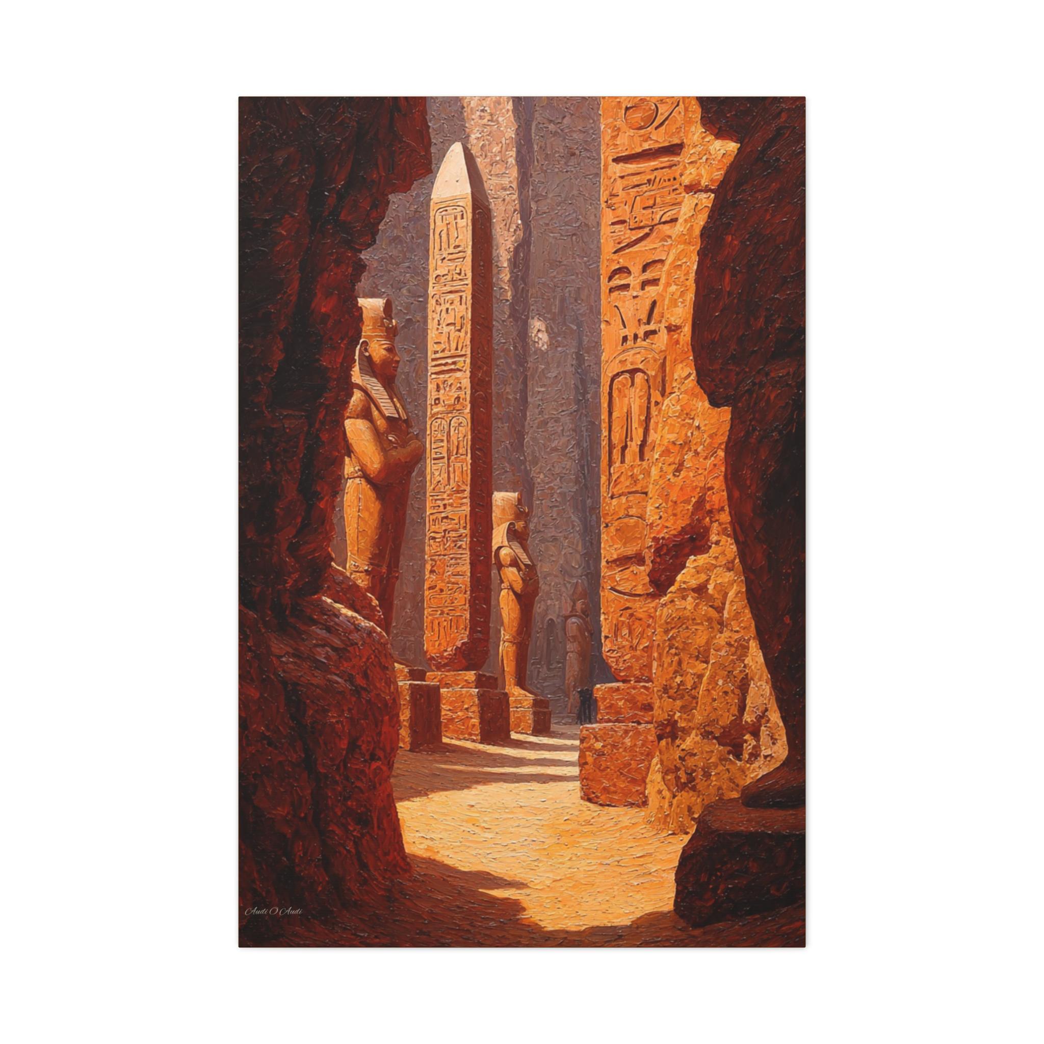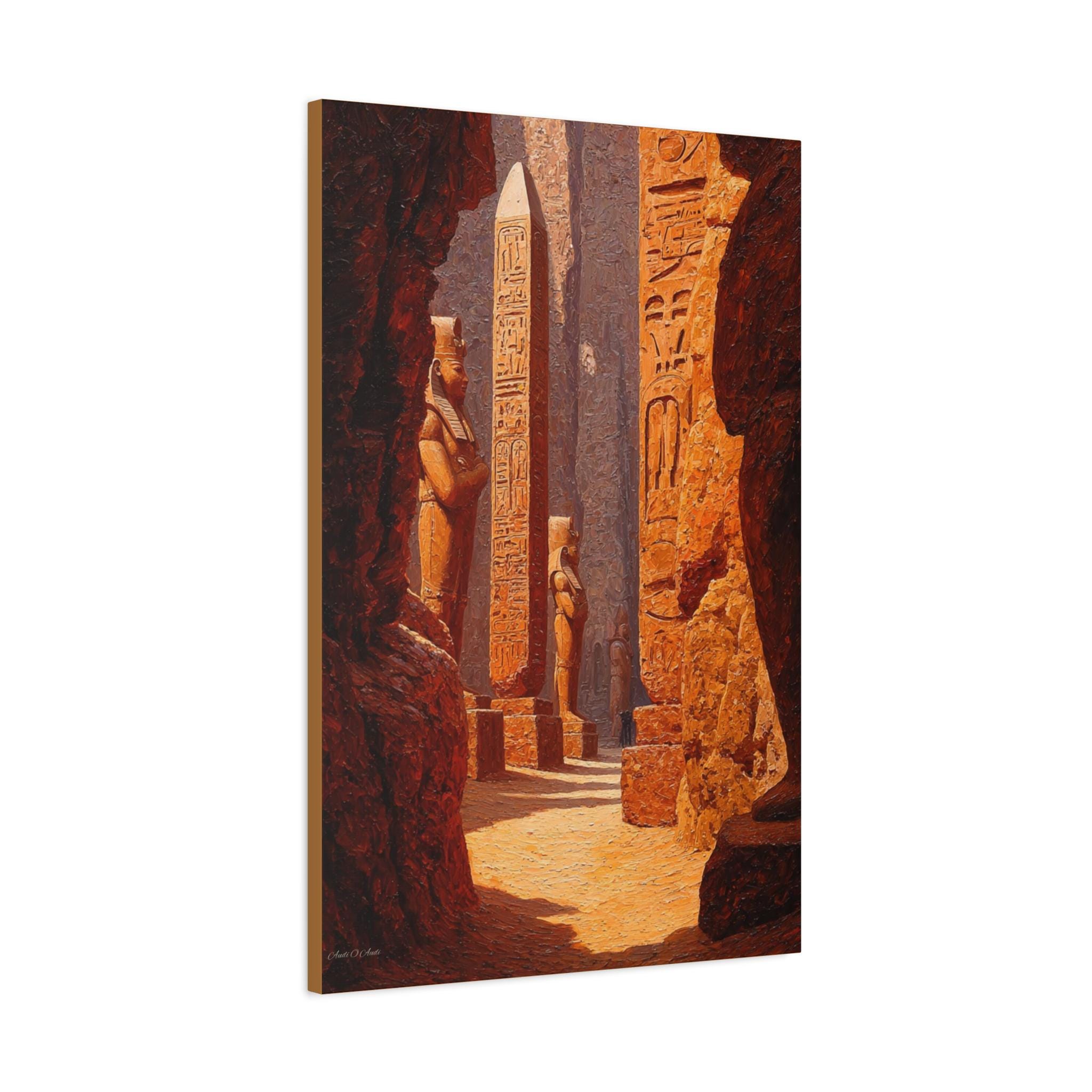 "The Path of the Pharaohs" is a mesmerizing vertical canvas print that transports the viewer into the awe-inspiring grandeur of an ancient Egyptian temple complex. The artwork is characterized by an exceptional heavy impasto texture, where thick, deliberate strokes of paint beautifully convey the rough, sun-baked sandstone of the enormous columns, statues, and natural rock formations.
