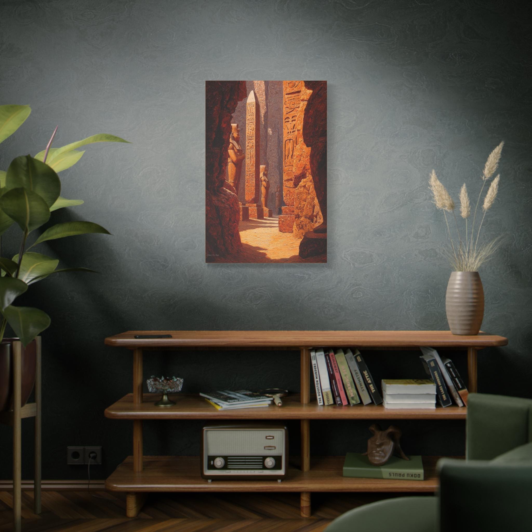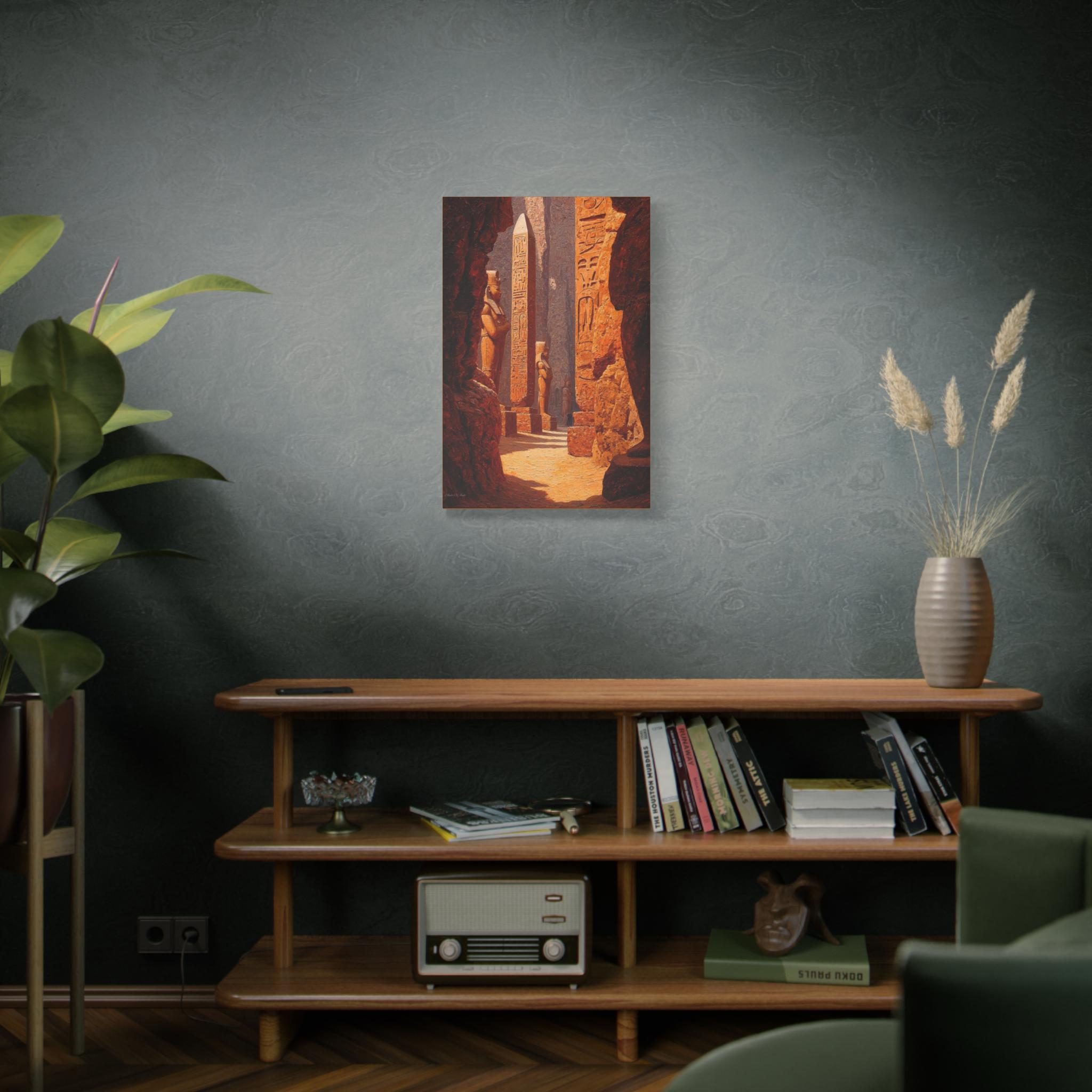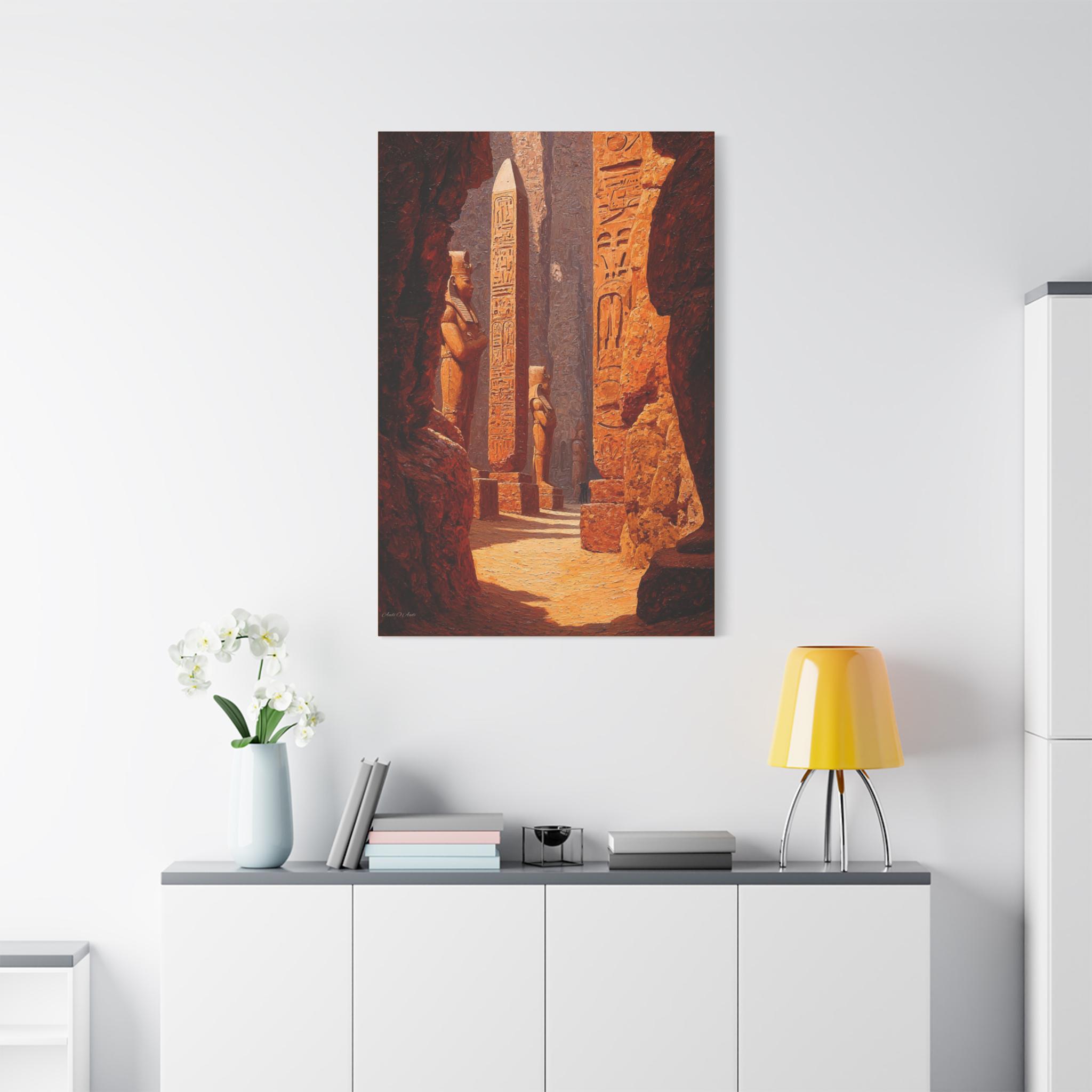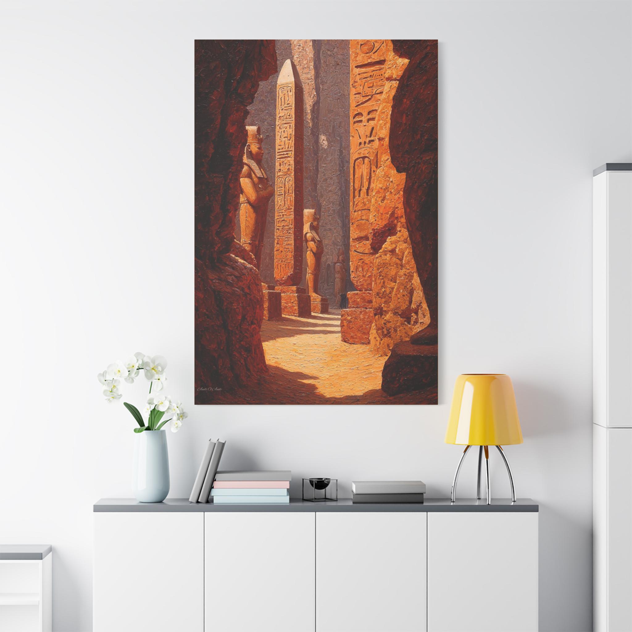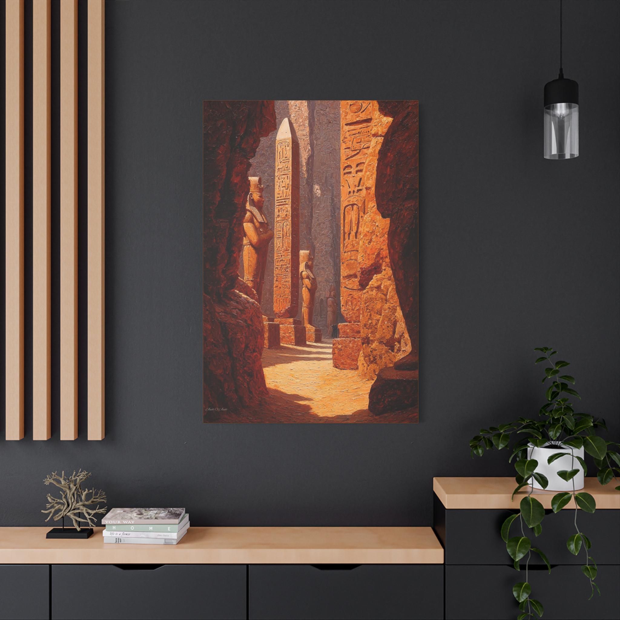 "The Path of the Pharaohs" is a mesmerizing vertical canvas print that transports the viewer into the awe-inspiring grandeur of an ancient Egyptian temple complex. The artwork is characterized by an exceptional heavy impasto texture, where thick, deliberate strokes of paint beautifully convey the rough, sun-baked sandstone of the enormous columns, statues, and natural rock formations.