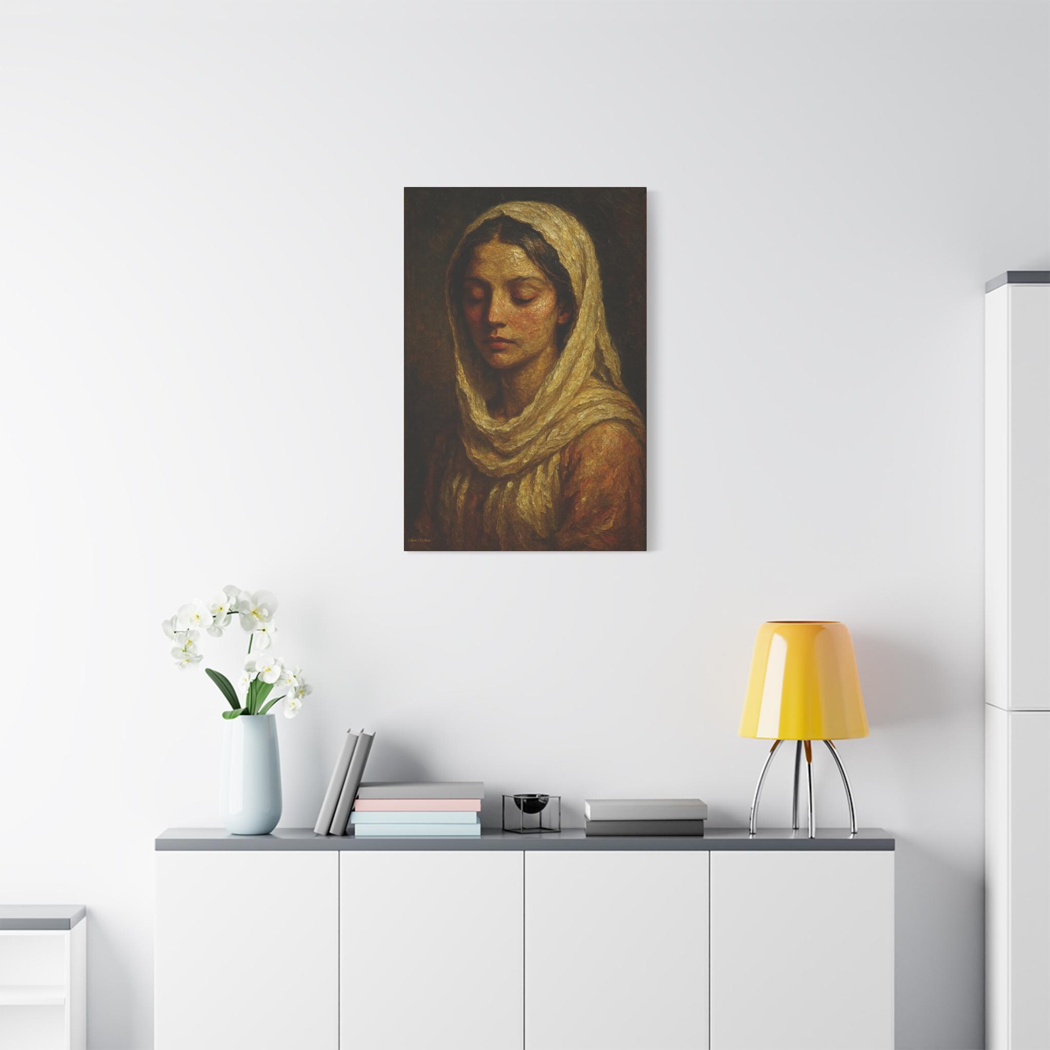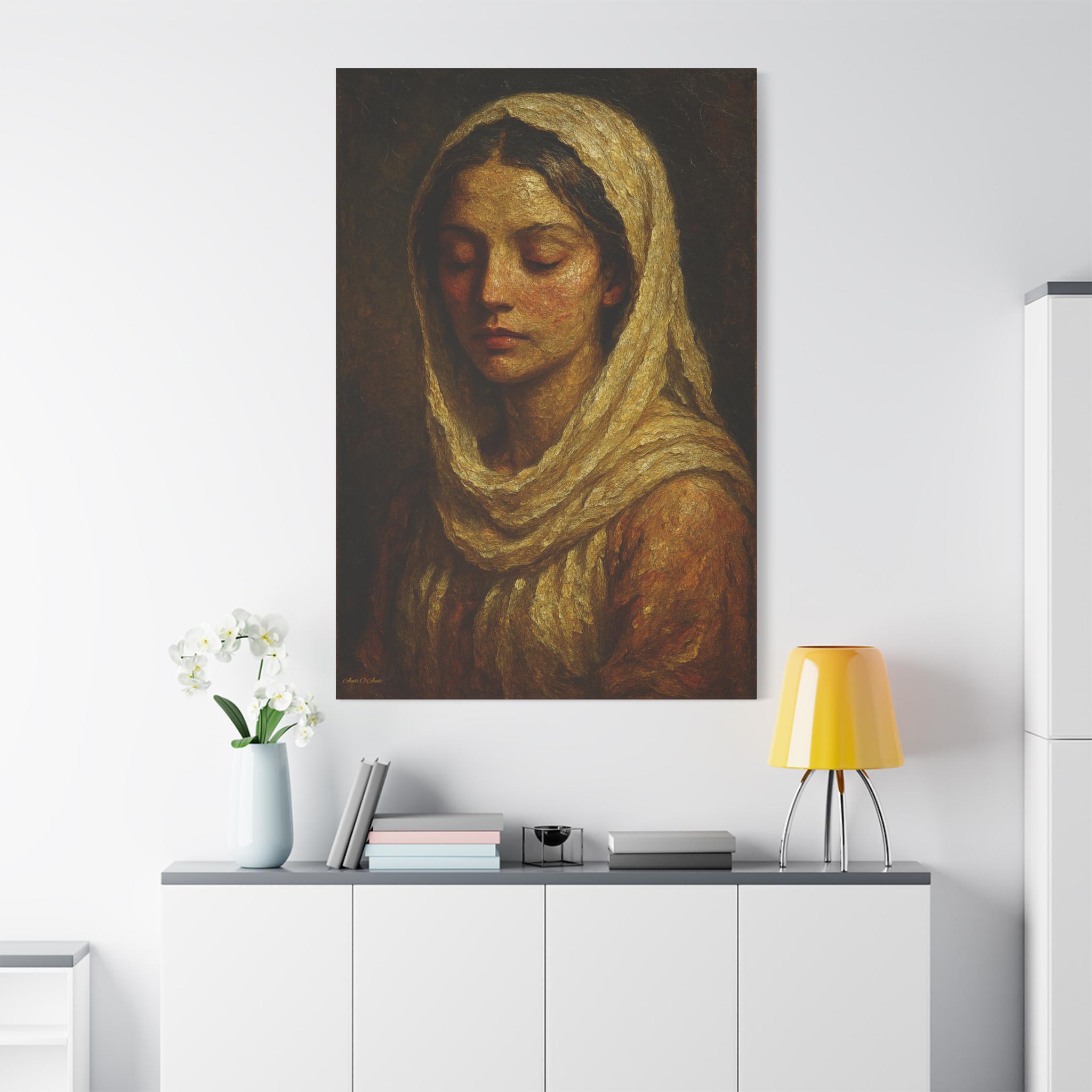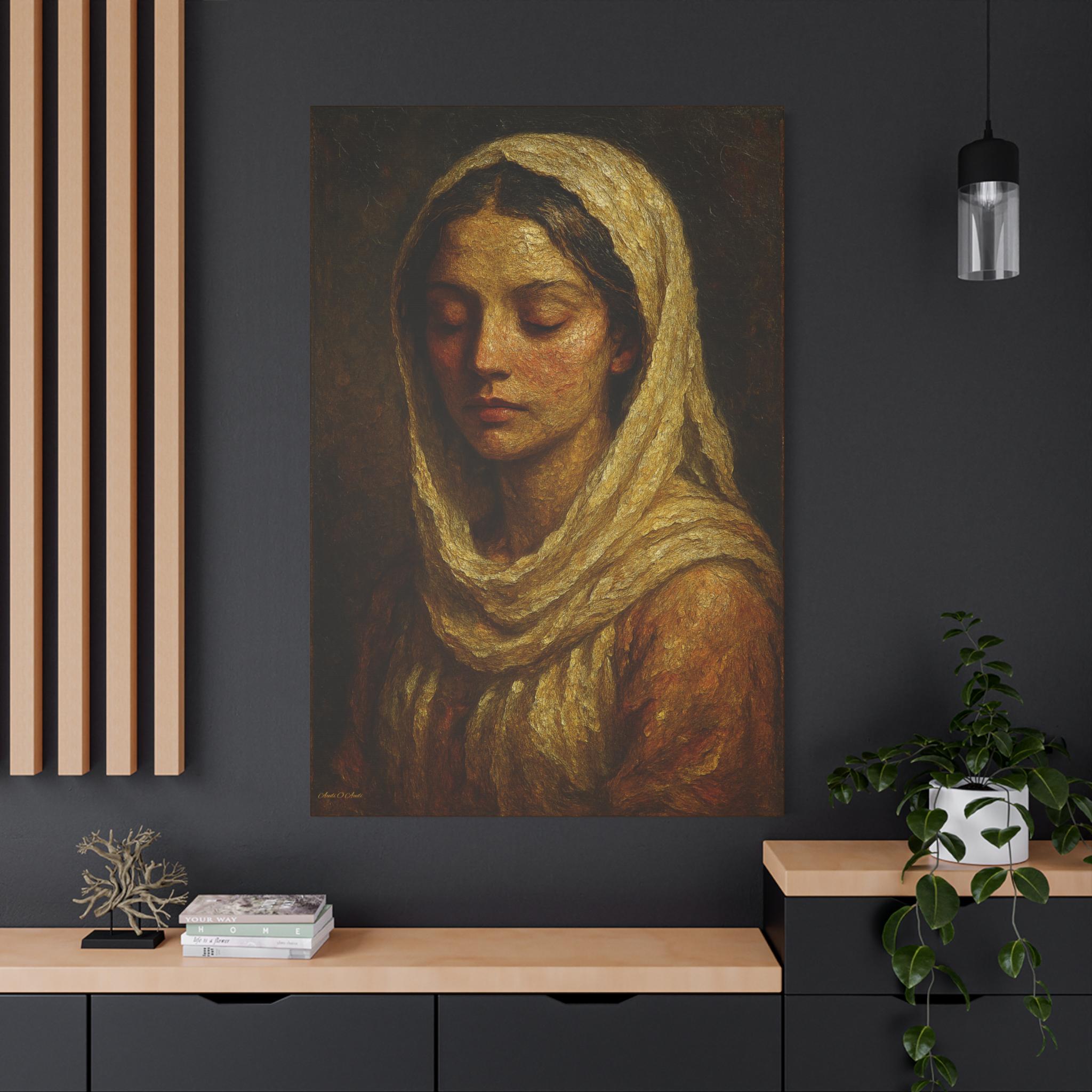 Serene Portrait in Golden:This canvas print is a captivating, intimate portrait executed in a style reminiscent of 19th-century Realism or Tonalism, focusing on a deeply introspective female subject.
