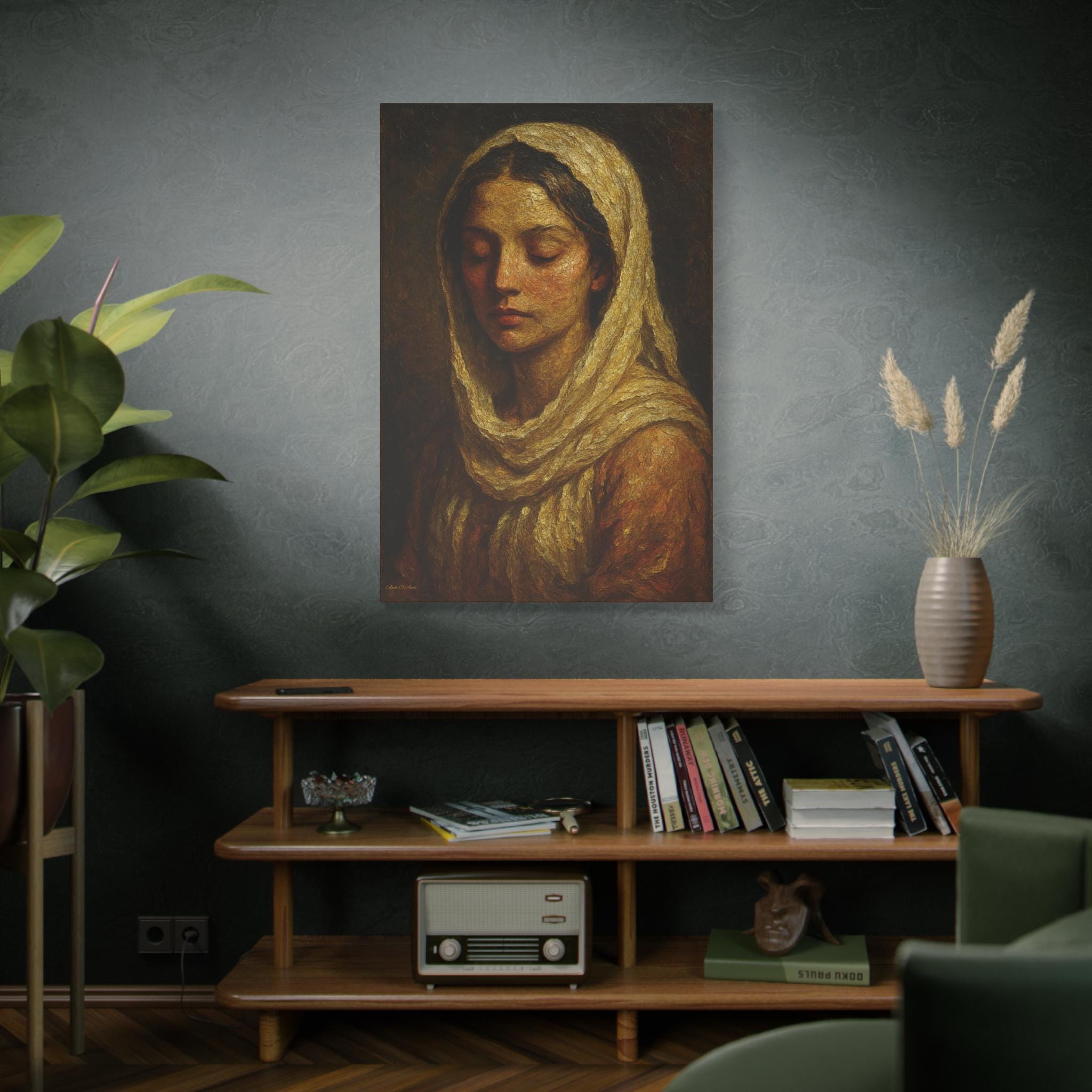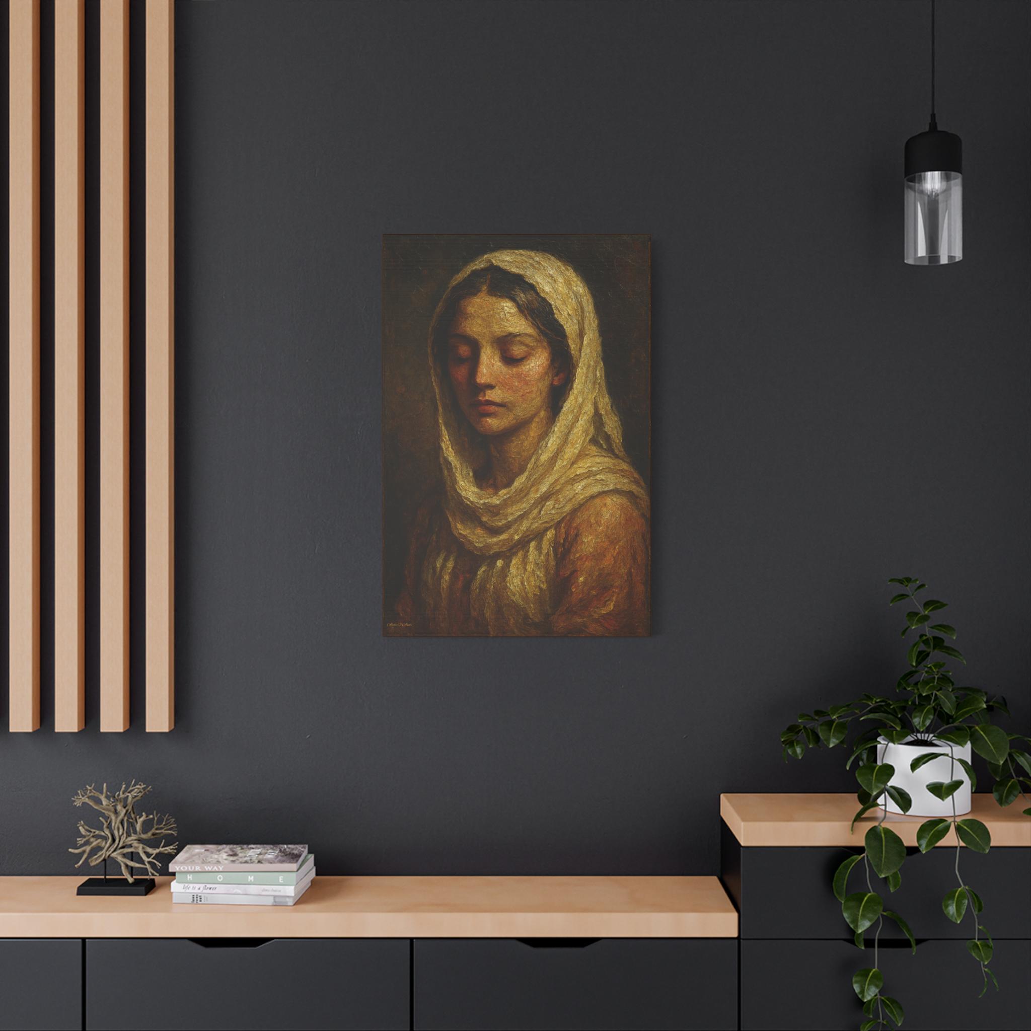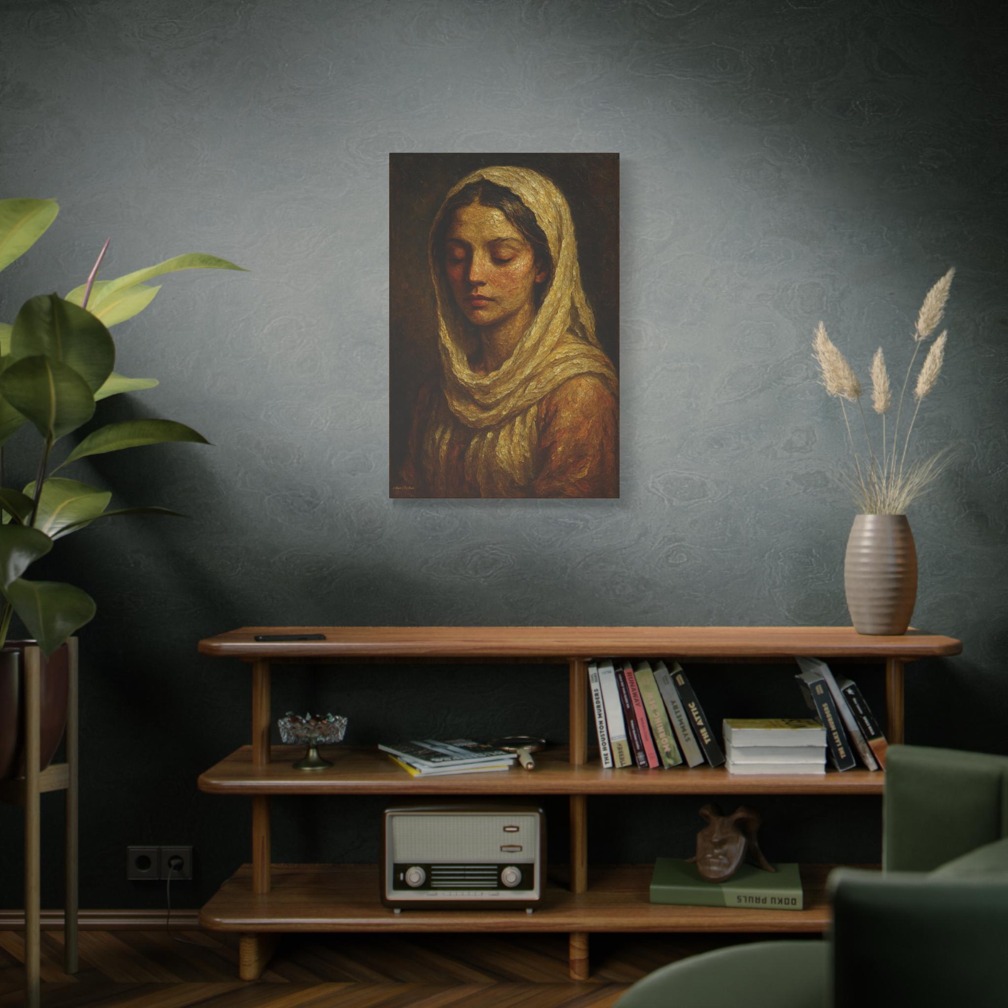 Serene Portrait in Golden:This canvas print is a captivating, intimate portrait executed in a style reminiscent of 19th-century Realism or Tonalism, focusing on a deeply introspective female subject.
