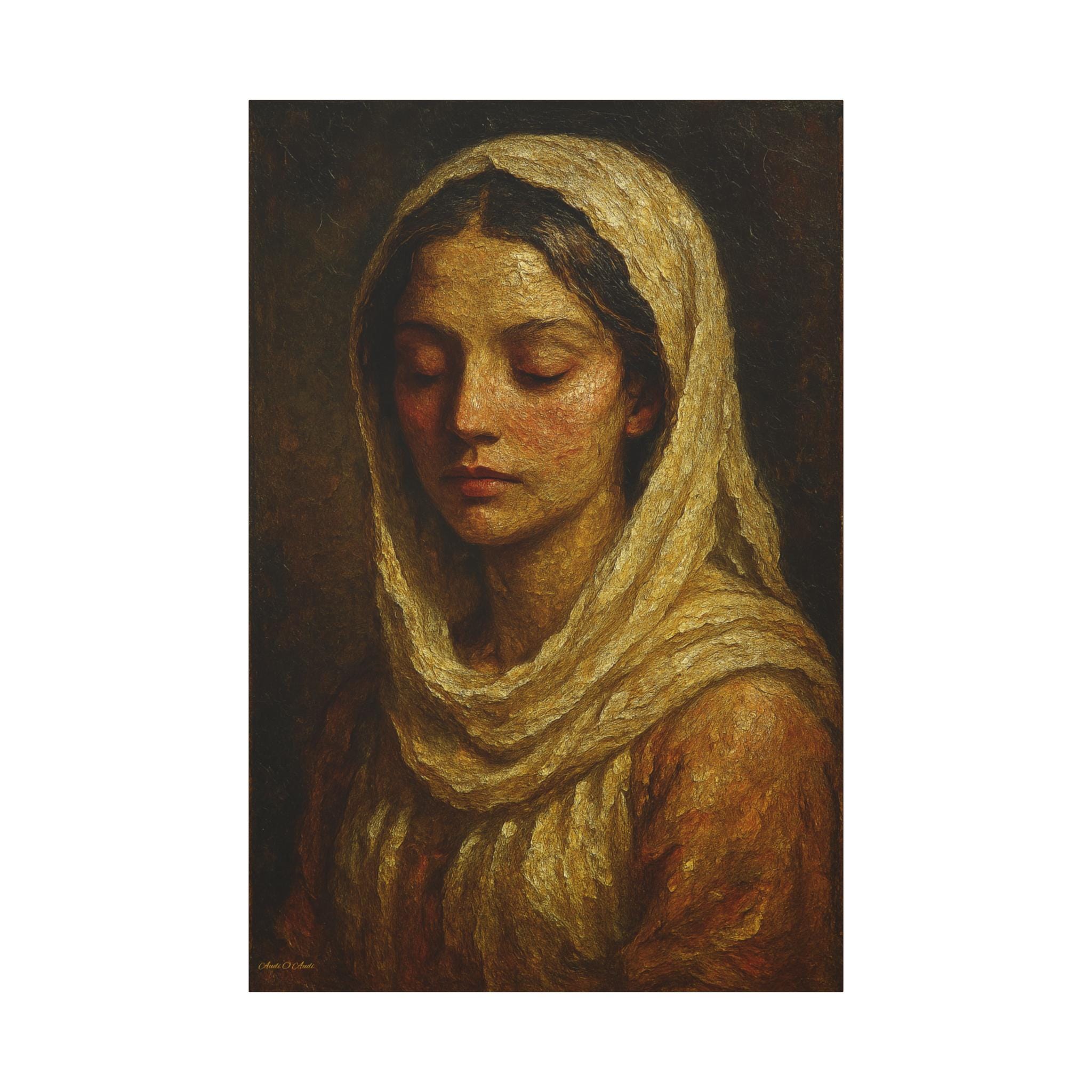 Subject and Mood: The portrait features a woman facing forward with her eyes gently closed, suggesting a moment of quiet contemplation, meditation, or devotion. Her expression is serene and subdued, drawing the viewer into her private world.