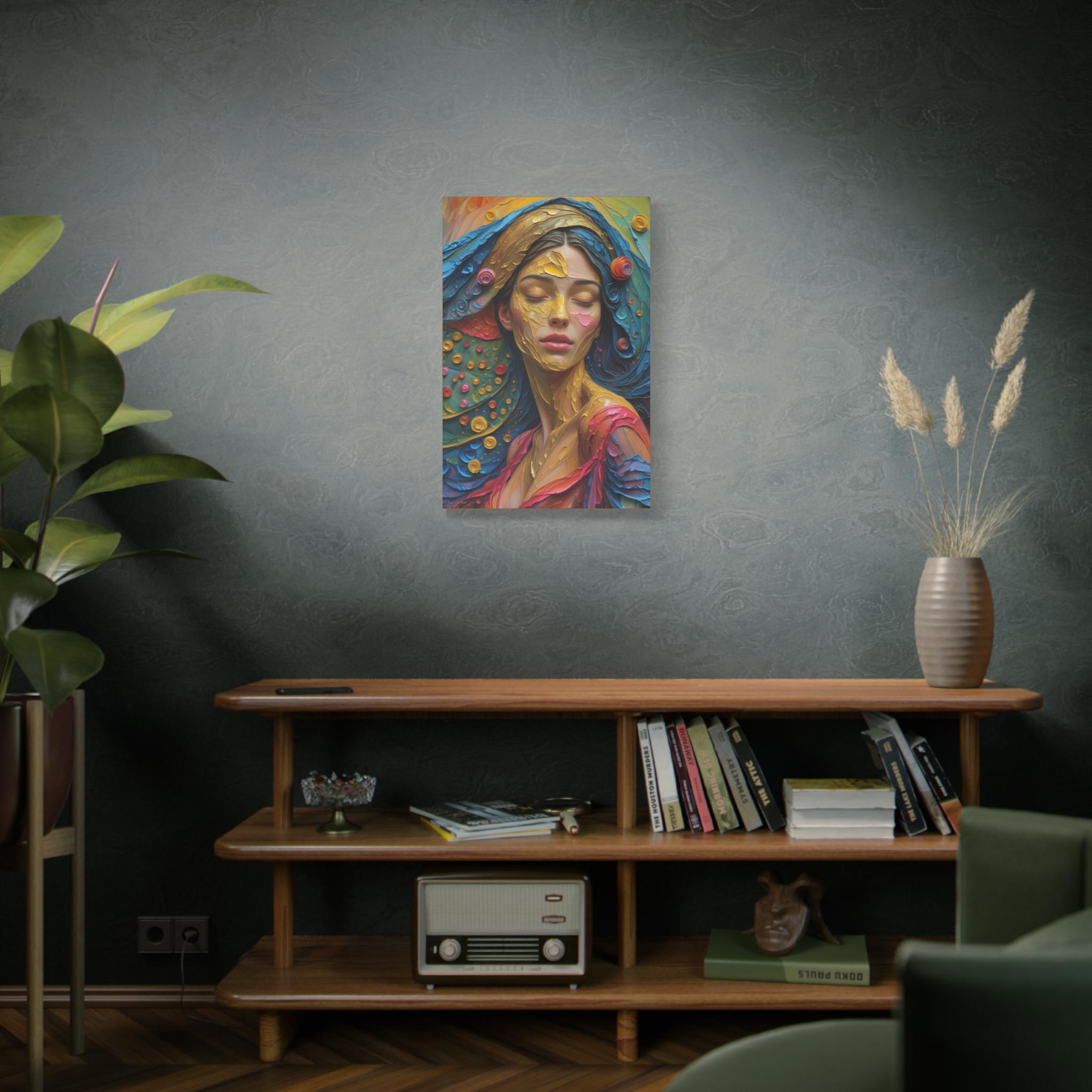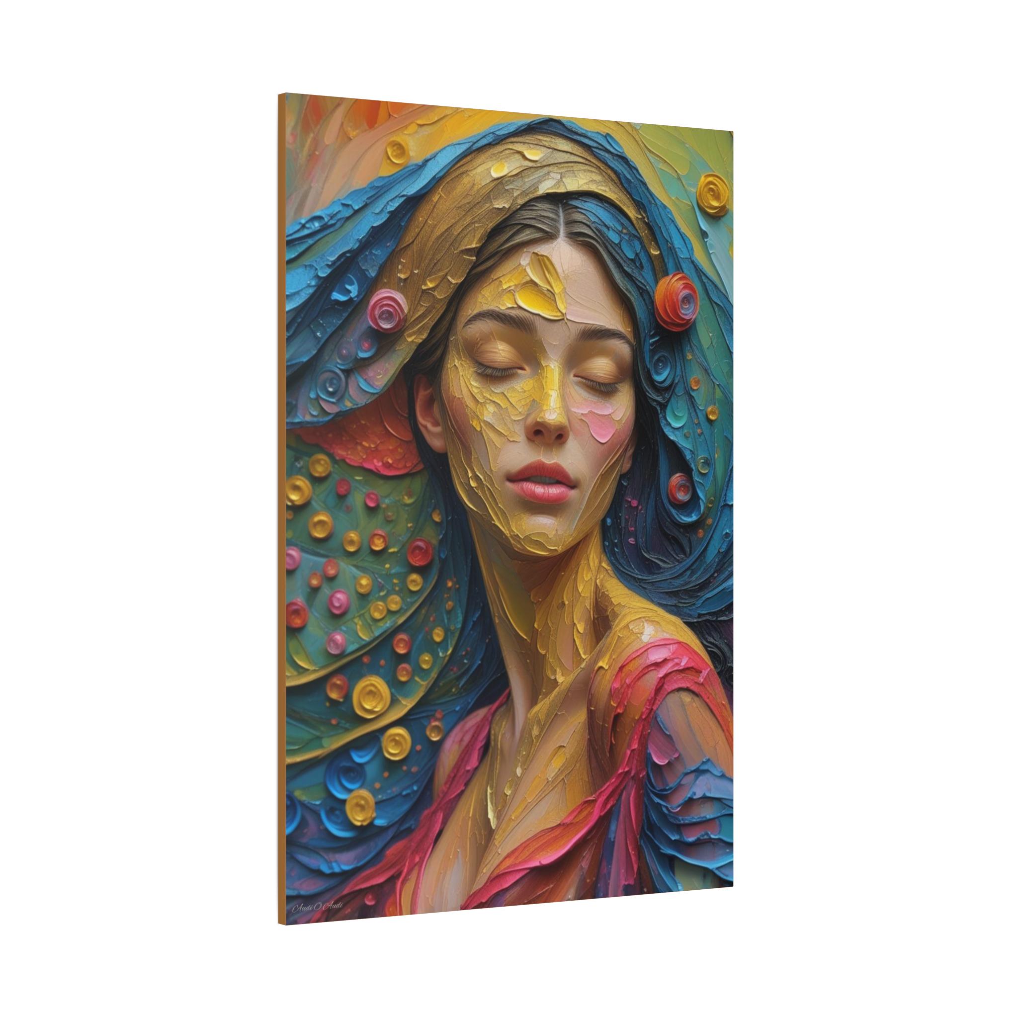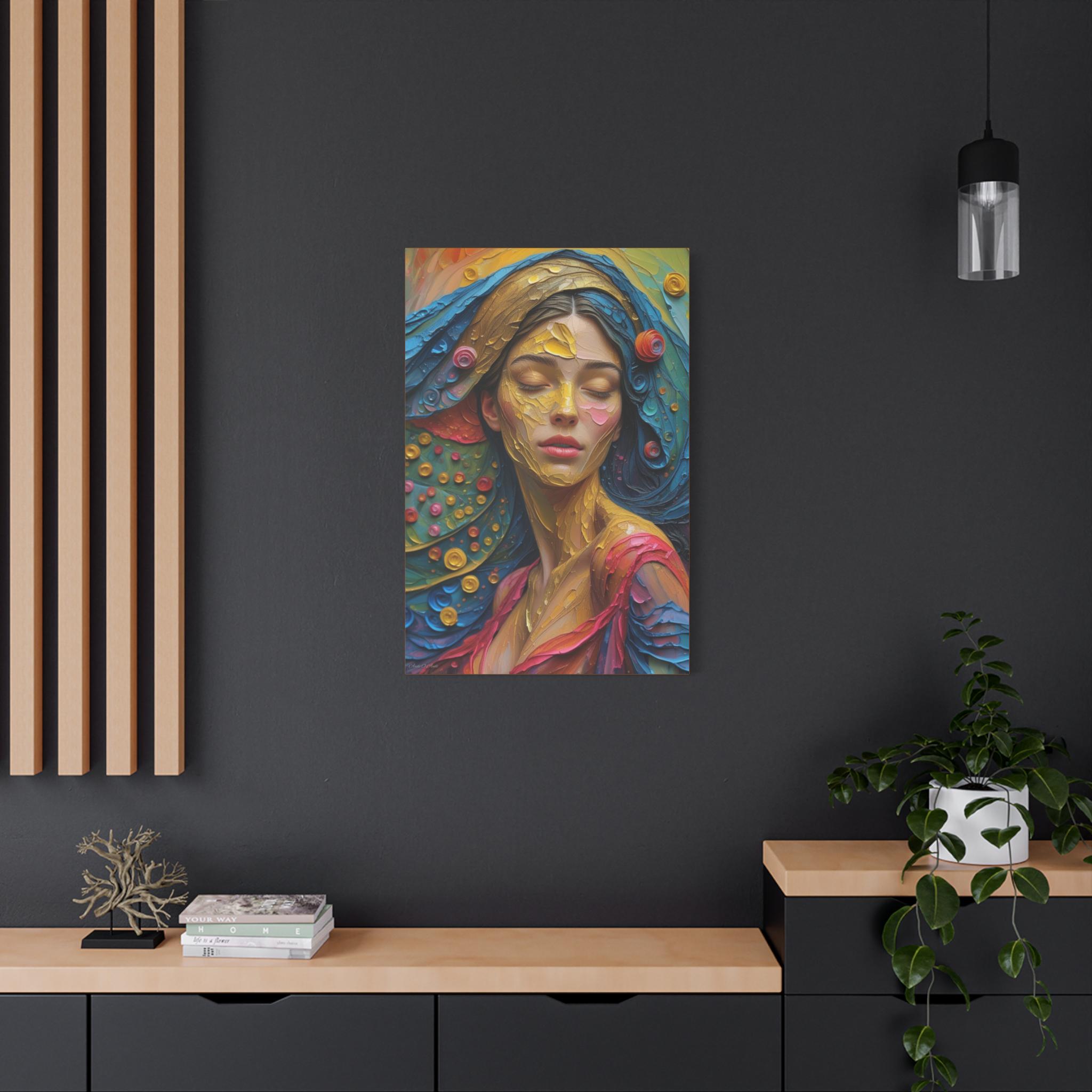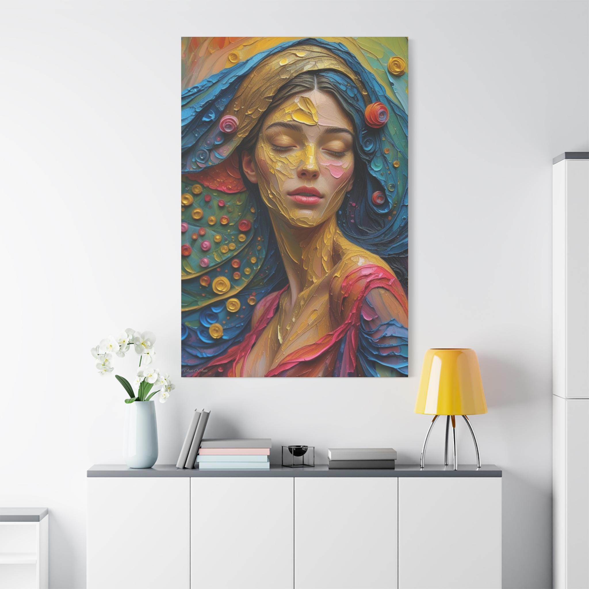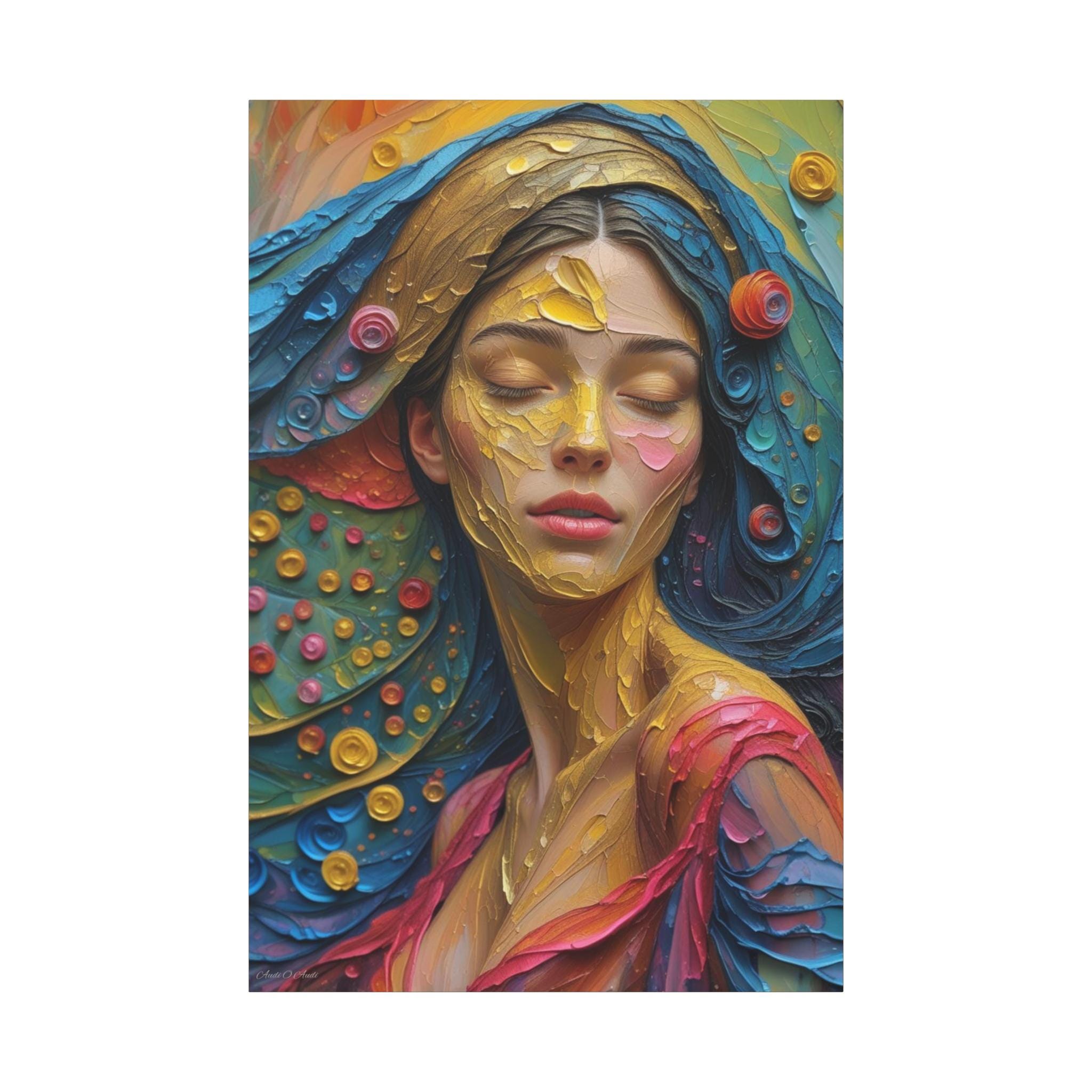 Aura of Gold: This canvas print is an extremely dynamic, highly saturated portrait that transcends realism, leaning into a modern, expressive, and abstract style. It celebrates color and texture with great intensity.