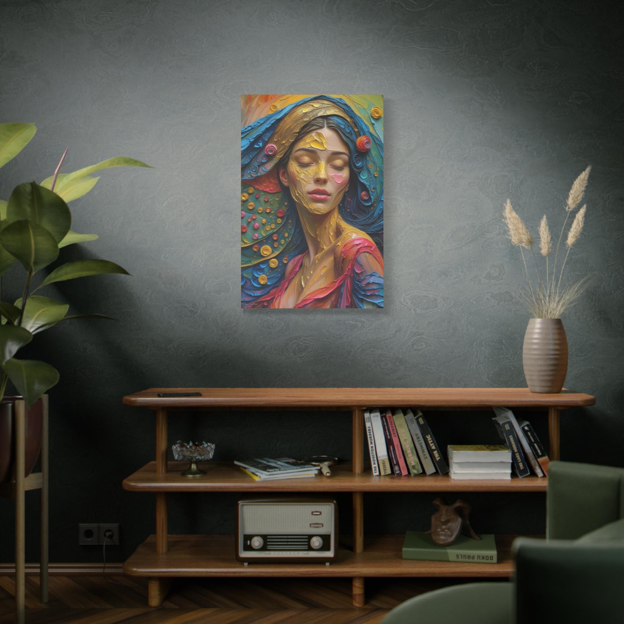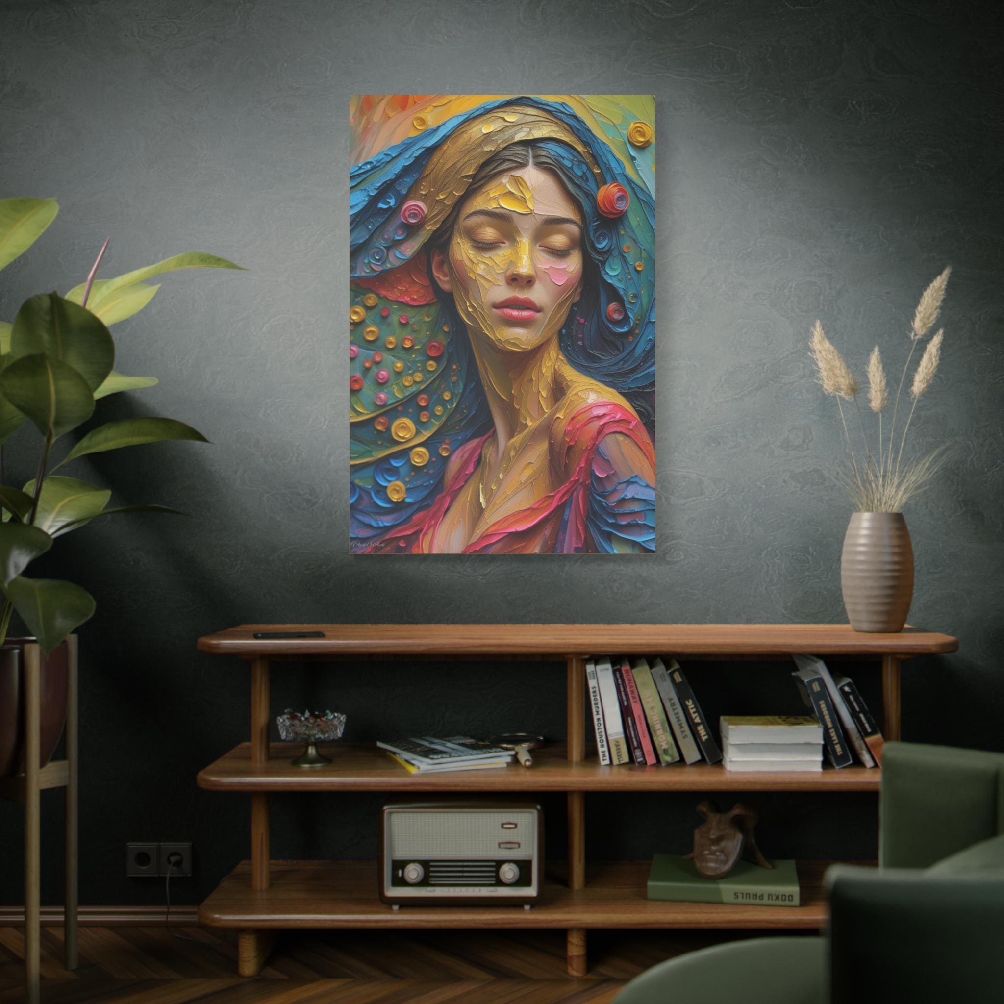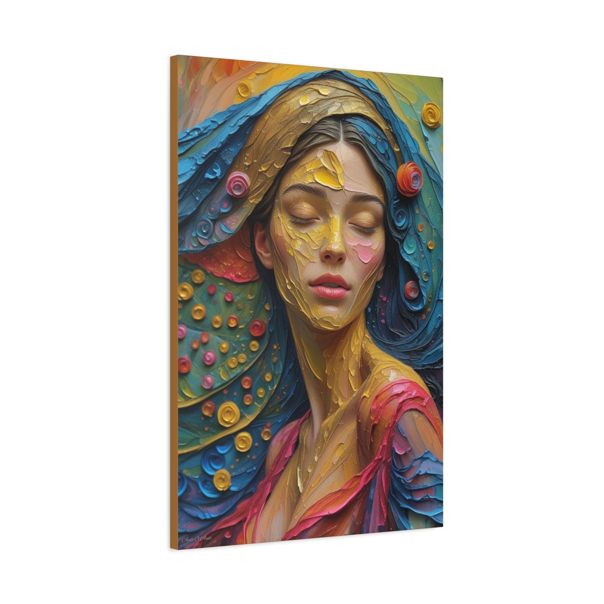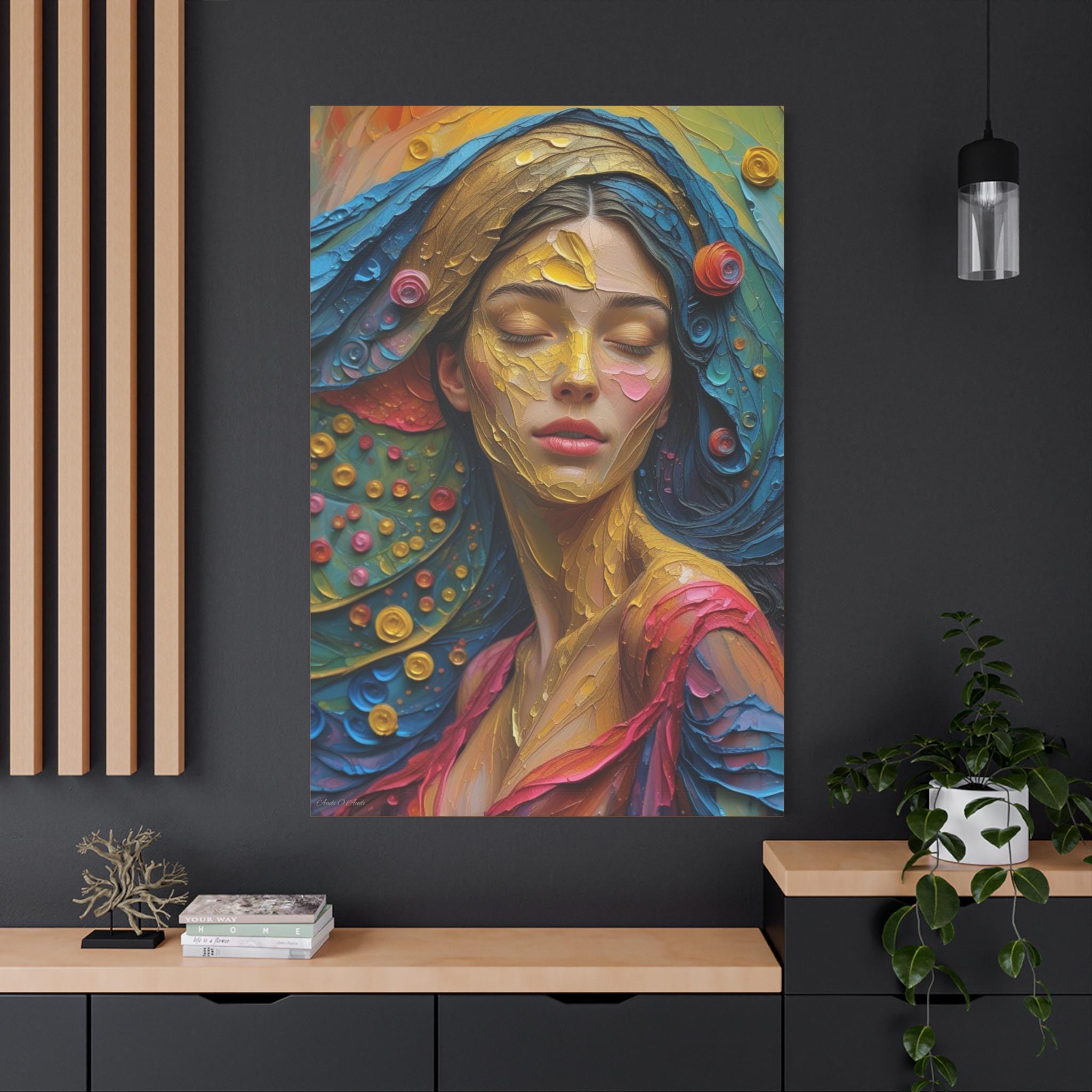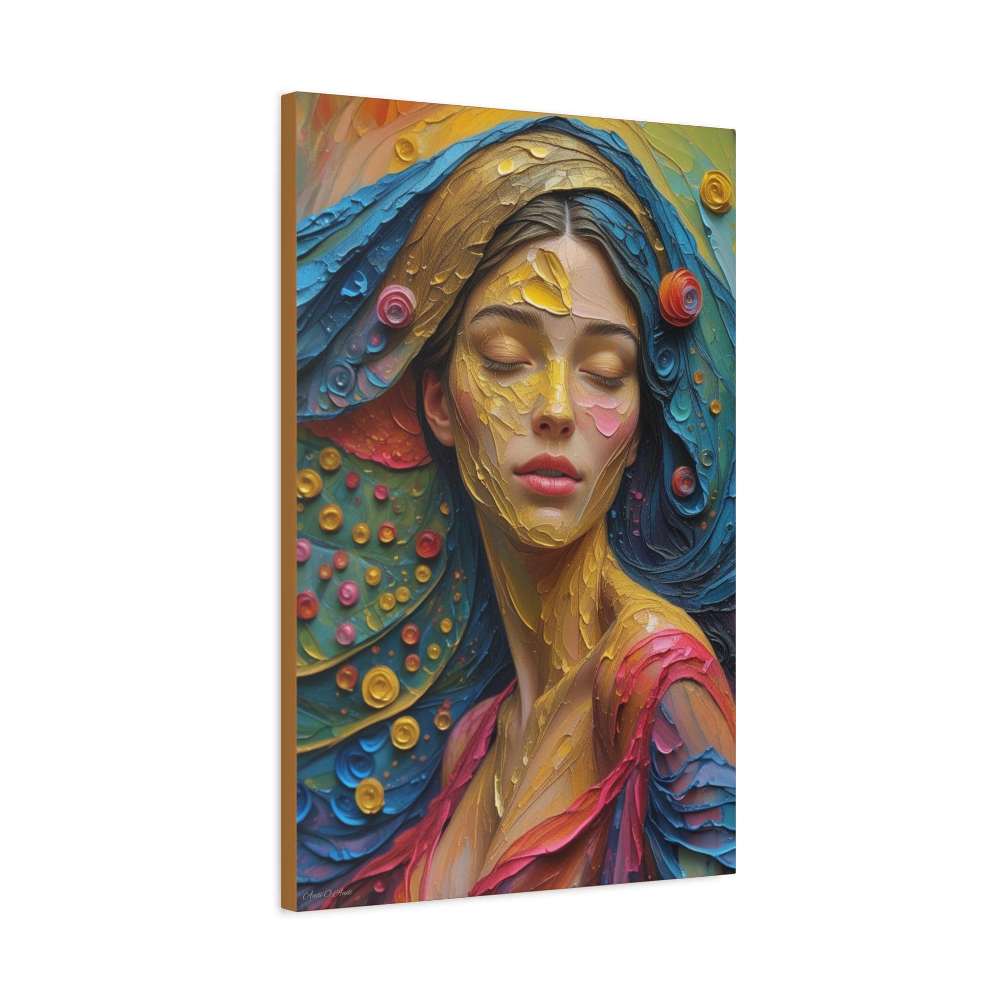 Aura of Gold: This canvas print is an extremely dynamic, highly saturated portrait that transcends realism, leaning into a modern, expressive, and abstract style. It celebrates color and texture with great intensity.
