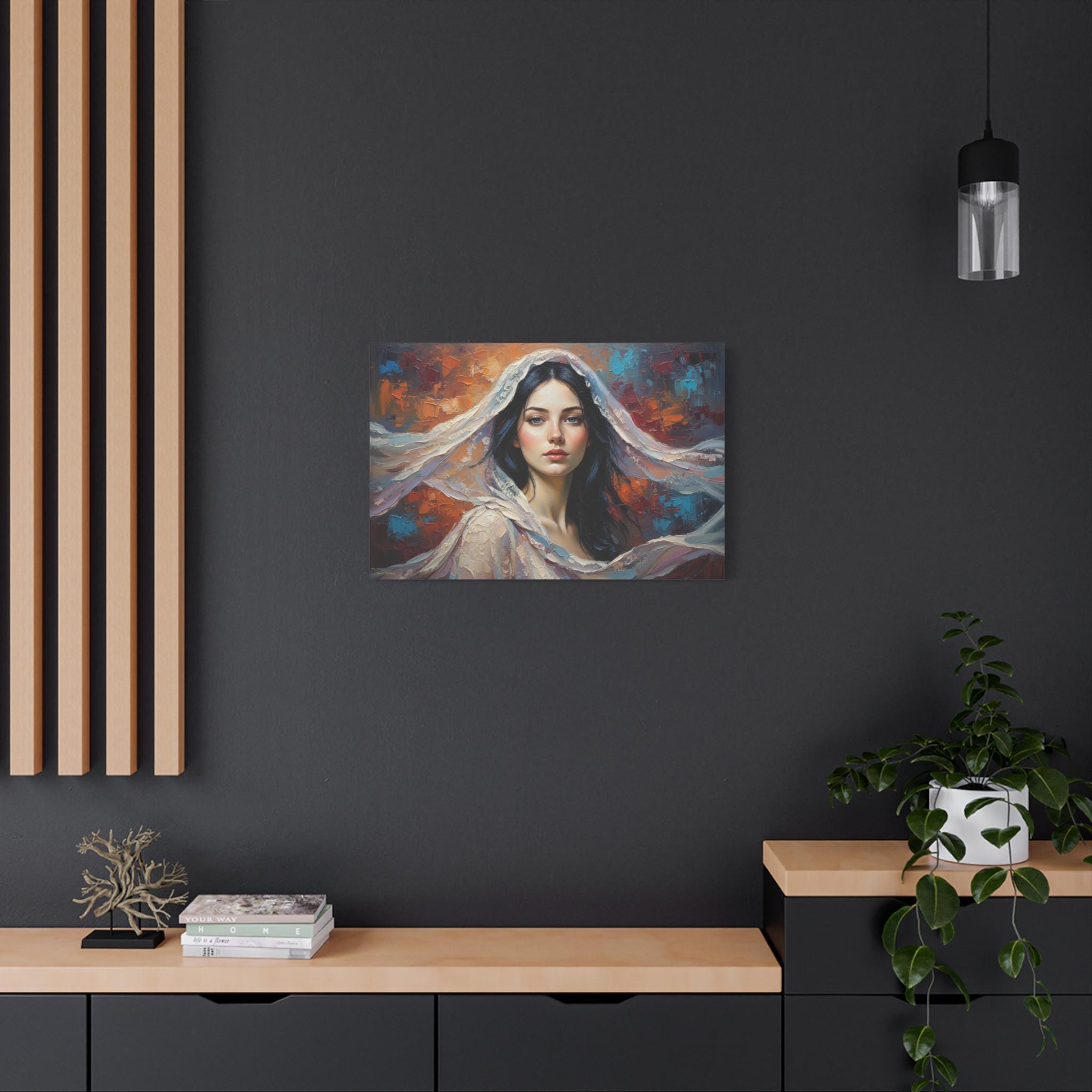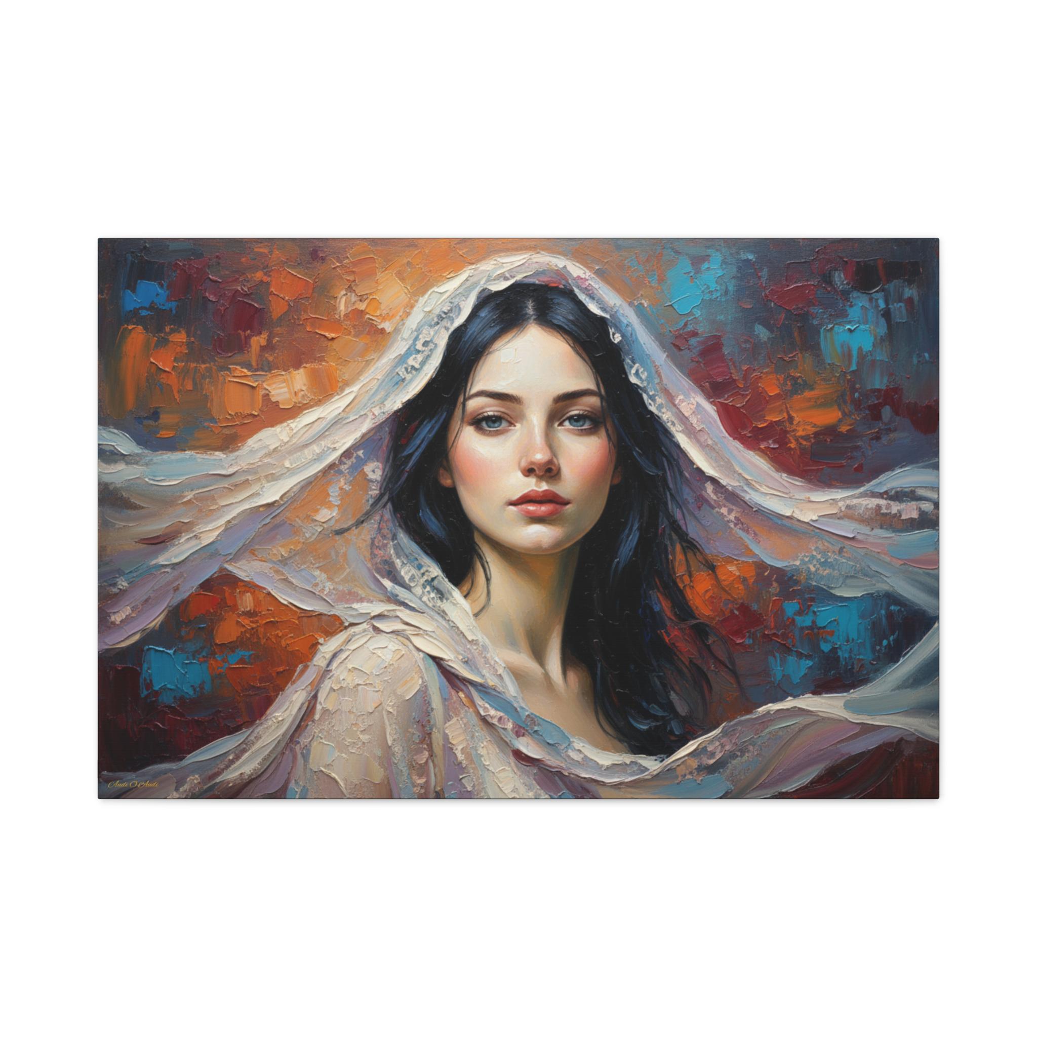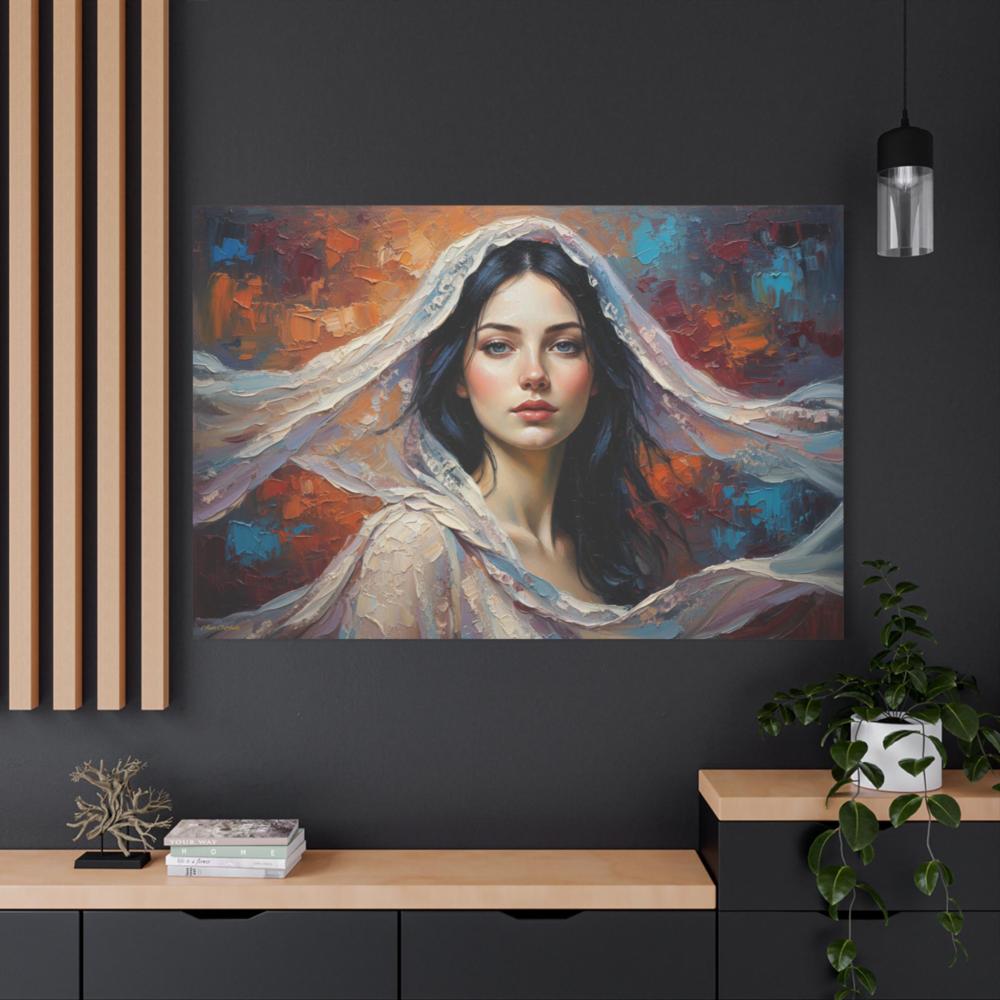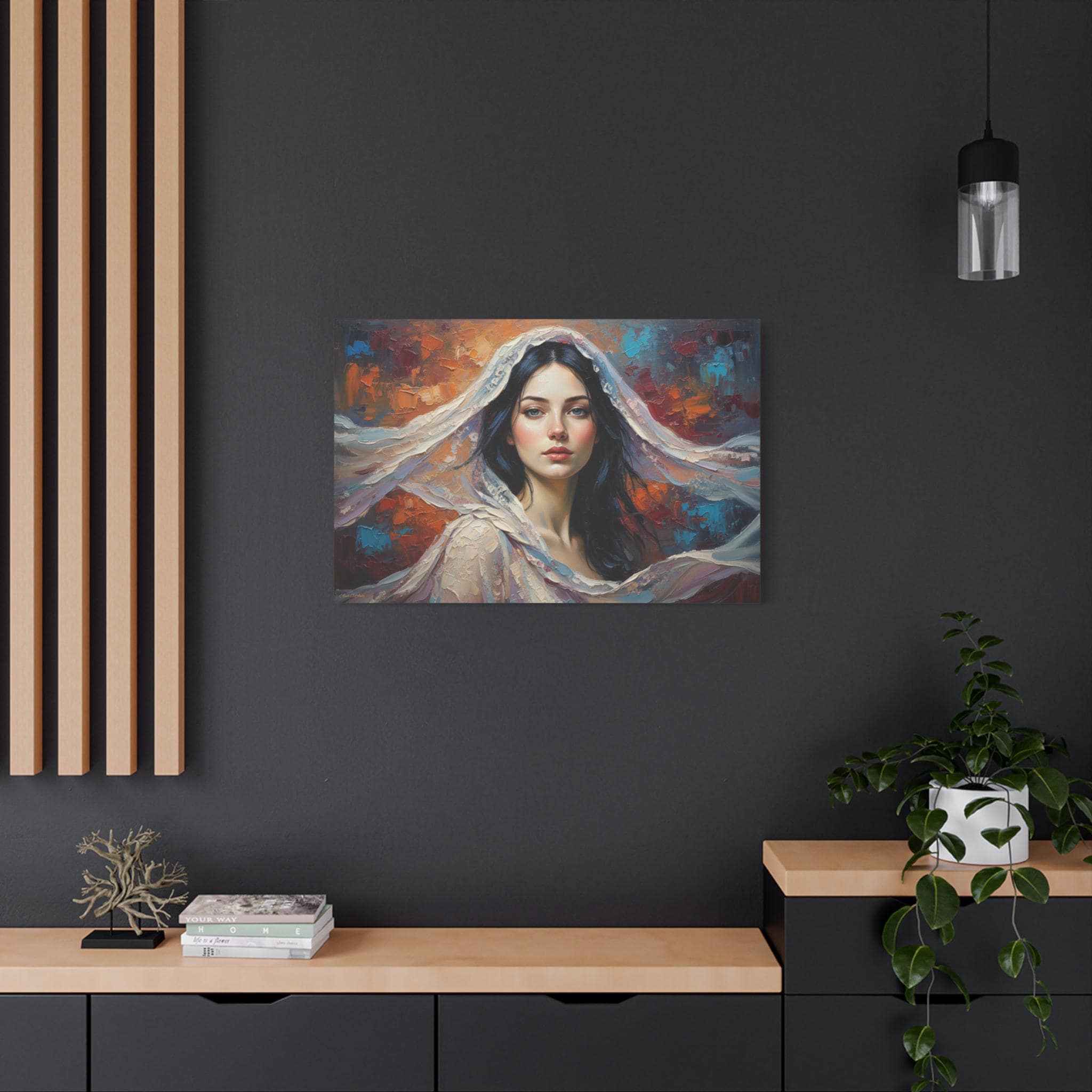 Veiled Harmony, Print, Portrait of Woman with Veil Matte Wall Art, Stretched Gallery Wrap, Home Decor, Gift for Her, Feminine Artwork