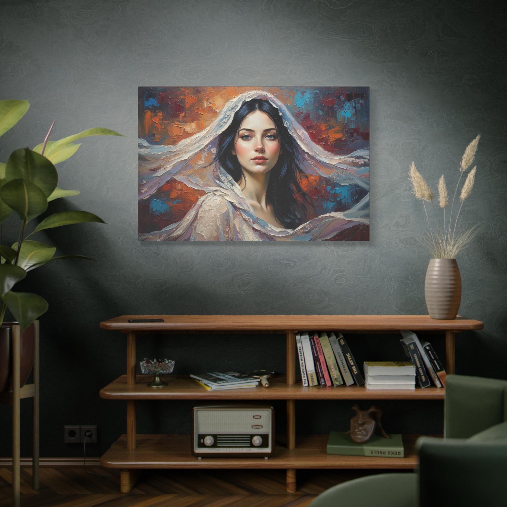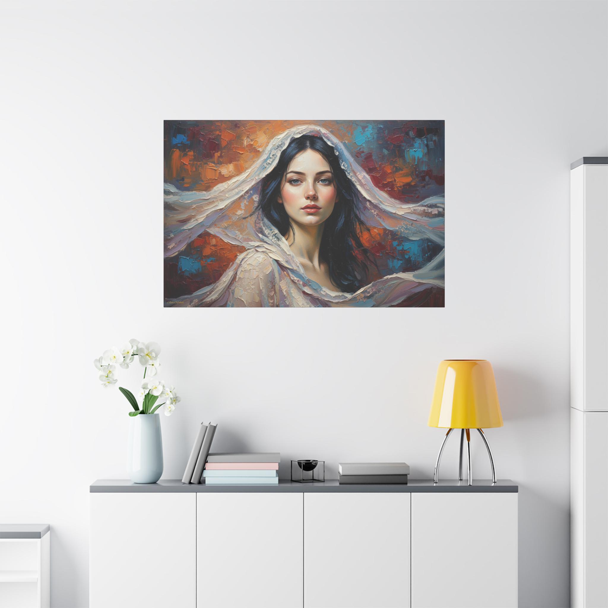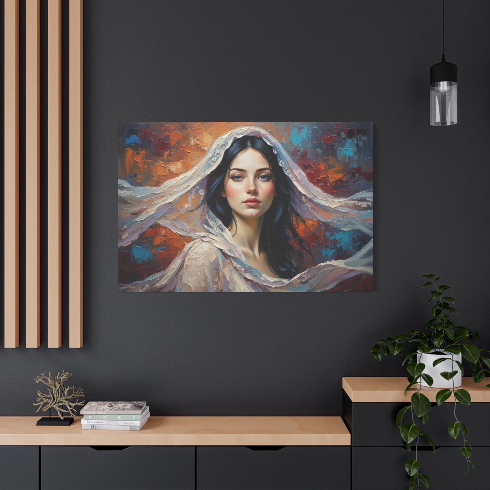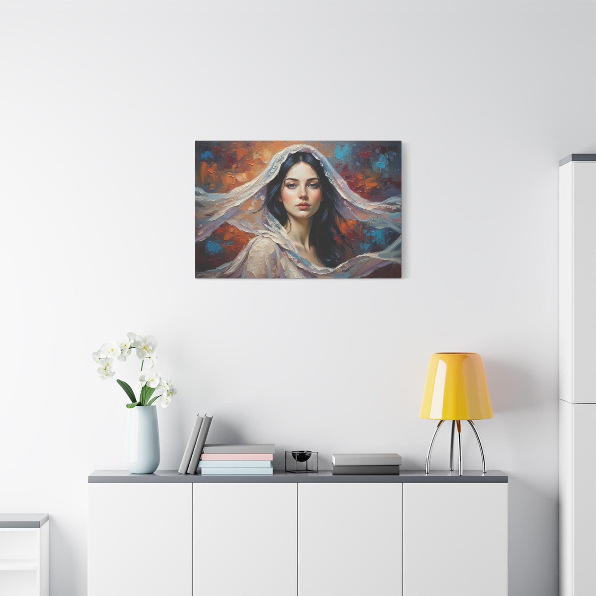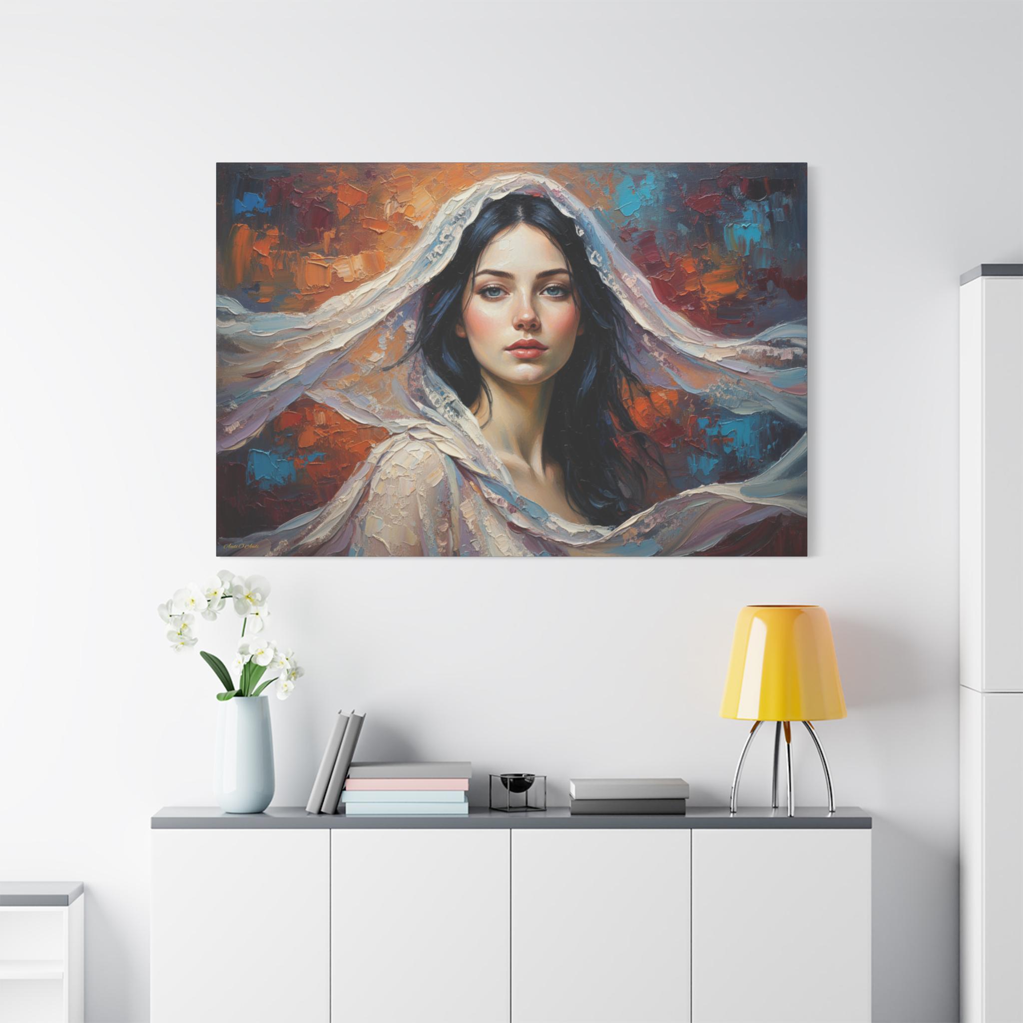 Veiled Harmony, Print, Portrait of Woman with Veil Matte Wall Art, Stretched Gallery Wrap, Home Decor, Gift for Her, Feminine Artwork