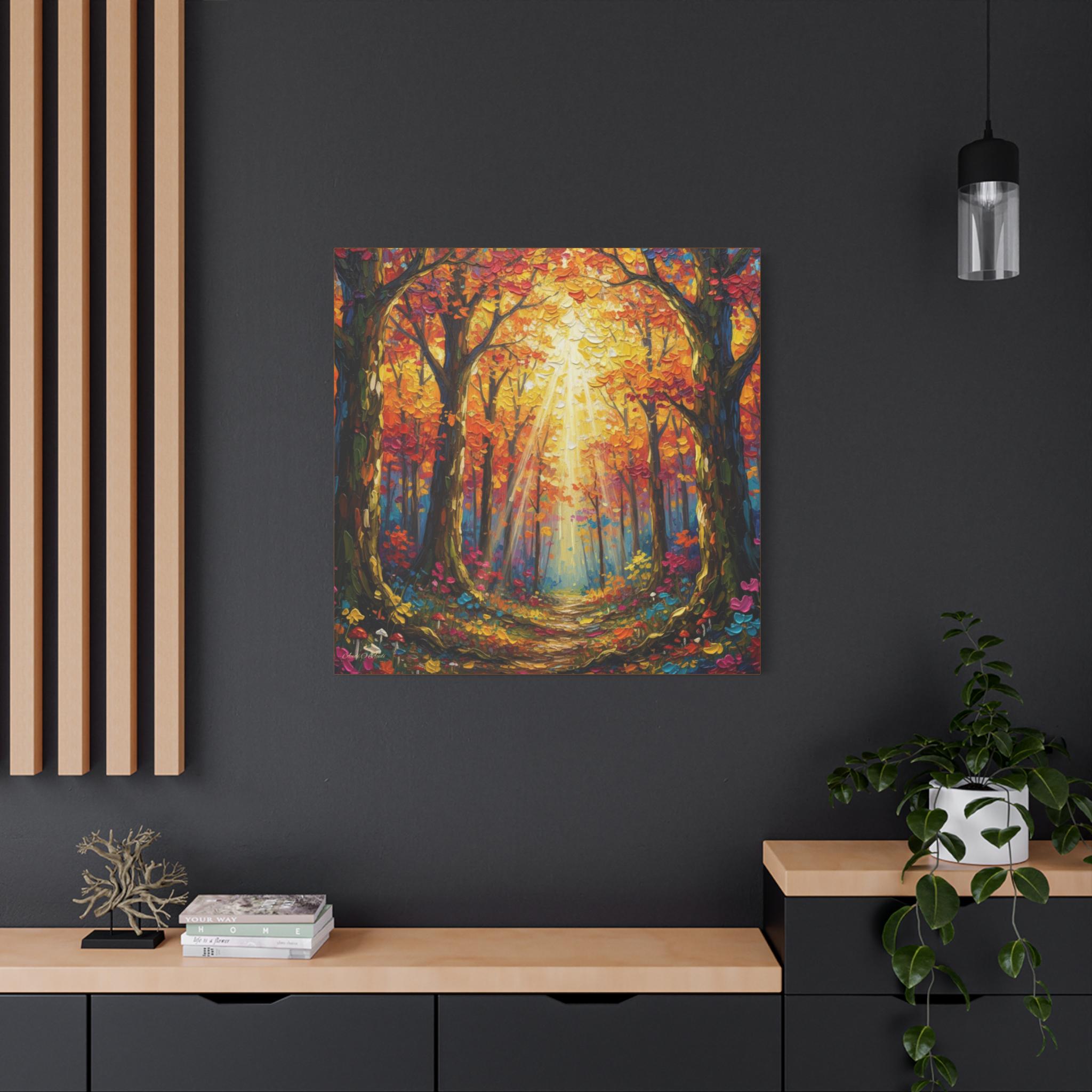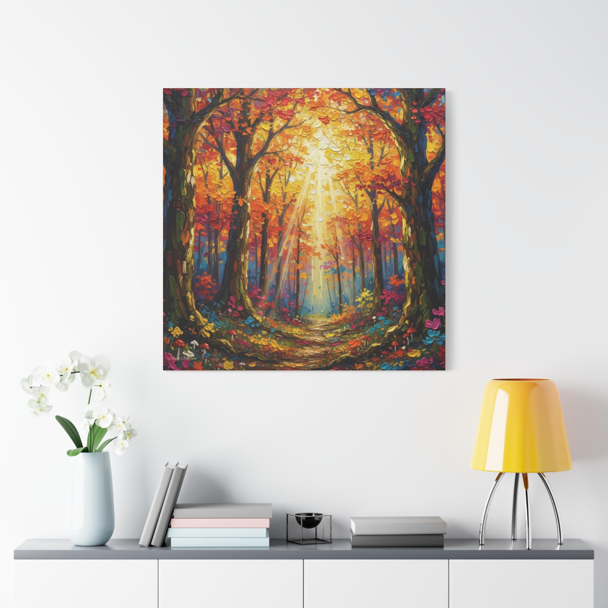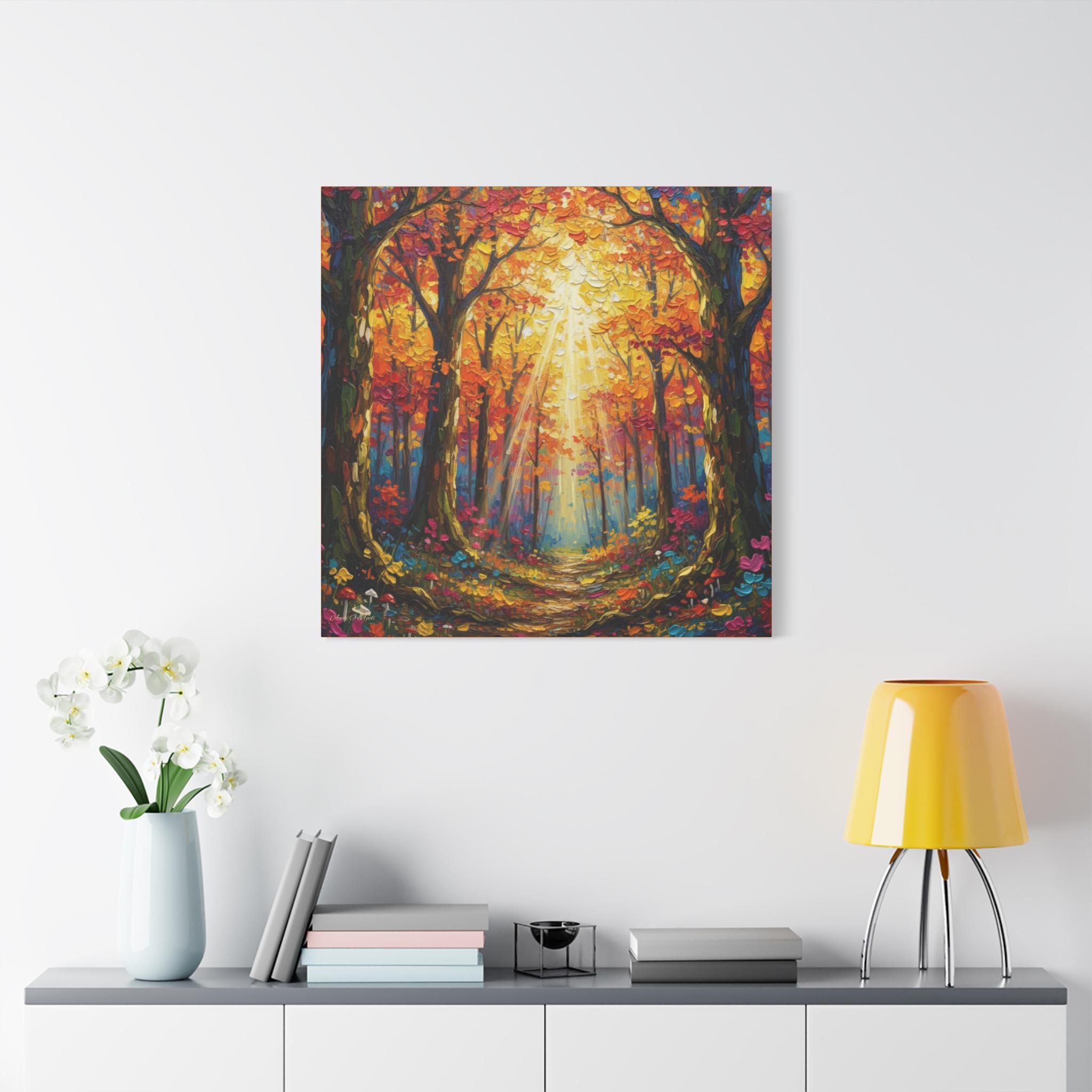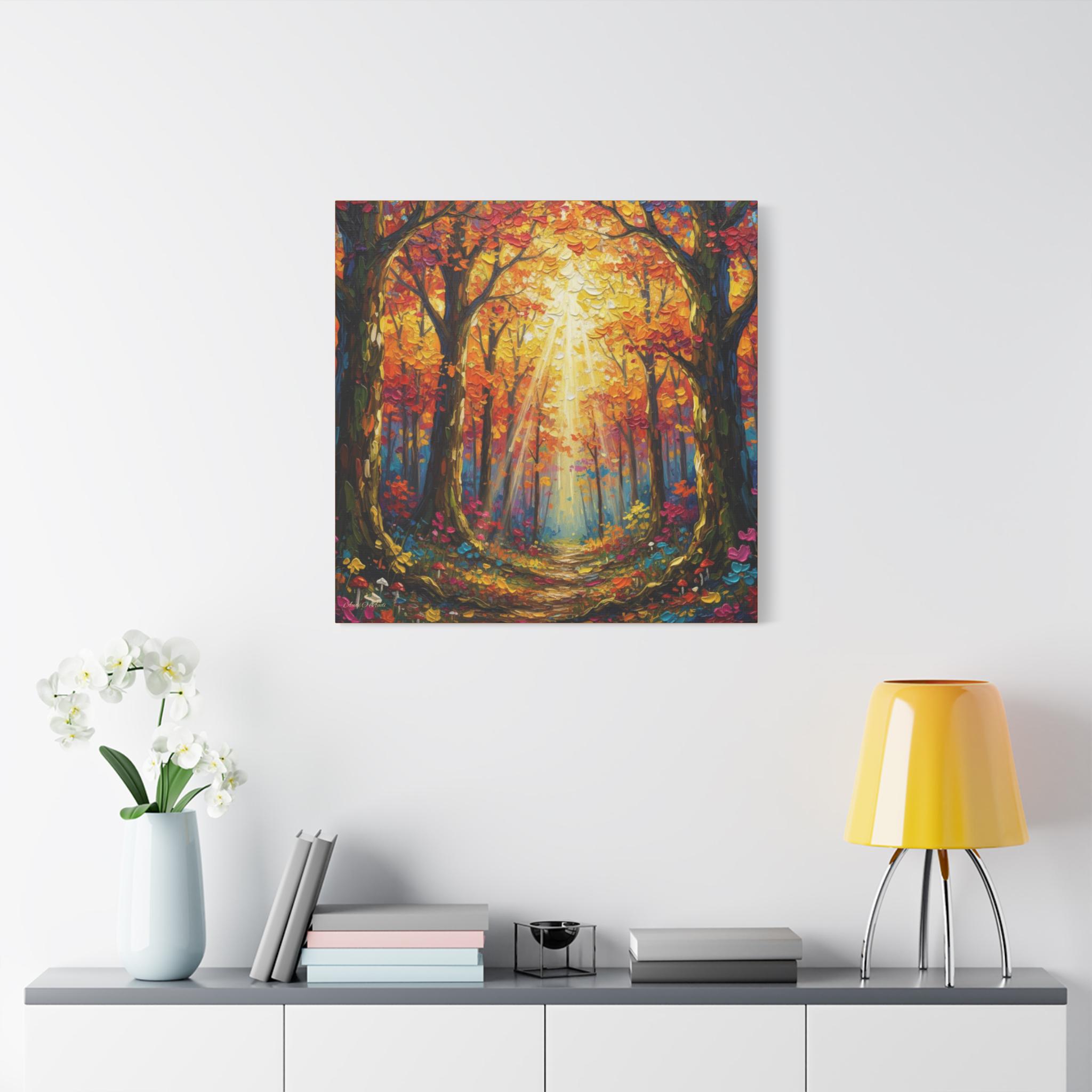 Printed on canvas, the piece is well suited for entryways, living rooms, or hospitality spaces seeking warmth and vibrancy. It reads equally well at distance—where the light and structure dominate—and up close, where the thick, knife‑applied textures offer visual interest. The mood is uplifting and restorative, evoking a golden‑hour walk in late autumn.
