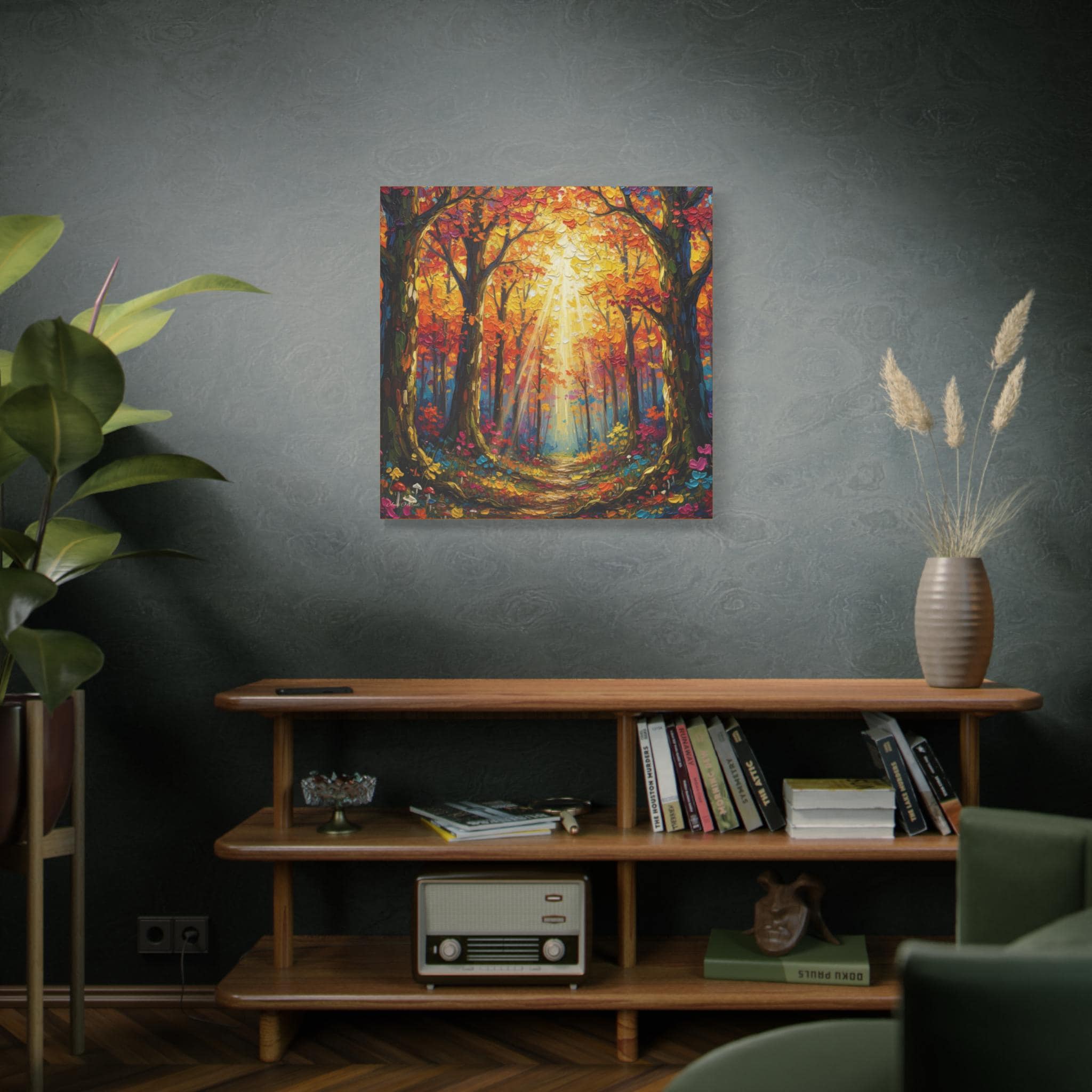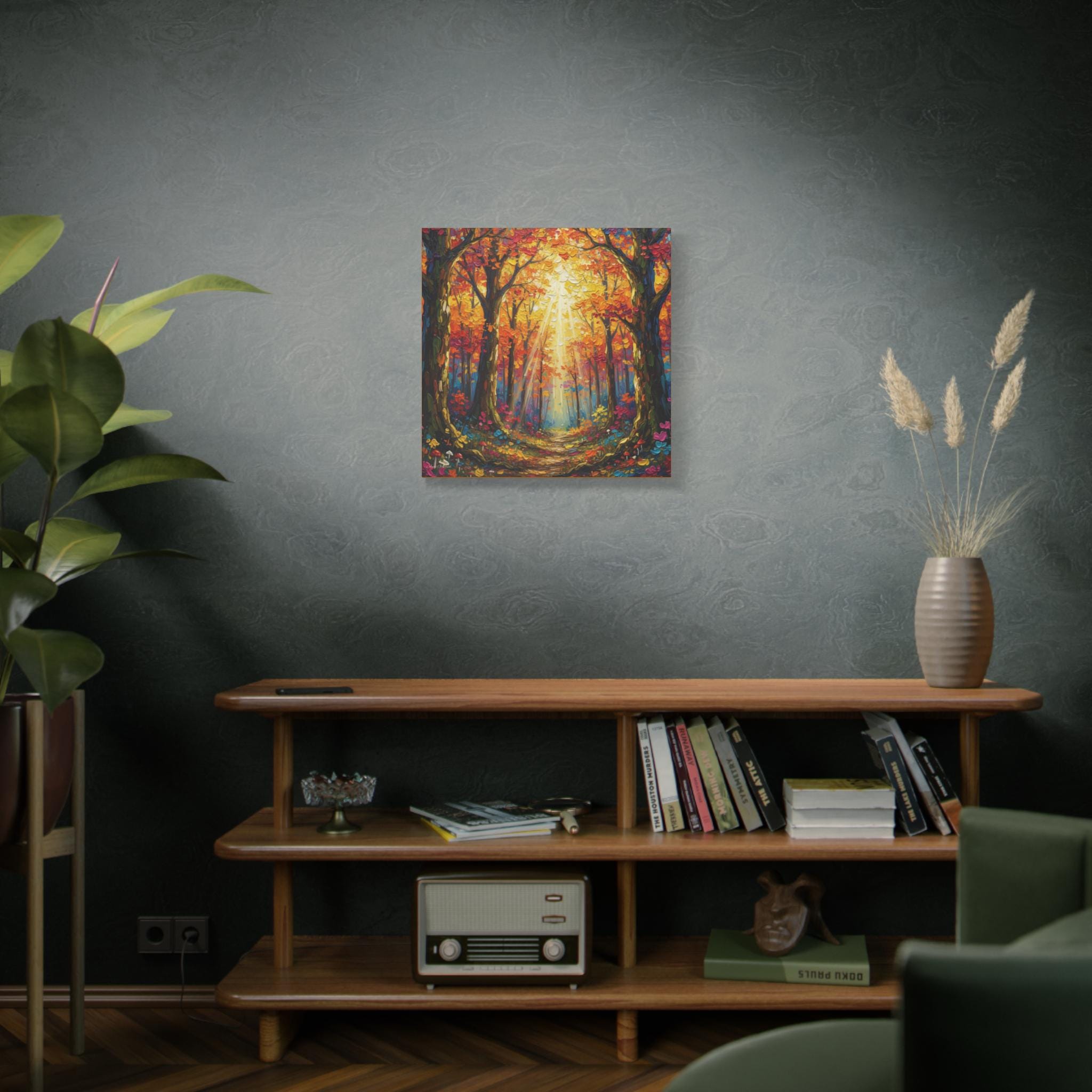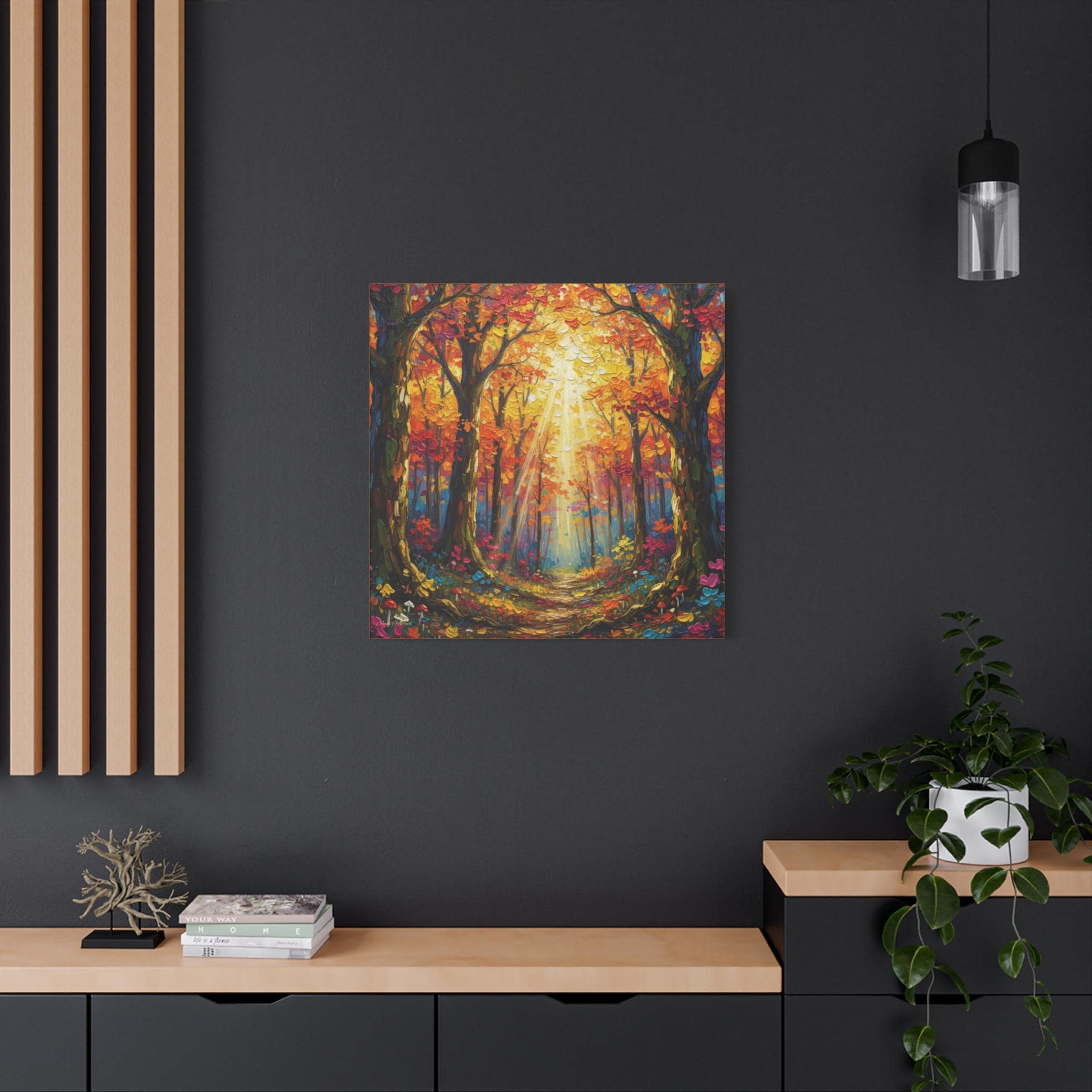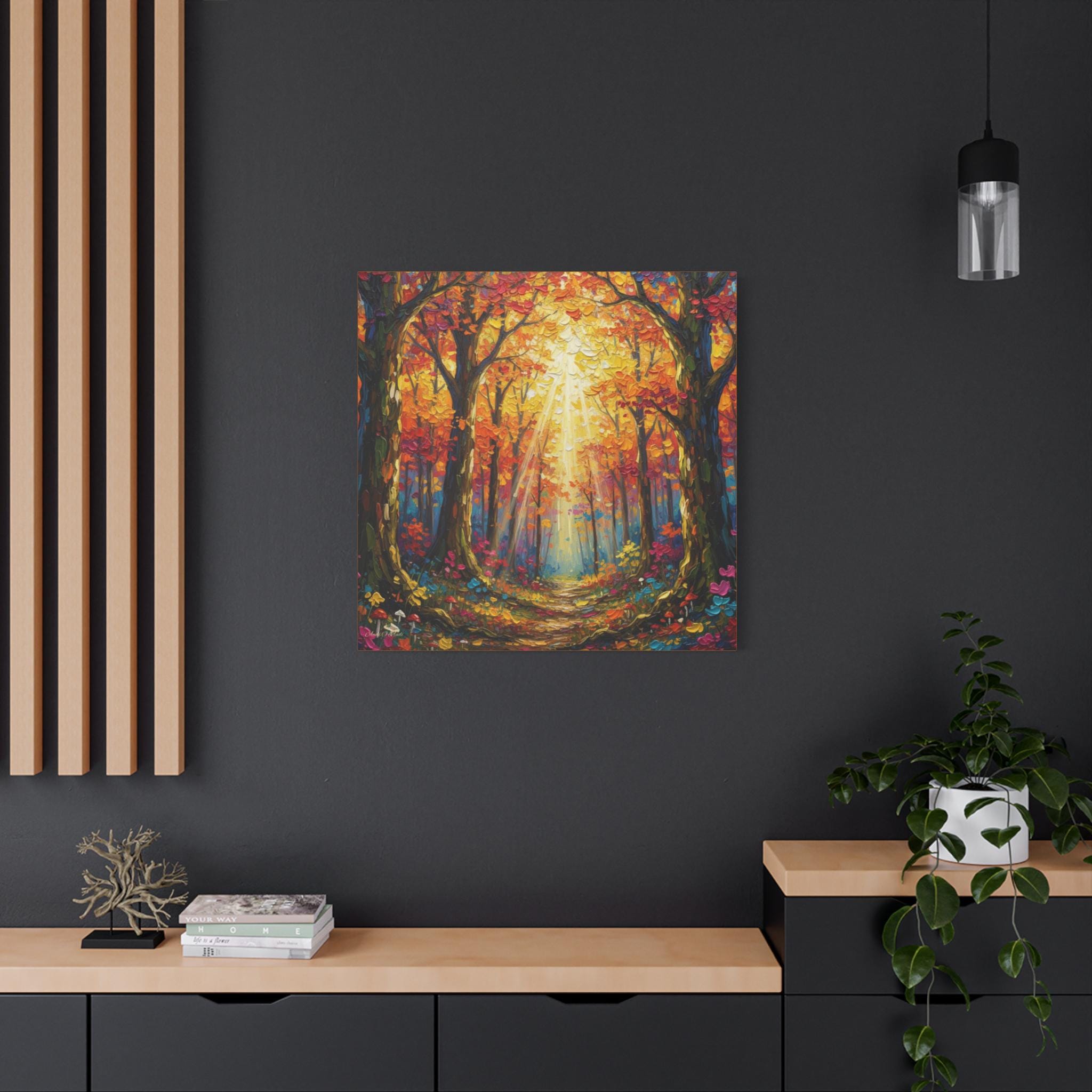Printed on canvas, the piece is well suited for entryways, living rooms, or hospitality spaces seeking warmth and vibrancy. It reads equally well at distance—where the light and structure dominate—and up close, where the thick, knife‑applied textures offer visual interest. The mood is uplifting and restorative, evoking a golden‑hour walk in late autumn.