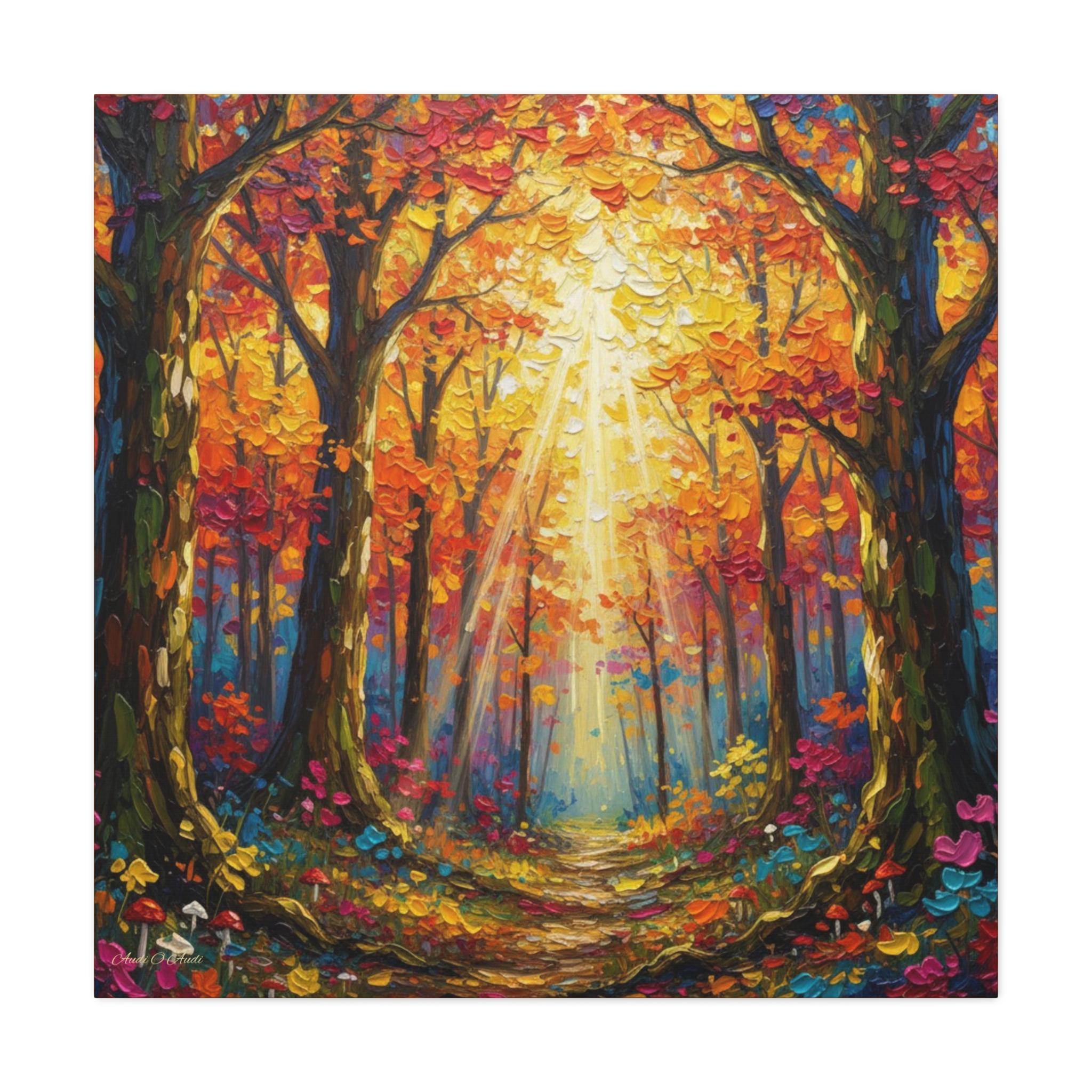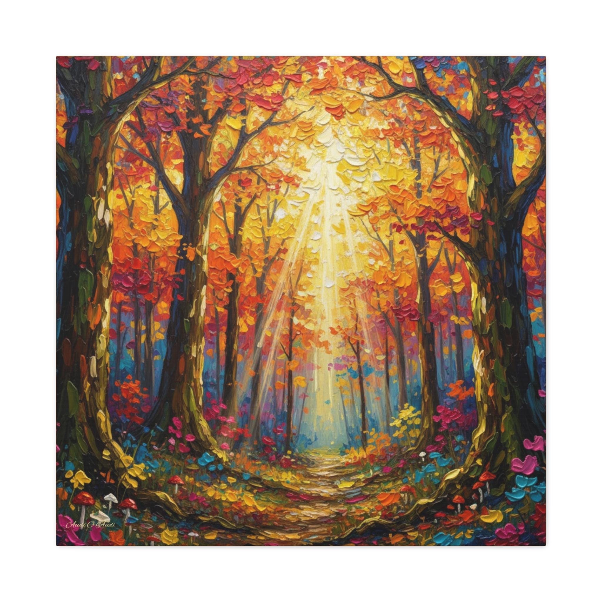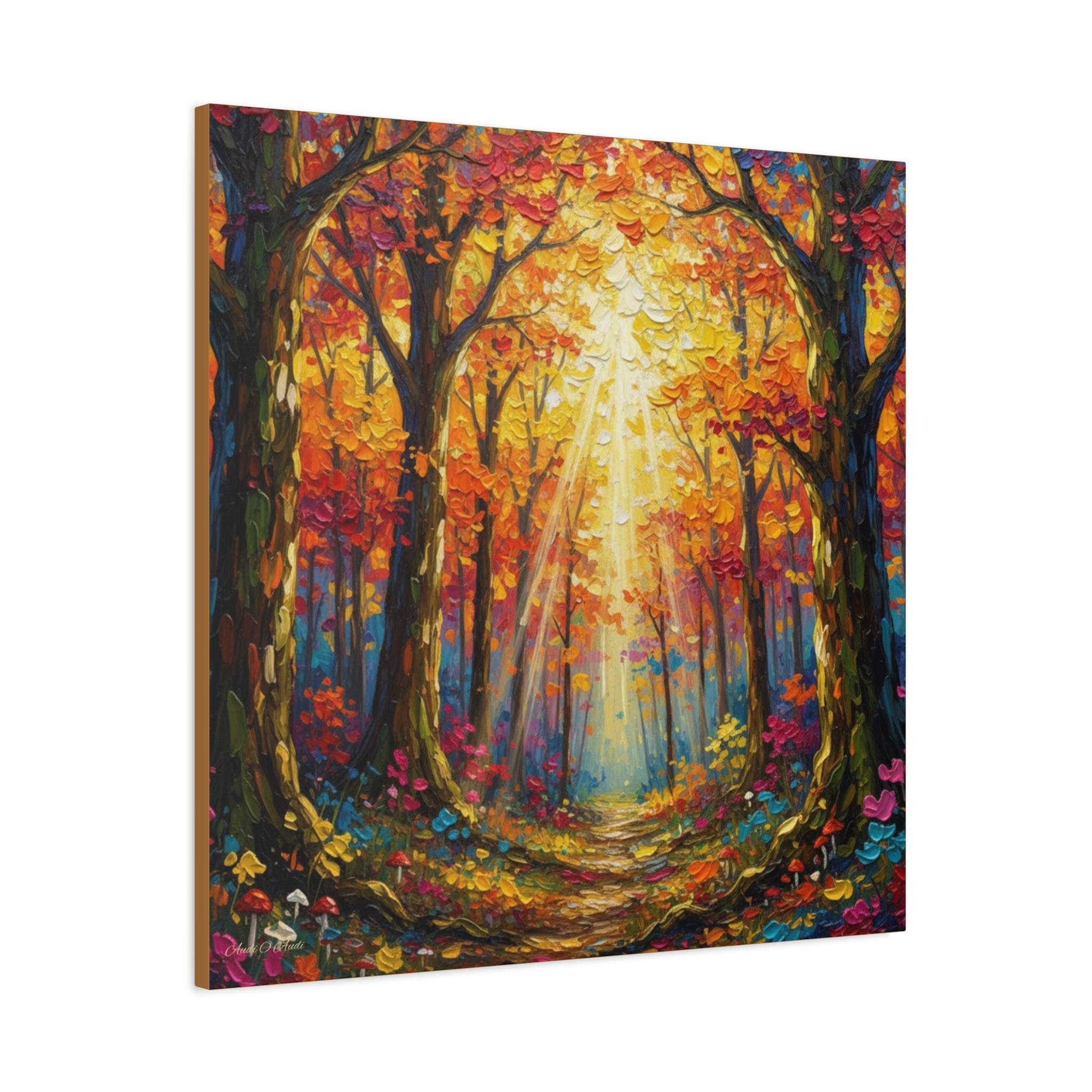 Sunlit Path Through the Autumn Grove, This canvas print presents a luminous woodland scene rendered in a contemporary impressionist style. Broad, palette‑knife strokes build a rich impasto surface, giving the foliage and forest floor a tactile, sculptural quality. A complementary palette of saturated oranges, crimsons, and golds is balanced with cool teal and indigo shadows, creating strong chromatic contrast and depth. Vertical tree trunks frame a subtle central vanishing point, while diagonally cast sunbeams break through the canopy and guide the eye down a meandering path. The composition achieves harmony through symmetrical flanking trees and rhythmic repetition of leaf clusters, yet remains dynamic thanks to varied mark‑making and high‑key highlights.