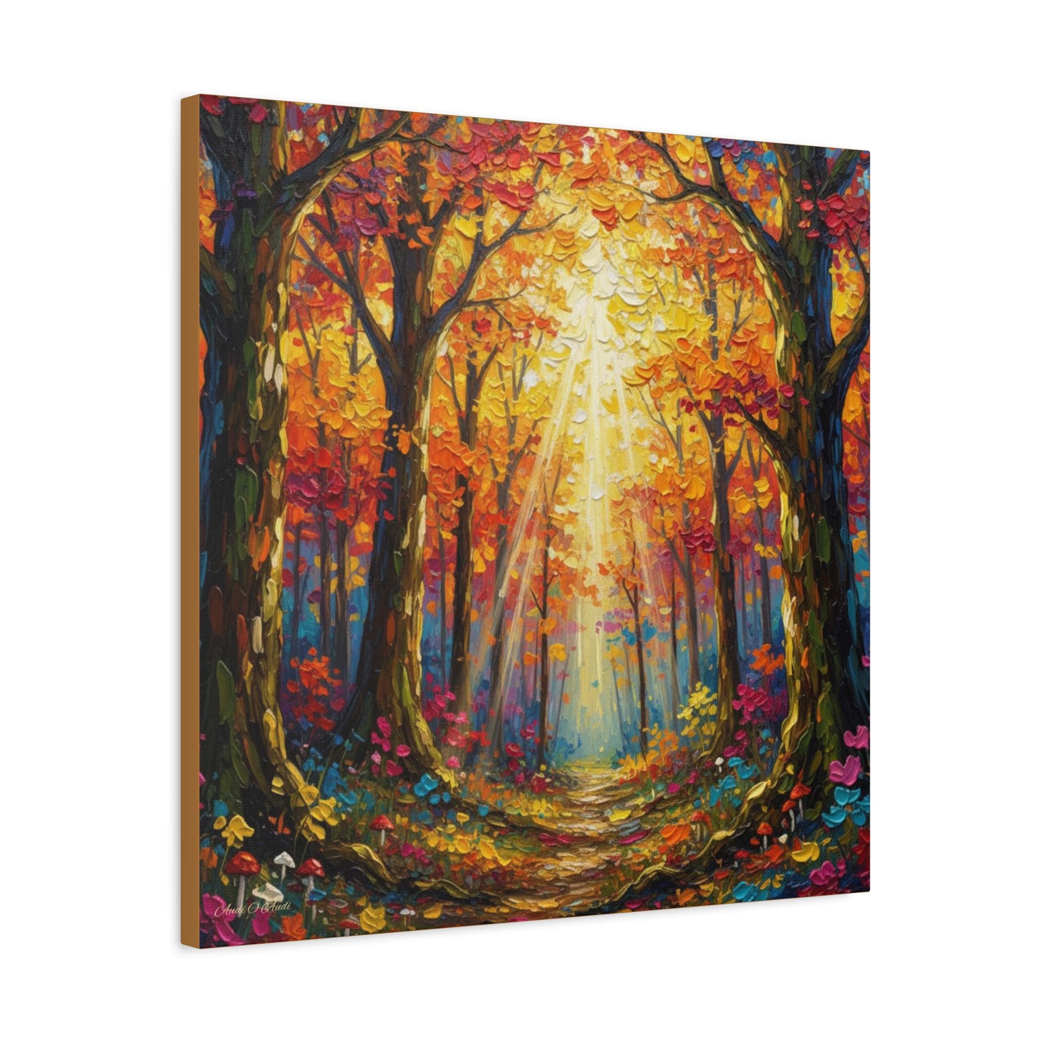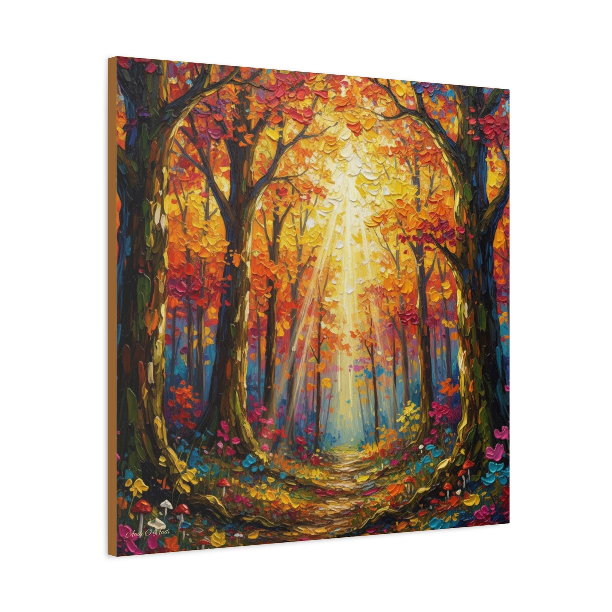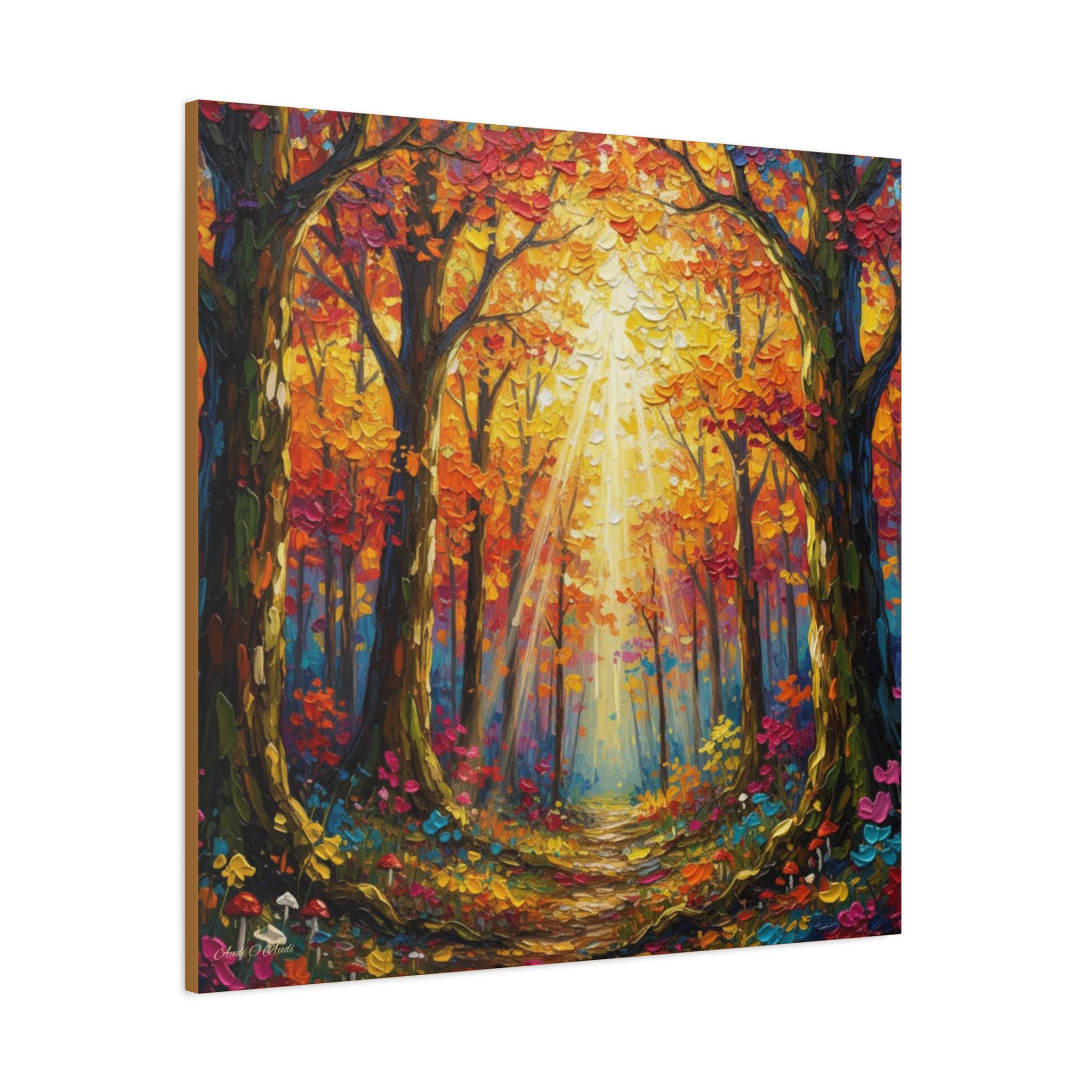 Sunlit Path Through the Autumn Grove, This canvas print presents a luminous woodland scene rendered in a contemporary impressionist style. Broad, palette‑knife strokes build a rich impasto surface, giving the foliage and forest floor a tactile, sculptural quality. A complementary palette of saturated oranges, crimsons, and golds is balanced with cool teal and indigo shadows, creating strong chromatic contrast and depth. Vertical tree trunks frame a subtle central vanishing point, while diagonally cast sunbeams break through the canopy and guide the eye down a meandering path. The composition achieves harmony through symmetrical flanking trees and rhythmic repetition of leaf clusters, yet remains dynamic thanks to varied mark‑making and high‑key highlights.