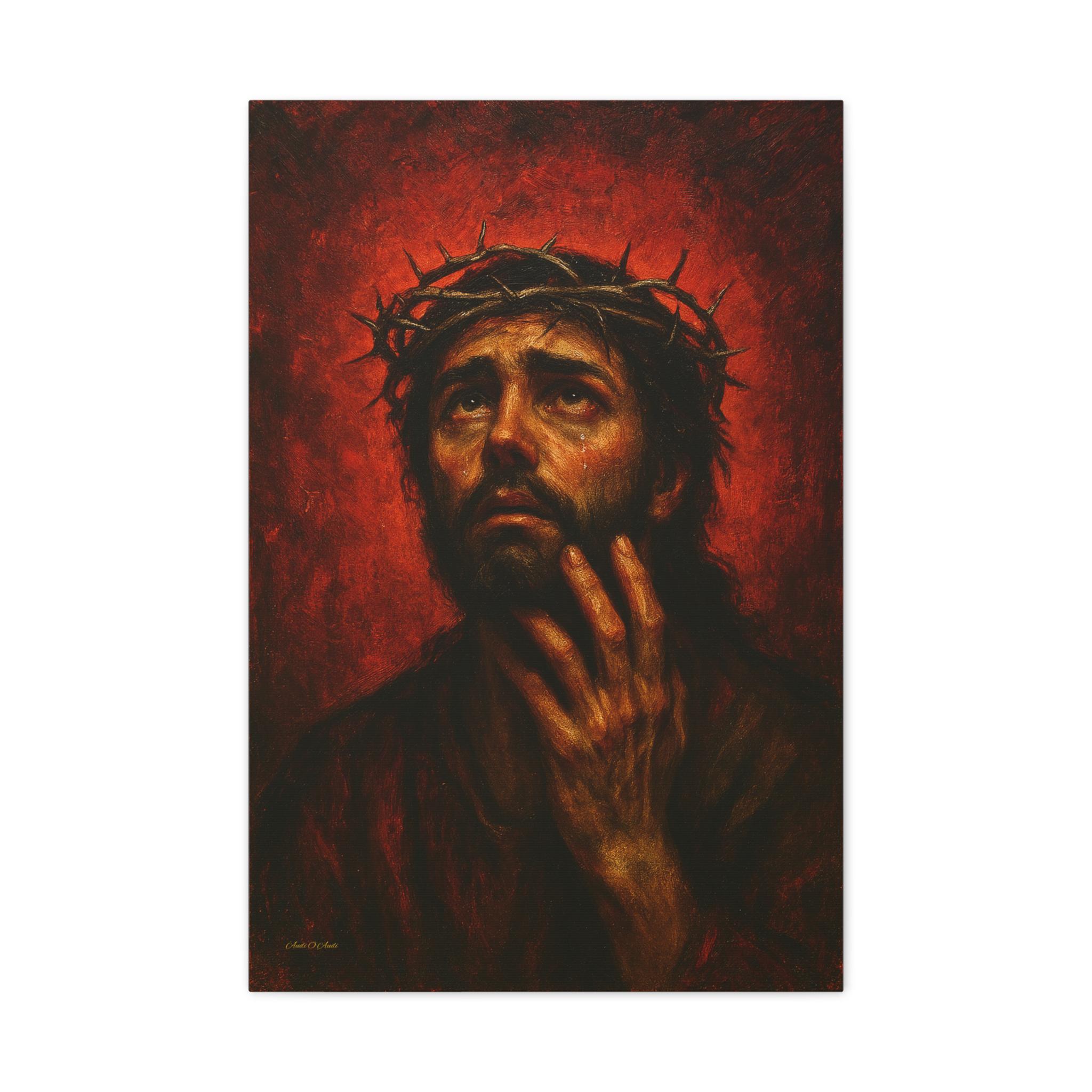 Agony, The Crimson Prayer. This canvas print is a profoundly moving, close-up religious portrait executed in a style reminiscent of Baroque or Renaissance mastery, focusing intensely on human suffering and emotion.