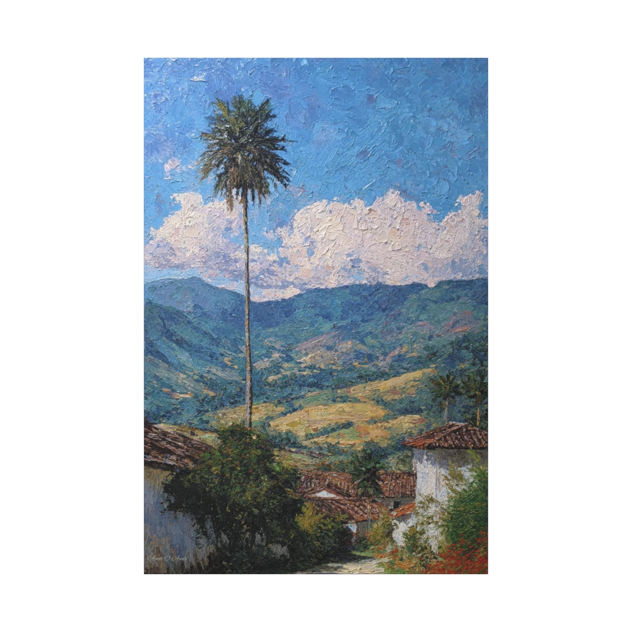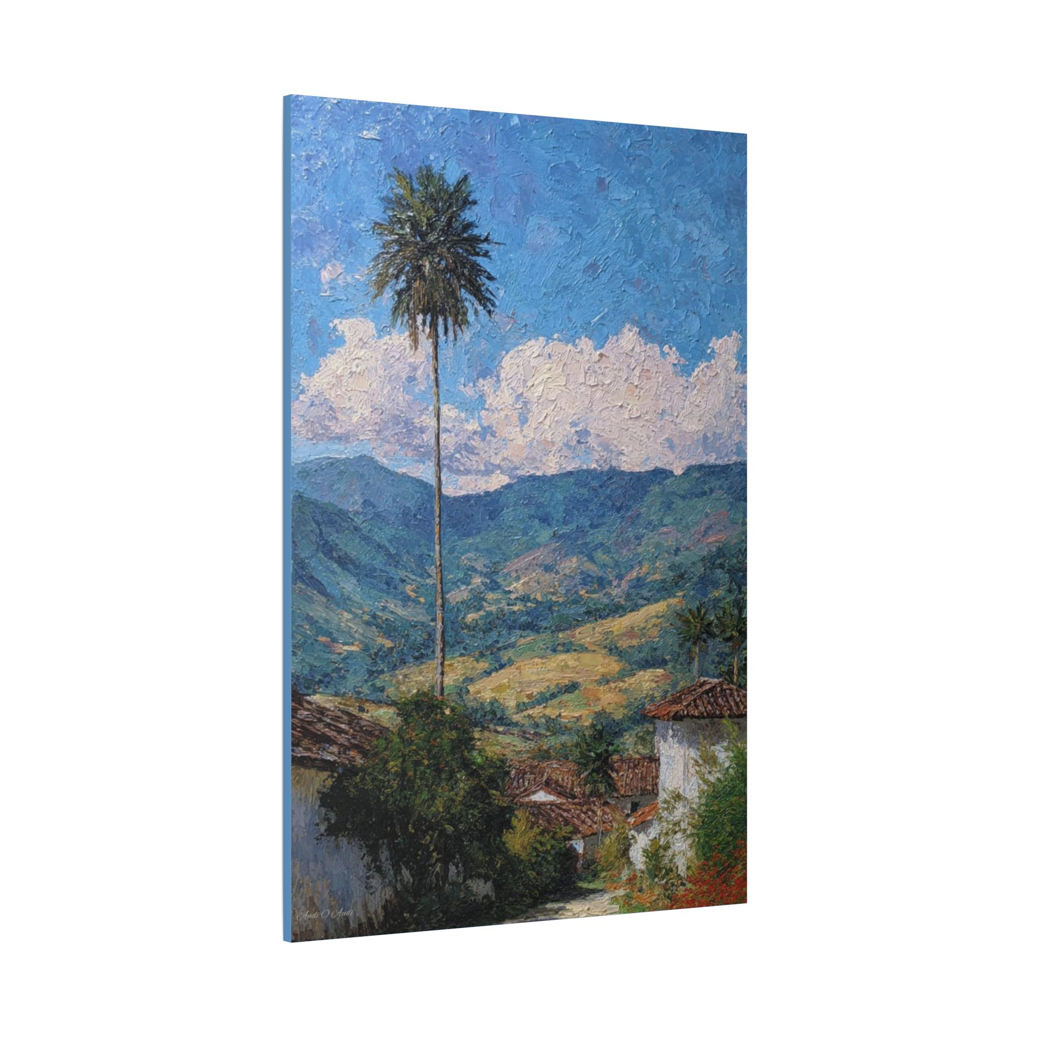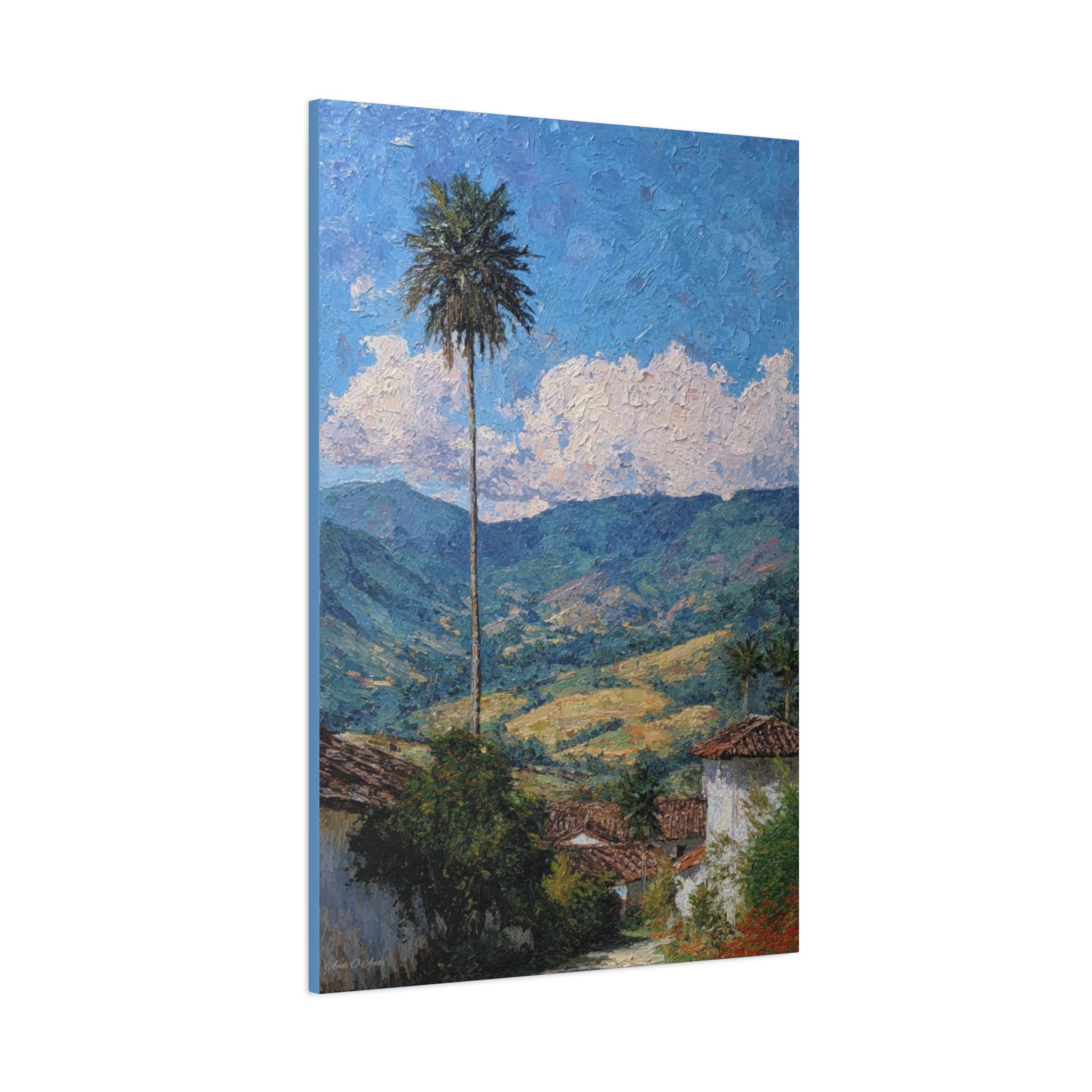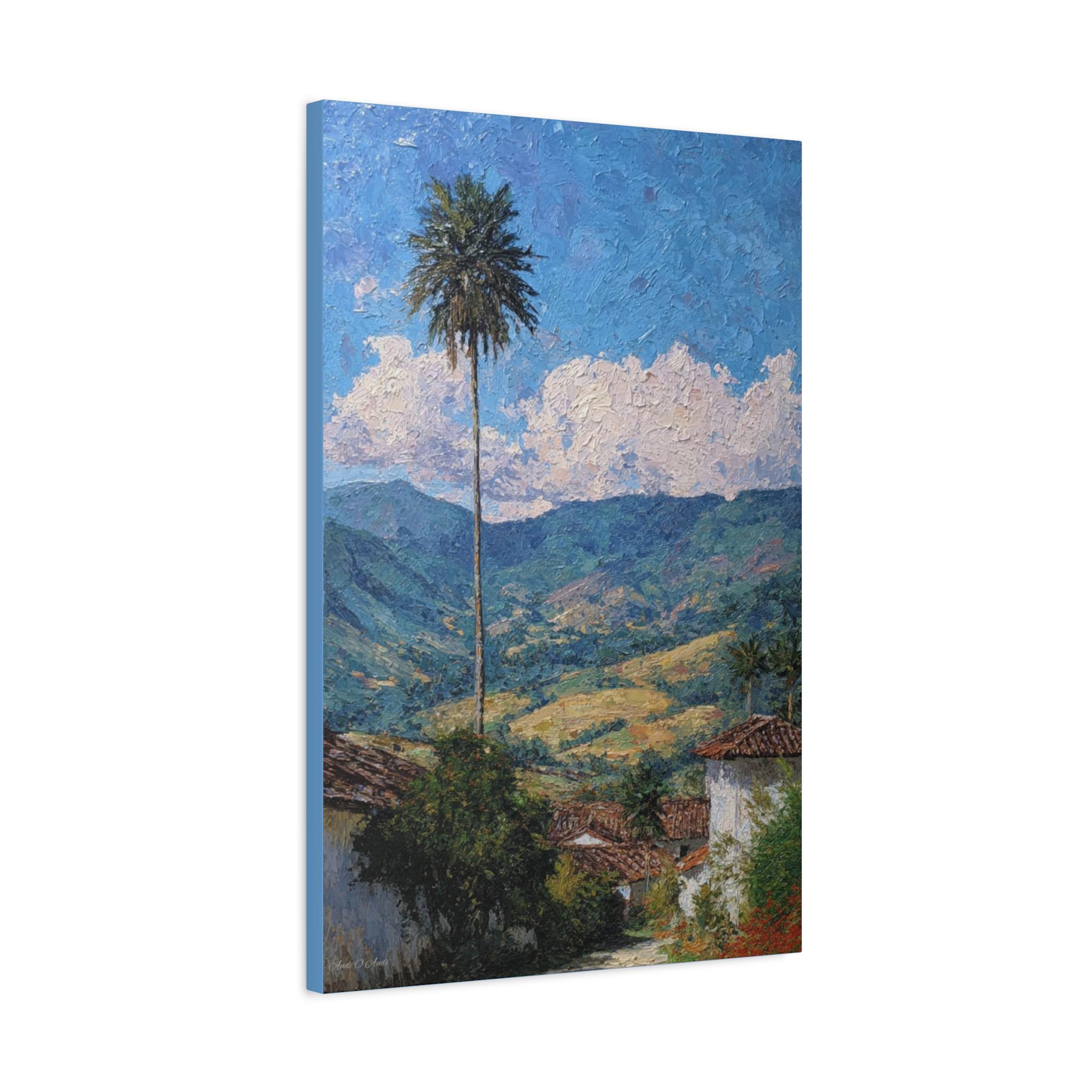 The composition is anchored by a single, strikingly tall Quindío wax palm, which acts as a vertical sentinel, connecting the scene to the vibrant blue, cloud-strewn sky. The sky and clouds are painted with thick, deliberate strokes, creating a captivating sense of texture that contrasts with the softer, overlapping brushwork defining the mountains.