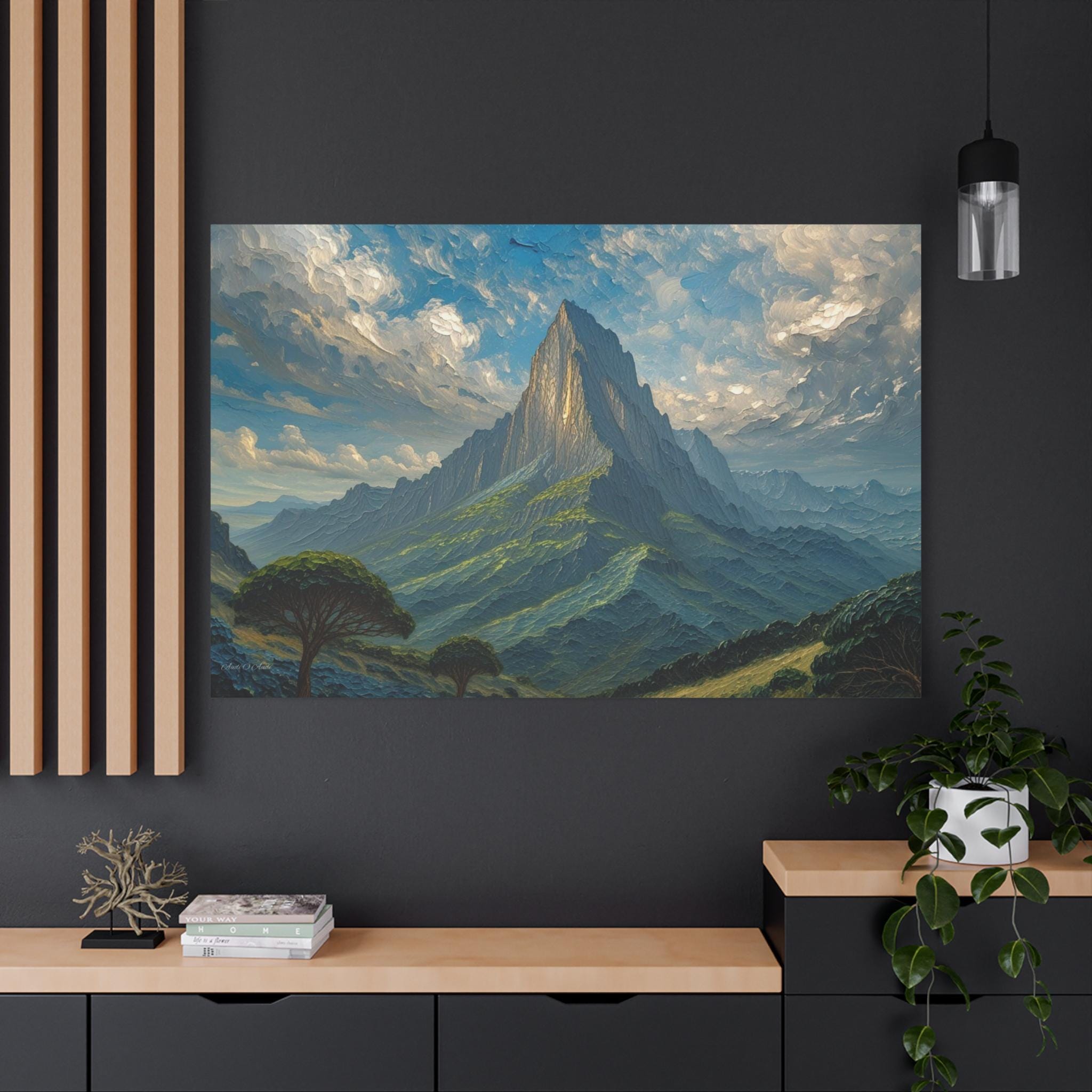 Witness the dramatic majesty of nature with Apotheosis Peak, a grand horizontal canvas print that embodies the sublime power of the mountain. Executed in a powerful, hyper-textured impasto style, the entire canvas is a sculpted field of layered color and relief, giving the landscape a stunning three-dimensional quality.