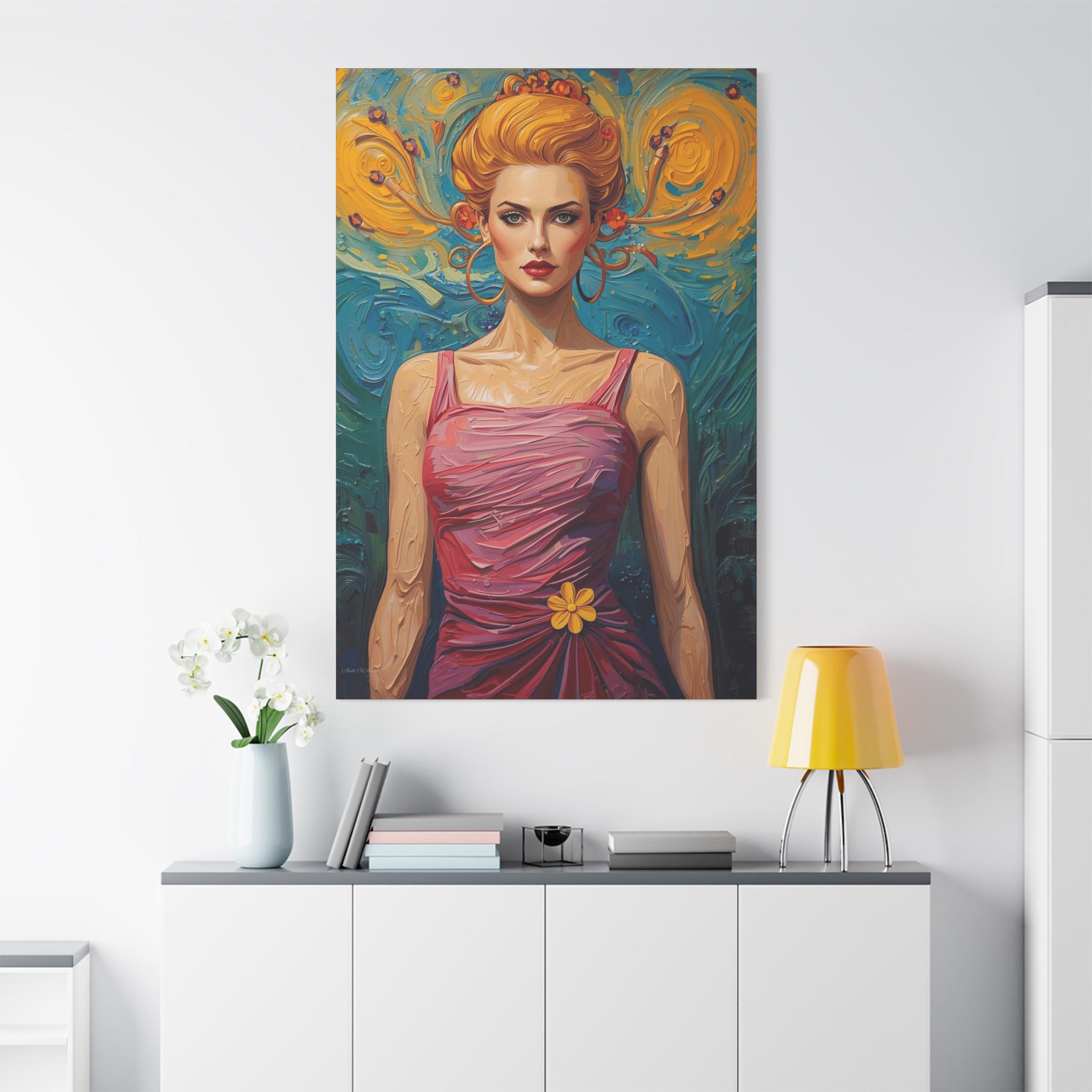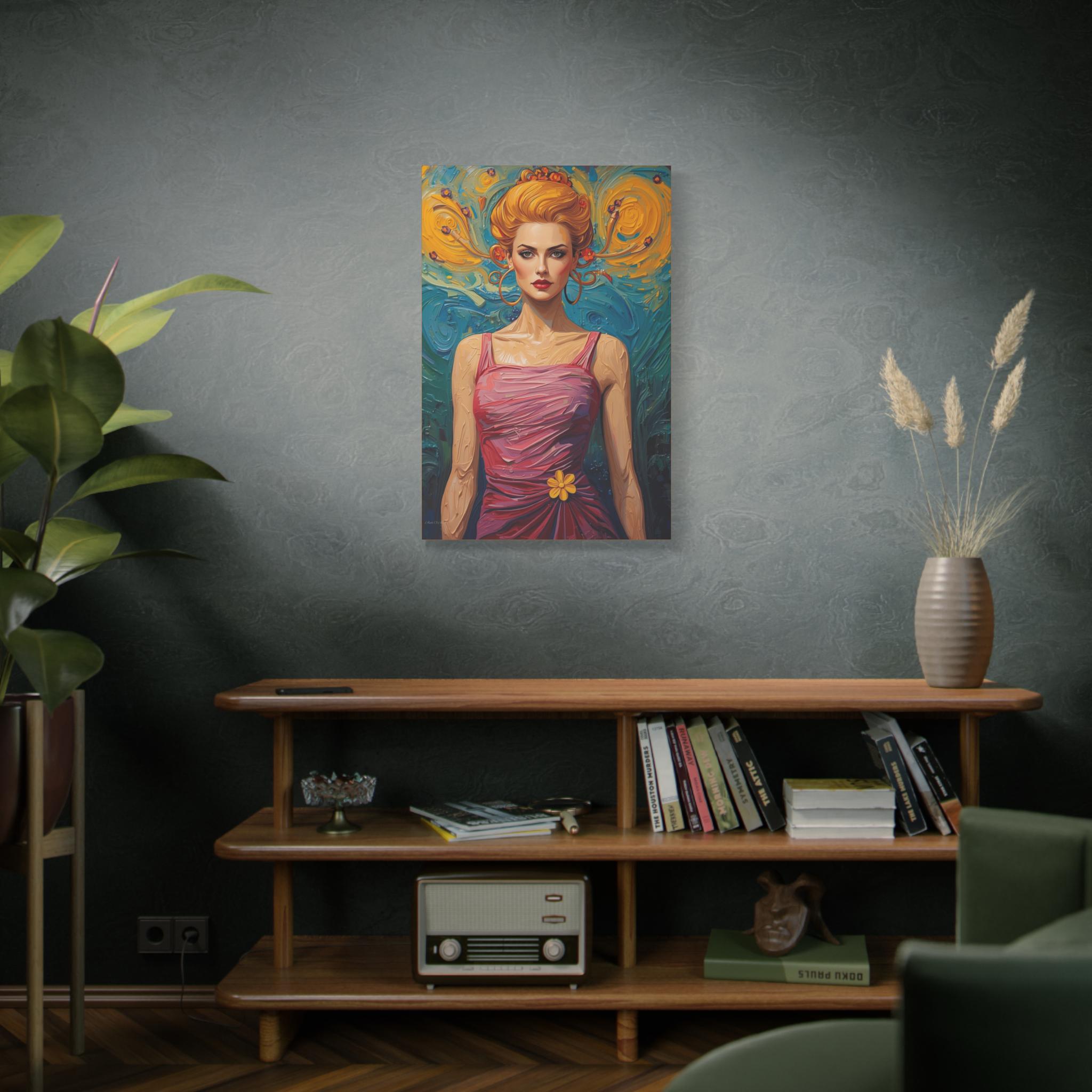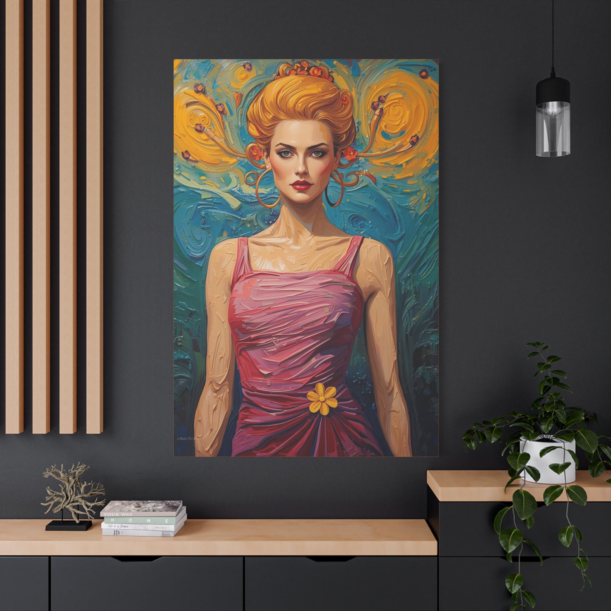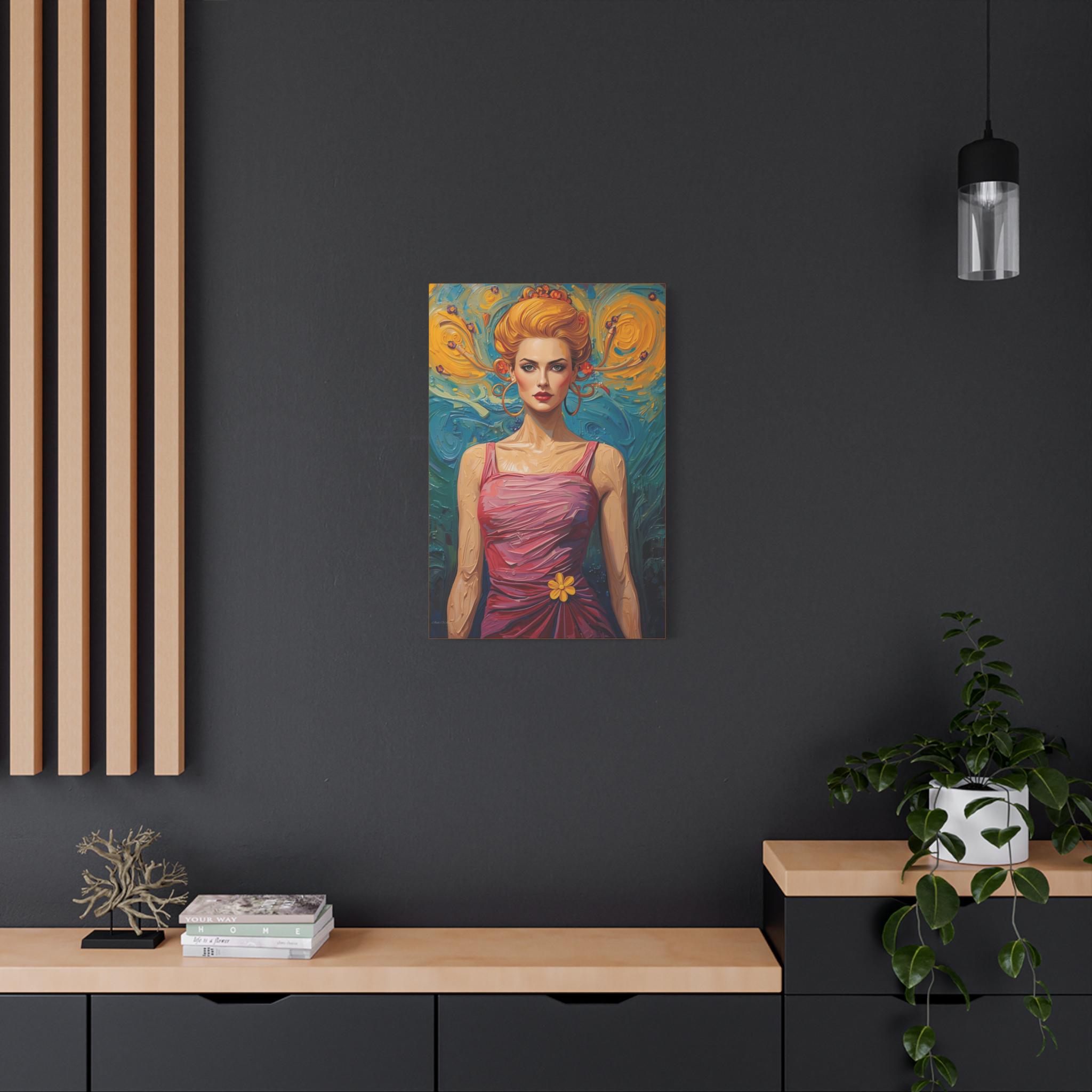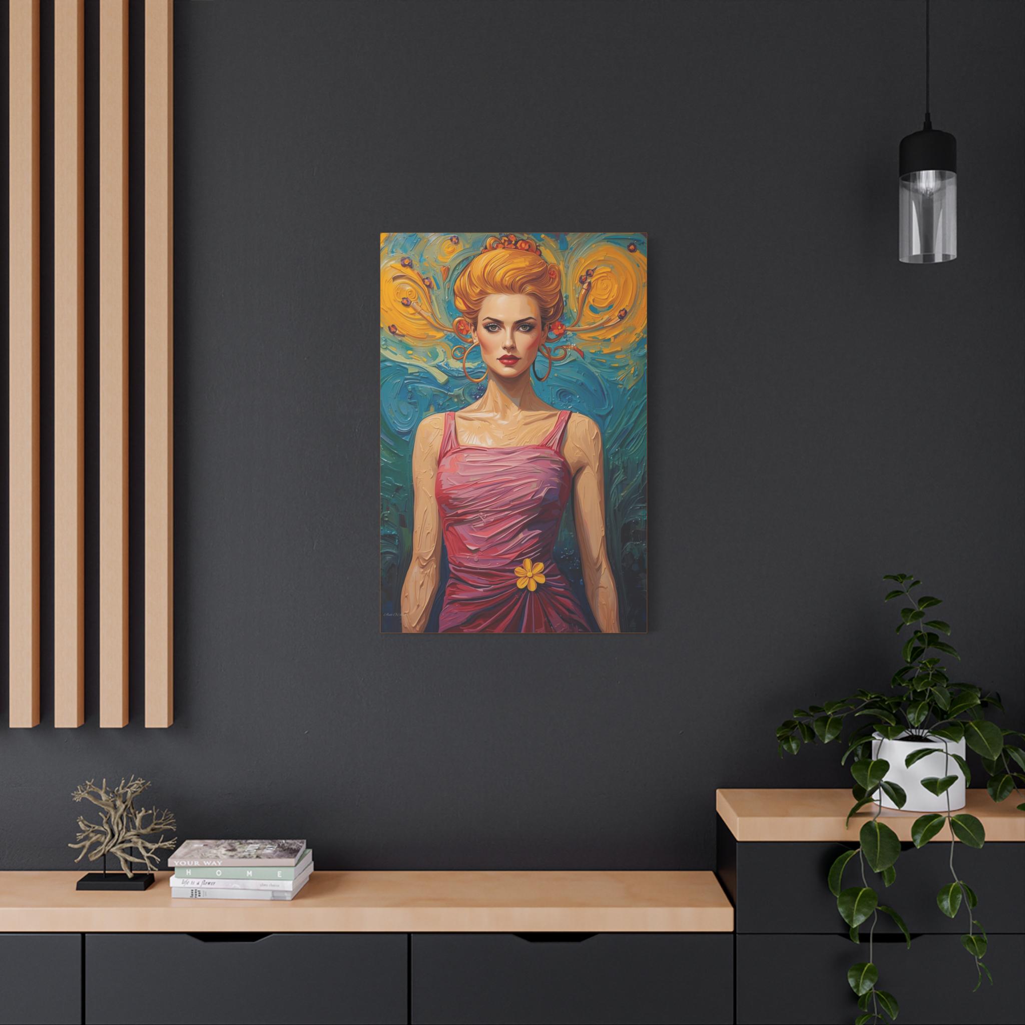 Illuminate your walls with the vibrant energy of Fiori d'Oro, a bold vertical portrait canvas print executed in a captivating expressionist style. This artwork is a striking study in contrasts, featuring a finely rendered, classically beautiful woman set against an explosively textured, impasto background.