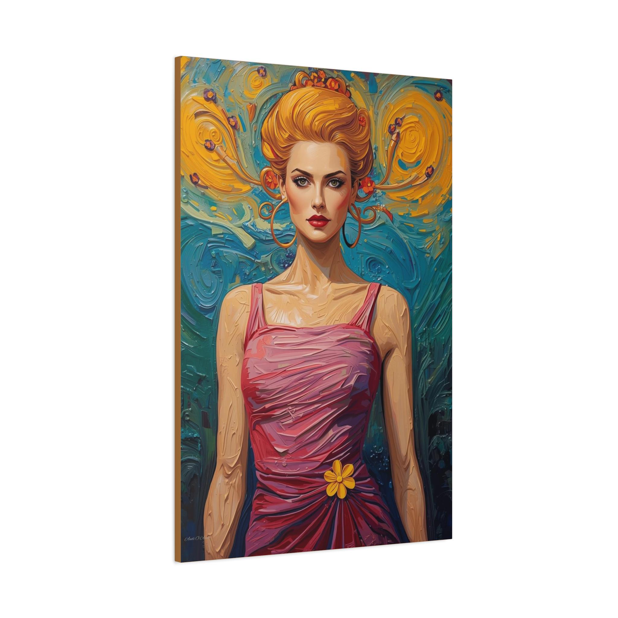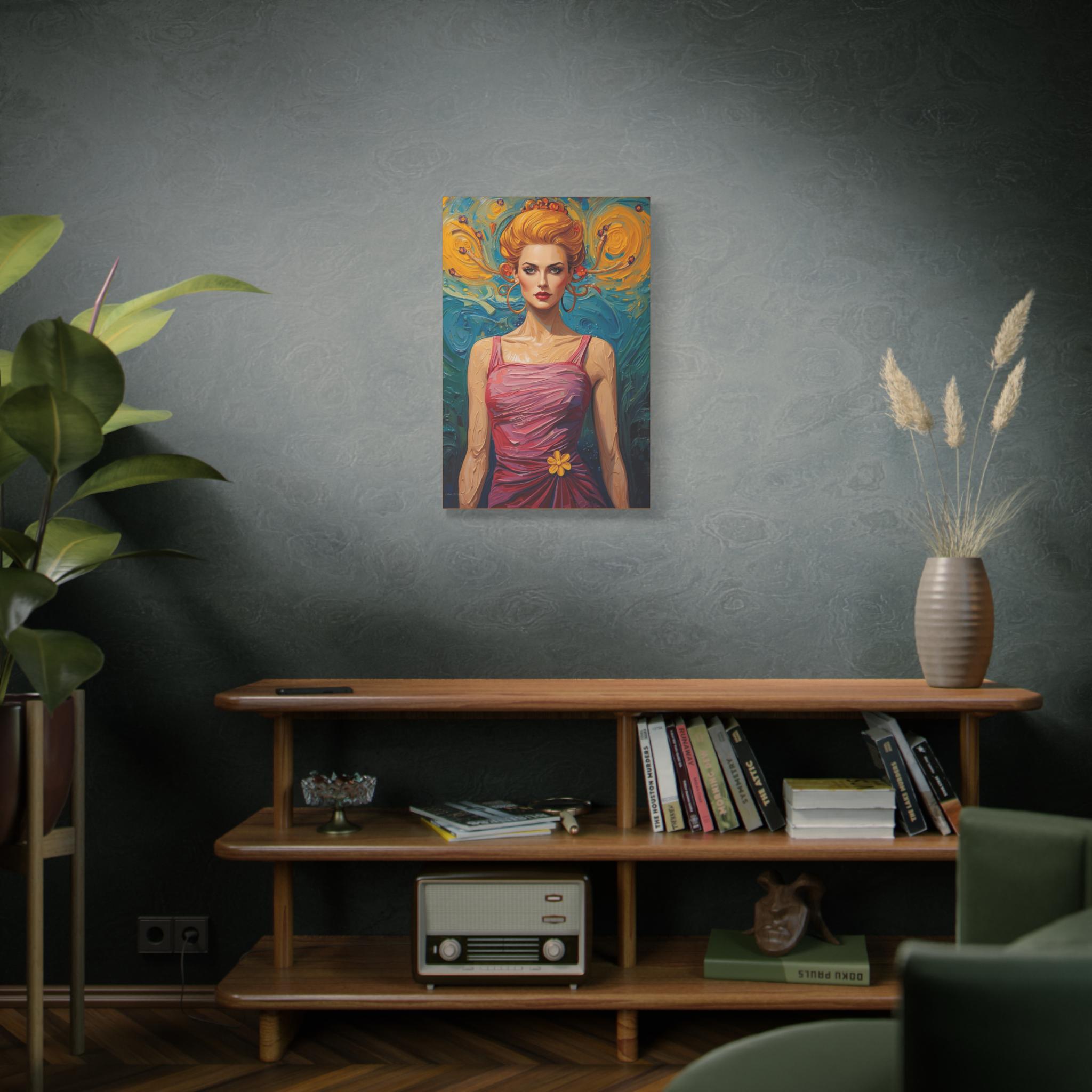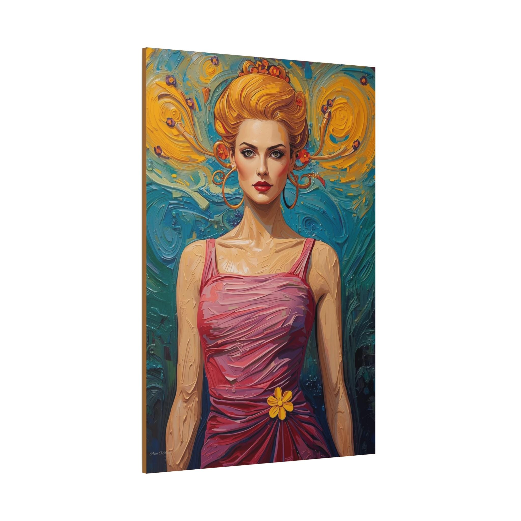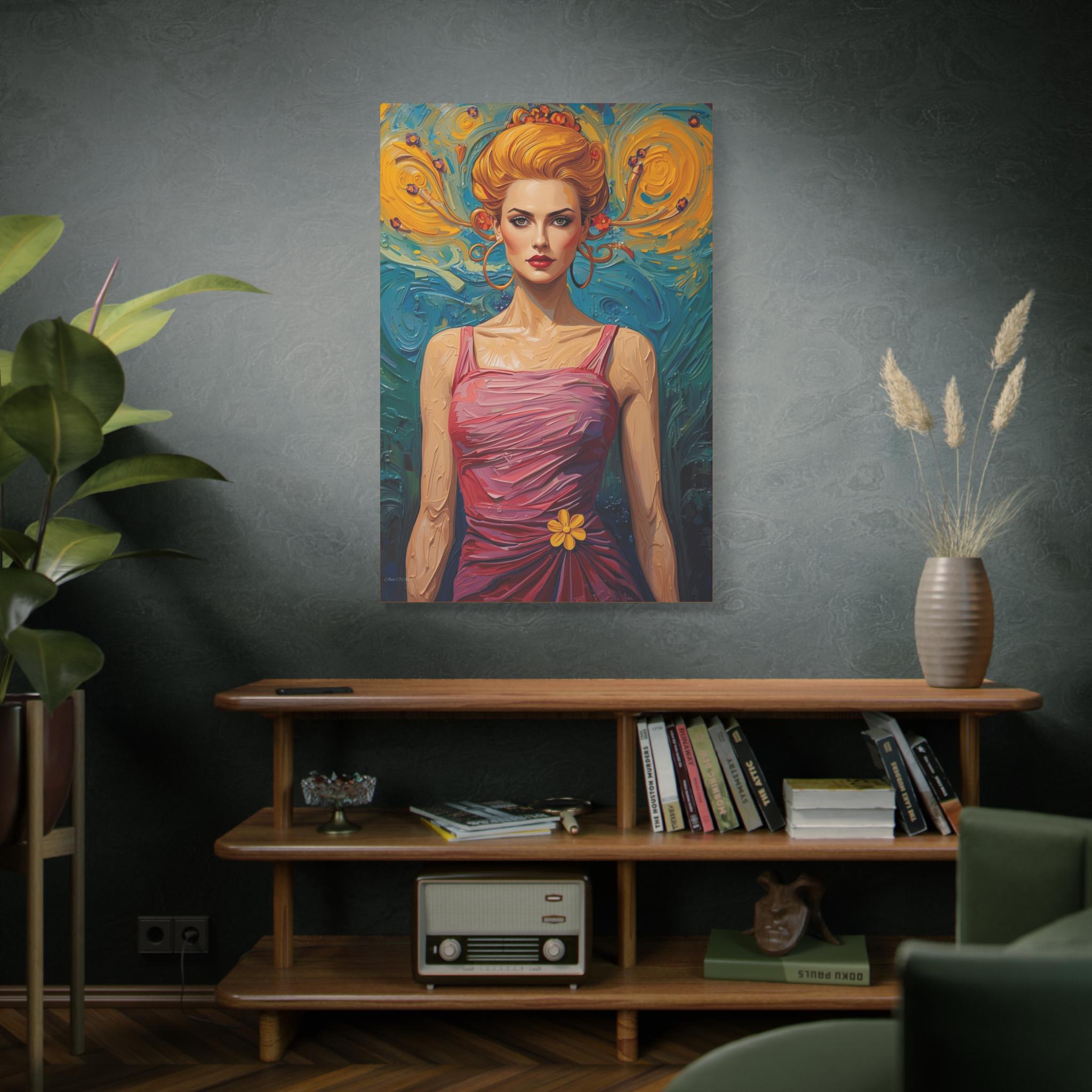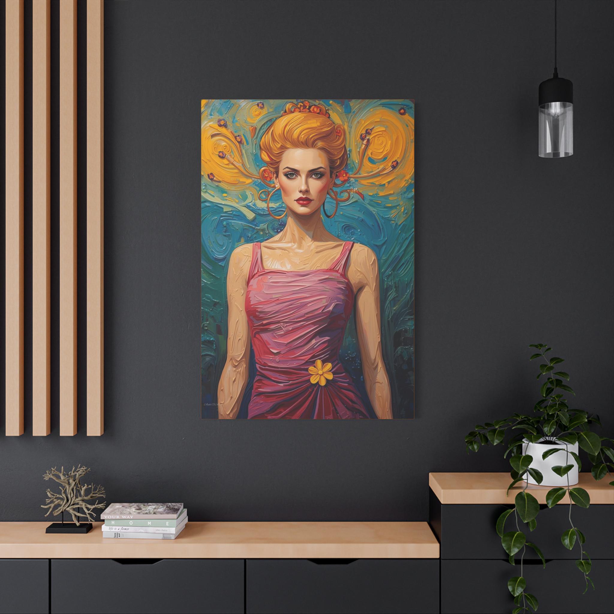 Illuminate your walls with the vibrant energy of Fiori d'Oro, a bold vertical portrait canvas print executed in a captivating expressionist style. This artwork is a striking study in contrasts, featuring a finely rendered, classically beautiful woman set against an explosively textured, impasto background.