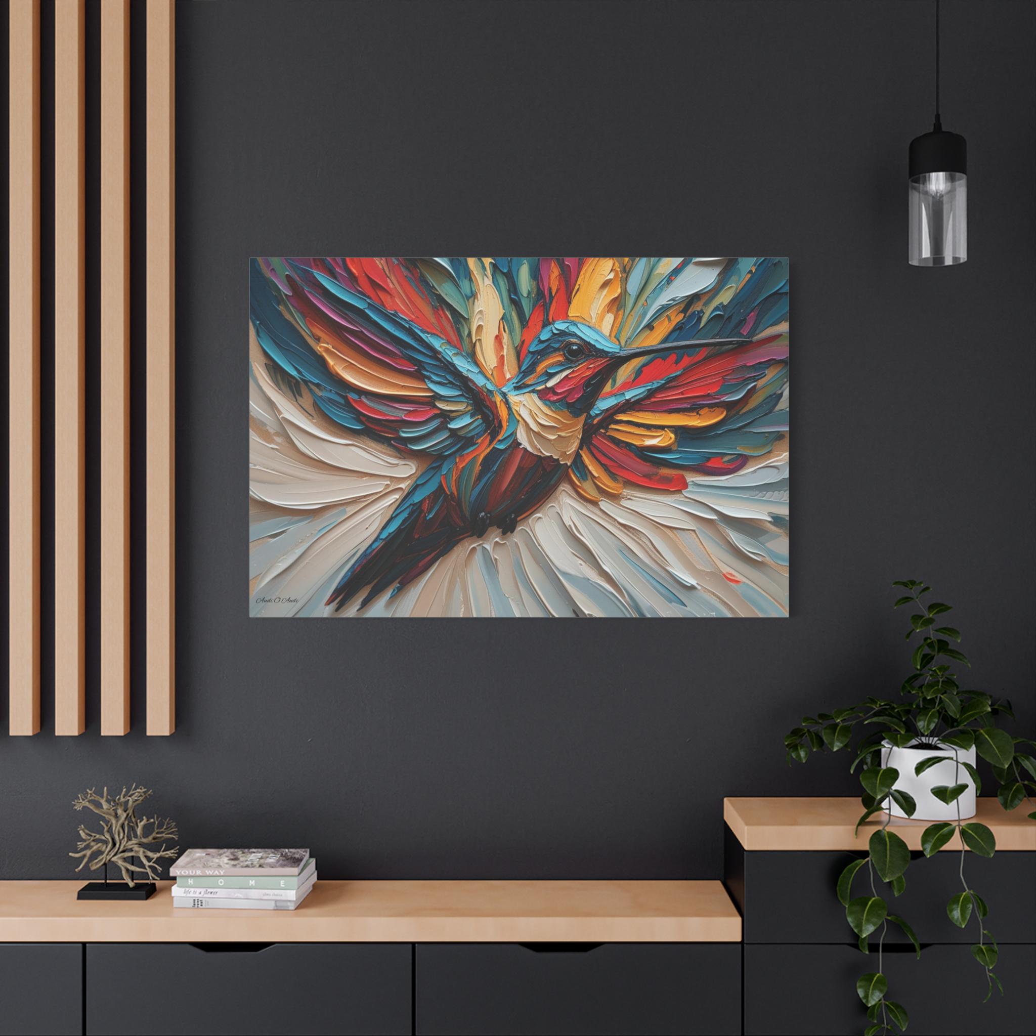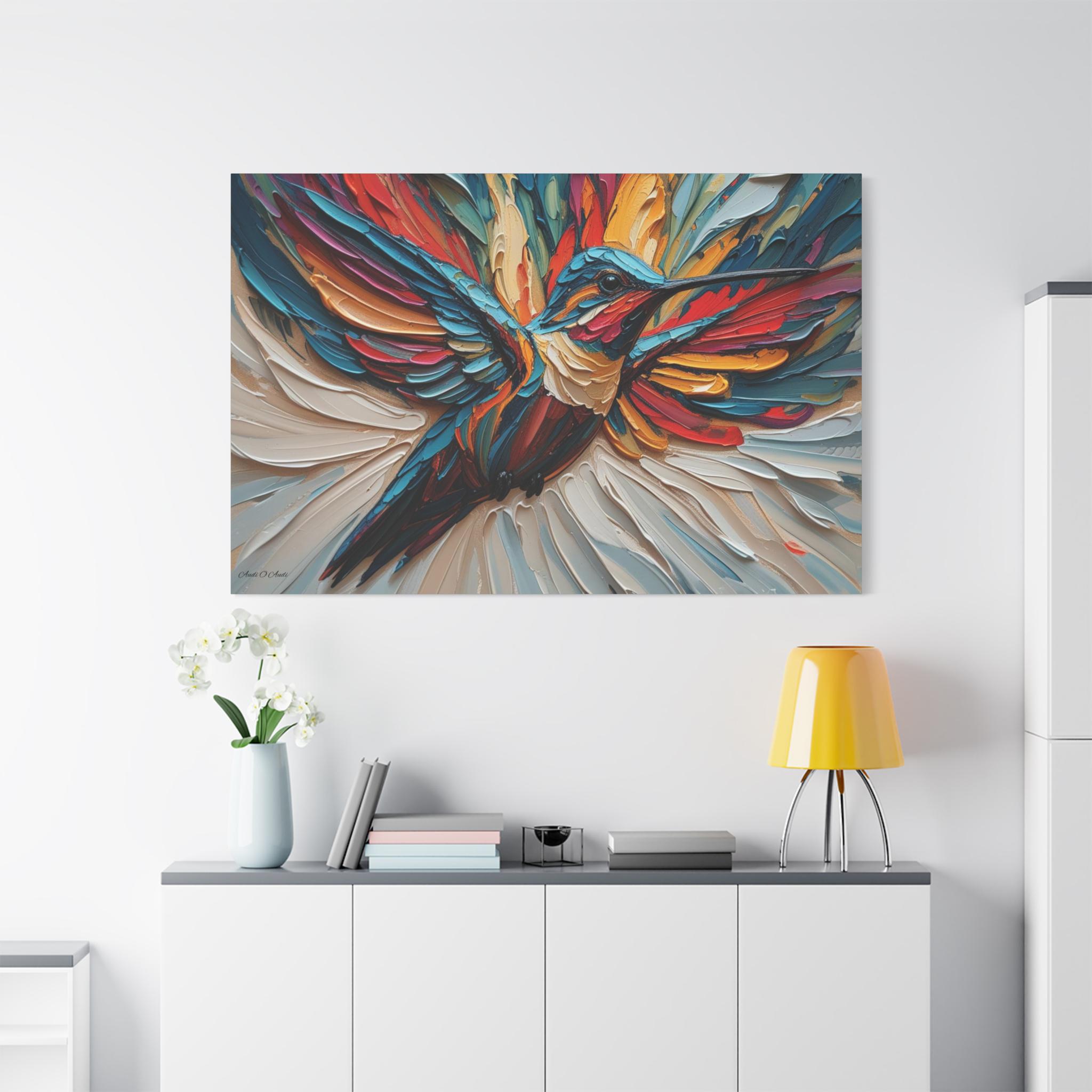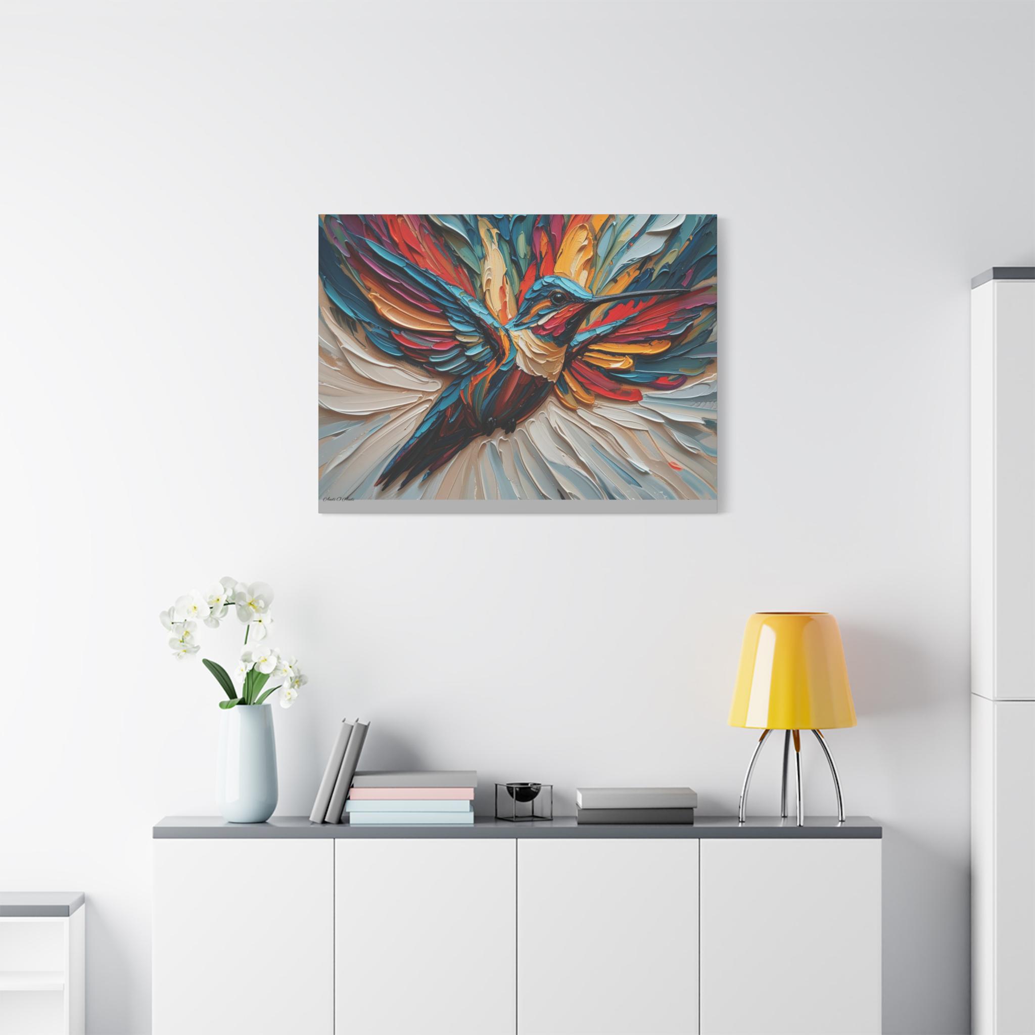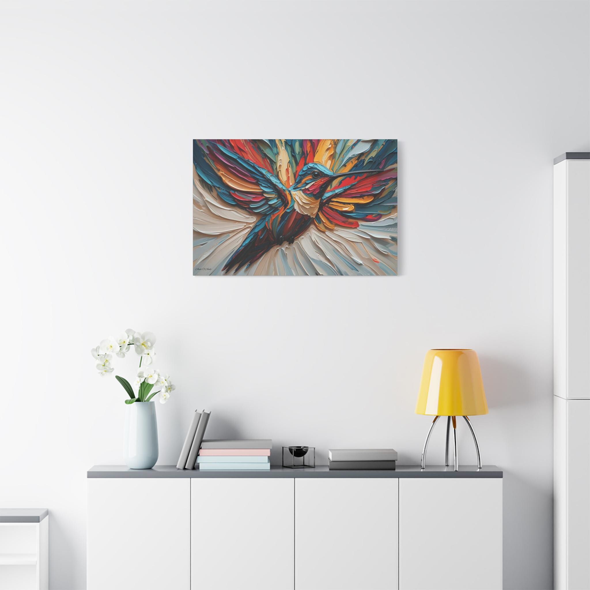 Chromatic Ascent, Colorful Hummingbird Painting Matte Canvas Print, Bird Wal Art, Abstract Bird Art, Vibrant Canvas.