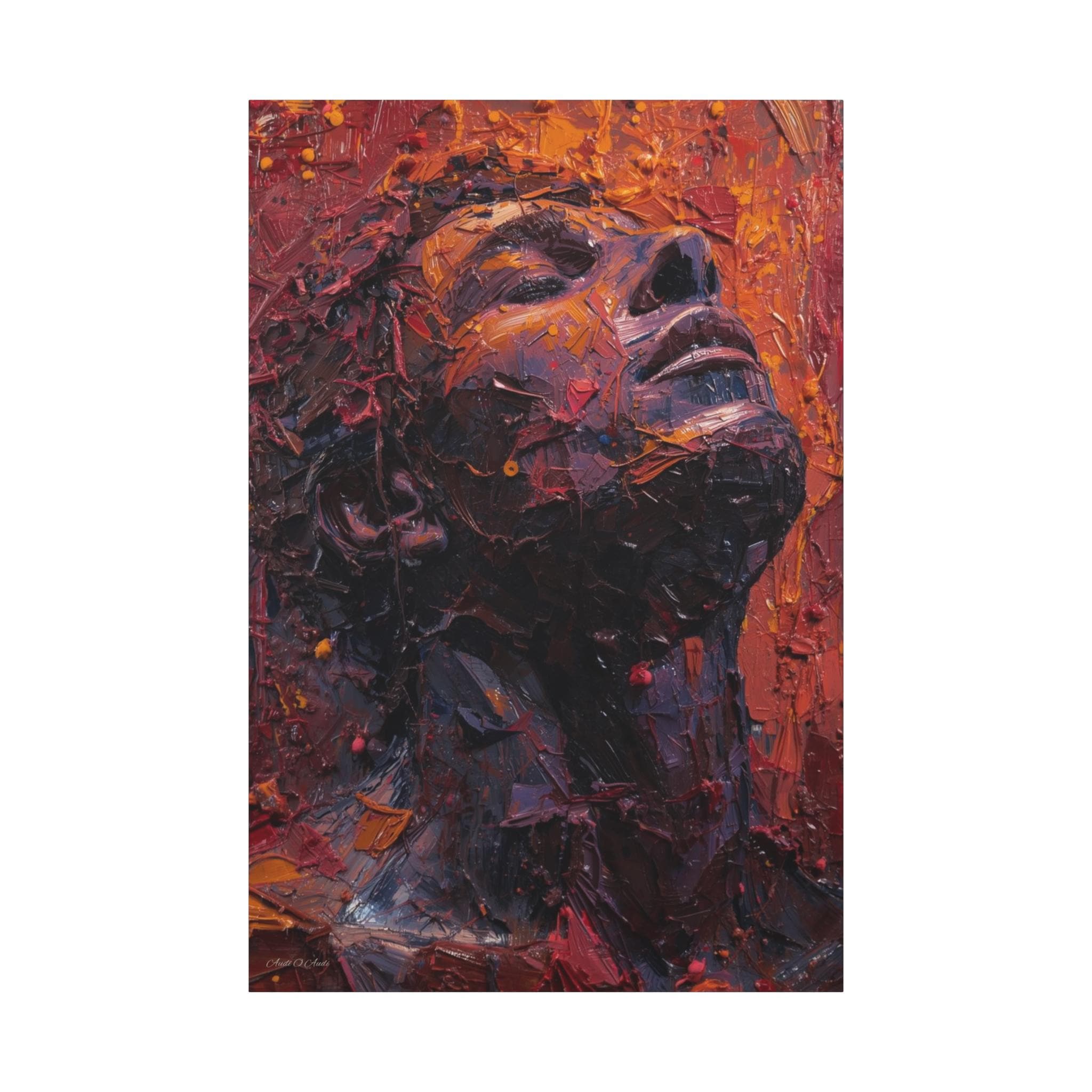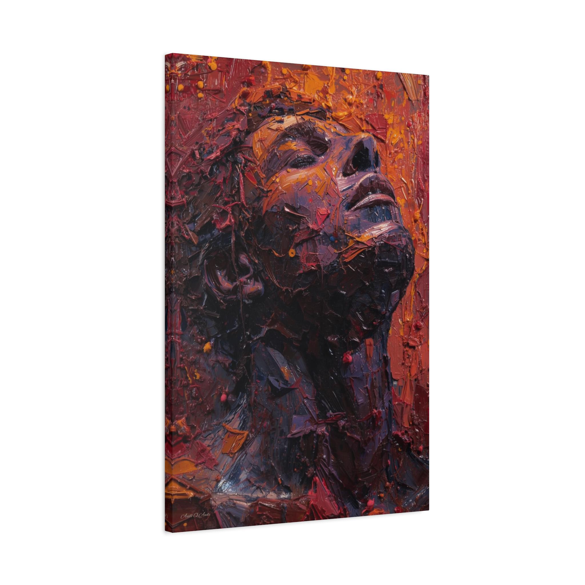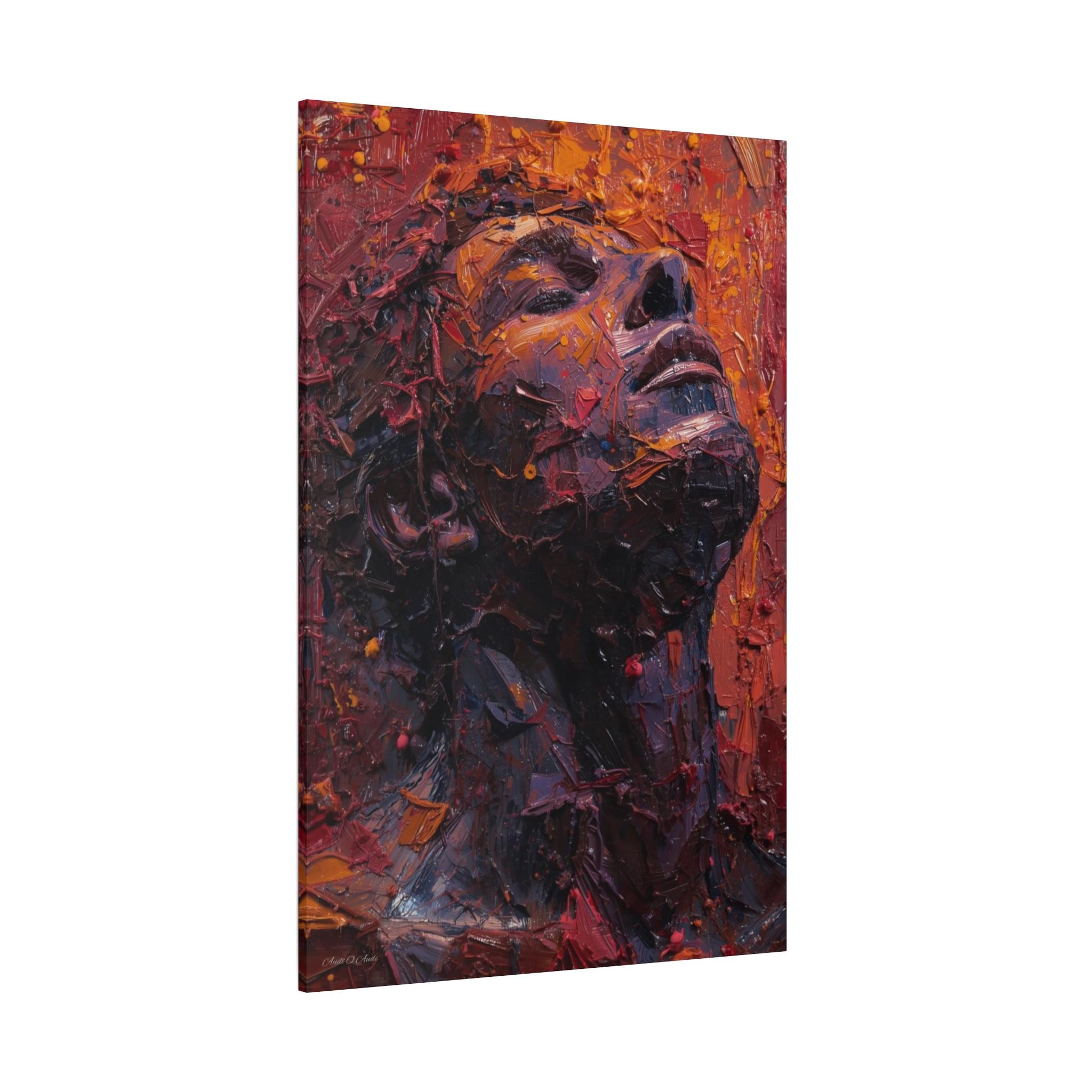 This Canvas Print is a deeply moving and highly textural portrait captures a figure with their head tilted dramatically skyward, eyes closed in an attitude of ecstasy, agony, or profound contemplation. The artwork is defined by its extreme, three-dimensional Impasto technique, where paint is not merely applied, but sculpted into the contours of the face and neck, creating a literal relief map of emotion.