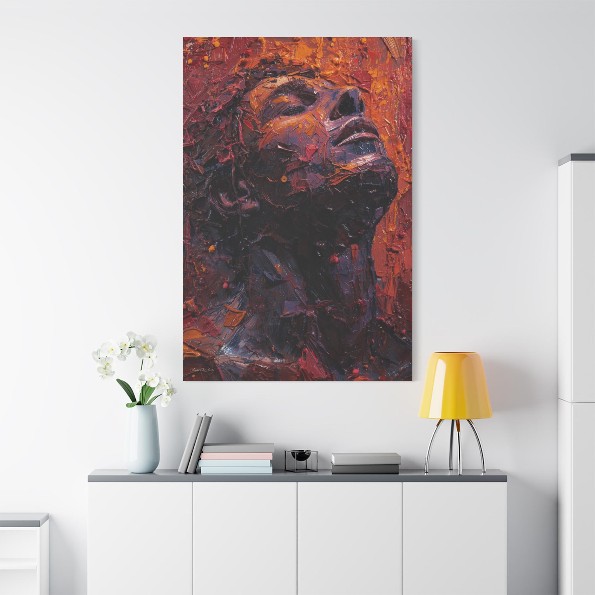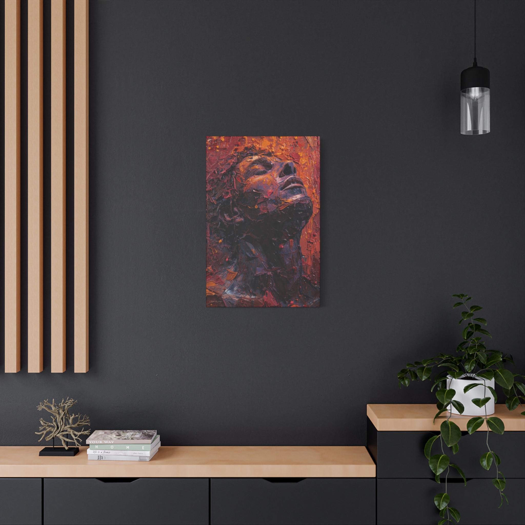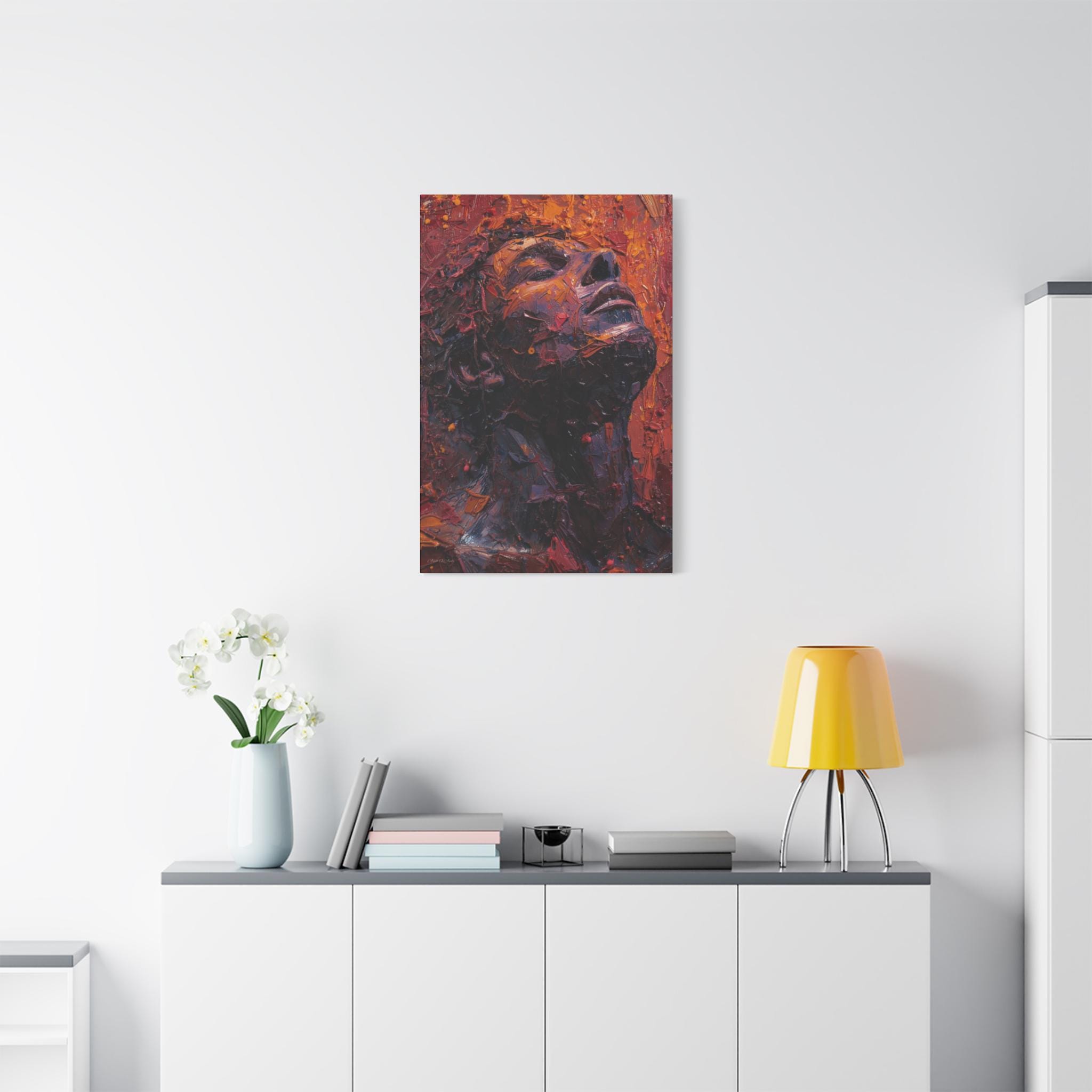 Place it above a bedside table, in a cozy reading nook, or in a minimalist entryway to anchor the room with depth and warmth. The portrait’s upward gaze and rich palette create a sense of resilience and calm — a daily reminder to breathe and rise through whatever you’re carrying. For collectors who love tactile, expressive art, this canvas translates studio energy into a home-ready format that hangs easily and holds its presence.