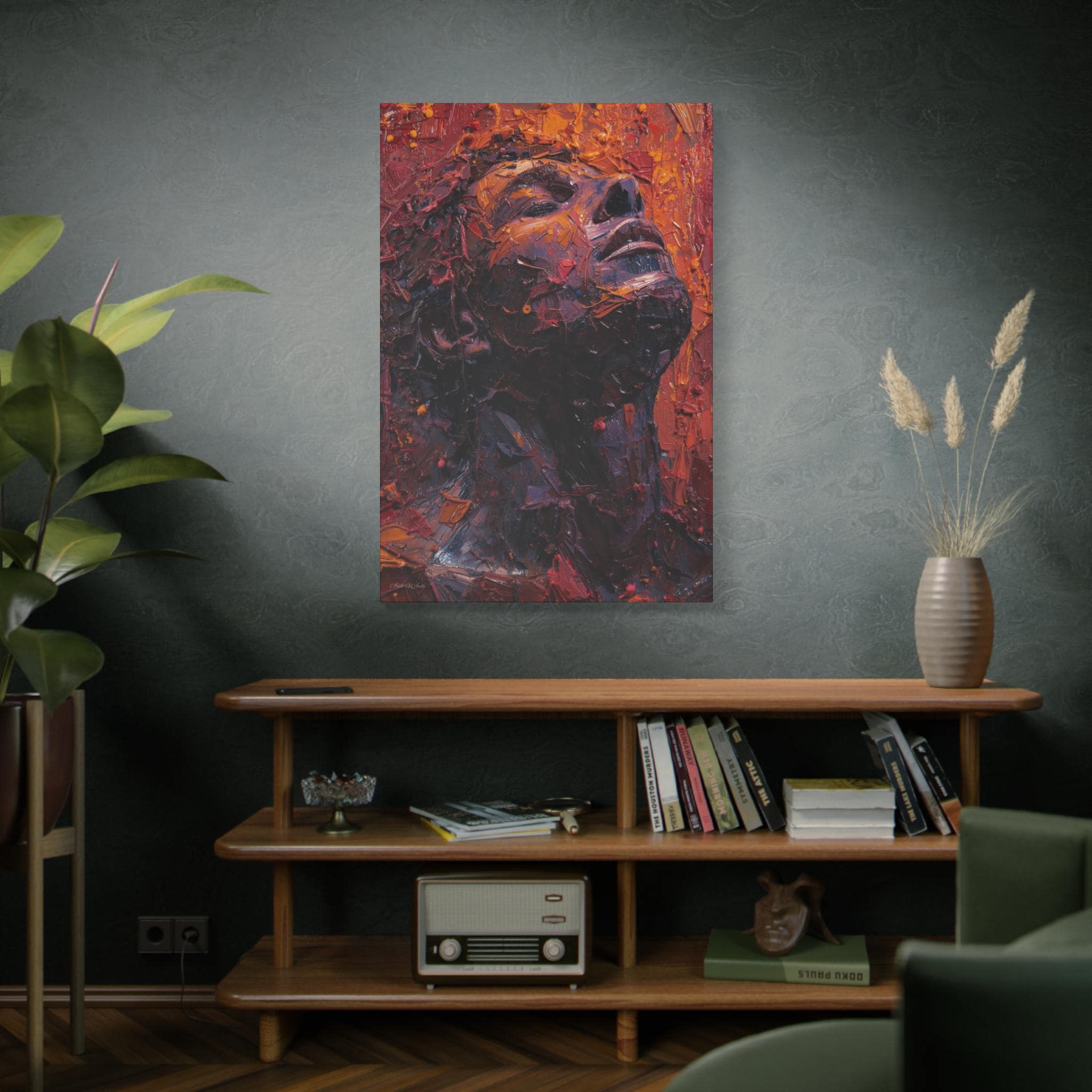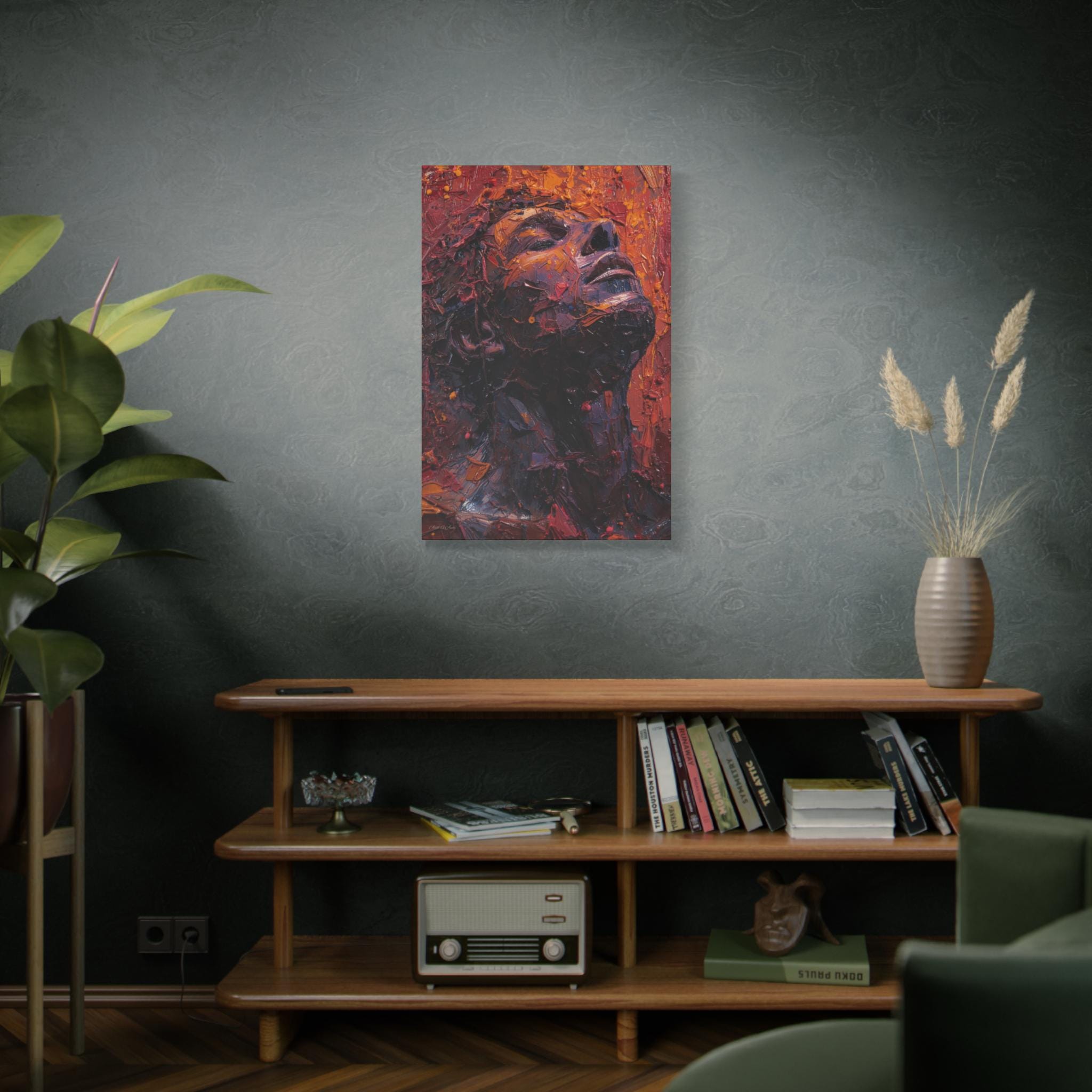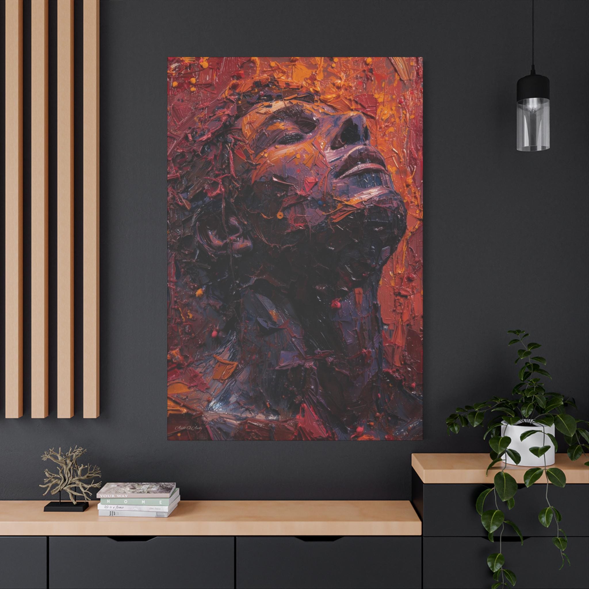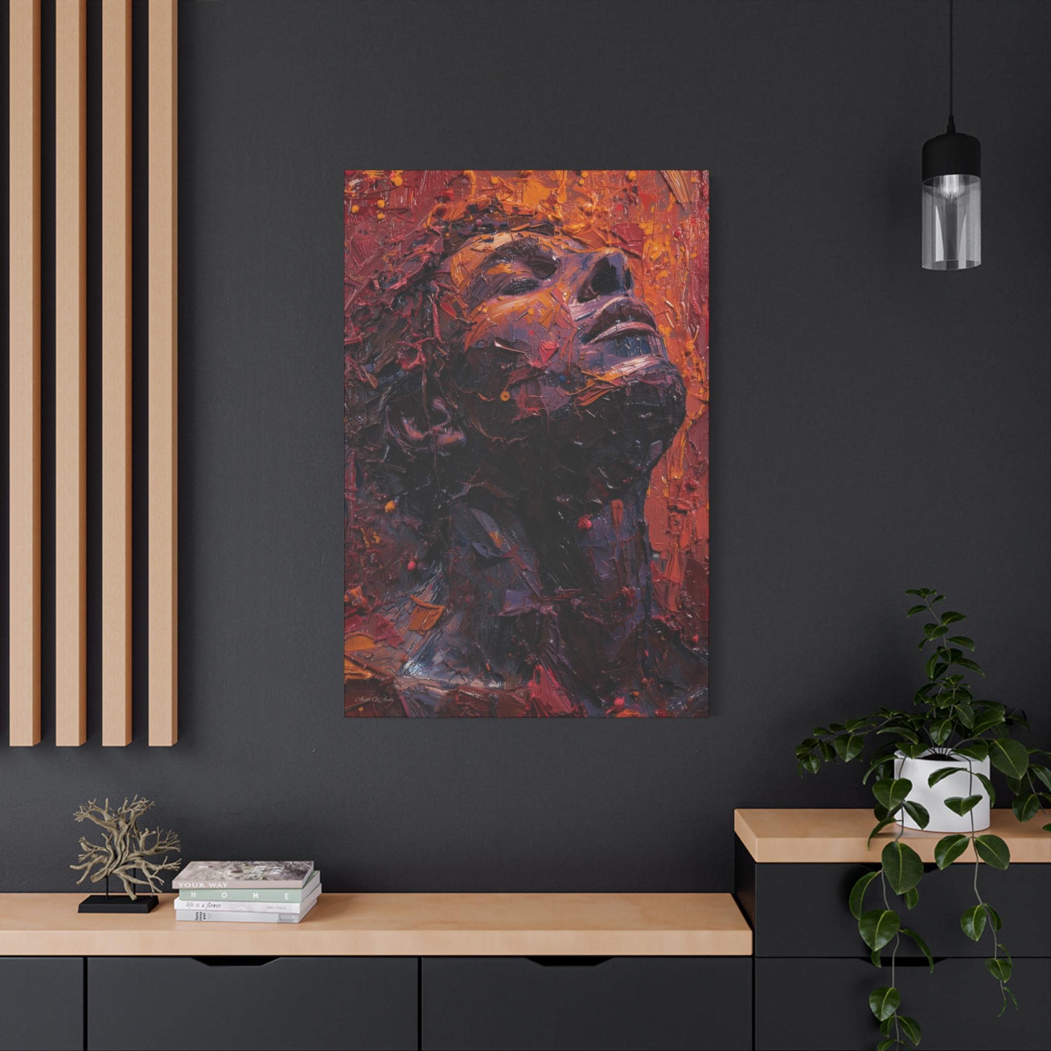 Place it above a bedside table, in a cozy reading nook, or in a minimalist entryway to anchor the room with depth and warmth. The portrait’s upward gaze and rich palette create a sense of resilience and calm — a daily reminder to breathe and rise through whatever you’re carrying. For collectors who love tactile, expressive art, this canvas translates studio energy into a home-ready format that hangs easily and holds its presence.