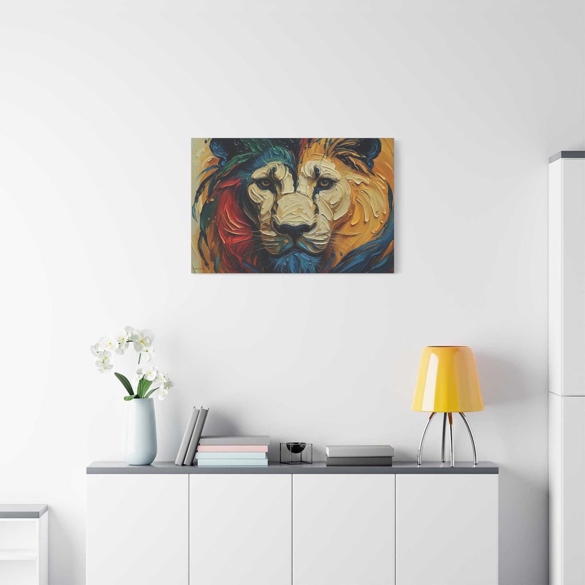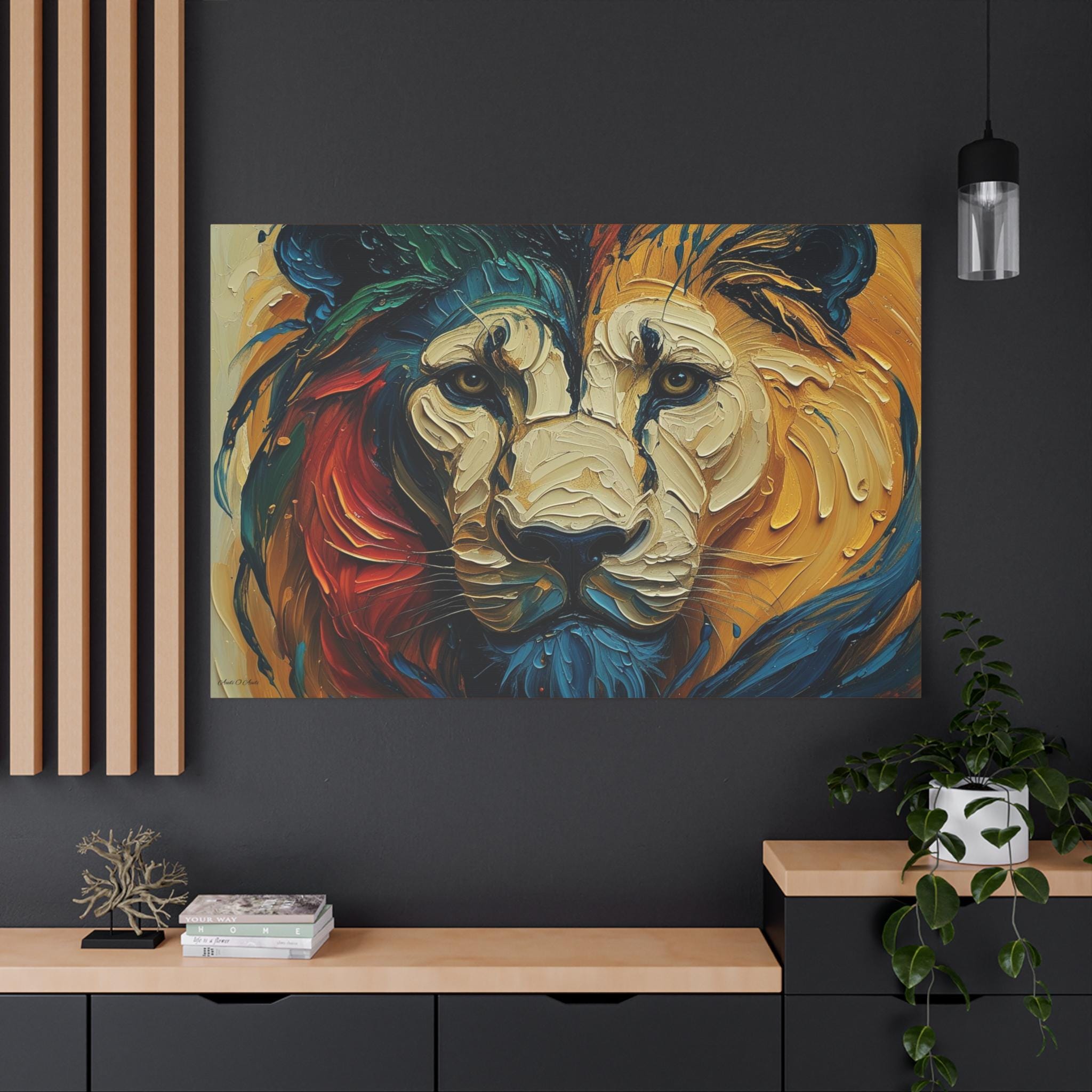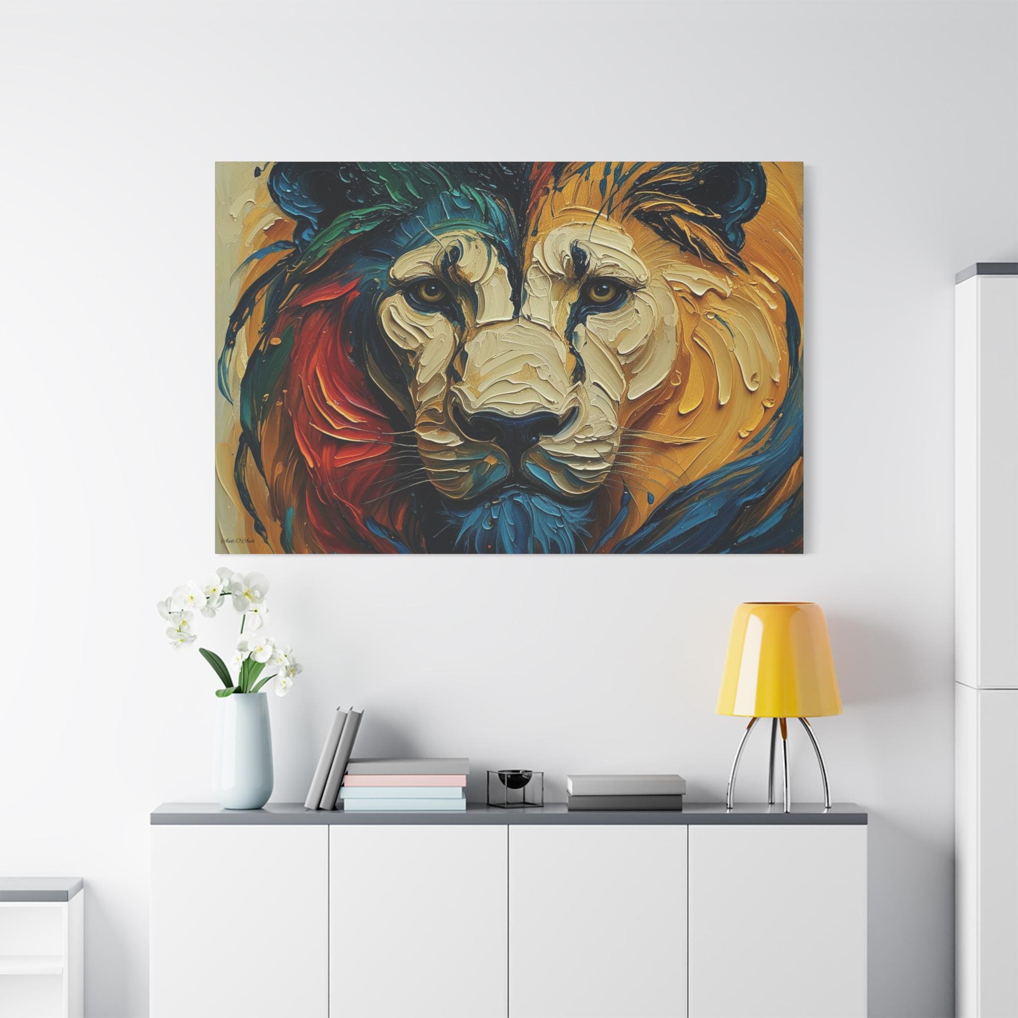 Hang it where you want color and character to anchor a room — a living room that needs a focal point, an office that could use bold inspiration, or an entry that greets guests with intensity and warmth. The lion’s gaze and layered palette invite long looks and quiet conversations.