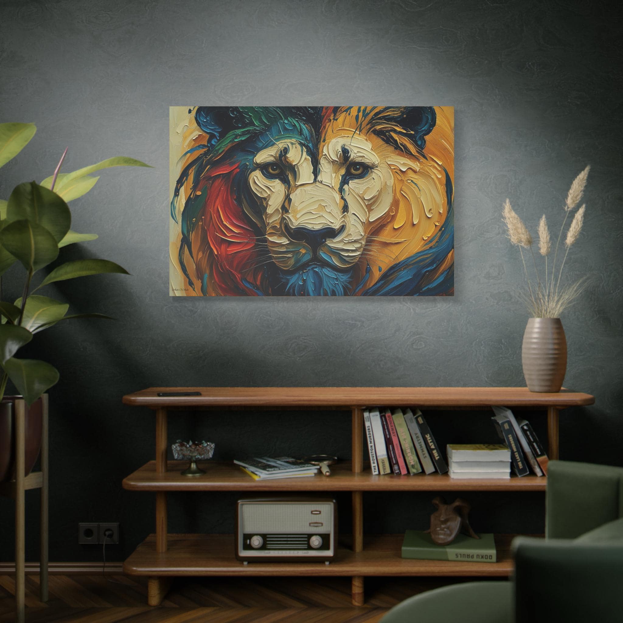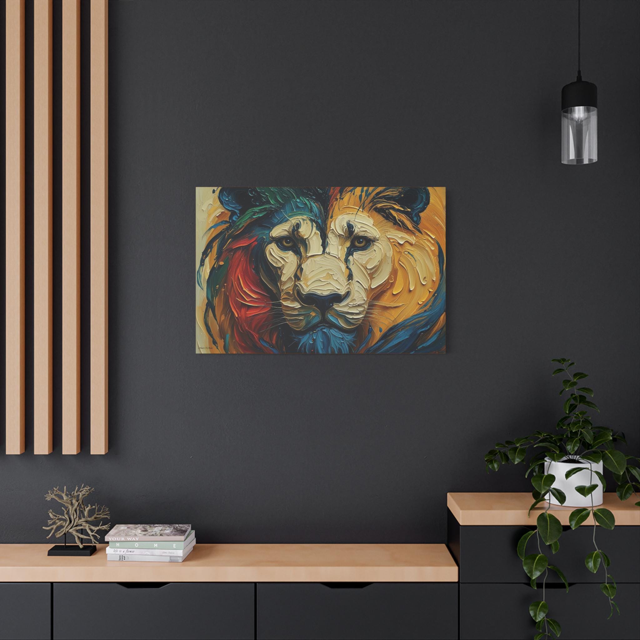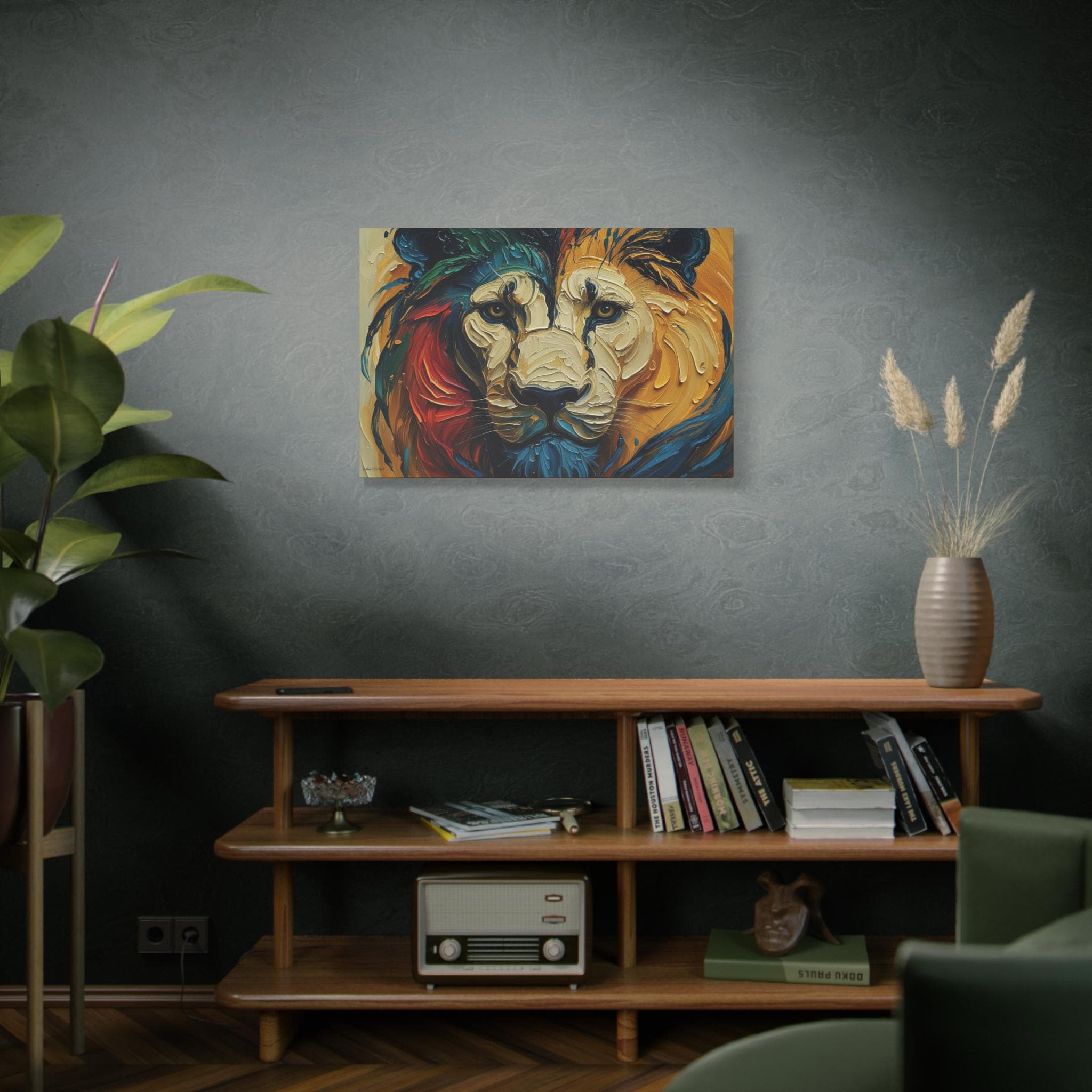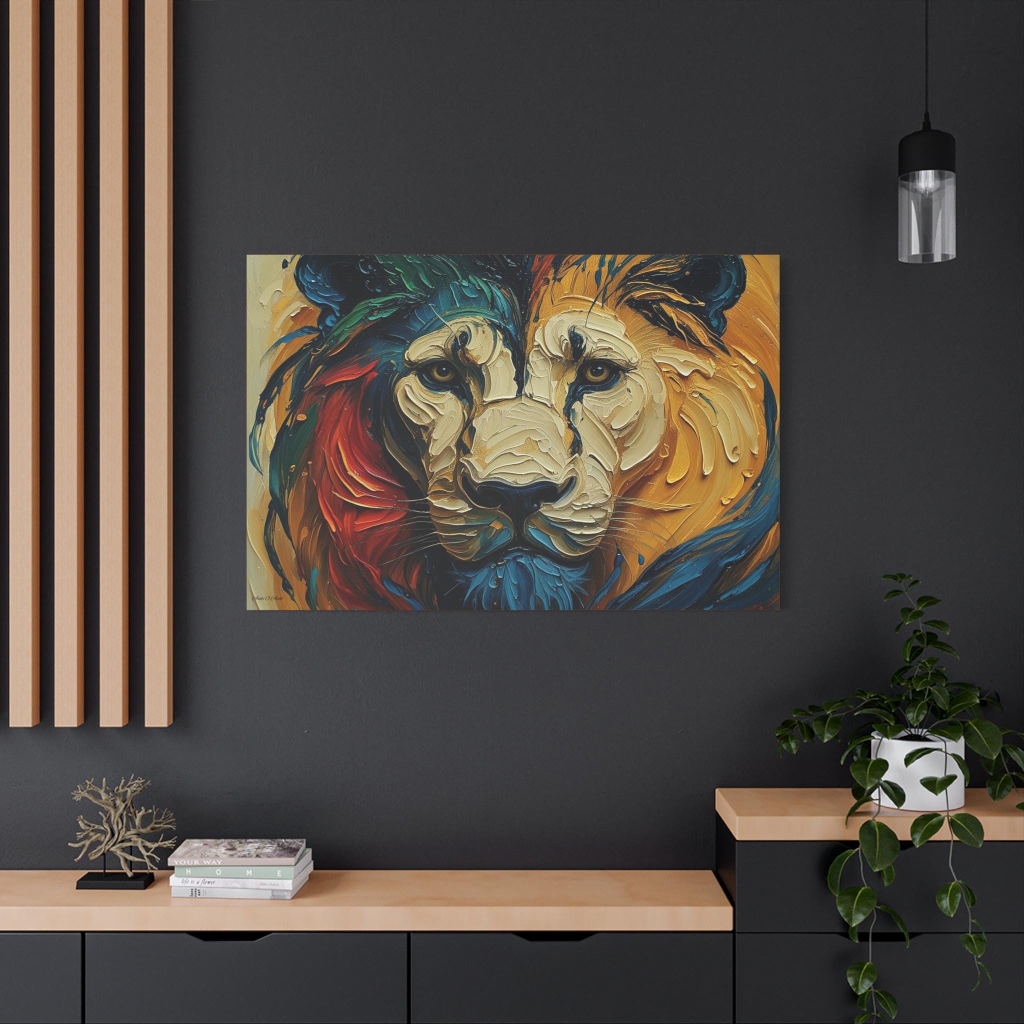 Hang it where you want color and character to anchor a room — a living room that needs a focal point, an office that could use bold inspiration, or an entry that greets guests with intensity and warmth. The lion’s gaze and layered palette invite long looks and quiet conversations.