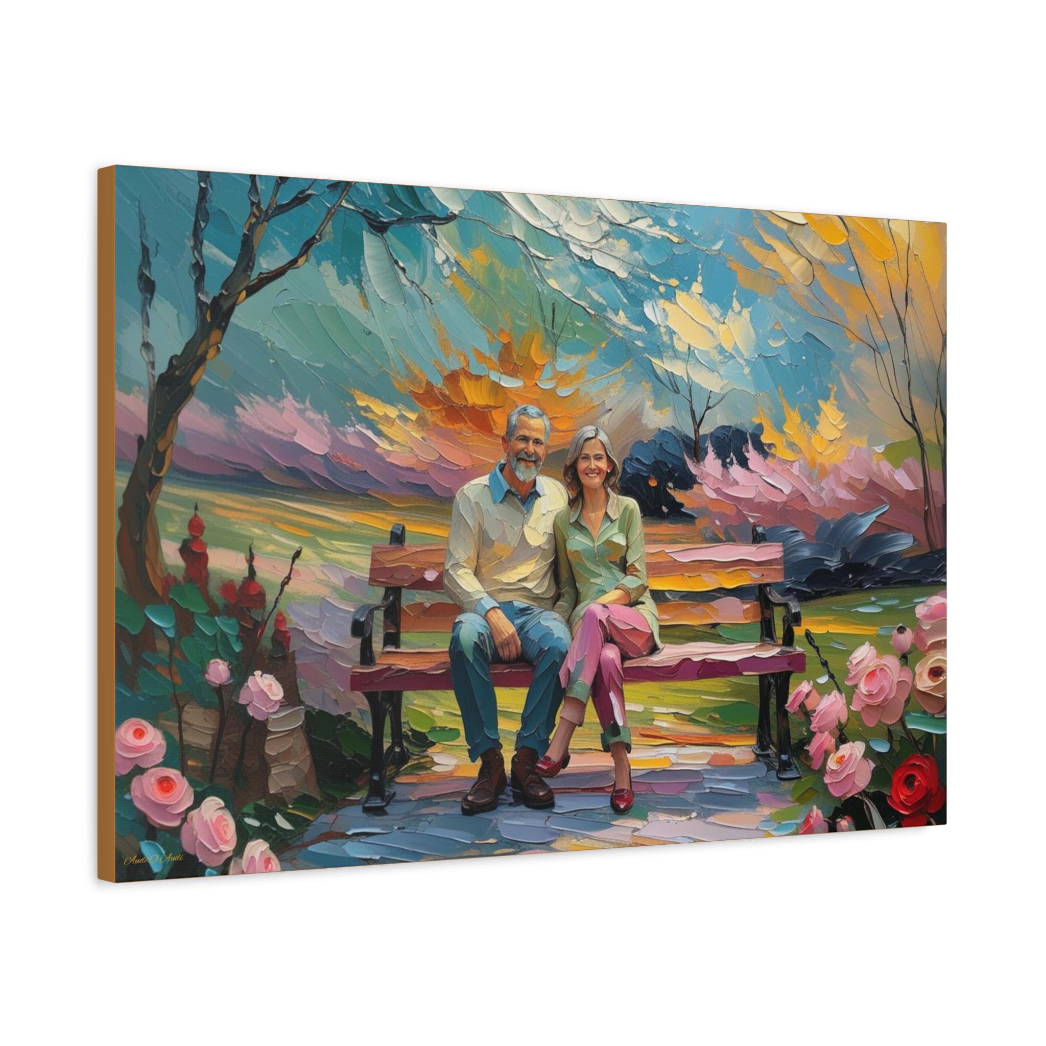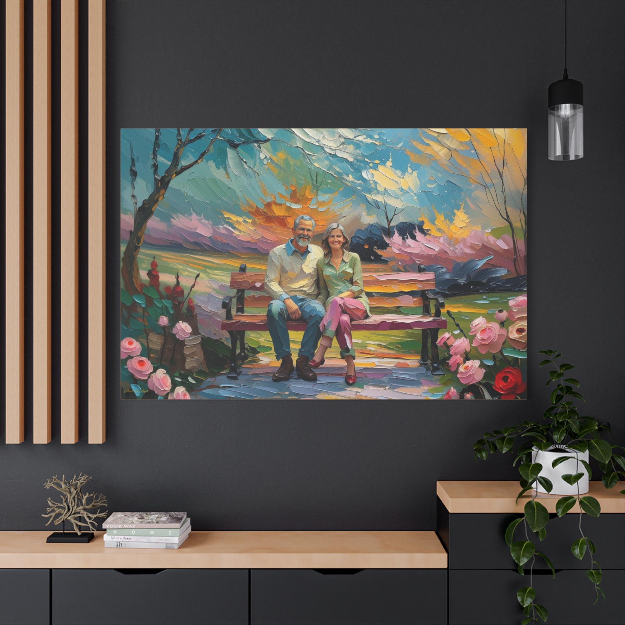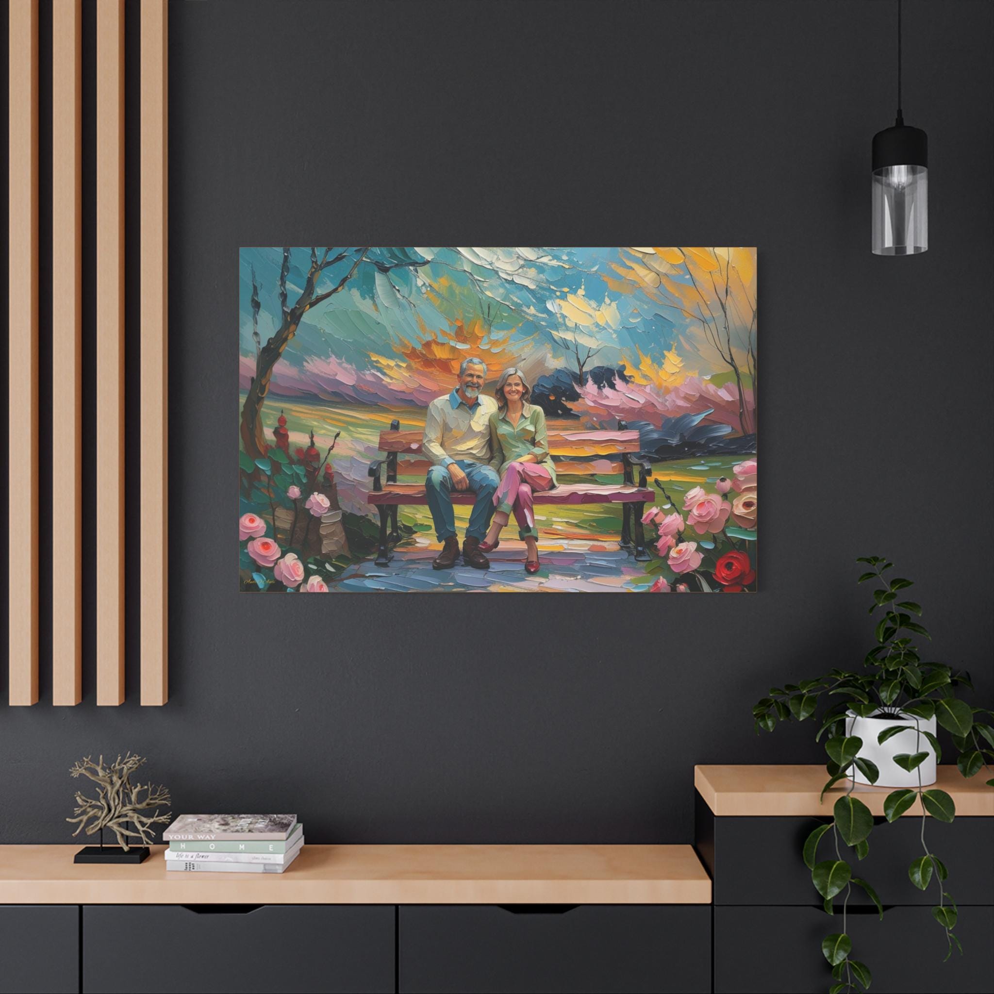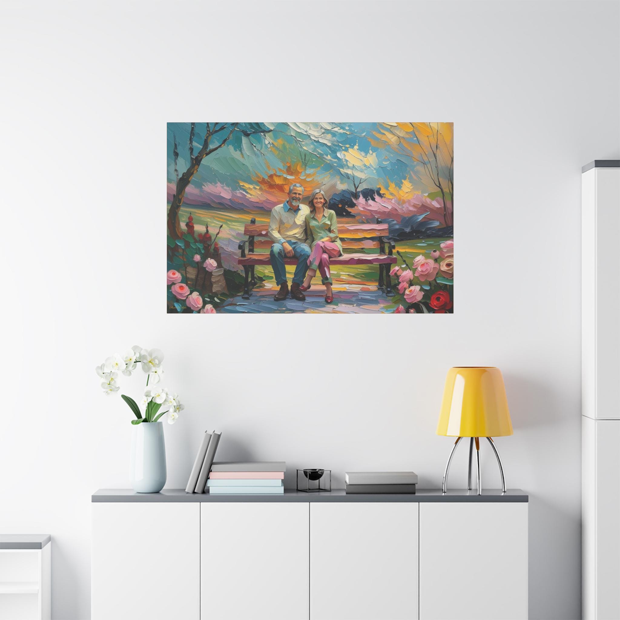A Lifetime Together, Couple on Park Bench Painting Matte Canvas Print, Couple Art, Romantic Decor, Bench Canvas Print, Floral Wall Art.