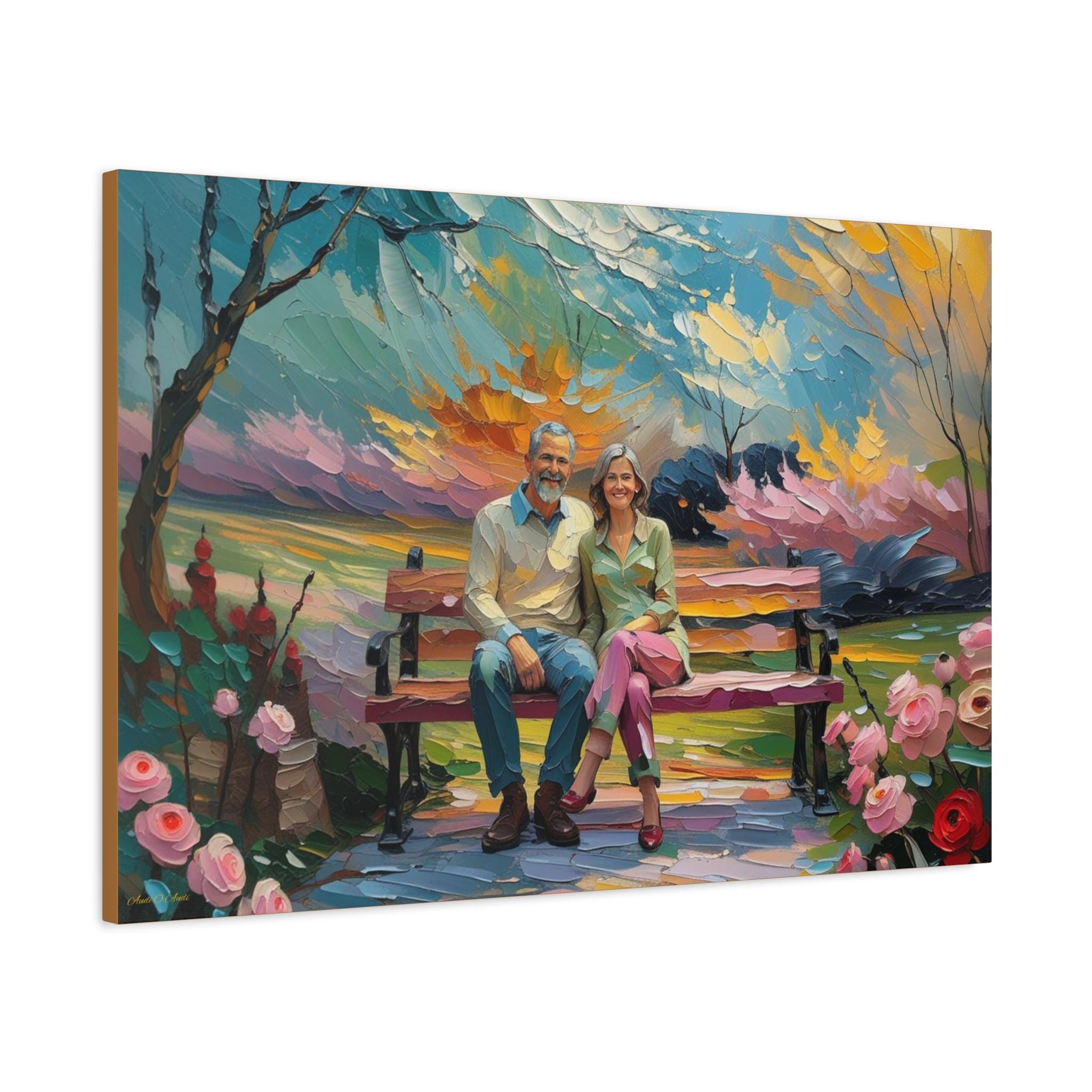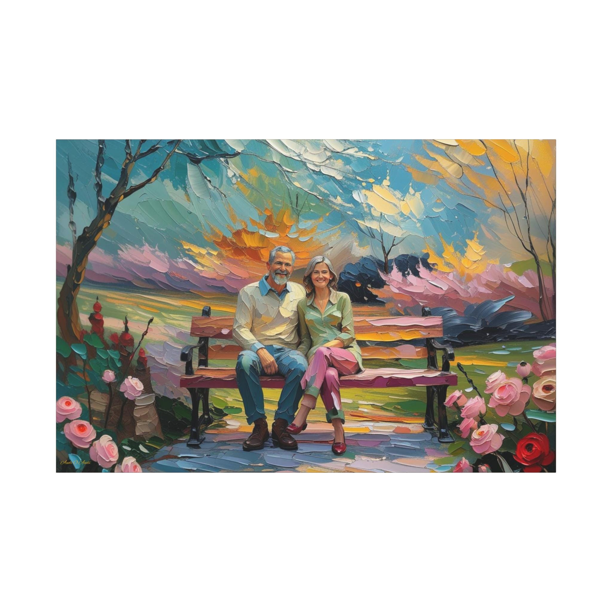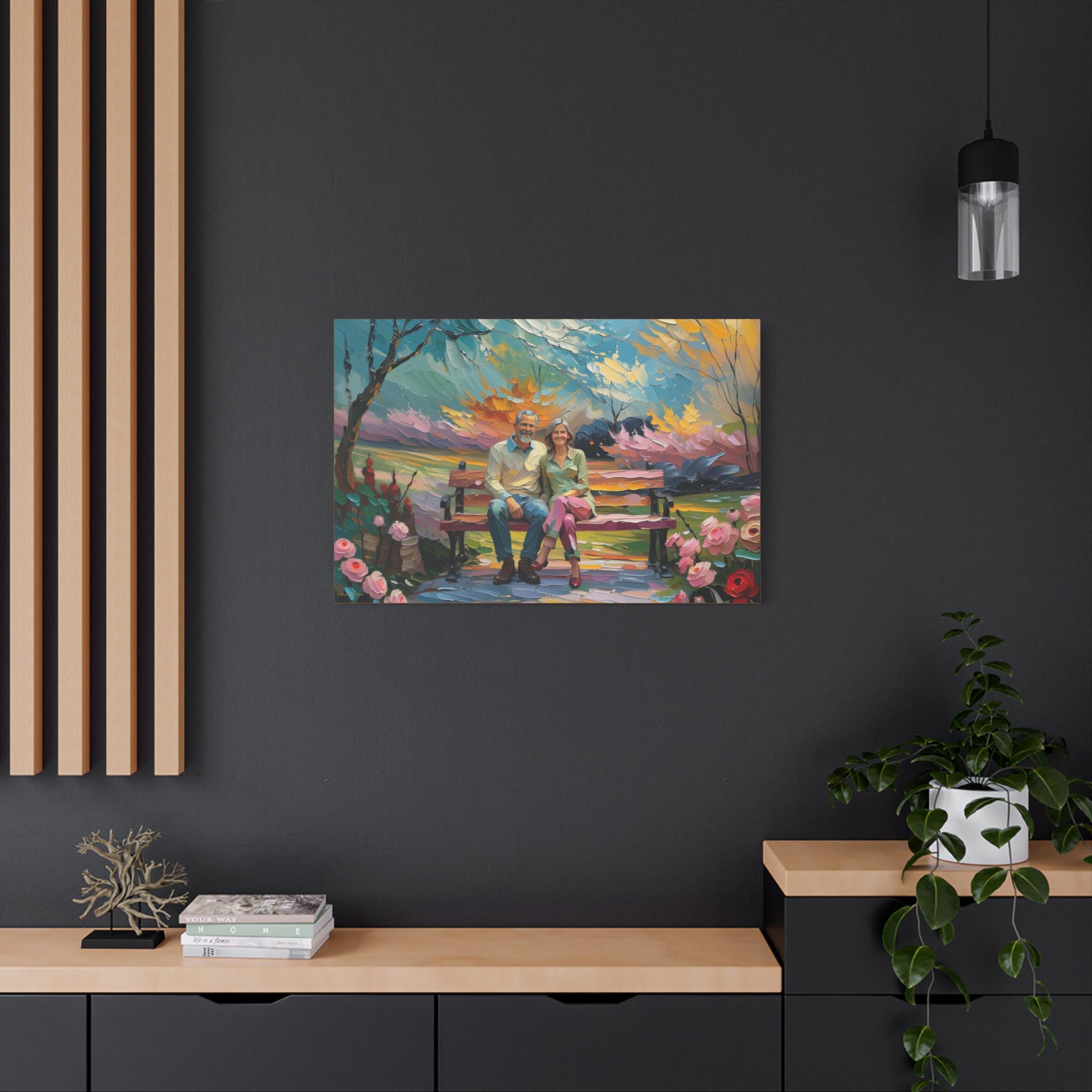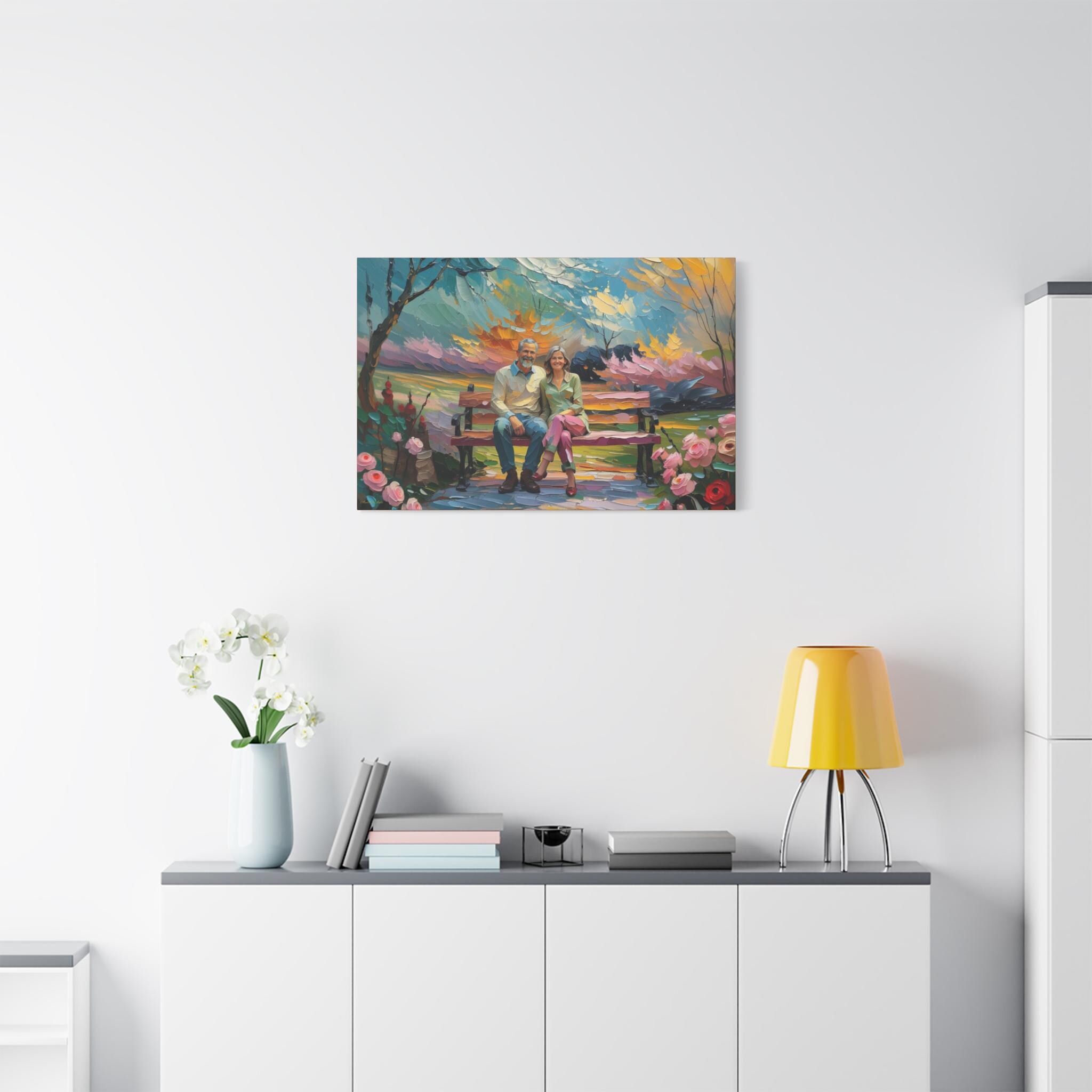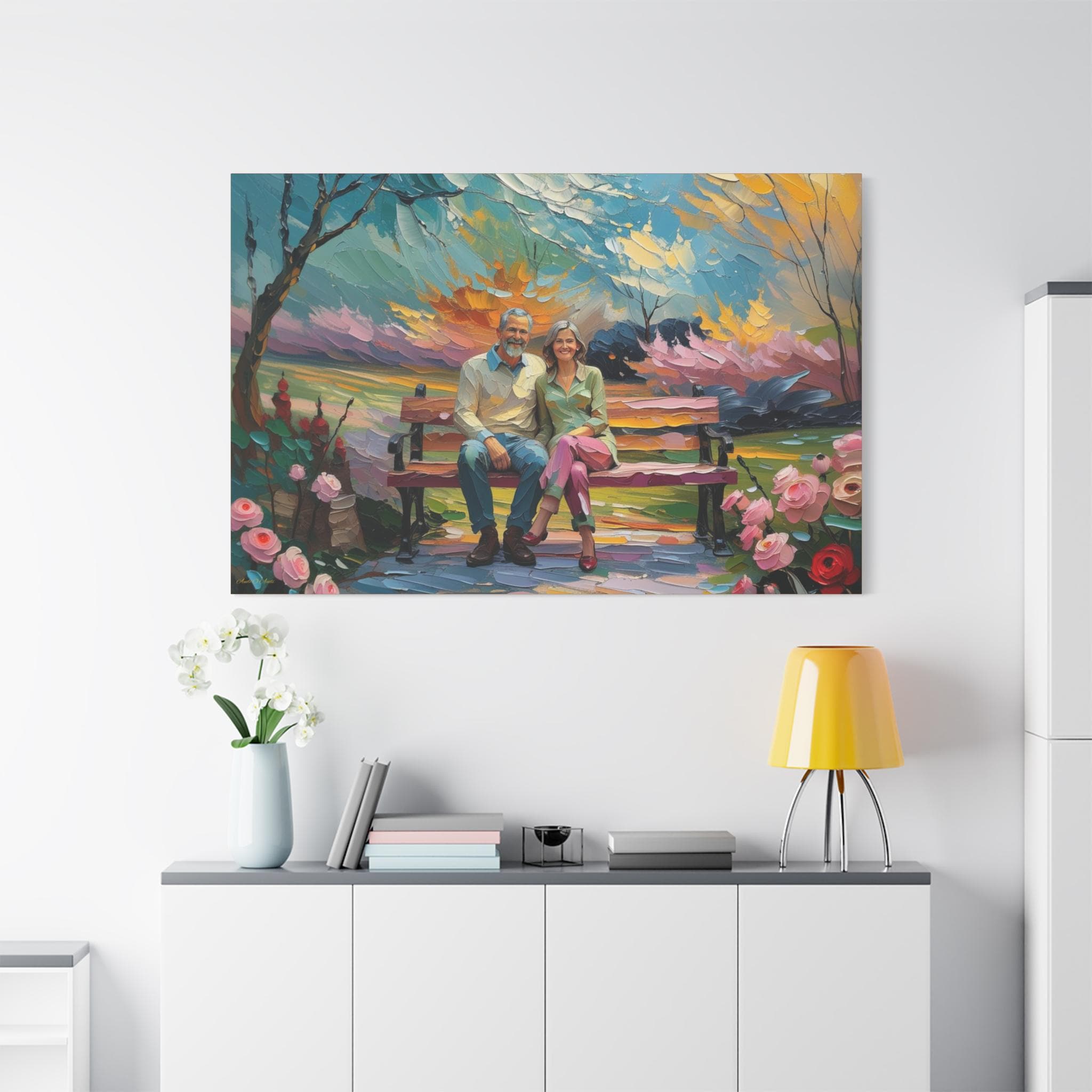 A Lifetime Together, Couple on Park Bench Painting Matte Canvas Print, Couple Art, Romantic Decor, Bench Canvas Print, Floral Wall Art.
