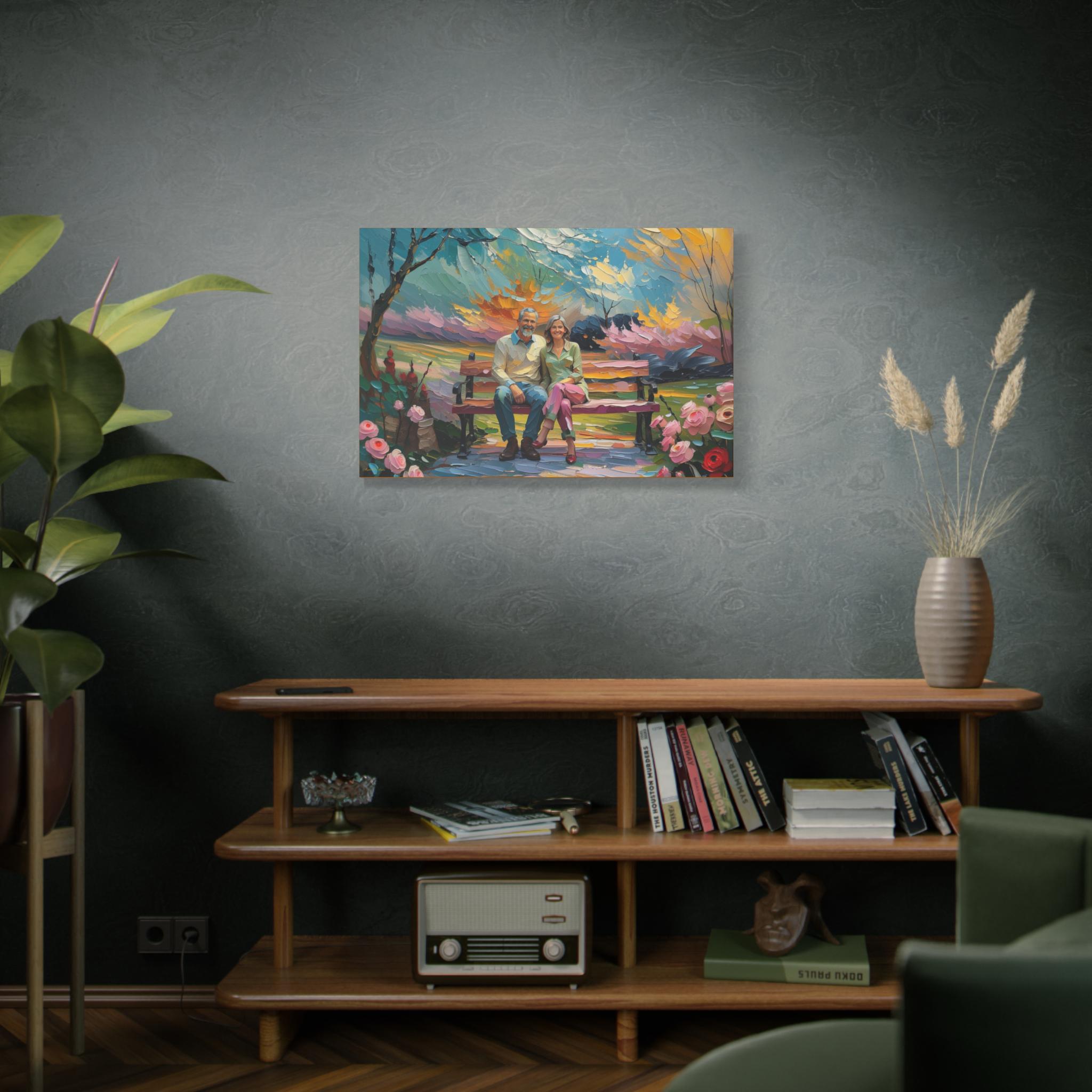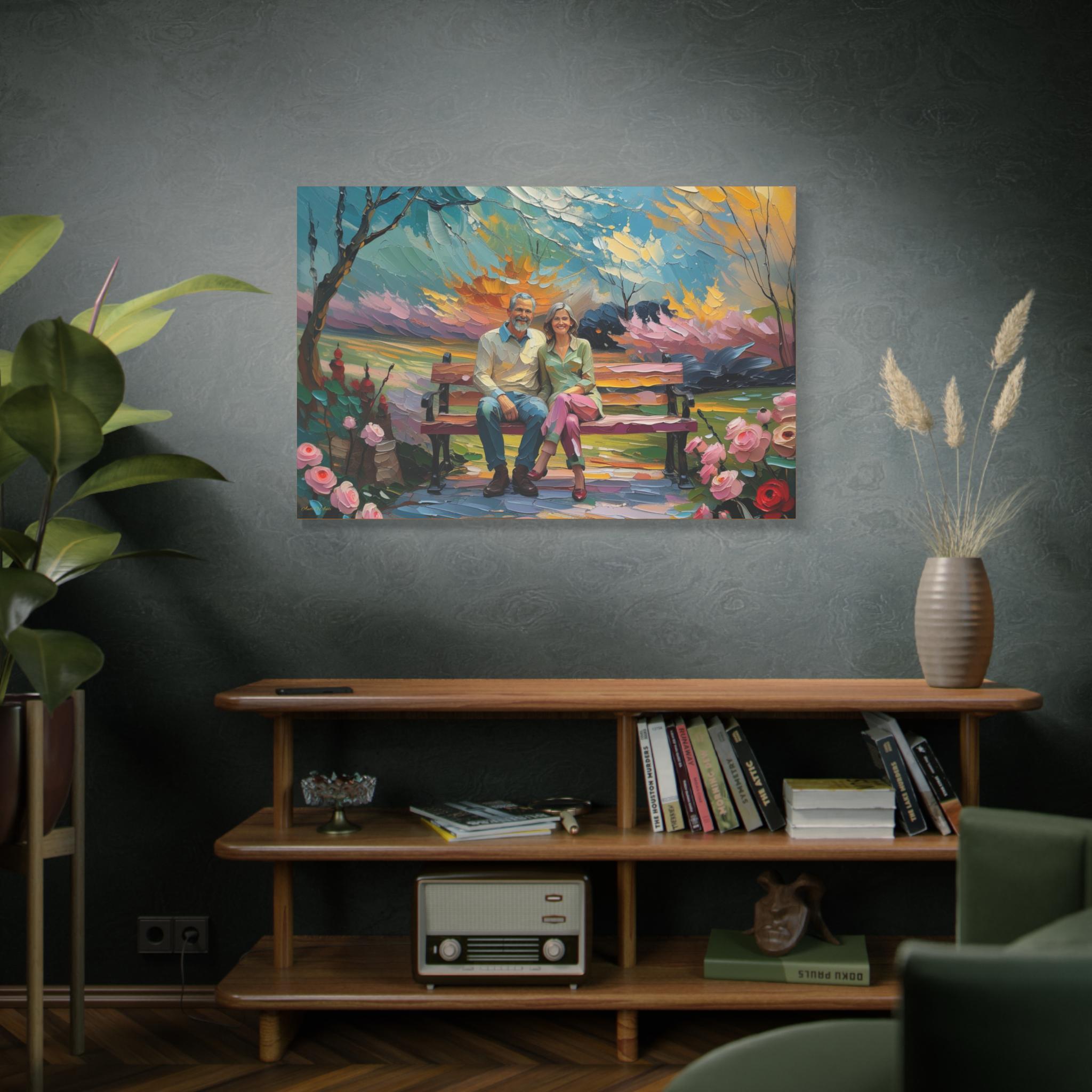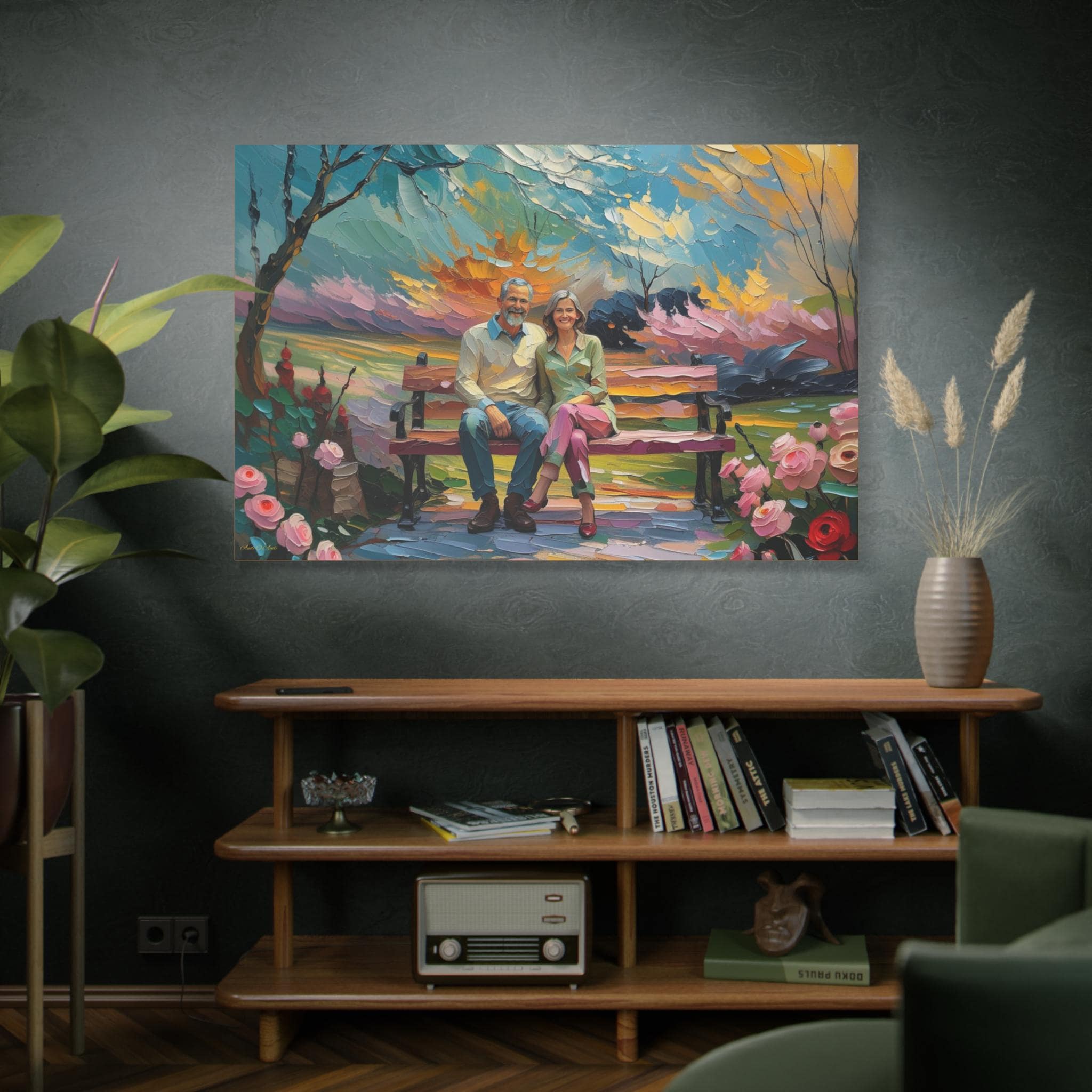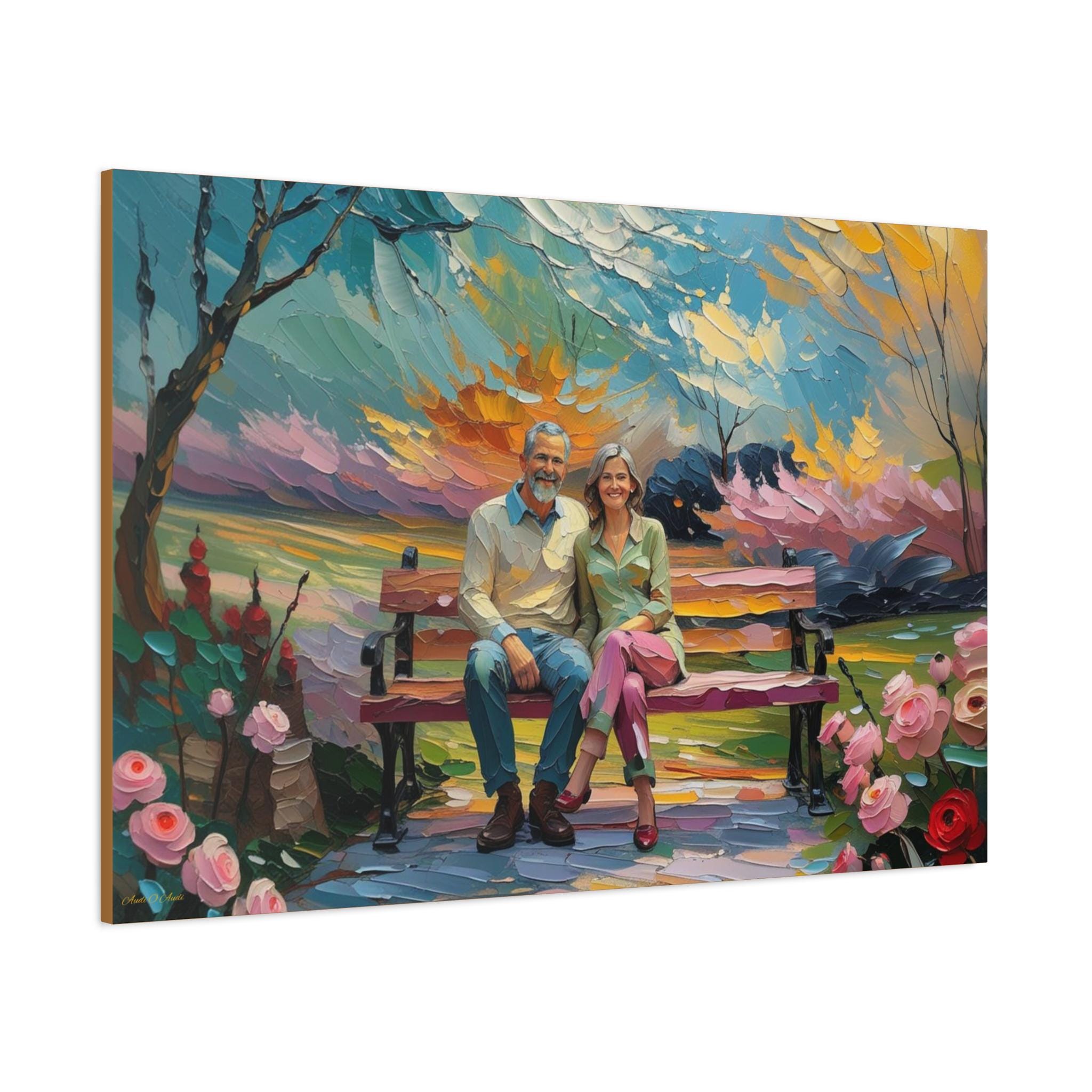 A Lifetime Together, Couple on Park Bench Painting Matte Canvas Print, Couple Art, Romantic Decor, Bench Canvas Print, Floral Wall Art.
