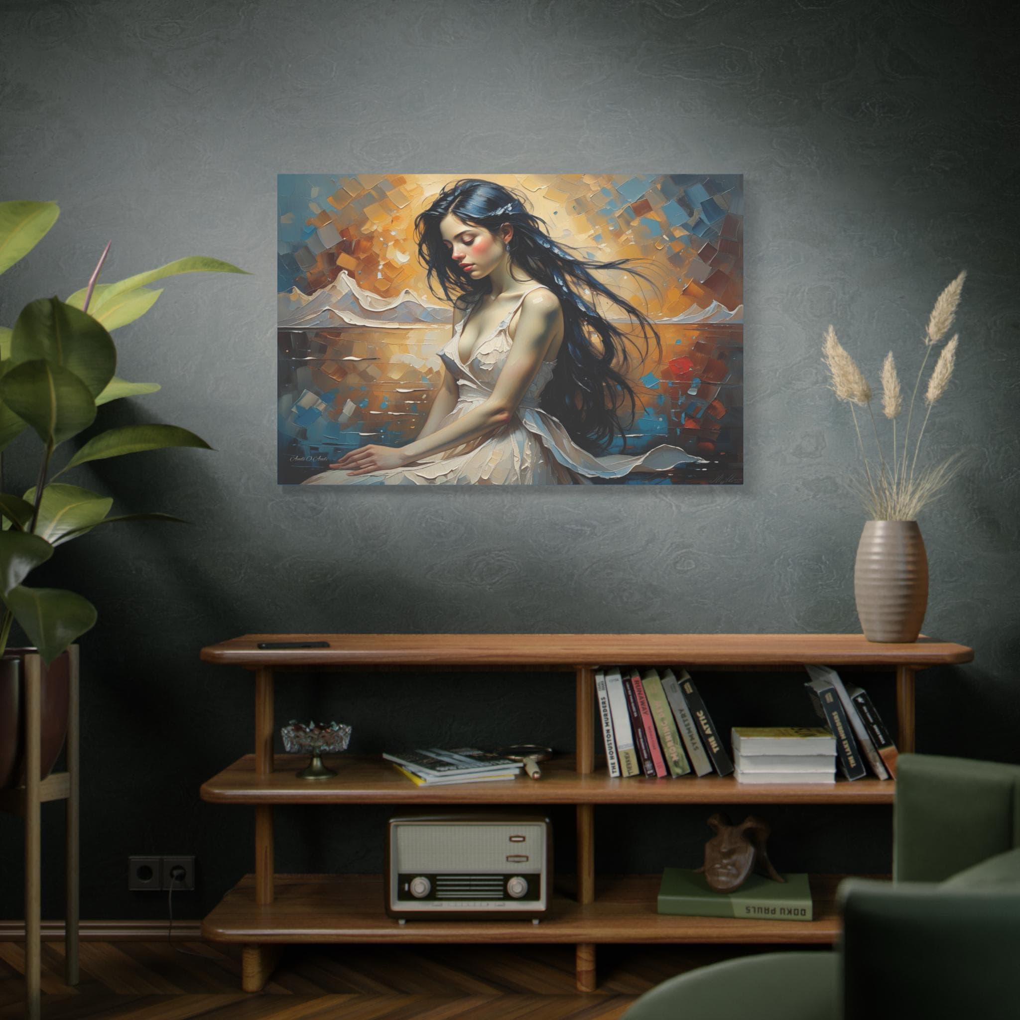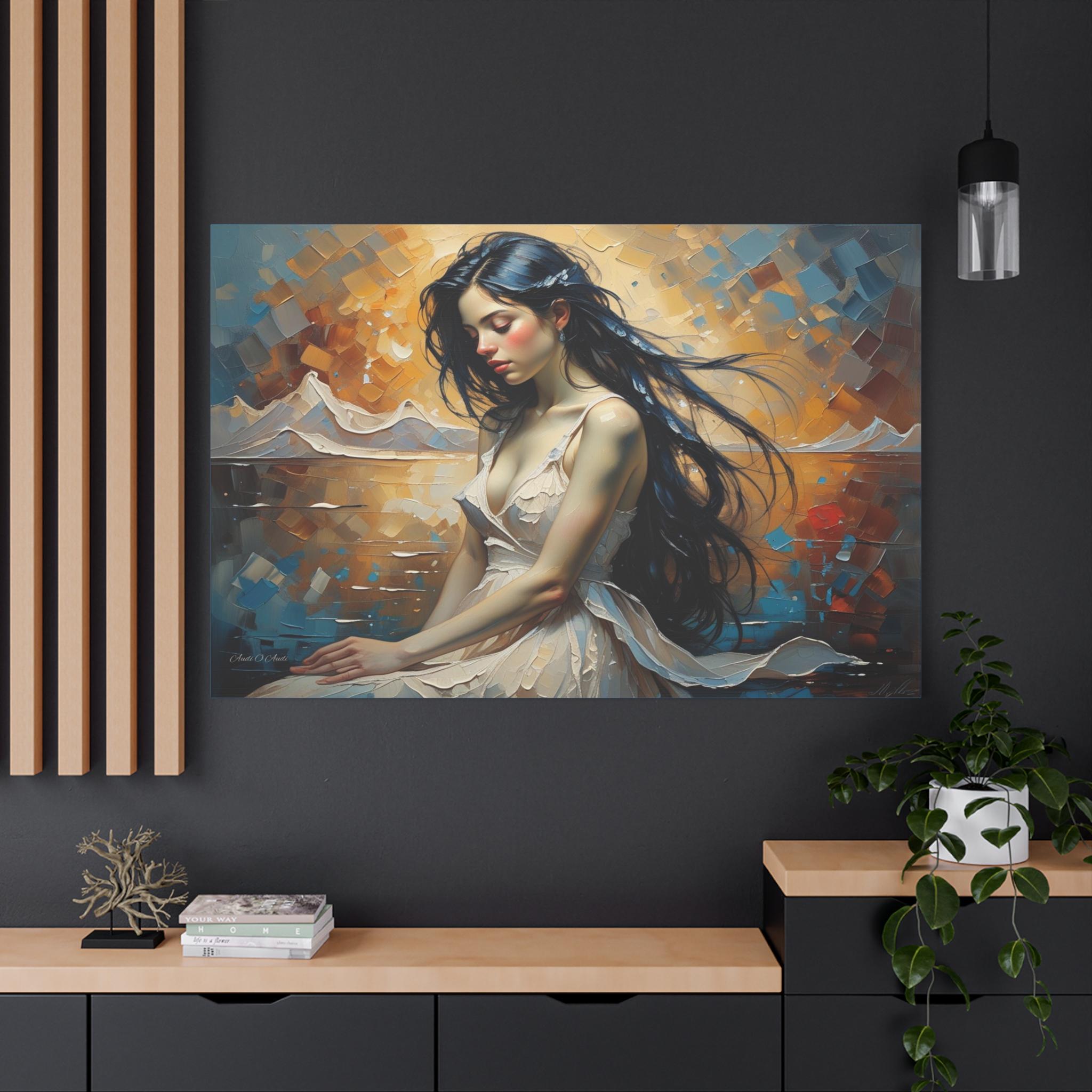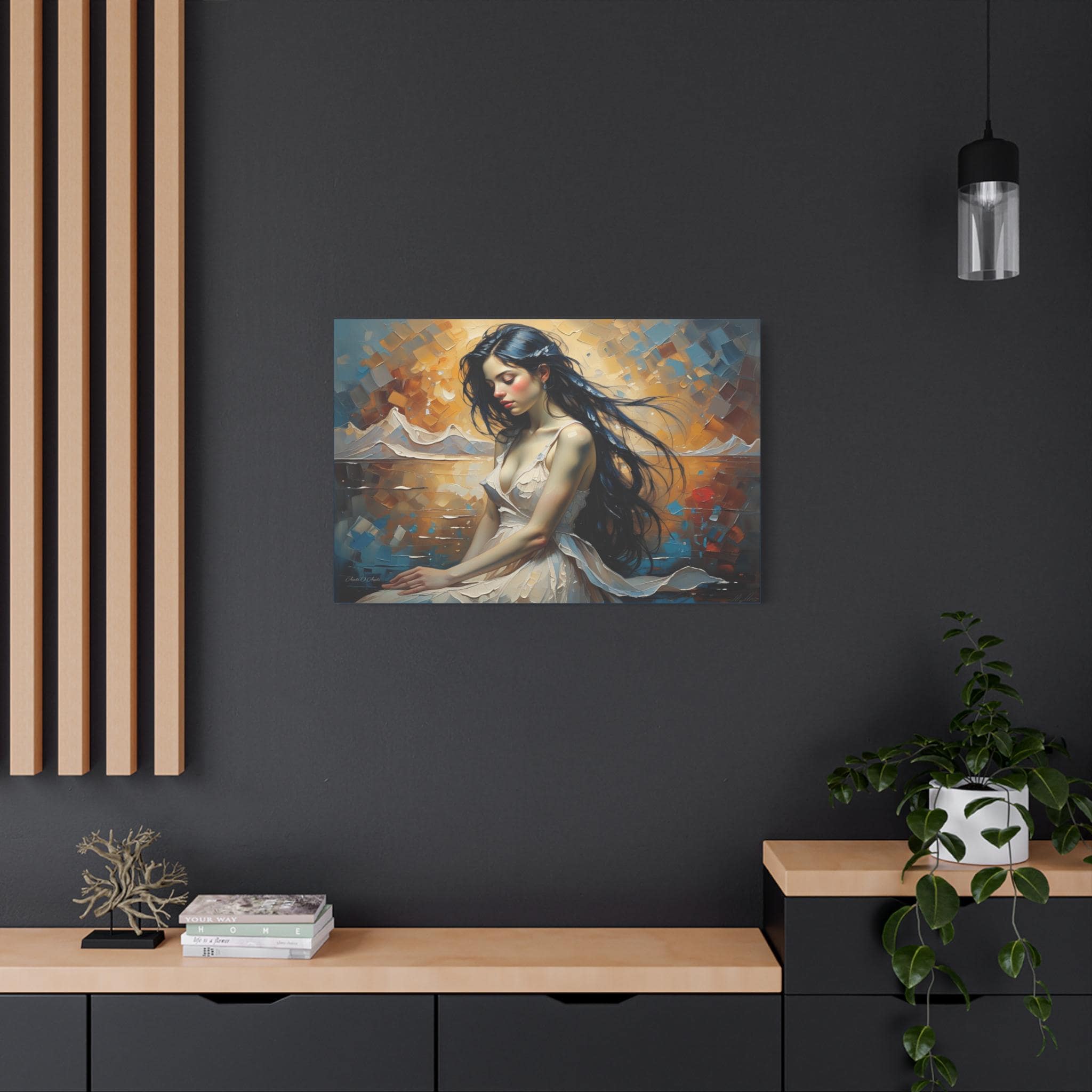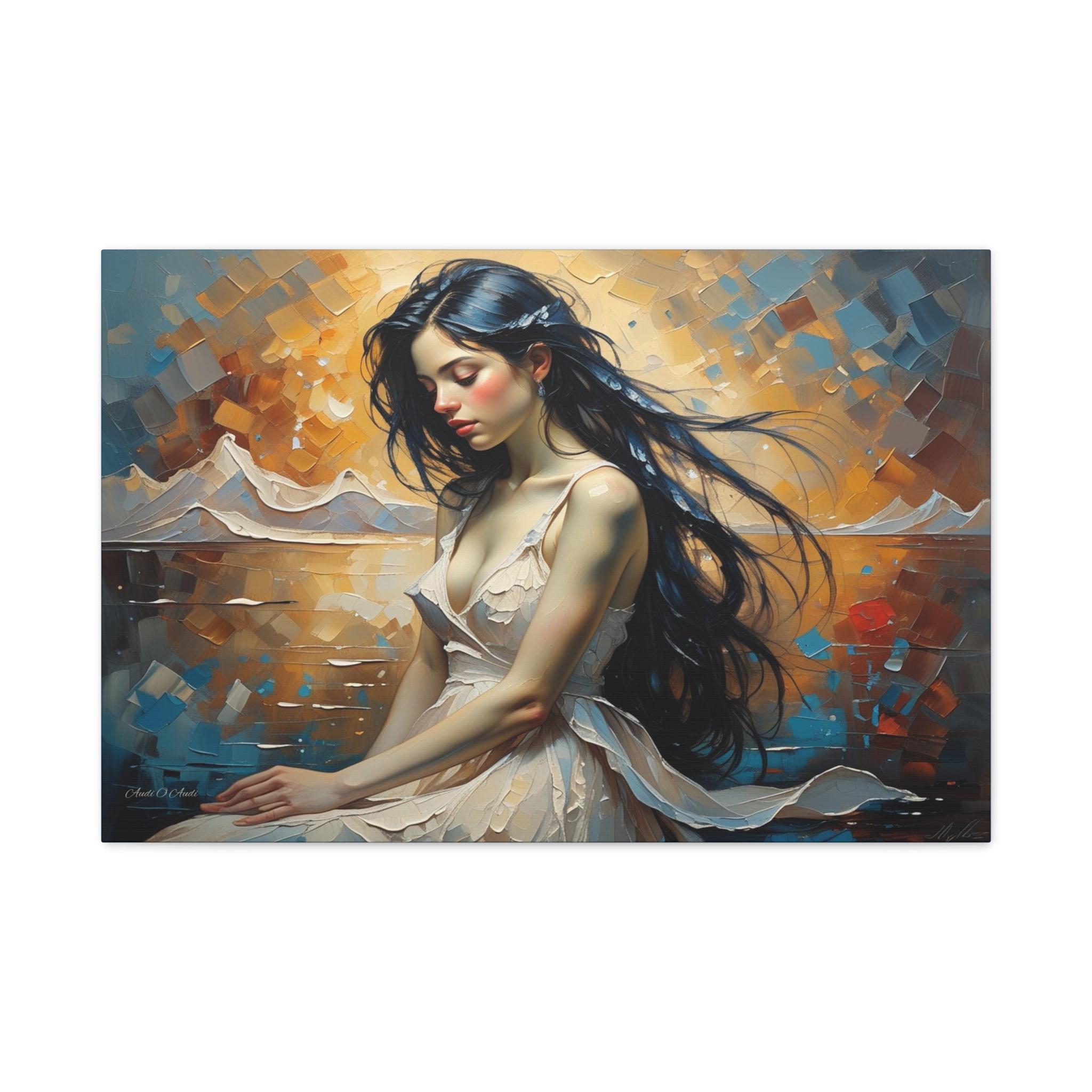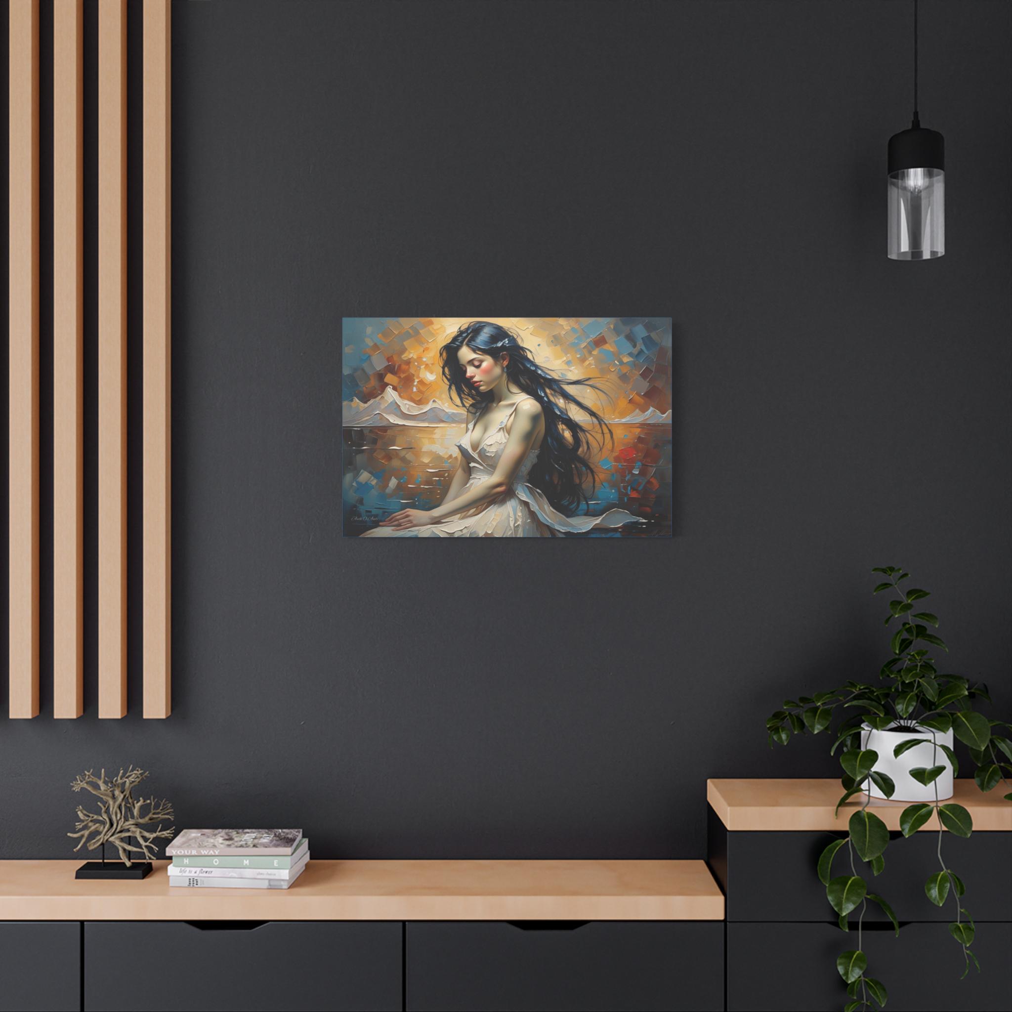 Elegance on the Horizon, Serene Woman by Lake Canvas Print, Gift for Her, Romantic Art, Modern Canvas Print, Living Room Art.