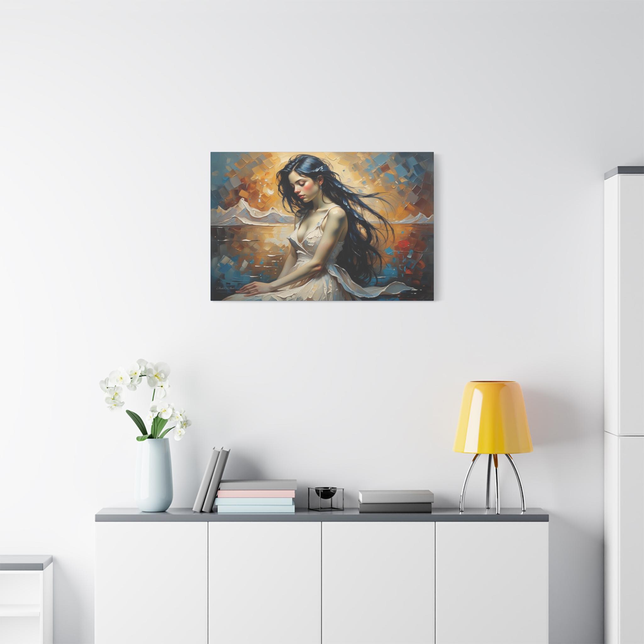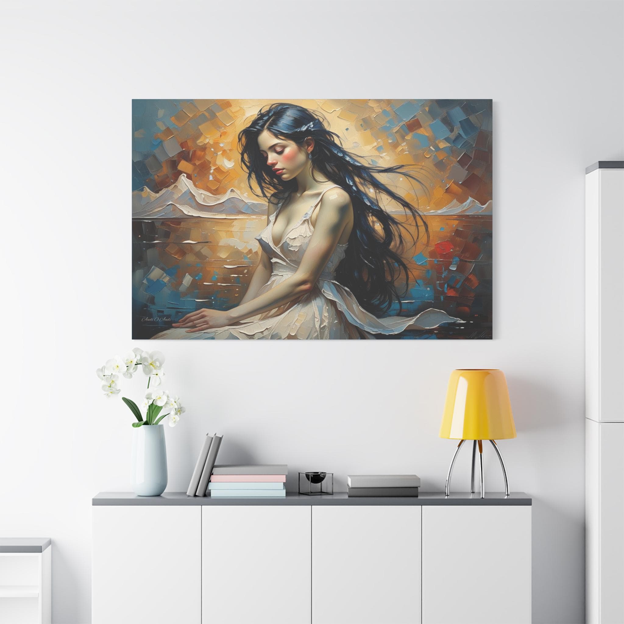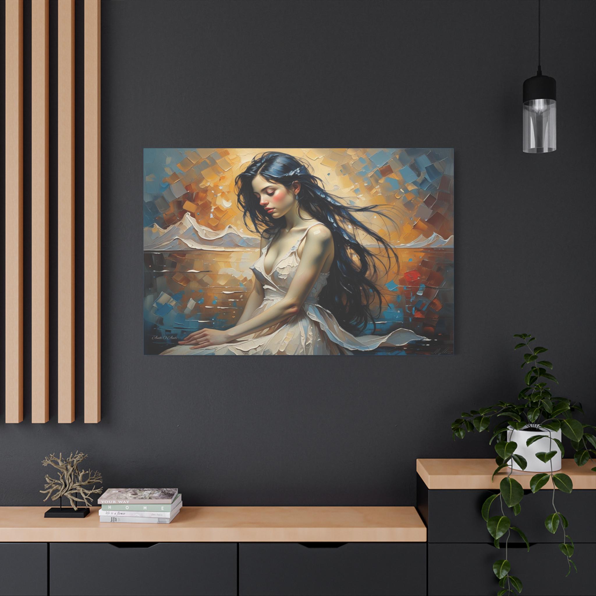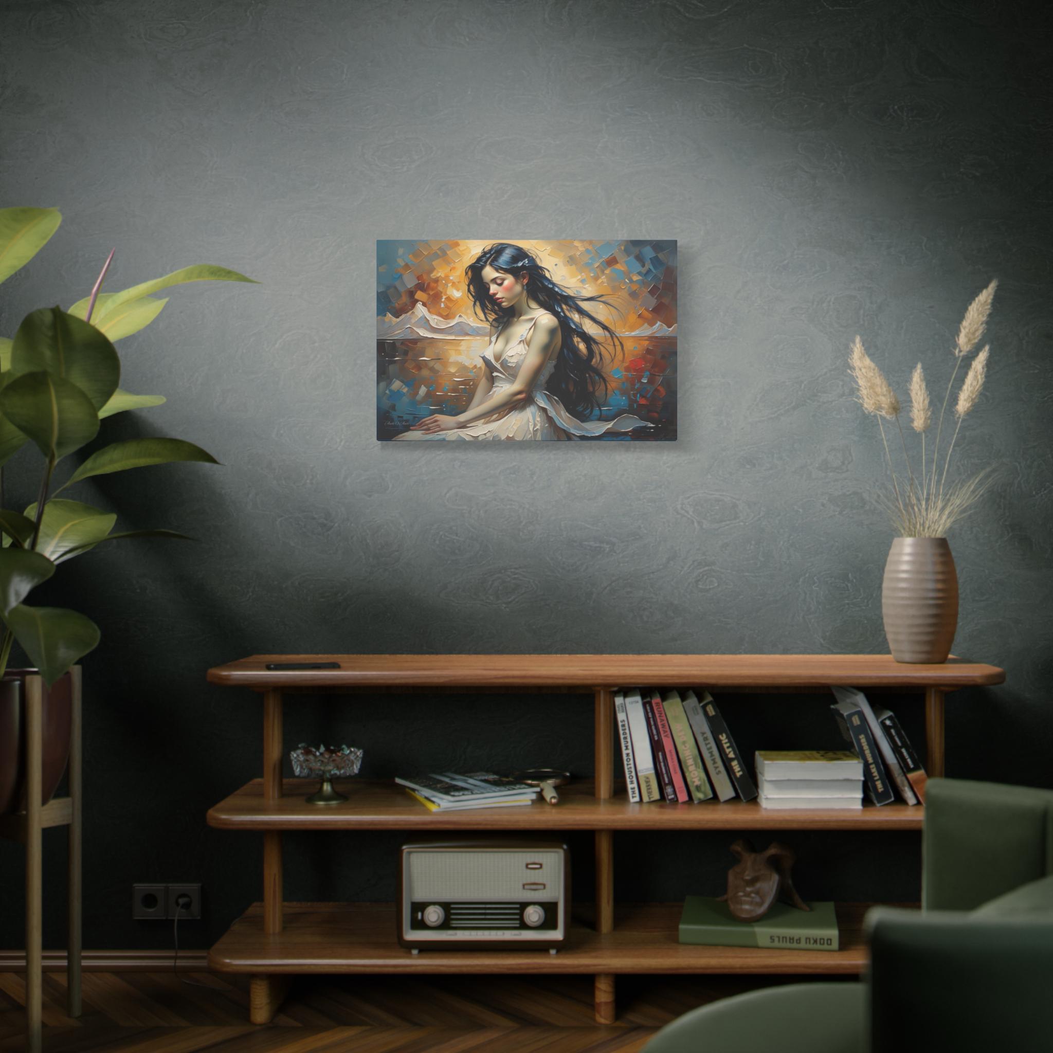 Elegance on the Horizon, Serene Woman by Lake Canvas Print, Gift for Her, Romantic Art, Modern Canvas Print, Living Room Art.