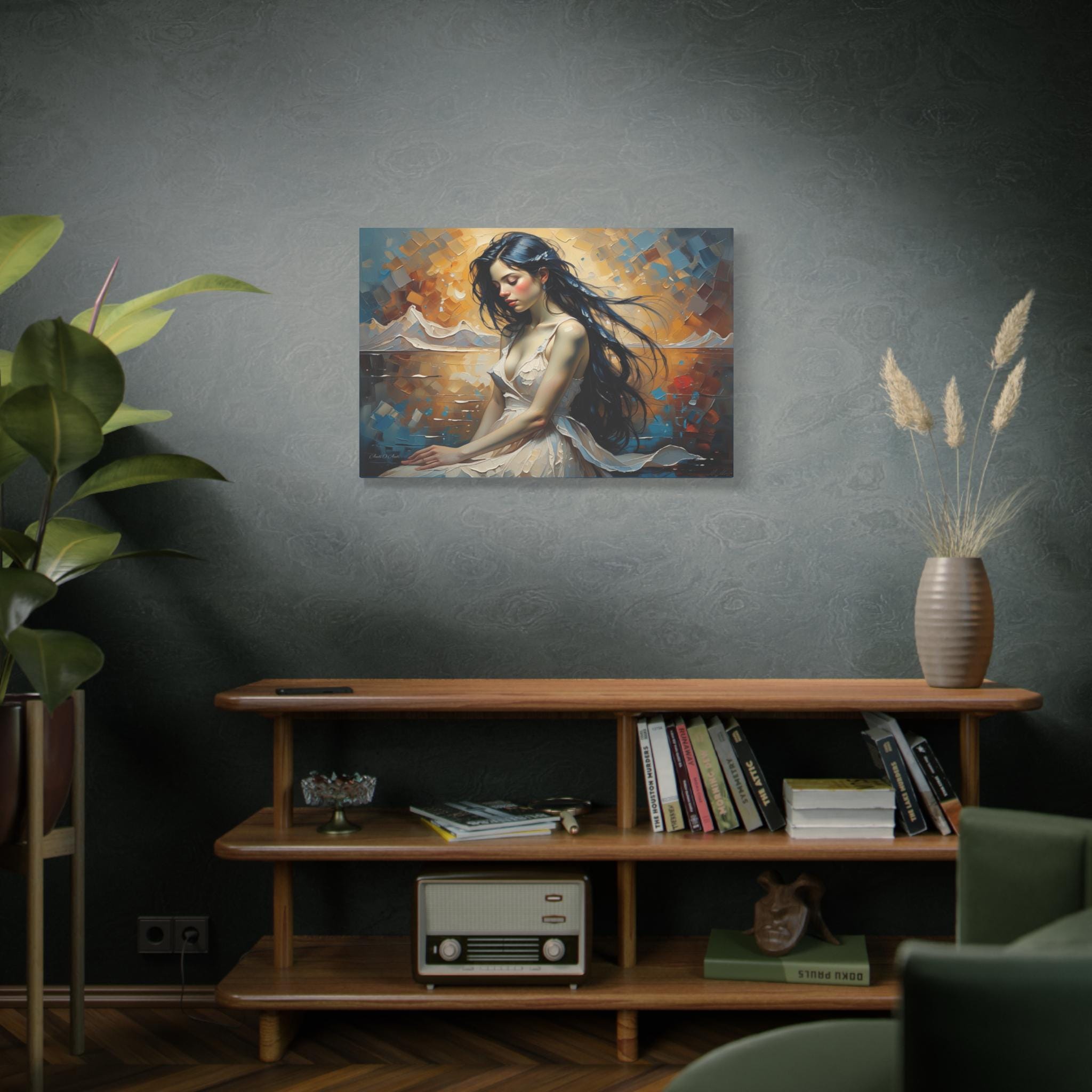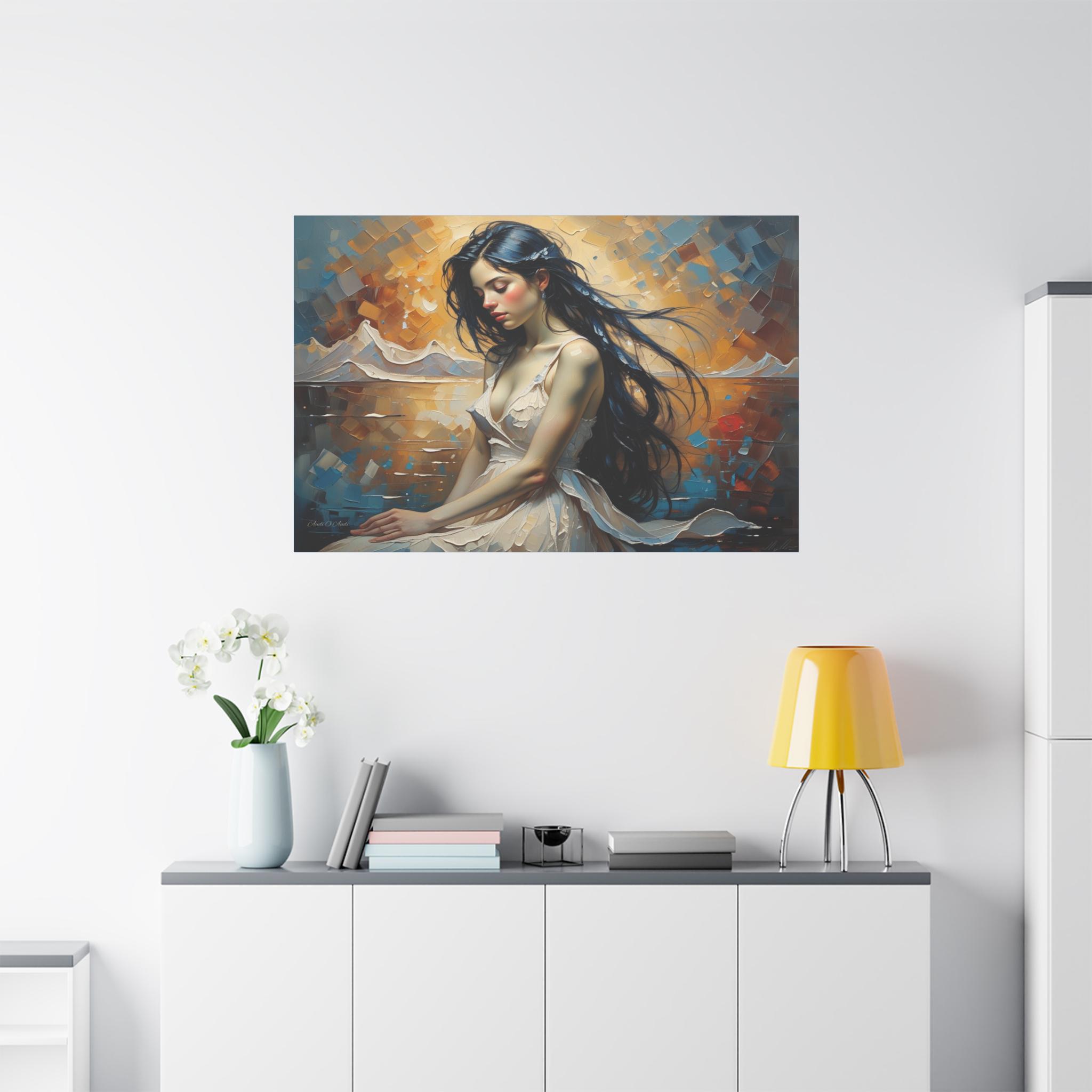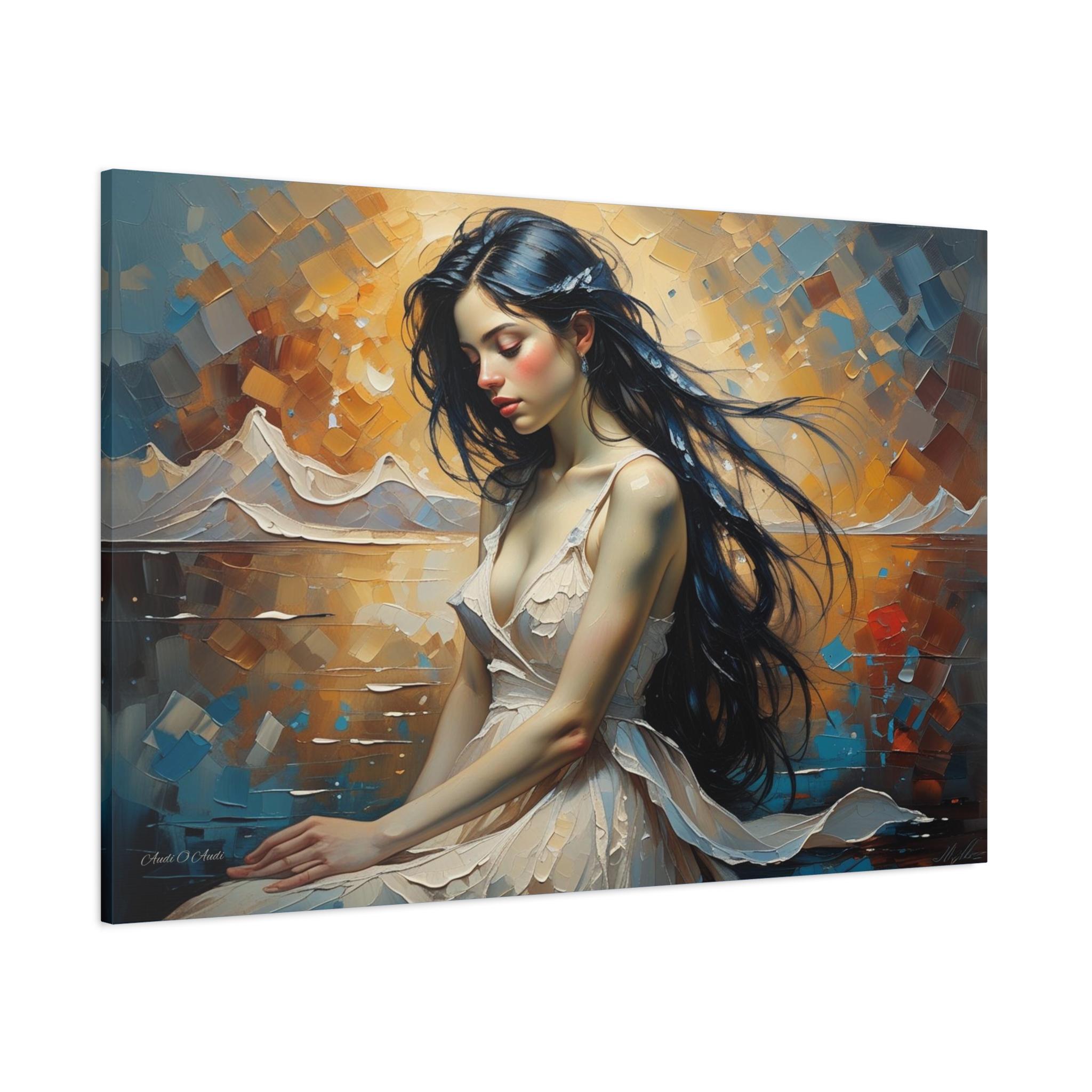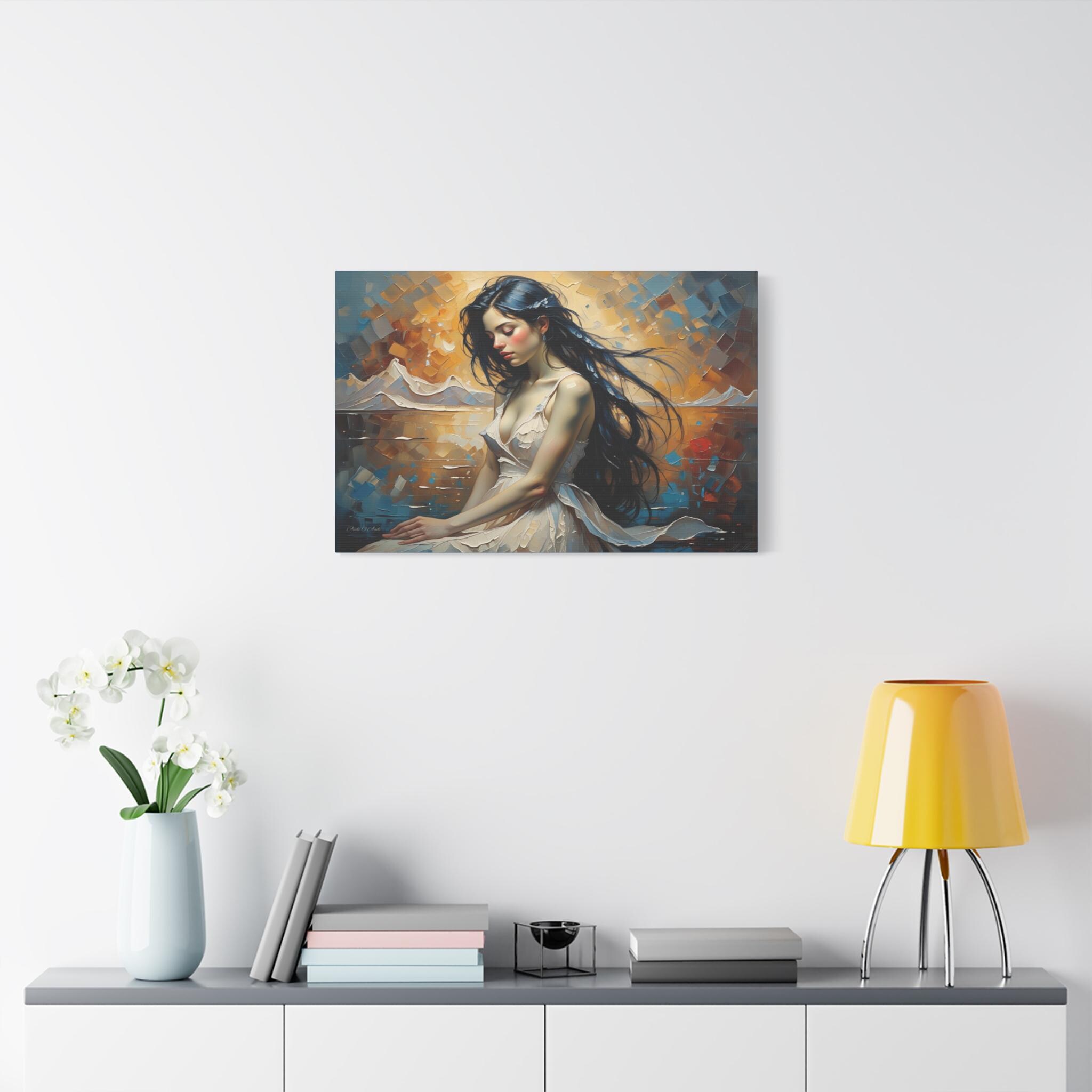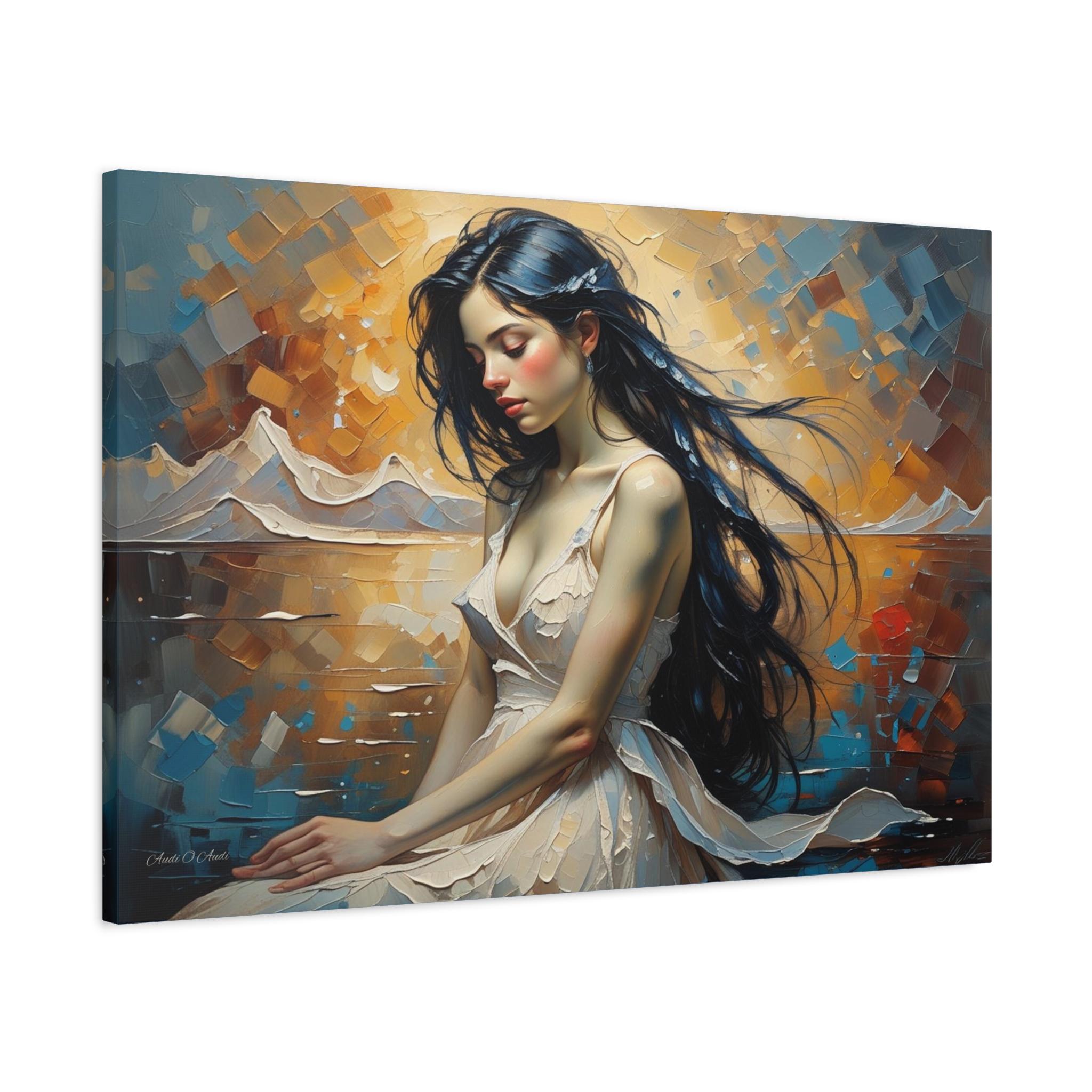 Elegance on the Horizon, Serene Woman by Lake Canvas Print, Gift for Her, Romantic Art, Modern Canvas Print, Living Room Art.
