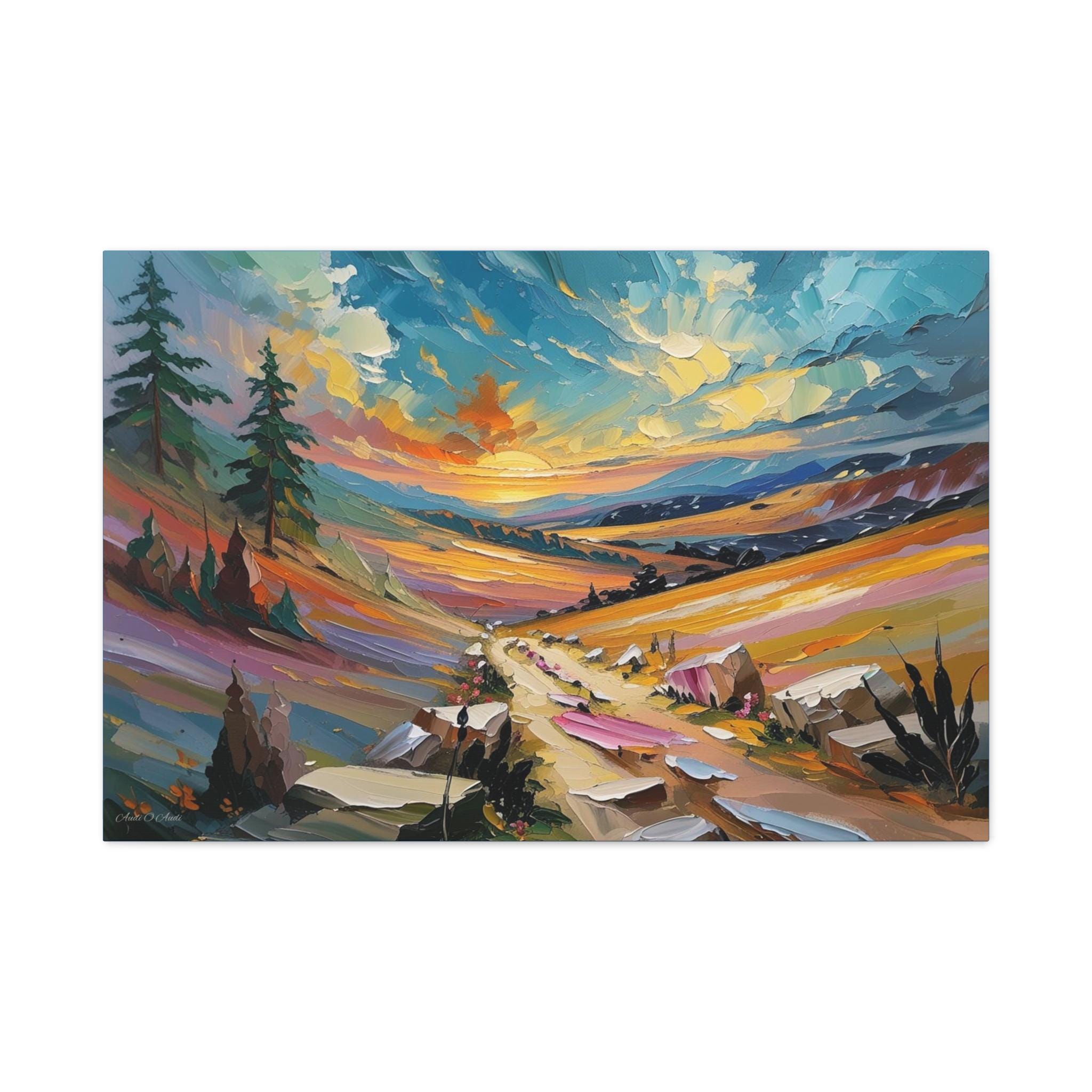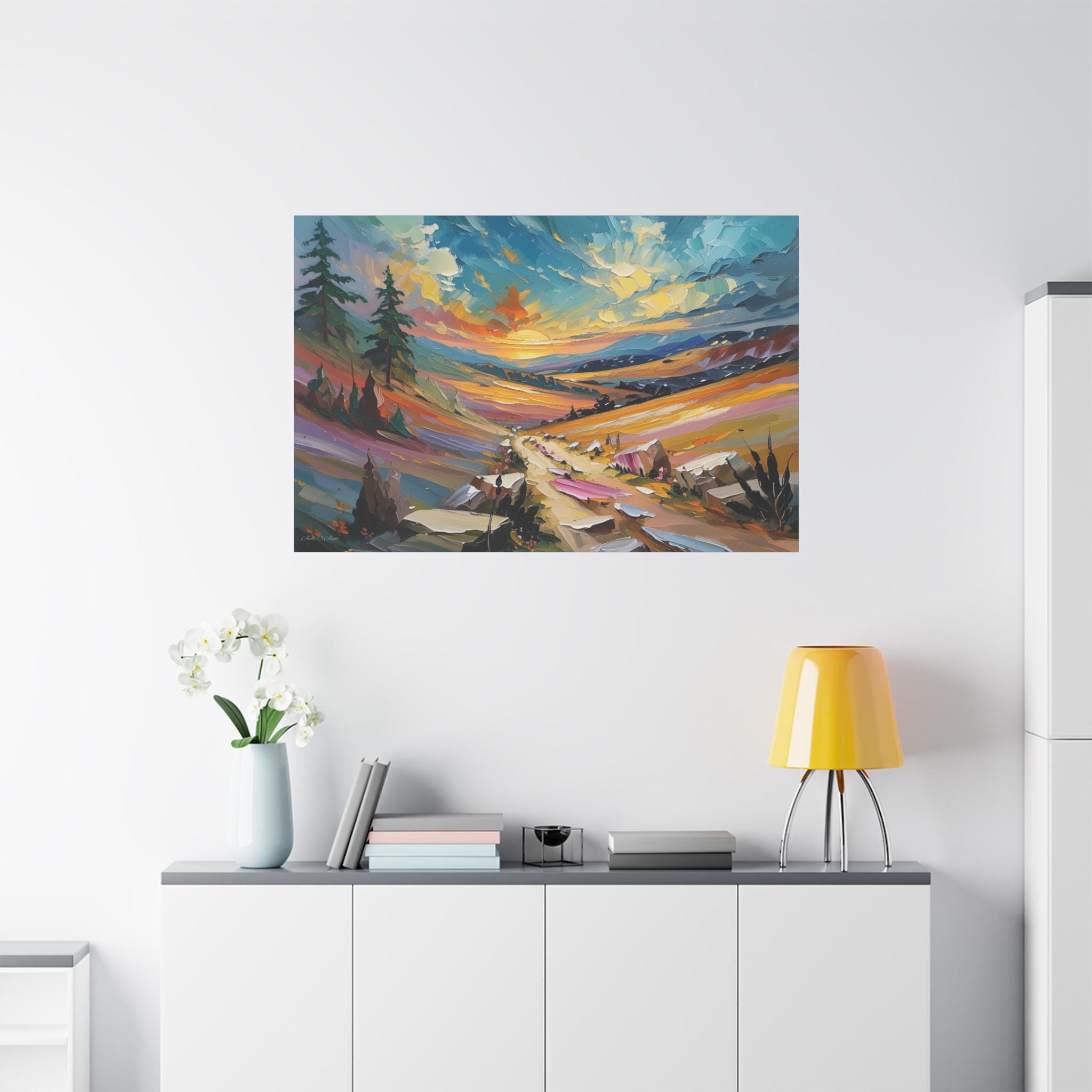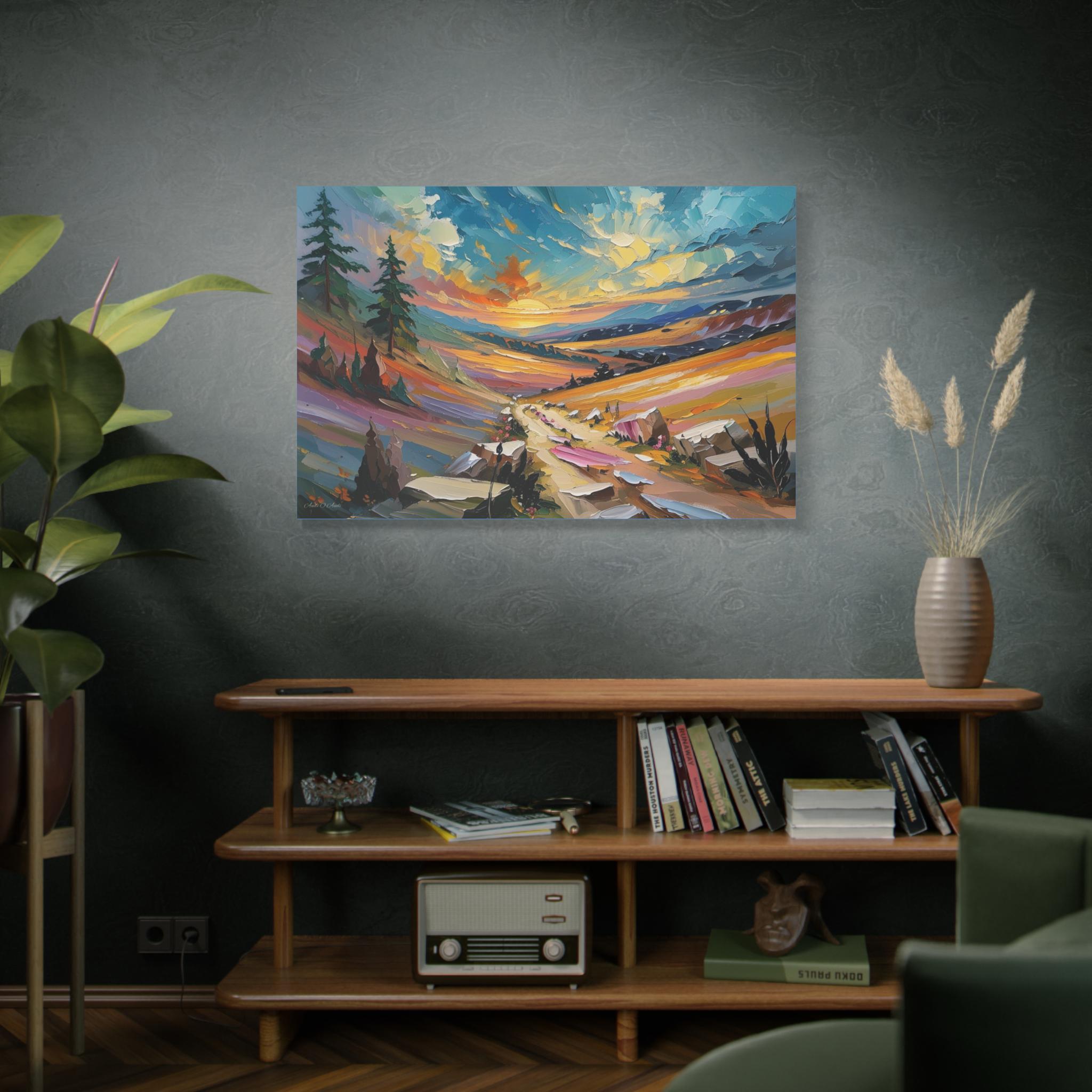 The print utilizes a dramatic low-angle perspective, featuring a small, rough path that draws the viewer into the vast distance. The vertical scale of the tall, stylized pine trees on the left provides a crucial compositional anchor against the sweeping horizontal bands of color. The final canvas print offers a vivid, hyper-sensory experience of nature, faithfully capturing the fleeting emotional power of the original dramatic sunset through brilliant color and sharp reproduction of the painted texture.Product features